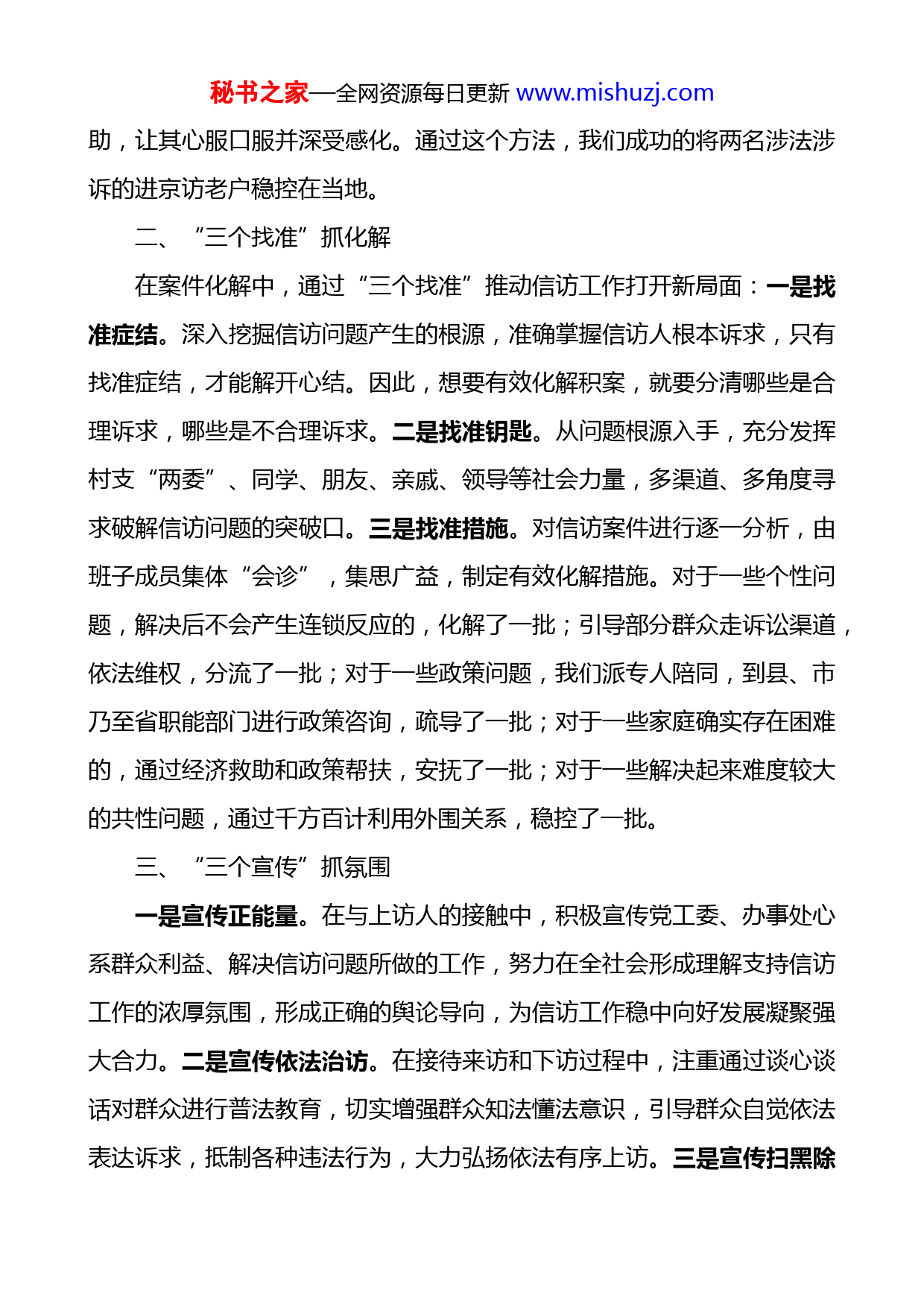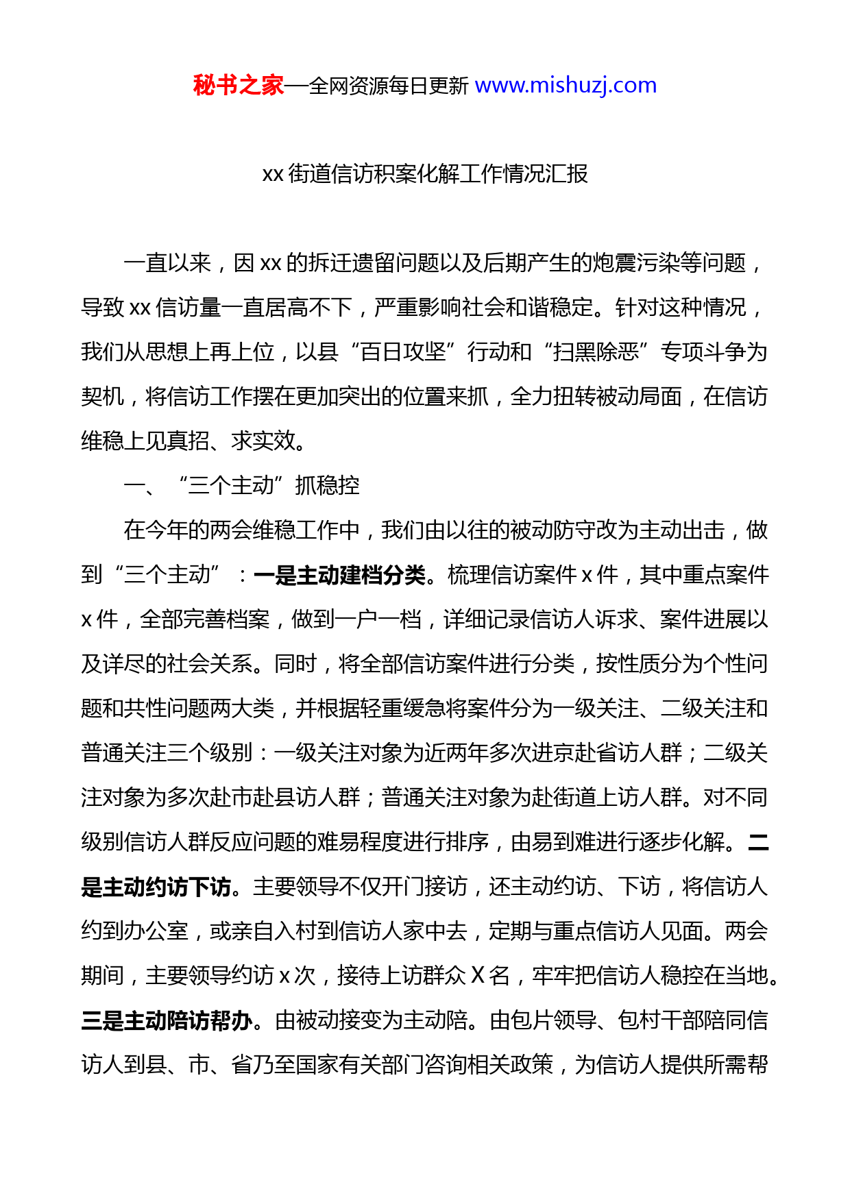 秘书之家—全网资源每日更新www.mishuzj.comxx街道信访积案化解工作情况汇报一直以来,因xx的拆迁遗留问题以及后期产生的炮震污染等问题,导致xx信访量一直居高不下,严重影响社会和谐稳定。针对这种情况,我们从思想上再上位,以县“百日攻坚”行动和“扫黑除恶”专项斗争为契机,将信访工作摆在更加突出的位置来抓,全力扭转被动局面,在信访维稳上见真招、求实效。一、“三个主动”抓稳控在今年的两会维稳工作中,我们由以往的被动防守改为主动出击,做到“三个主动”:一是主动建档分类。梳理信访案件x件,其中重点案件x件,全部完善档案,做到一户一档,详细记录信访人诉求、案件进展以及详尽的社会关系。同时,将全部信访案件进行分类,按性质分为个性问题和共性问题两大类,并根据轻重缓急将案件分为一级关注、二级关注和普通关注三个级别:一级关注对象为近两年多次进京赴省访人群;二级关注对象为多次赴市赴县访人群;普通关注对象为赴街道上访人群。对不同级别信访人群反应问题的难易程度进行排序,由易到难进行逐步化解。二是主动约访下访。主要领导不仅开门接访,还主动约访、下访,将信访人约到办公室,或亲自入村到信访人家中去,定期与重点信访人见面。两会期间,主要领导约访x次,接待上访群众X名,牢牢把信访人稳控在当地。三是主动陪访帮办。由被动接变为主动陪。由包片领导、包村干部陪同信访人到县、市、省乃至国家有关部门咨询相关政策,为信访人提供所需帮秘书之家—全网资源每日更新www.mishuzj.com助,让其心服口服并深受感化。通过这个方法,我们成功的将两名涉法涉诉的进京访老户稳控在当地。二、“三个找准”抓化解在案件化解中,通过“三个找准”推动信访工作打开新局面:一是找准症结。深入挖掘信访问题产生的根源,准确掌握信访人根本诉求,只有找准症结,才能解开心结。因此,想要有效化解积案,就要分清哪些是合理诉求,哪些是不合理诉求。二是找准钥匙。从问题根源入手,充分发挥村支“两委”、同学、朋友、亲戚、领导等社会力量,多渠道、多角度寻求破解信访问题的突破口。三是找准措施。对信访案件进行逐一分析,由班子成员集体“会诊”,集思广益,制定有效化解措施。对于一些个性问题,解决后不会产生连锁反应的,化解了一批;引导部分群众走诉讼渠道,依法维权,分流了一批;对于一些政策问题,我们派专人陪同,到县、市乃至省职能部门进行政策咨询,疏导了一批;对于一些家庭确实存在困难的,通过经济救助和政策帮扶,安抚了一批;对于一些解决起来难度较大的共性问题,通过千方百计利用外围关系,稳控了一批。三、“三个宣传”抓氛围一是宣传正能量。在与上访人的接触中,积极宣传党工委、办事处心系群众利益、解决信访问题所做的工作,努力在全社会形成理解支持信访工作的浓厚氛围,形成正确的舆论导向,为信访工作稳中向好发展凝聚强大合力。二是宣传依法治访。在接待来访和下访过程中,注重通过谈心谈话对群众进行普法教育,切实增强群众知法懂法意识,引导群众自觉依法表达诉求,抵制各种违法行为,大力弘扬依法有序上访。三是宣传扫黑除秘书之家—全网资源每日更新www.mishuzj.com恶专项斗争。扫黑除恶专项斗争的开展,为打击非法上访提供了有力武器。此次全国“两会”期间,我们通过加大对扫黑除恶专项斗争活动内容以及全县扫黑除恶打击的缠访闹访典型案例的宣传,起到了极大的震慑作用,有效打压了部分上访人的嚣张气焰,为信访稳控提供了强大助力。经过我们一系列努力,目前我街道的信访局面有所好转,但仍存在很多问题和不足,在今后的工作中有待进一步加强。下步工作中,我们必将以高度的责任心和时不我待的紧迫感,扎实推进积案化解,全力以赴抓好稳控,推动xx信访维稳工作再添新战果、再上新台阶!