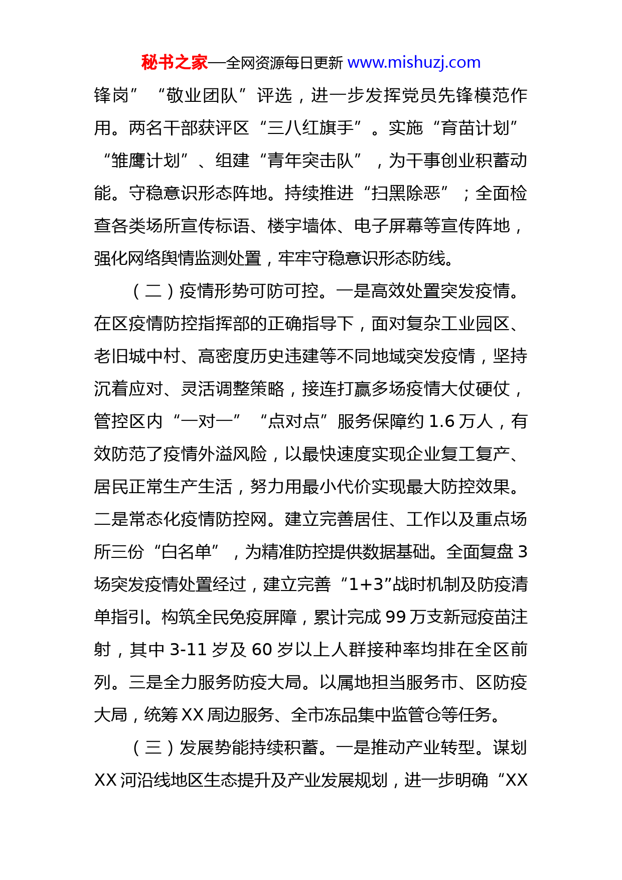 秘书之家—全网资源每日更新www.mishuzj.com街道办2022工作总结及2023年工作计划今年以来,在区委区政府的坚强领导下,XX街道围绕区委战略部署,大力开展“能力作风提升年”行动,克难奋进、真抓实干,统筹推进辖区疫情防控和经济社会发展各项工作。一、2022年工作总结(一)党建统领凝心聚力。一是加强思想建设。把学习贯彻习近平新时代中国特色社会主义思想作为首要政治任务,深入贯彻省第十三次党代会精神以及市、区全会精神,党的二十大召开后,将贯彻学习党的二十大精神作为首要重点学习任务,全年开展中心组学习35次,组织干部职工集中学习50次,开展处级干部讲党课10余次,组织机关党支部前往延安等红色教育基地进行红色教育2次,引导全体党员在学思践悟中维护“两个确立”。二是夯实基层党建。紧抓重点关注社区党组织整顿,建立“周二接访”“零距离直联”等机制,全面提升社区党委引领力、凝聚力;试点探索综合网格党组织建设;两新组织新组建19个党支部,成立全市首条“暖蜂街区”。提升能力作风。扎实开展“能力作风提升年”行动,机关部门、社区党组织主动认领99项重点工作及49项攻坚任务,让党员干部在经风雨、见世面中长才干、壮筋骨。开展“党员先秘书之家—全网资源每日更新www.mishuzj.com锋岗”“敬业团队”评选,进一步发挥党员先锋模范作用。两名干部获评区“三八红旗手”。实施“育苗计划”“雏鹰计划”、组建“青年突击队”,为干事创业积蓄动能。守稳意识形态阵地。持续推进“扫黑除恶”;全面检查各类场所宣传标语、楼宇墙体、电子屏幕等宣传阵地,强化网络舆情监测处置,牢牢守稳意识形态防线。(二)疫情形势可防可控。一是高效处置突发疫情。在区疫情防控指挥部的正确指导下,面对复杂工业园区、老旧城中村、高密度历史违建等不同地域突发疫情,坚持沉着应对、灵活调整策略,接连打赢多场疫情大仗硬仗,管控区内“一对一”“点对点”服务保障约1.6万人,有效防范了疫情外溢风险,以最快速度实现企业复工复产、居民正常生产生活,努力用最小代价实现最大防控效果。二是常态化疫情防控网。建立完善居住、工作以及重点场所三份“白名单”,为精准防控提供数据基础。全面复盘3场突发疫情处置经过,建立完善“1+3”战时机制及防疫清单指引。构筑全民免疫屏障,累计完成99万支新冠疫苗注射,其中3-11岁及60岁以上人群接种率均排在全区前列。三是全力服务防疫大局。以属地担当服务市、区防疫大局,统筹XX周边服务、全市冻品集中监管仓等任务。(三)发展势能持续积蓄。一是推动产业转型。谋划XX河沿线地区生态提升及产业发展规划,进一步明确“XX秘书之家—全网资源每日更新www.mishuzj.com小镇”产业集群培育方向及产城融合发展策略。引进XX科技等高新技术企业,新增省级“专精特新”企业2家,XX电子成功上市。二是优化营商环境。建立街道班子成员、机关部门“一对一”联企挂点服务、定期调度等机制,量化走访指标,建立诉求台账。上半年累计开展大走访500余家次,收集企业诉求97件均落实专人跟进。力促企业恢复生气,发放封控、管控区域内餐饮补贴186万元;各类型园区减免租金超500万元。三是保障重大项目。配合完成XX河截排工程前期勘察,启动相关调蓄湖用地拆除;XX城中村改造项目进展顺利,XX高级中学、XX小学等项目签订集体土地征转协议。(四)社会大局平安稳定。一是守牢稳定底线。圆满完成北京冬奥会、全国两会、“二十大”等特防期安保维稳重任,积极应对升学教育、智汇100等纠纷。破获涉黑涉恶案件9宗;辖区总警情同比下降27%、诈骗警情下降11%,治安形势持续向好。二是强化安全基础。实施“1+8+3+1”重点行业领域专项整治,累计排查发现安全隐患8753处,处罚60.9万元;高层历史违建消防、电力整治工程加速推进。在10条重点路段、28个交通警情易发多发路口覆盖文明引导员。全面落实在建工地“白名单”制度,开启小散工程报备案“一站通”,实现线上线下同步监管。三是深化基层治理。深化街道智慧运行中心秘书之家—全网资源每日更新www.mishuzj.com建设,积极拓展在疫情防控、交通安全、三防应对、城市管理等领域的运用,助力基层治理更加科学、精准、高效。开展“一社区一品牌”建设,推动基层治理多点开花;大力推进“枫桥式基层”单位创建全覆盖;试点“1+4+N”家庭解纷新机制。(五)民生答卷更加厚实。一是攻坚基础配套。持续开展断头路打通工作,XX路实现贯通;规划的XX公园正式动工;完成XX医院原址用地规划调整;XX快速桥下停车场启动建设。二是优化城区环境。梳理实施133个“民生大盆菜”项目,开展“一社区一示范街”创建;扛起生态文明建设政治责任,推深做实“河长制”“湖长制”;完成汛前管网清疏86公里。建立城市环境品质提升项目库,全面强化城中村环境基础设施。三是培育文明风气。大力开展文明城市创建提升行动,全力营造全国文明城市创建良好氛围。开设“XX之窗”,打造文明宣传新阵地。做深民意反映渠道,通过12345热线平台收集处理居民诉求357件。XX家教基地入选全省首批家教家风实践基地。二、下一步工作计划瞄准“都市核心区”总定位,围绕辖区定位,抓准关键、加压奋进,在六个方面积极作为,确保完成全年目标任务。(一)在推动高质量发
