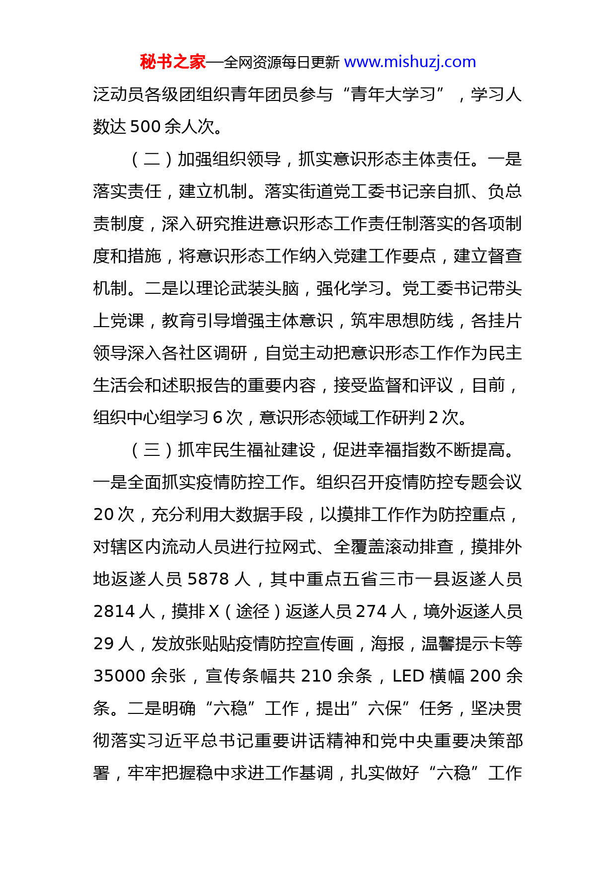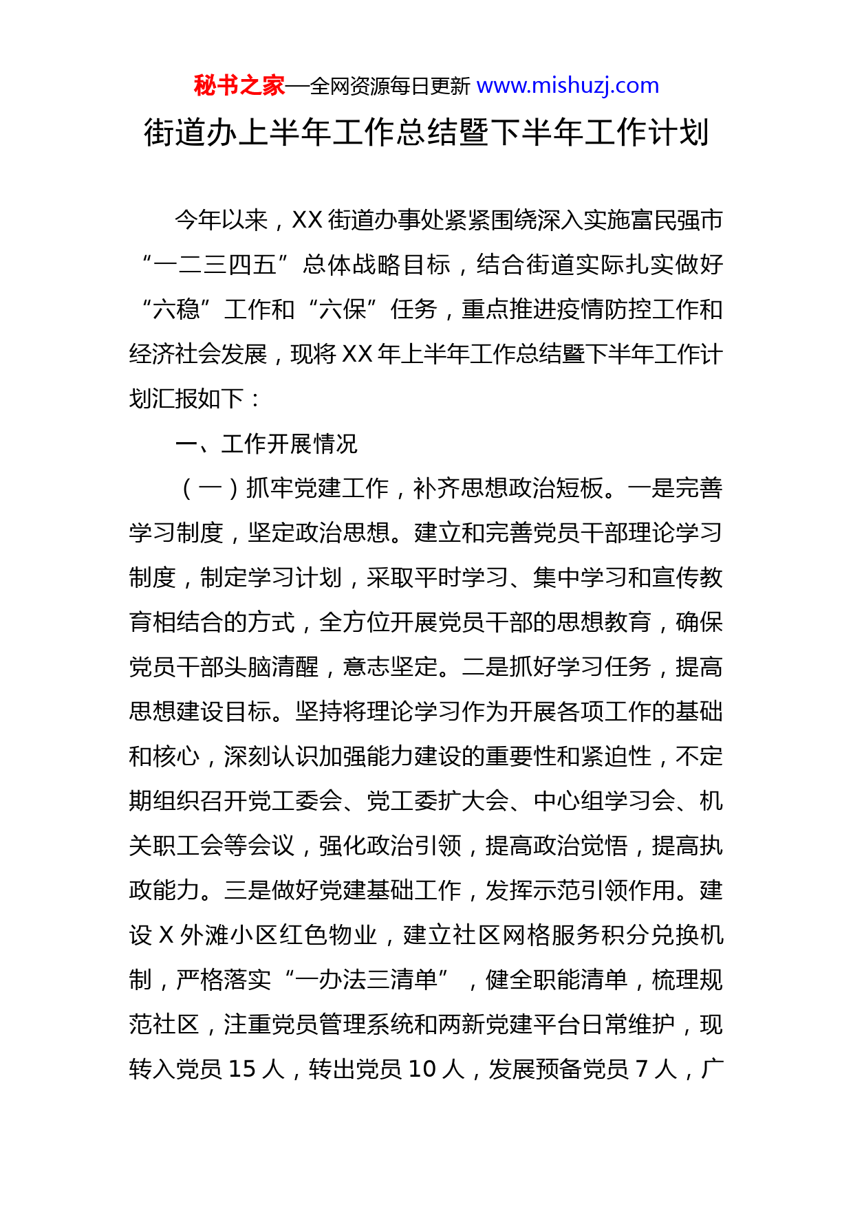 秘书之家—全网资源每日更新www.mishuzj.com街道办上半年工作总结暨下半年工作计划今年以来,XX街道办事处紧紧围绕深入实施富民强市“一二三四五”总体战略目标,结合街道实际扎实做好“六稳”工作和“六保”任务,重点推进疫情防控工作和经济社会发展,现将XX年上半年工作总结暨下半年工作计划汇报如下:一、工作开展情况(一)抓牢党建工作,补齐思想政治短板。一是完善学习制度,坚定政治思想。建立和完善党员干部理论学习制度,制定学习计划,采取平时学习、集中学习和宣传教育相结合的方式,全方位开展党员干部的思想教育,确保党员干部头脑清醒,意志坚定。二是抓好学习任务,提高思想建设目标。坚持将理论学习作为开展各项工作的基础和核心,深刻认识加强能力建设的重要性和紧迫性,不定期组织召开党工委会、党工委扩大会、中心组学习会、机关职工会等会议,强化政治引领,提高政治觉悟,提高执政能力。三是做好党建基础工作,发挥示范引领作用。建设X外滩小区红色物业,建立社区网格服务积分兑换机制,严格落实“一办法三清单”,健全职能清单,梳理规范社区,注重党员管理系统和两新党建平台日常维护,现转入党员15人,转出党员10人,发展预备党员7人,广秘书之家—全网资源每日更新www.mishuzj.com泛动员各级团组织青年团员参与“青年大学习”,学习人数达500余人次。(二)加强组织领导,抓实意识形态主体责任。一是落实责任,建立机制。落实街道党工委书记亲自抓、负总责制度,深入研究推进意识形态工作责任制落实的各项制度和措施,将意识形态工作纳入党建工作要点,建立督查机制。二是以理论武装头脑,强化学习。党工委书记带头上党课,教育引导增强主体意识,筑牢思想防线,各挂片领导深入各社区调研,自觉主动把意识形态工作作为民主生活会和述职报告的重要内容,接受监督和评议,目前,组织中心组学习6次,意识形态领域工作研判2次。(三)抓牢民生福祉建设,促进幸福指数不断提高。一是全面抓实疫情防控工作。组织召开疫情防控专题会议20次,充分利用大数据手段,以摸排工作作为防控重点,对辖区内流动人员进行拉网式、全覆盖滚动排查,摸排外地返遂人员5878人,其中重点五省三市一县返遂人员2814人,摸排X(途径)返遂人员274人,境外返遂人员29人,发放张贴贴疫情防控宣传画,海报,温馨提示卡等35000余张,宣传条幅共210余条,LED横幅200余条。二是明确“六稳”工作,提出”六保”任务,坚决贯彻落实习近平总书记重要讲话精神和党中央重要决策部署,牢牢把握稳中求进工作基调,扎实做好“六稳”工作秘书之家—全网资源每日更新www.mishuzj.com和“六保”任务,善于变压力于动力,全面落实民生保障,牢牢把握发展主动权,保障基层民生服务。三是全面落实民生工程。在上级资金未到位的情况下,街道党工委、办事处研究决定,从民政与优抚资金中抽出资金垫支慰问,由挂驻社区领导牵头,集中走访救助辖区内受疫情影响的困难群众,1-6月临时困难救助共125人6.13万元,春节走访慰问困难群众240户共计7.2万元,走访慰问困难重点优抚对象110人共计3.3万元,退役军人生活困难救助12人共计8200元,高龄补贴新增25人,共计625元,办理了重度残疾人医保缴费补贴84人,共计2.19万元,慰问因疫情导致贫困的9名残疾人,每人300元物资,共计2700元。(四)抓实精细化管理,提升城市管理水平。一是坚持以创促改。以迎接文明城市复审为重点,采取“三级”联动网格化管理模式,由挂片领导总牵头,社区书记、主任具体负责,网格员具体落实,以问题为导向落实具体工作,以数字化城管暴露出的问题为依据,全面整治乱象行为,实现源头防控。今年以来,清理牛皮癣、小广告38000余处,清运垃圾120余车。二是开展基础设施整治,优化辖区环境。街道深入调查摸底,将辖区内牵涉文明城市复检、民生环境的老旧基础设施进行逐一认真自查摸底,对XX农贸市场、鑫达公寓、金城街21栋、玉泉街秘书之家—全网资源每日更新www.mishuzj.com社区国泰街、XX129号、丽阳花园、凯南2巷等10余处进行管网改造、化粪池清掏、疏通管道、部分路面硬化,共使用资金7.72万余元。三是全力抓好生态文明建设,提升人居环境。按照“党政同责、一岗双责”要求,由街道党工委书记、主任为第一责任人,分管领导、各挂片领导、社区书记、主任为具体责任人,对辖区噪音、油烟和扬尘治理工作加强统筹,层层夯实环保责任,形成一级抓一级、层层抓整改的工作格局,以群众举报、12345政府热线为问题导向,逐一研究制定整改措施,逐一明确整改目标、责任单位和完成时限,立行立改,对需逐步整改的,建立台账,限时销账;对需长期努力的,持续推进,一抓到底。目前,督促3家餐饮业安装油烟净化器,整治商业噪音50起、坝坝舞噪音19处,施工噪音22起,有效提升人居环境。(五)切实防风险保平安,不断优化安全环境。一是启动夜间巡逻队伍,全面开展安全隐患工作。成立以党工委书记、主任为组长、相关部门为成员的工作领导小组,明确夜间巡逻工作任务,重点对辖区娱乐场所等进行安全巡逻、管控工作,努力减少辖区内四类可防性案件的发生。二是做好信访维稳工作。1.街道每天安排一名主要领导及当天值班分管领导、两名值班干部接待信访人,做到从源头把住信访关口,避免越级访的出现。2.定期、不定期的秘书之家—