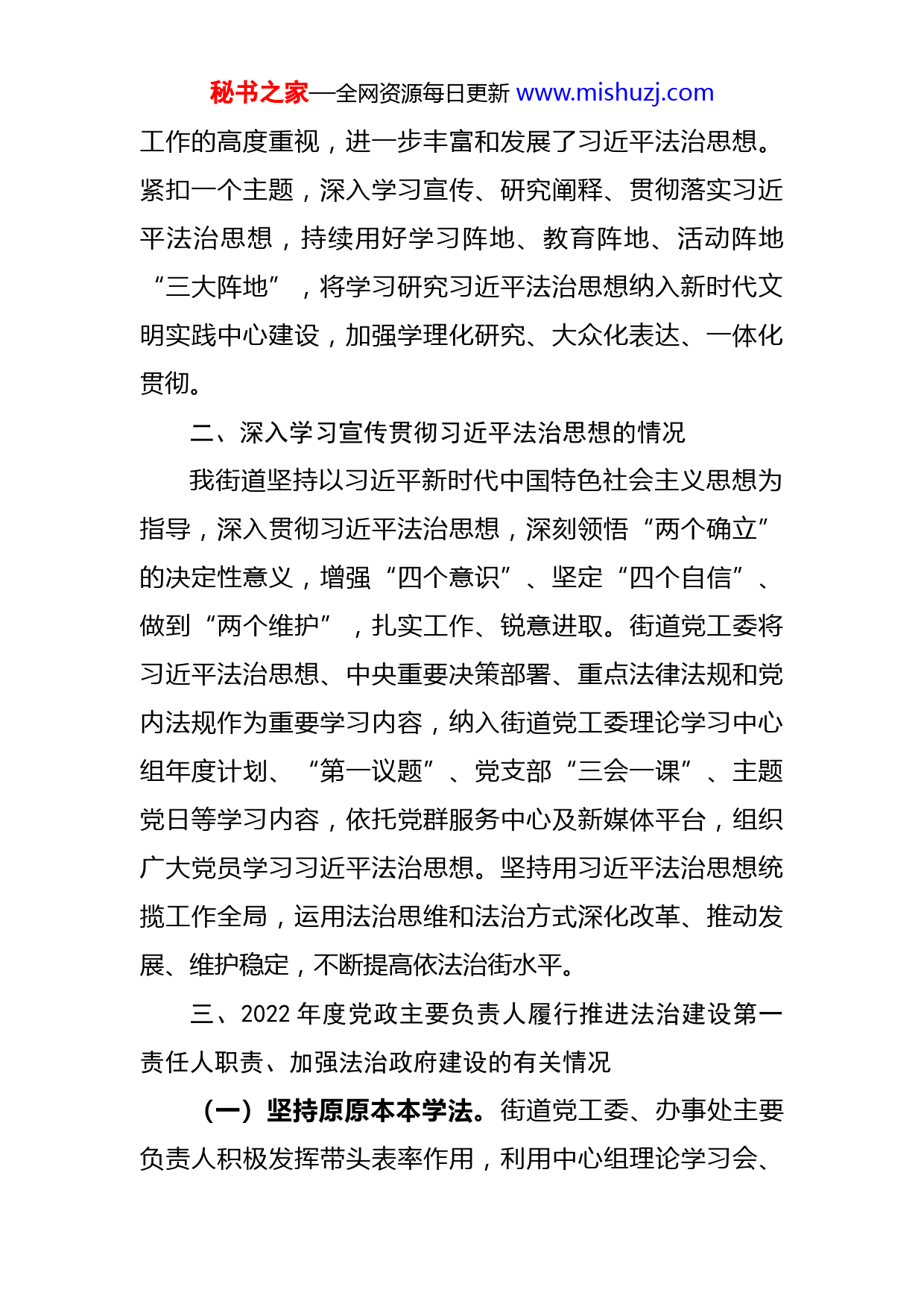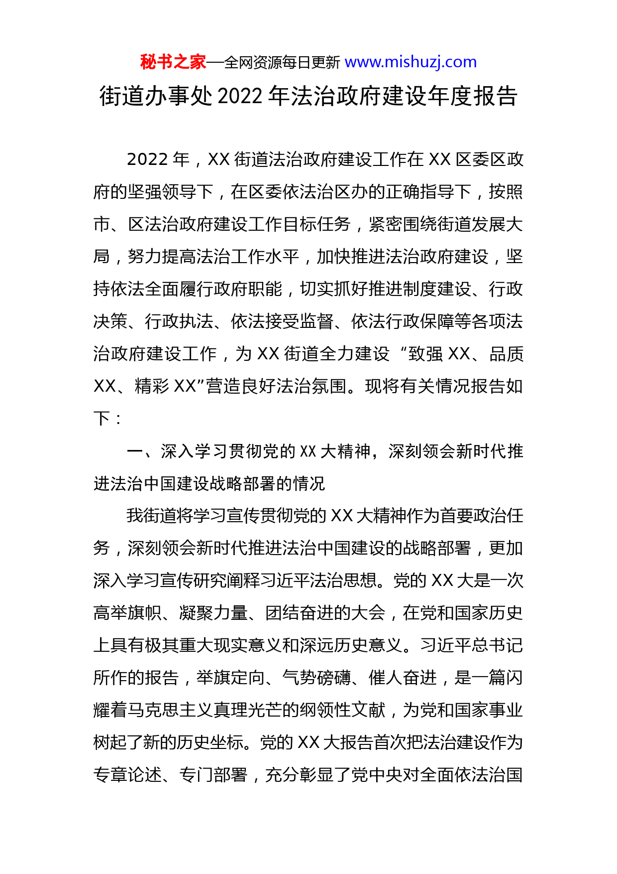 秘书之家—全网资源每日更新www.mishuzj.com街道办事处2022年法治政府建设年度报告2022年,XX街道法治政府建设工作在XX区委区政府的坚强领导下,在区委依法治区办的正确指导下,按照市、区法治政府建设工作目标任务,紧密围绕街道发展大局,努力提高法治工作水平,加快推进法治政府建设,坚持依法全面履行政府职能,切实抓好推进制度建设、行政决策、行政执法、依法接受监督、依法行政保障等各项法治政府建设工作,为XX街道全力建设“致强XX、品质XX、精彩XX”营造良好法治氛围。现将有关情况报告如下:一、深入学习贯彻党的XX大精神,深刻领会新时代推进法治中国建设战略部署的情况我街道将学习宣传贯彻党的XX大精神作为首要政治任务,深刻领会新时代推进法治中国建设的战略部署,更加深入学习宣传研究阐释习近平法治思想。党的XX大是一次高举旗帜、凝聚力量、团结奋进的大会,在党和国家历史上具有极其重大现实意义和深远历史意义。习近平总书记所作的报告,举旗定向、气势磅礴、催人奋进,是一篇闪耀着马克思主义真理光芒的纲领性文献,为党和国家事业树起了新的历史坐标。党的XX大报告首次把法治建设作为专章论述、专门部署,充分彰显了党中央对全面依法治国秘书之家—全网资源每日更新www.mishuzj.com工作的高度重视,进一步丰富和发展了习近平法治思想。紧扣一个主题,深入学习宣传、研究阐释、贯彻落实习近平法治思想,持续用好学习阵地、教育阵地、活动阵地“三大阵地”,将学习研究习近平法治思想纳入新时代文明实践中心建设,加强学理化研究、大众化表达、一体化贯彻。二、深入学习宣传贯彻习近平法治思想的情况我街道坚持以习近平新时代中国特色社会主义思想为指导,深入贯彻习近平法治思想,深刻领悟“两个确立”的决定性意义,增强“四个意识”、坚定“四个自信”、做到“两个维护”,扎实工作、锐意进取。街道党工委将习近平法治思想、中央重要决策部署、重点法律法规和党内法规作为重要学习内容,纳入街道党工委理论学习中心组年度计划、“第一议题”、党支部“三会一课”、主题党日等学习内容,依托党群服务中心及新媒体平台,组织广大党员学习习近平法治思想。坚持用习近平法治思想统揽工作全局,运用法治思维和法治方式深化改革、推动发展、维护稳定,不断提高依法治街水平。三、2022年度党政主要负责人履行推进法治建设第一责任人职责、加强法治政府建设的有关情况(一)坚持原原本本学法。街道党工委、办事处主要负责人积极发挥带头表率作用,利用中心组理论学习会、秘书之家—全网资源每日更新www.mishuzj.com班子会等契机,学习习近平法治思想和法律知识,推动学习宣贯走深走实,在全街道树立信奉法律、崇尚法治的理念,增强法治意识。(二)加强落实党政主要负责人“述法”工作。将“党政主要负责人履行推进法治建设第一责任人职责情况”纳入绩效考核指标体系,党政主要负责人及其班子成员法治建设情况以书面形式向区委依法治区办进行报告,推动述法工作常态化。(三)建立健全法律顾问制度。与XX律师事务所签订专项法律服务协议,由律所团队参与街道“三重一大”及疑难复杂事项的决策研究,进而协助街道建立规范化、标准化、程序化的“三重一大”及疑难复杂事项处理体系,有效落实“三重一大”及疑难复杂事项的法律审查、法律研究、依法决策,做好法律风险防范,提高决策效率,规范决策行为,确保正确履职。在协调条线工作及处理群众来信来访事项时,严格按照法律法规办事,切实做到公开、公平、公正。(四)落实法治建设决策部署。坚决贯彻落实《法治政府建设实施纲要(2021-2025年)》和《法治政府建设与责任落实督察工作规定》等文件精神,对法治建设重要工作亲自部署、重大问题亲自过问、重点环节亲自依法协调、重要任务亲自依法依规督办,在法治政府建设中践秘书之家—全网资源每日更新www.mishuzj.com行责任担当。会同班子成员,对街道的依法行政工作及时提要求、及时督促,切实把法治建设的各项要求体现到业务工作和日常管理中,积极为推进法治建设提供保障、创造条件。四、贯彻落实《法治政府建设实施纲要(2021-2025年)》《XX省法治政府建设实施纲要》《XX市法治政府建设实施方案》的情况,以及落实我市2022年全面依法治市工作要点、法治政府建设重点工作安排相关文件的情况2022年,我街道深入学习贯彻《法治政府建设实施纲要(2021-2025年)》《XX省法治政府建设实施纲要》《XX市法治政府建设实施方案》,对照XX市2022年全面依法治市工作要点、法治政府建设重点工作安排相关文件,全面落实各项法治建设工作。(一)加强党对法治政府建设工作的领导。街道党工委把法治建设工作纳入中心工作通盘考虑,把抓好法治建设工作作为依法治街工作的基础。一是调整街道法治建设工作领导班子。街道调整充实了领导机构,组建了由党工委书记任组长,办事处主任任副组长,各机关事业单位负责人和各社区书记为成员的法治政府建设工作领导小组,统一指挥和组织协调法治政府建设工作。二是加强干部队伍法治建设。加强机关干部教育培训力度,切实增强法治意识和服务能力,强化工作人员法治意识和服务意识。秘书之家—全网资源每日更新www.mishuzj.com(二)持