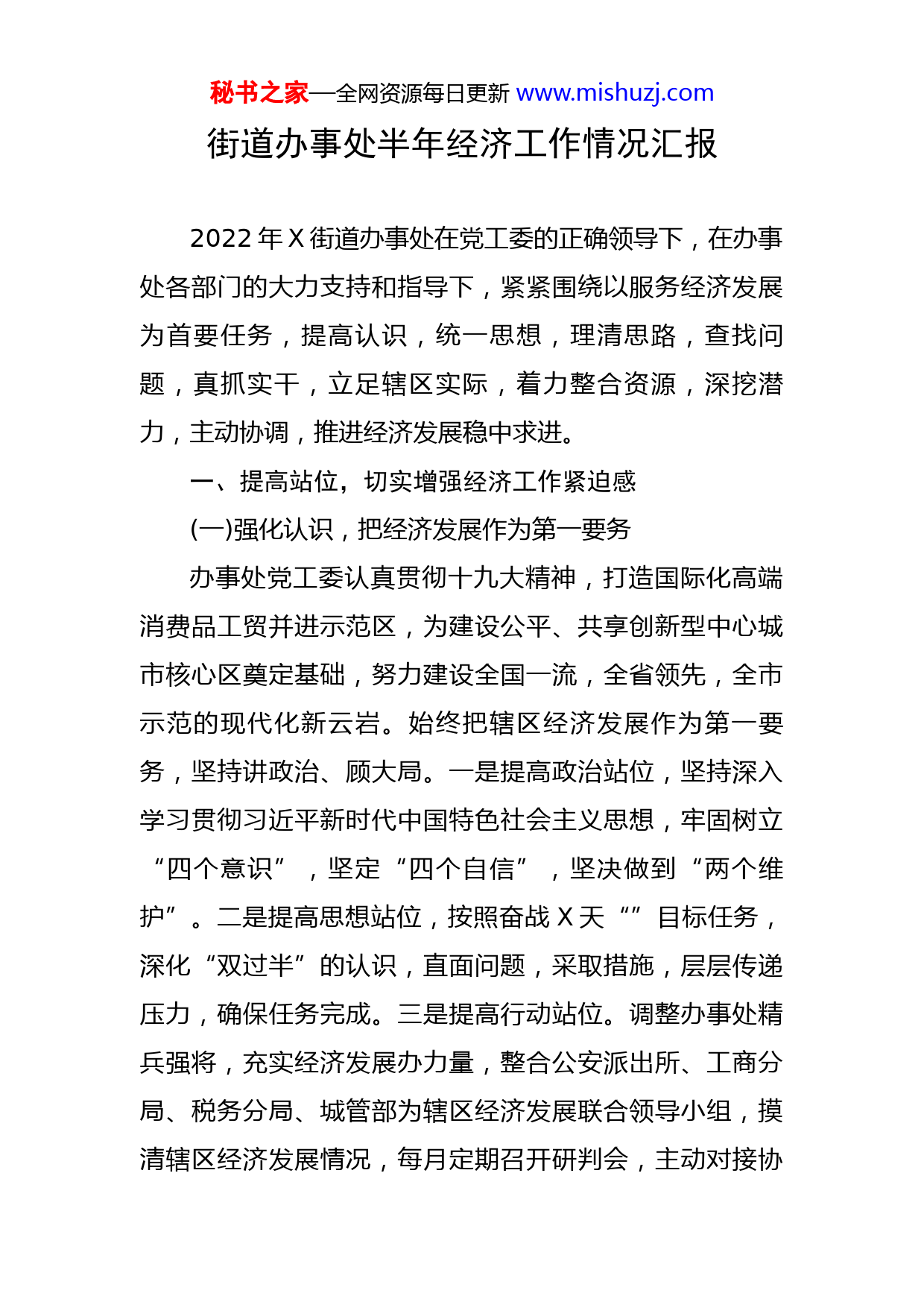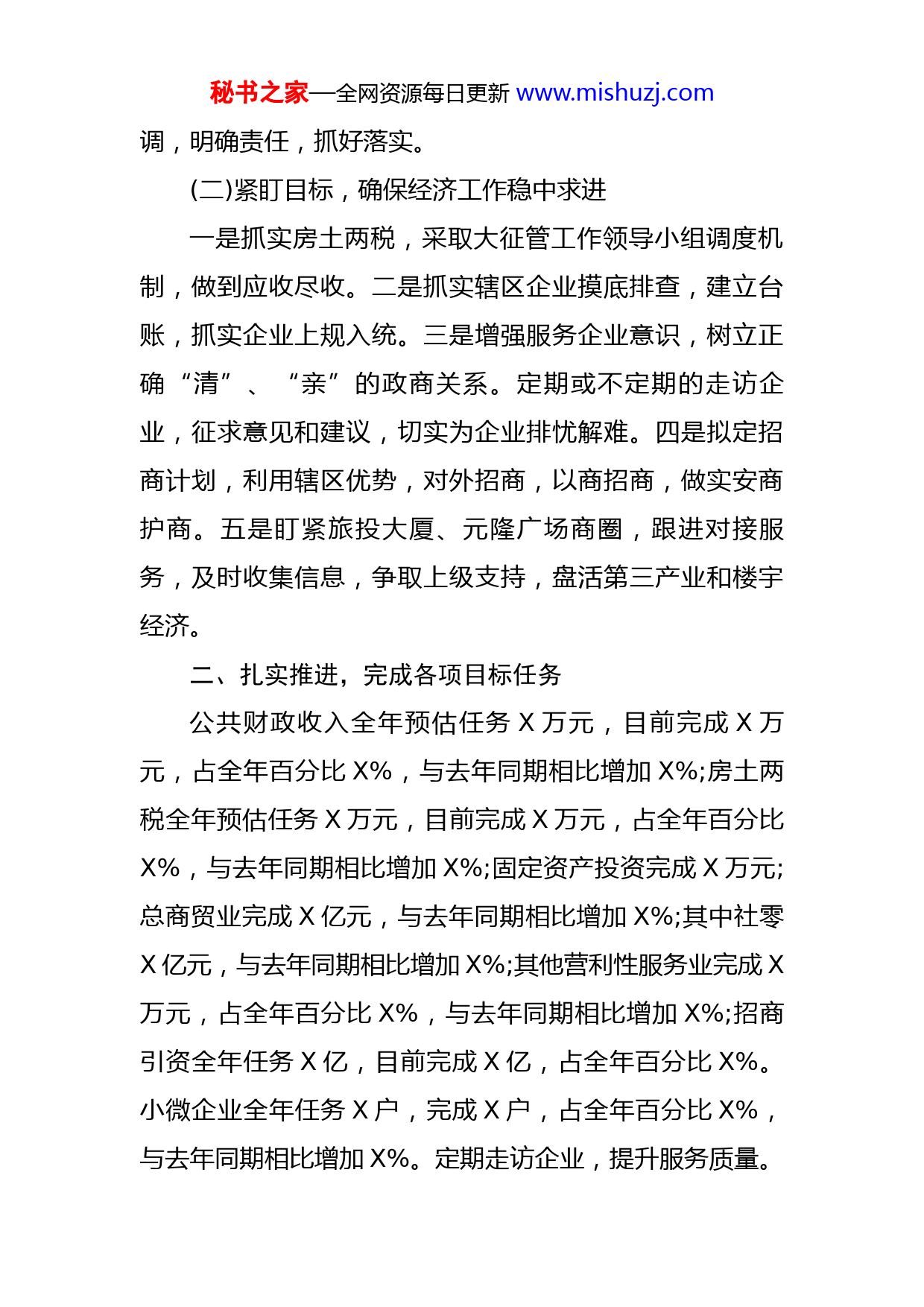 秘书之家—全网资源每日更新www.mishuzj.com街道办事处半年经济工作情况汇报2022年X街道办事处在党工委的正确领导下,在办事处各部门的大力支持和指导下,紧紧围绕以服务经济发展为首要任务,提高认识,统一思想,理清思路,查找问题,真抓实干,立足辖区实际,着力整合资源,深挖潜力,主动协调,推进经济发展稳中求进。一、提高站位,切实增强经济工作紧迫感(一)强化认识,把经济发展作为第一要务办事处党工委认真贯彻十九大精神,打造国际化高端消费品工贸并进示范区,为建设公平、共享创新型中心城市核心区奠定基础,努力建设全国一流,全省领先,全市示范的现代化新云岩。始终把辖区经济发展作为第一要务,坚持讲政治、顾大局。一是提高政治站位,坚持深入学习贯彻习近平新时代中国特色社会主义思想,牢固树立“四个意识”,坚定“四个自信”,坚决做到“两个维护”。二是提高思想站位,按照奋战X天“”目标任务,深化“双过半”的认识,直面问题,采取措施,层层传递压力,确保任务完成。三是提高行动站位。调整办事处精兵强将,充实经济发展办力量,整合公安派出所、工商分局、税务分局、城管部为辖区经济发展联合领导小组,摸清辖区经济发展情况,每月定期召开研判会,主动对接协秘书之家—全网资源每日更新www.mishuzj.com调,明确责任,抓好落实。(二)紧盯目标,确保经济工作稳中求进一是抓实房土两税,采取大征管工作领导小组调度机制,做到应收尽收。二是抓实辖区企业摸底排查,建立台账,抓实企业上规入统。三是增强服务企业意识,树立正确“清”、“亲”的政商关系。定期或不定期的走访企业,征求意见和建议,切实为企业排忧解难。四是拟定招商计划,利用辖区优势,对外招商,以商招商,做实安商护商。五是盯紧旅投大厦、元隆广场商圈,跟进对接服务,及时收集信息,争取上级支持,盘活第三产业和楼宇经济。二、扎实推进,完成各项目标任务公共财政收入全年预估任务X万元,目前完成X万元,占全年百分比X%,与去年同期相比增加X%;房土两税全年预估任务X万元,目前完成X万元,占全年百分比X%,与去年同期相比增加X%;固定资产投资完成X万元;总商贸业完成X亿元,与去年同期相比增加X%;其中社零X亿元,与去年同期相比增加X%;其他营利性服务业完成X万元,占全年百分比X%,与去年同期相比增加X%;招商引资全年任务X亿,目前完成X亿,占全年百分比X%。小微企业全年任务X户,完成X户,占全年百分比X%,与去年同期相比增加X%。定期走访企业,提升服务质量。秘书之家—全网资源每日更新www.mishuzj.com党委班子成员包保重点企业,主要领导走访企业X余次,及时了解企业经营中存在的困难和问题,积极帮助协调解决,截止五月,共为企业协调减免租金X万,协调贷款X万元,切实提升服务企业的水平,使企业安心在辖区内发展。三、存在的问题和薄弱环节(一)招商项目匮乏,存在小、浅、少的问题一是现有招商项目成功率较小。二是项目开发深度不够,对项目进行开发和整理包装,丰富项目库,为扩大招商领域和提高招商效果创造条件,是现在当务之急要解决的一个重要问题;三是载体资源老旧问题突出,辖区鑫都大厦设备陈旧,旅投大厦由于资金迟迟未到位,导致不能尽快投入使用。尽管主动出击上门招商,但是能成功落地的项目较少。(二)传统产业优势逐渐丧失,新兴产业难以支撑辖区经济指标增速的要求。受困于可调用资源少,导致在产业转型上引导力不足。四、工作措施(一)强化领导建立X街道办事处经济工作联席领导小组,定期研究分析经济形势、决定重大经济事项,及时研究辖区经济社会发展重大问题和经济社会领域重大事项。秘书之家—全网资源每日更新www.mishuzj.com(二)落实责任全力推行“工作人员岗位责任制”机制,对照职责分工,坚持“经济服务工作具体化,各项经济工作责任化,点面工作常态化”的工作理念,找准工作的切入点和着力点,细化措施、明确责任、层层传导压力,倒查责任落实。定期开展督查,逐点反馈问题,对项目进度慢、工作不力的个人进行责任追究。实现辖区经济工作的持续、健康、高质量发展,确保完成全年目标任务。(三)健全台账摸清家底,按区域、按行业建立健全辖区企业台账,实时更新,随时掌握企业经营情况,存在的困难和问题。及时帮助协调解决的进展情况,提高服务企业的针对性、有效性和及时性。(四)优化营商环境一是建立一站式服务大厅,整合工商分局、税务分局、社区经济服务部门集中办公,提升营商环境,增强服务企业能力。争取实现企业少跑路,甚至不跑路就能办成事的目标。二是建立定期走访企业制度,提升服务质量。党委班子成员包保重点企业,每月走访至少一次,及时了解企业经营中存在的困难和问题,积极帮助协调解决,切实提升服务企业的水平,使企业安心在辖区内发展。秘书之家—全网资源每日更新www.mishuzj.com2022年X街道办事处将以更加务实的工作作风,更加勤勉的态度,统筹抓好优化营商环境工作,充分发挥辖区资源优势,为办事企业提供全方位“一站式”服务,真正实现“让企业只进一扇门、只跑一次路就能办成事”的服务目标。
