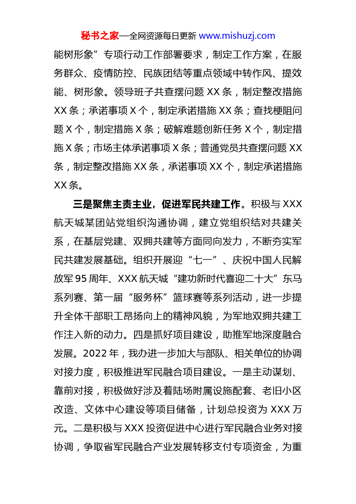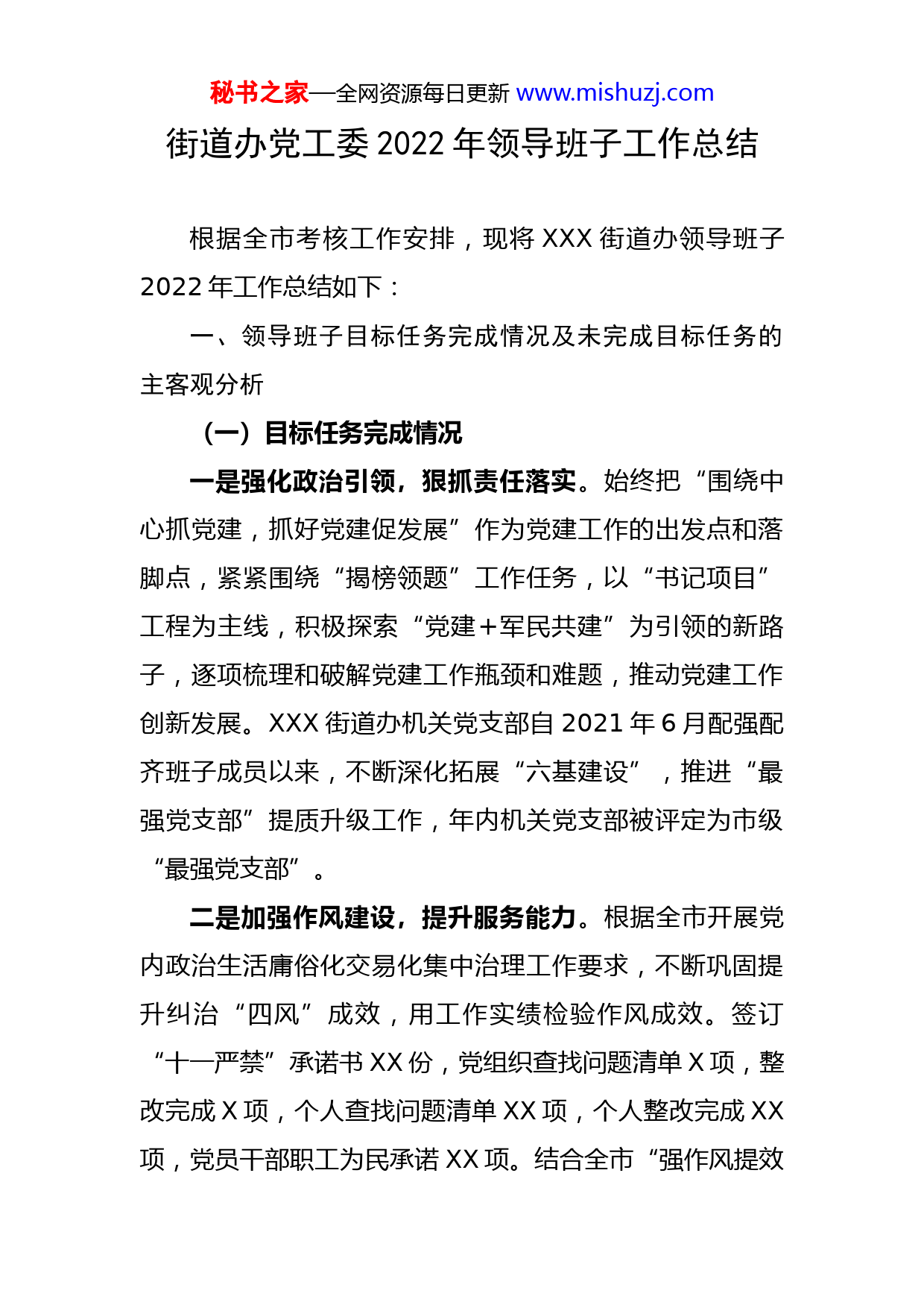 秘书之家—全网资源每日更新www.mishuzj.com街道办党工委2022年领导班子工作总结根据全市考核工作安排,现将XXX街道办领导班子2022年工作总结如下:一、领导班子目标任务完成情况及未完成目标任务的主客观分析(一)目标任务完成情况一是强化政治引领,狠抓责任落实。始终把“围绕中心抓党建,抓好党建促发展”作为党建工作的出发点和落脚点,紧紧围绕“揭榜领题”工作任务,以“书记项目”工程为主线,积极探索“党建+军民共建”为引领的新路子,逐项梳理和破解党建工作瓶颈和难题,推动党建工作创新发展。XXX街道办机关党支部自2021年6月配强配齐班子成员以来,不断深化拓展“六基建设”,推进“最强党支部”提质升级工作,年内机关党支部被评定为市级“最强党支部”。二是加强作风建设,提升服务能力。根据全市开展党内政治生活庸俗化交易化集中治理工作要求,不断巩固提升纠治“四风”成效,用工作实绩检验作风成效。签订“十一严禁”承诺书XX份,党组织查找问题清单X项,整改完成X项,个人查找问题清单XX项,个人整改完成XX项,党员干部职工为民承诺XX项。结合全市“强作风提效秘书之家—全网资源每日更新www.mishuzj.com能树形象”专项行动工作部署要求,制定工作方案,在服务群众、疫情防控、民族团结等重点领域中转作风、提效能、树形象。领导班子共查摆问题XX条,制定整改措施XX条;承诺事项X个,制定承诺措施XX条;查找梗阻问题X个,制定措施X条;破解难题创新任务X个,制定措施X条;市场主体承诺事项X条;普通党员共查摆问题XX条,制定整改措施XX条,承诺事项XX个,制定承诺措施XX条。三是聚焦主责主业,促进军民共建工作。积极与XXX航天城某团站党组织沟通协调,建立党组织结对共建关系,在基层党建、双拥共建等方面同向发力,不断夯实军民共建发展基础。组织开展迎“七一”、庆祝中国人民解放军95周年、XXX航天城“建功新时代喜迎二十大”东马系列赛、第一届“服务杯”篮球赛等系列活动,进一步提升全体干部职工昂扬向上的精神风貌,为军地双拥共建工作注入新的动力。四是抓好项目建设,助推军地深度融合发展。2022年,我办进一步加大与部队、相关单位的协调对接力度,积极推进军民融合项目建设。一是主动谋划、靠前对接,积极做好涉及着陆场附属设施配套、老旧小区改造、文体中心建设等项目储备,计划总投资为XXX万元。二是积极与XXX投资促进中心进行军民融合业务对接协调,争取省军民融合产业发展转移支付专项资金,为重秘书之家—全网资源每日更新www.mishuzj.com大项目建设提供有力支撑。三是完成科技体验馆、世界公园提升改造招投标程序,办理完成XXX街道办事处道路建设项目施工许可证,顺利完成XXX废品处理站进出道路及支线升级改造项目工程的竣工验收工作。(二)未完成目标任务的主客观分析始终坚持在党建工作上谋思路、定举措、求实效,为推进军民融合发展新路子提供坚强保障,但还存在一定的差距,主要表现在以下几个方面。一是党建工作举措还不够细。目前,XXX街道办正处于筹建挂牌阶段,党建工作与其他业务工作结合还不够紧密,工作举措的前瞻性、针对性和可操作性还不够细。二是工作创新力度不够。党建工作思考谋划不足、创新意识不强,缺少应有的进取精神,不能较好地用理论去指导实践工作。三是军民融合项目资金无法到位。因基地疫情防控要求和军民融合项目因资金尚未到位,后续项目暂未能实施,从而影响了项目开工建设和进度,制约了军地双拥共建工作有力有序开展。二、领导班子建设、抓党建和意识形态工作情况(一)领导班子建设方面。持续深入学习贯彻党的十九大、党的十九届历次全会、党的二十大、习近平总书记在省部级主要领导干部专题研讨班上的重要讲话精神、省第十一次党代会、省党委十一届二次全会暨全区经济工作会议、盟委(扩大)会议、十四届市委第二次全体(扩秘书之家—全网资源每日更新www.mishuzj.com大)会议暨全市经济工作会议等精神,坚持原原本本学、逐字逐句学、联系实际学、深入思考学,在原字原文里汲取精神“营养”,进一步强化思想认识,确保思想和行动上相统一,强化筑牢思想防线意识。截至目前,组织党工委理论中心组学习X次,党支部集中学习XX次,党工委书记讲党课X次,支部书记讲党课X次,专题学习研讨X次。(二)抓党建工作方面。紧紧围绕全年党建重点工作,坚持以习近平新时代中国特色社会主义思想为指引,以建立军民深度融合发展为抓手,紧扣新时代、新要求、新任务,促进街道各项事业保持良好发展态势。严格落实“三会一课”、主题党日、组织生活会、民主评议党员等制度,全面增强基层党组织的创造力、凝聚力和战斗力。充分利用XXX航天城红色资源优势,组织开展历史展览馆参观、烈士纪念祭扫等活动,传承和弘扬红色教育传承爱国主义精神。依托发挥市“红色轻骑兵”优势,举办形式多样的文体活动、器乐培训等,不断满足场区干部职工、军属文体生活需求,促进民族团结进步创建工作,铸牢中华民族共同体意识。不断加强新时代文明志愿服务活动,充分发挥党员先锋模范作用,打通宣传群众、教育群众、服务群众、凝聚群众“最后一公里”,截止目前,组织召开党建专题部署会X次,专题推进会X次,党史学习教育秘书之家—全网资源每日更新www.m