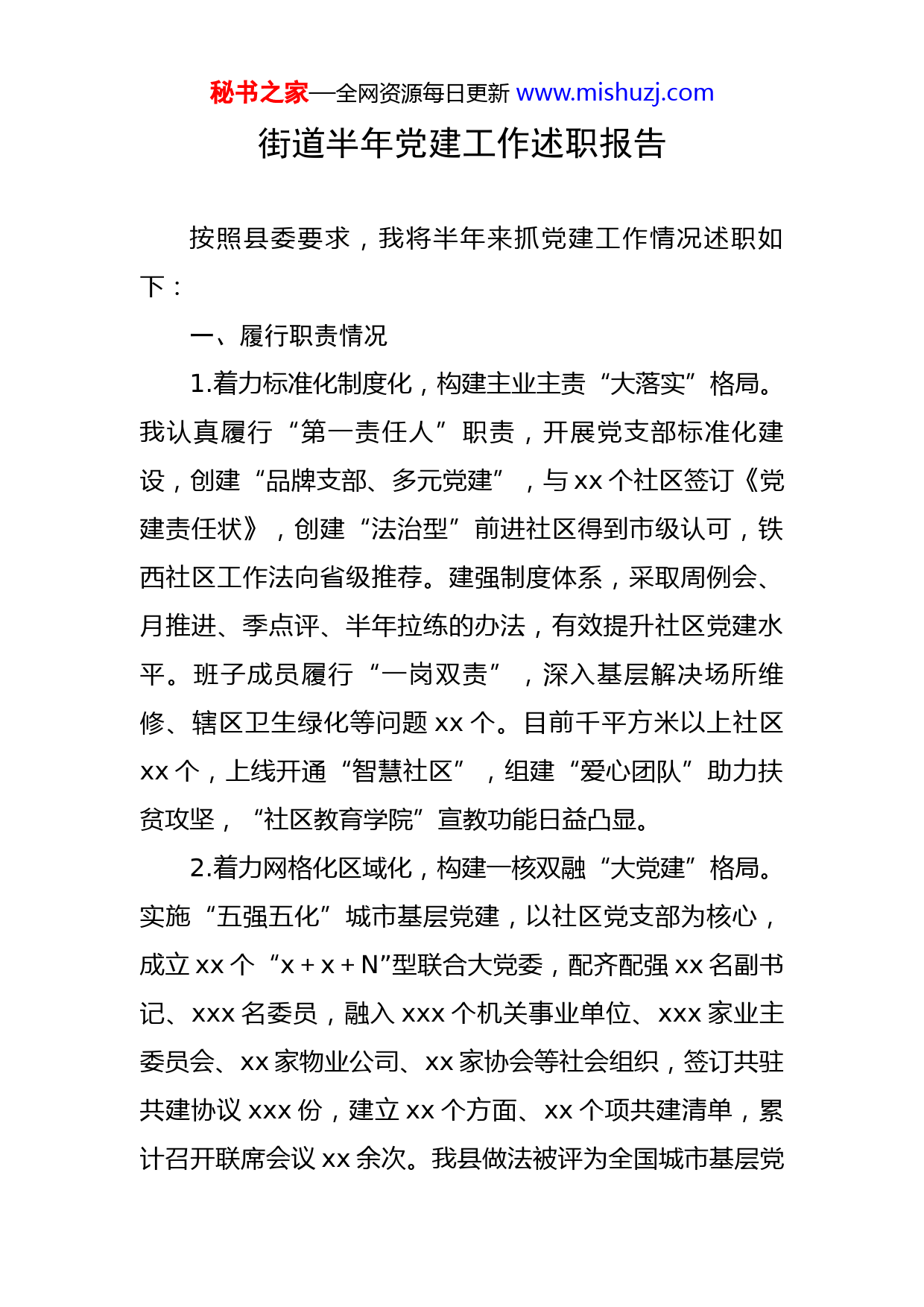 秘书之家—全网资源每日更新www.mishuzj.com街道半年党建工作述职报告按照县委要求,我将半年来抓党建工作情况述职如下:一、履行职责情况1.着力标准化制度化,构建主业主责“大落实”格局。我认真履行“第一责任人”职责,开展党支部标准化建设,创建“品牌支部、多元党建”,与xx个社区签订《党建责任状》,创建“法治型”前进社区得到市级认可,铁西社区工作法向省级推荐。建强制度体系,采取周例会、月推进、季点评、半年拉练的办法,有效提升社区党建水平。班子成员履行“一岗双责”,深入基层解决场所维修、辖区卫生绿化等问题xx个。目前千平方米以上社区xx个,上线开通“智慧社区”,组建“爱心团队”助力扶贫攻坚,“社区教育学院”宣教功能日益凸显。2.着力网格化区域化,构建一核双融“大党建”格局。实施“五强五化”城市基层党建,以社区党支部为核心,成立xx个“x+x+N”型联合大党委,配齐配强xx名副书记、xxx名委员,融入xxx个机关事业单位、xxx家业主委员会、xx家物业公司、xx家协会等社会组织,签订共驻共建协议xxx份,建立xx个方面、xx个项共建清单,累计召开联席会议xx余次。我县做法被评为全国城市基层党秘书之家—全网资源每日更新www.mishuzj.com建创新案例。开展“三双”活动,组织xxxx名在职党员进社区亮身份,双向融入,服务居民群众x.x万人次。实行“网格长制”,设立xxx名网格长,管理xx个社区xxx个网格;实行“区长制”,设xx名区长,管理xxx个住宅小区;实行“路长制”,设xxx名路长,管理城区x条主干路、x条次干路、xx条支路,“多长”联手、多部门联动,织密城市管理网络体系。开展“百日走城区七彩送服务”主题活动,服务居民xxxx余人次。3.着力智能化信息化,构建智慧社区“大数据”格局。搭建“xe家”智慧社区平台,对接智慧城市xxxxx便民服务热线,整合资源,开发“智慧党建管理系统”,建成实时数据库,集“一网通、一视通、一览通”多功能于一体,实现网上教育管理党员、组织活动、互动交流、办证交易、便捷服务等一揽子事项、一台受理、一网办结。目前录入各类信息数据x万条,商家xxx户,发布信息xxx条。4.着力多元化品牌化,构建温馨幸福“大服务”格局。围绕建设幸福社区,创建“四零”服务,优化xx项服务,显著得升质量效能。组建xxx个“向阳花开·七彩服务”队,吸纳离退休人员和社会组织,打造爱心送考、植绿护绿、法律援助、小区巡逻等各具特色的志愿者服务团队xx余个。突出社区品牌化建设,打造铁西社区“红色教育基秘书之家—全网资源每日更新www.mishuzj.com地”、前进社区“法律大集”、奋斗“书香社区”、富强“巧娘工作室”等xx个不同特色品牌,实现一社一型、一区一品。铁西、前进社区接受观摩xx余次。5.着力一体化精细化,构建三元结合“大治理”格局。建立健全自治法治德治相结合基层社会治理体系,以民主自治为核心,定期召开由居委会、业委会、物管公司、商户代表、社会组织代表组成的居民议事会,解决问题xxx件。以法治为保障,推行“x+N+V”工作法,开展“法律进社区”、法治长廊展览、“送法上门”、打造法治文化公园、建设法治学习阵地等,发放传单万余份,法律咨询服务xx次,解决社区“五小问题”xxx件。我县做法在全省深改上介绍,《农村党建》等媒体专题报道。以德治为保障,举办社区道德讲堂、善行义举榜、社区邻里节等,个人品德、家庭美德、邻里和德落地生根、开花结果。二、存在的主要问题及原因1.大党建理念还没有完全树立。社区基层干部思想认识不够到位,对从“管理”到“治理”的转变缺乏深刻理解。城市基层党建资源和力量没能“攥起五指、形成拳头”,条块分割、封闭运行的问题还没有彻底解决。2.基层党建工作机制有待优化。基层社区仍有行政化倾向,减负不到位,事务性工作多,导致投入党建工作精力不足。对照城市基层党建工作新要求,党建力量还明显不秘书之家—全网资源每日更新www.mishuzj.com足。3.基层党建工作方法相对单一。根据区域特点和党员群众、各类组织需求,有针对性地开展城市党建工作不够,党组织在基层治理中领导核心作用发挥不突出,服务型党组织建设不到位,服务的精细化水平有待提高。4.社区工作者素质亟待提高。社区工作者还不能完全适应新形势下城市党建工作的需要,对党建工作任务认识不够深,党建工作经验少、政策水平不高,推进城市基层党建工作的能力有待加强。主要原因:一是责任意识还不够牢。第一责任人的职责履行还不全面,主要是抓责任落实有欠缺,考核评价、激励约束等制度缺失或乏力,问责不到位,导致责任落不实,工作抓不实,基层党建工作缺少压力和动力,难以取得大的突破。二是谋划思考还不够深。面对城市基层党建新形势、新任务、新要求,主动研究思考少,没有及时创新服务举措,还未适应现代基层党员群众多元化的服务需求。特别是对如何统筹辖区党建资源方面没有深入思考,造成党建工作的覆盖面和影响力不足。三是党建力量还不够强。社区党务工作者创新思维不足,仍习惯于用传统的思维推进党建工作,没有把每个领域、每个环节抓具体、抓深入。特别是对基层党支部的建设没有作为基础性、根本性、长远性的工作来抓,落实不到位,这实质上是自己秘书之家—全网资源每日更新www.mishuzj.com缺乏