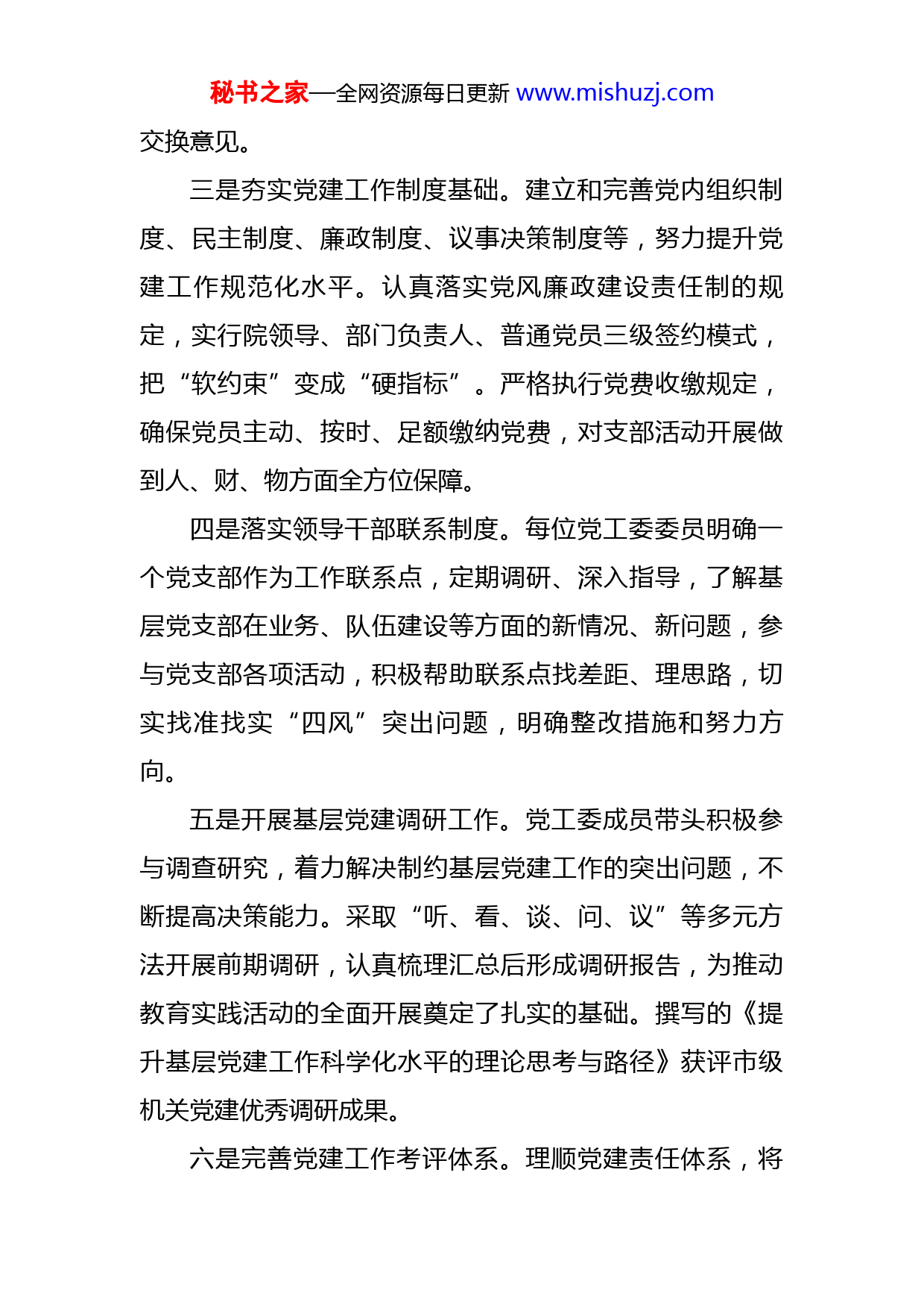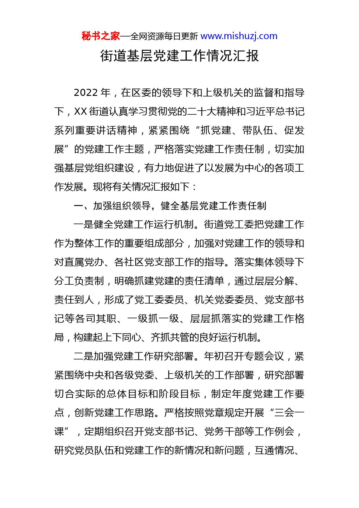 秘书之家—全网资源每日更新www.mishuzj.com街道基层党建工作情况汇报2022年,在区委的领导下和上级机关的监督和指导下,XX街道认真学习贯彻党的二十大精神和习近平总书记系列重要讲话精神,紧紧围绕“抓党建、带队伍、促发展”的党建工作主题,严格落实党建工作责任制,切实加强基层党组织建设,有力地促进了以发展为中心的各项工作发展。现将有关情况汇报如下:一、加强组织领导,健全基层党建工作责任制一是健全党建工作运行机制。街道党工委把党建工作作为整体工作的重要组成部分,加强对党建工作的领导和对直属党办、各社区党支部工作的指导。落实集体领导下分工负责制,明确抓建党建的责任清单,通过层层分解、责任到人,形成了党工委委员、机关党委委员、党支部书记等各司其职、一级抓一级、层层抓落实的党建工作格局,构建起上下同心、齐抓共管的良好运行机制。二是加强党建工作研究部署。年初召开专题会议,紧紧围绕中央和各级党委、上级机关的工作部署,研究部署切合实际的总体目标和阶段目标,制定年度党建工作要点,创新党建工作思路。严格按照党章规定开展“三会一课”,定期组织召开党支部书记、党务干部等工作例会,研究党员队伍和党建工作的新情况和新问题,互通情况、秘书之家—全网资源每日更新www.mishuzj.com交换意见。三是夯实党建工作制度基础。建立和完善党内组织制度、民主制度、廉政制度、议事决策制度等,努力提升党建工作规范化水平。认真落实党风廉政建设责任制的规定,实行院领导、部门负责人、普通党员三级签约模式,把“软约束”变成“硬指标”。严格执行党费收缴规定,确保党员主动、按时、足额缴纳党费,对支部活动开展做到人、财、物方面全方位保障。四是落实领导干部联系制度。每位党工委委员明确一个党支部作为工作联系点,定期调研、深入指导,了解基层党支部在业务、队伍建设等方面的新情况、新问题,参与党支部各项活动,积极帮助联系点找差距、理思路,切实找准找实“四风”突出问题,明确整改措施和努力方向。五是开展基层党建调研工作。党工委成员带头积极参与调查研究,着力解决制约基层党建工作的突出问题,不断提高决策能力。采取“听、看、谈、问、议”等多元方法开展前期调研,认真梳理汇总后形成调研报告,为推动教育实践活动的全面开展奠定了扎实的基础。撰写的《提升基层党建工作科学化水平的理论思考与路径》获评市级机关党建优秀调研成果。六是完善党建工作考评体系。理顺党建责任体系,将秘书之家—全网资源每日更新www.mishuzj.com党建工作纳入队伍建设、党风廉政建设责任考评中,做到党建工作与主责业务同部署、同检查。在年初层层签订责任状的基础上,按照“三级联述联评联考”要求,严格落实“三测评”、“三报告”制度,2022年街道X个社区党支部书记完成了党建工作述职。二、立足本职岗位,推进基层服务型党组织建设一是领导干部带头深入基层。党员领导干部经常性深入社区村居,与社区干部、人大代表等座谈交流,介绍推进为民、便民举措,了解基层工作的新情况和新问题,认真听取意见建议,充分了解社情民意。在“防疫情、促发展”大走访、大排查活动中,党工委委员分别走访市区机关、基层社区等X个相关部门,深入基层、倾听民意,累计座谈X百余人次,梳理意见建议X条。二是努力提升创先争优意识。号召各社区党支部争创“党员模范岗”、“党员先锋组”及“党员服务室”,推行“服务之星”评选,每月公示“工作绩效排行榜”,开展优秀共产党员、党务工作者评比等活动,充分调动党员在学习提高、争创佳绩、服务群众、弘扬正气等方面的模范带头作用,不断强化宗旨意识和公仆意识,大力倡导争先进、创先进、学先进之风。三是积极开展志愿服务活动。积极落实“双报到”全员支援多个社区防抗疫情战斗,有X名党员自愿加入到捐秘书之家—全网资源每日更新www.mishuzj.com献造血干细胞志愿者的行列,积极参加造血干细胞血样采集活动,践行互助友爱的志愿精神。暑期,开展为民服务系列活动,深入X村、X村等X个试点村,通过布展宣传板面、播放视频、赠送书籍、提供现场咨询等方式,为群众解决实际问题XX个。四是健全党内激励关怀机制。积极落实以人为本理念,建立党内关爱制度,通过集体生日会、困难家庭摸底补助、节前走访慰问离退休老干部等举措,切实为党员办实事、做好事、解难事,使广大党员深切感受到组织的关怀和温暖,提高党组织的凝聚力和向心力。各支部始终把增强凝聚力作为工作的前提和出发点,支部领导落实“必访、必谈”制度,关心每位党员思想动态和生活近况,着力创造拴心留人和干事创业的良好氛围。三、坚持从严管理,夯实党组织和党员干部队伍建设一是选优配强班子组成。街道党工委于2022年顺利完成了换届工作,新老班子过渡平稳、衔接顺畅。同时,按照“把支部建在社区基层”的工作思路,X个社区已全部实现单独建支,严格按照组织程序选举产生各支部委员会,各社区支部书记,实行“一岗双责”。建立党组织晋位升级长效机制,帮助整改提高,切实巩固先进、整顿后进。加强党工委委员、各支部委员等党务干部的培养管理,组织参加区举办的“党务干部培训班”,进一步开拓党建工秘书之