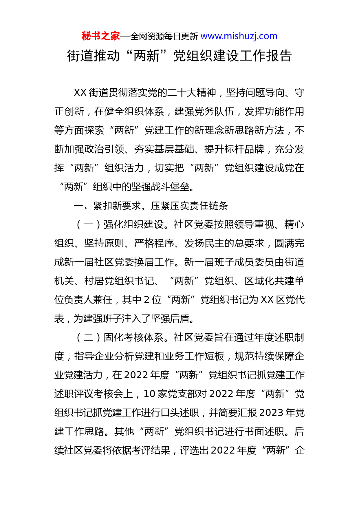 秘书之家—全网资源每日更新www.mishuzj.com街道推动“两新”党组织建设工作报告XX街道贯彻落实党的二十大精神,坚持问题导向、守正创新,在健全组织体系,建强党务队伍,发挥功能作用等方面探索“两新”党建工作的新理念新思路新方法,不断加强政治引领、夯实基层基础、提升标杆品牌,充分发挥“两新”组织活力,切实把“两新”党组织建设成党在“两新”组织中的坚强战斗堡垒。一、紧扣新要求,压紧压实责任链条(一)强化组织建设。社区党委按照领导重视、精心组织、坚持原则、严格程序、发扬民主的总要求,圆满完成新一届社区党委换届工作。新一届班子成员委员由街道机关、村居党组织书记、“两新”党组织、区域化共建单位负责人兼任,其中2位“两新”党组织书记为XX区党代表,为建强班子注入了坚强后盾。(二)固化考核体系。社区党委旨在通过年度述职制度,指导企业分析党建和业务工作短板,规范持续保障企业党建活力,在2022年度“两新”党组织书记抓党建工作述职评议考核会上,10家党支部对2022年度“两新”党组织书记抓党建工作进行口头述职,并简要汇报2023年党建工作思路。其他“两新”党组织书记进行书面述职。后续社区党委将依据考评结果,评选出2022年度“两新”企秘书之家—全网资源每日更新www.mishuzj.com业及党员各类优秀。(三)掀起学习热潮。各“两新”党组织切实把思想和行动统一到党的二十大精神上来,推动精神入脑入心。社区党委组织“两新”党组织党务聆听社区党校讲师《用新的伟大奋斗创造新的伟业——学习贯彻党的二十大精神》主题党课。XX楼宇党支部开展“学习二十大、迈向新征程”主题党日活动,邀请社区党校讲师XX源作主题为“认真学习贯彻党的二十大精神”的专题党课。为推进专业发展,加强队伍建设,专业社工站联合党支部在通过腾讯会议平台,开展线上“奋进新征程、共创新成就”学习贯彻党的二十大精神专题讲座暨“我为自强发展借言献策”交流培训会,邀请了社区党校讲师XX为大家作专题辅导。各“两新”党组织通过主题党日活动,组织党员专题学习《党的二十大报告辅导百问》、《二十大党章修正案学习问答》、《习近平总书记在中央政治局民主生活会》、《中央经济工作会议、中央农村工作会议上的重要讲话精神》及十二届市委二次全会精神和六届区委五次全会精神。进一步引领“两新”组织党员立足工作实际,守正创新,领悟思想,担当作为,求真务实,推动党的二十大精神付诸行动、见诸成效。二、立足新使命,全心全力发挥作用(一)抓辐射强示范。XX物业管理服务有限公司党支秘书之家—全网资源每日更新www.mishuzj.com部围绕“‘申’耕初心·勤奋作为”党建品牌,从夯实“基”、深植“根”方面着手,精准施策、靶向发力,始终坚持“用脚步丈量责任、用真情服务群众”,充分发挥党组织在服务企业、服务社会、服务党员、服务群众中的标杆引领作用,并通过设立党员责任区、党员示范岗、党员先锋岗,带动广大党员员工创先争优,有效实现物业管理服务与基层治理深度融合,形成凝心聚力促发展的良好氛围。(二)聚优势强引领。为推动党建引领社区治理再上新台阶,XX街道社会组织联合会党支部与XX居民区党总支举行结对共建签约仪式。共建双方就结对共建,党建引领社区治理等主题进行座谈交流。XX护理院党支部将通过加强社区联动,调配医疗物资,充足药物储备等措施,扩充医疗救护能力,不断优化医疗服务质量和医疗服务水平,提升老年居民幸福指数,使社区每位老年人都能安度幸福晚年。春节前夕,党支部一行还来到XX街道结对村居XX居委会,慰问社区困难老人。(三)重指导强服务。为进一步加强面对疫情防控的防护能力,XX街道养护院党支部组织全体党员和员工开展疫情防控线上培训会,并组织各部门负责人深入开展疫情防控、安全检查工作,切实抓实抓细各项检查措施,为养护院创造了一个安全舒适的生活环境。XX护理院党支部组秘书之家—全网资源每日更新www.mishuzj.com织开展新型冠状病毒感染防控线上培训会。培训会后,党支部持续深化培训内容,通过在病区开展问答、小范围学习会的形式不断强化医护记忆,组织实战演练,更好地守护住院患者和周边居民的健康。三、展现新担当,互帮互助传递温暖(一)点亮“新”语心愿。区委组织部会同区合作交流办开展“善行·暖心——青滇心连心·点亮微心愿”微公益活动,活动一经推出,得到了“两新”党组织的积极响应,XX社工站党支部共13人认领微心愿,XX乡中心小学学生送上浓浓爱意的爱心校服,为他们送去关爱和温暖。为迎接第31个“国际残疾人日”的到来,XX股份有限公司党支部积极参与2022年“国际残疾人日”主题活动,向XX区残疾人读书会捐赠5万元。(二)坚持担当作为。在2022年11下旬发布首个寒潮蓝色预警后,XX果蔬合作社党支部及时作出相应对策,组织农户进行大规模抢收,并对大棚膜进行内胆棚架结构加固、修复棚膜漏洞等一系列措施,并邀请农技专家提供专业指导,采用更具针对性的方法等,来保障冬季蔬菜不断茬,满足市场蔬菜供应需求。XX建筑工程有限公司分别向XX市慈善基金会和XX市慈善基金会XX区代表处捐款,共计人民币7万元整。(三)做实纾困帮扶。各“两新”广泛开展“迎新秘书之家—全网资源每日更新www.m