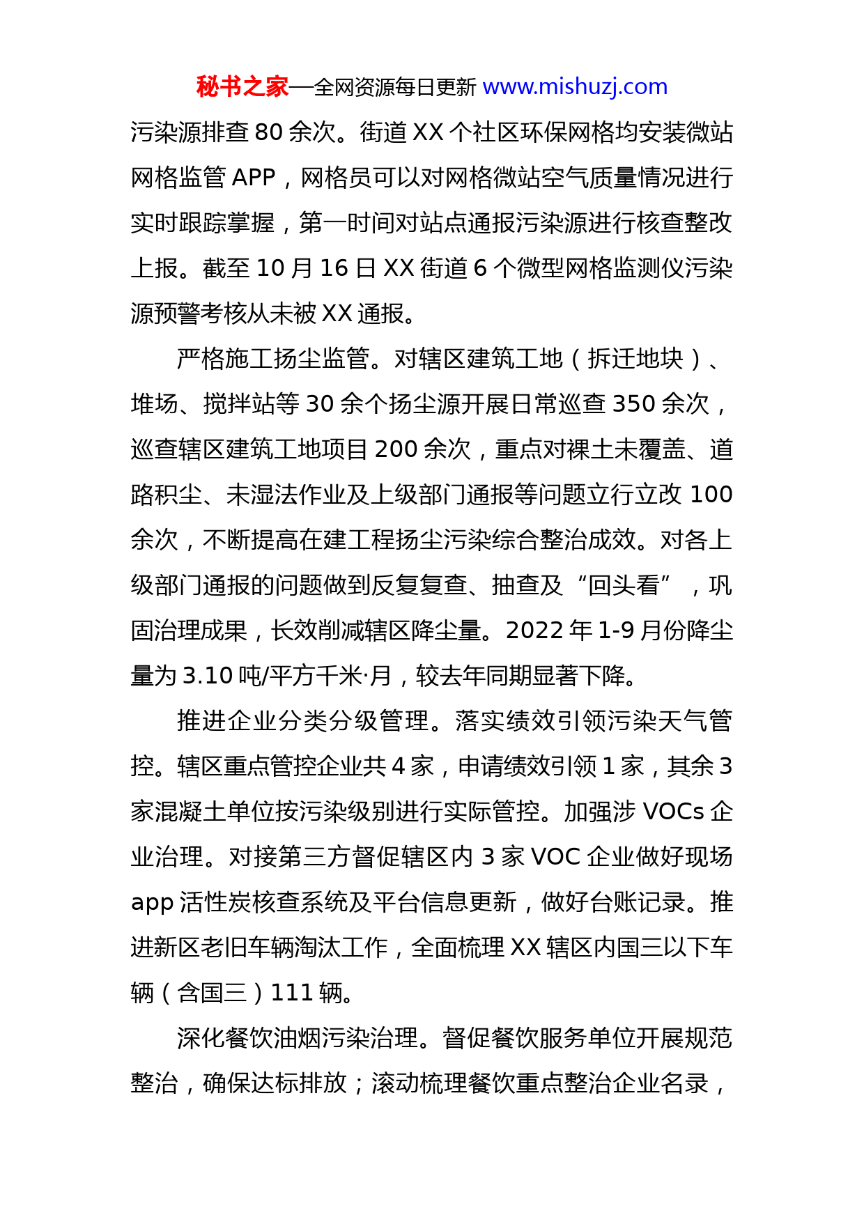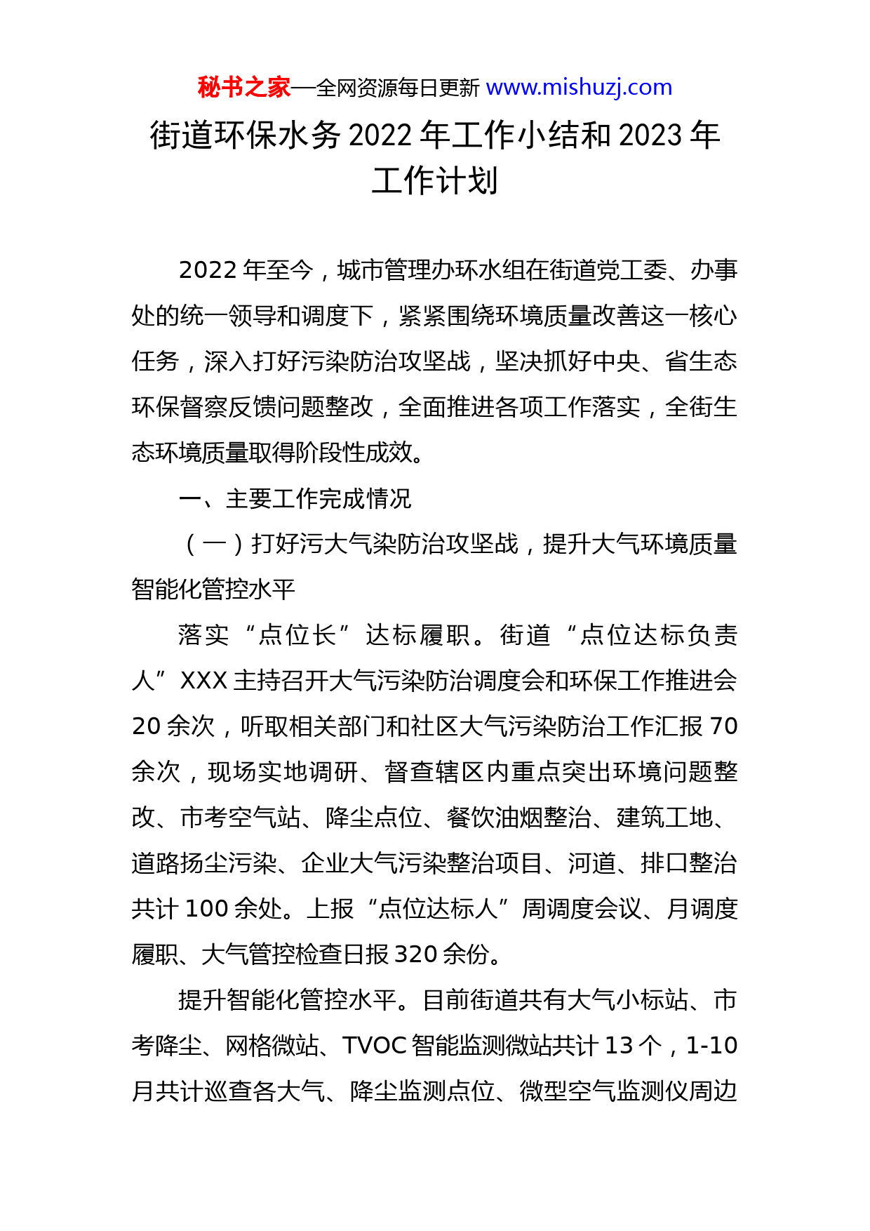 秘书之家—全网资源每日更新www.mishuzj.com街道环保水务2022年工作小结和2023年工作计划2022年至今,城市管理办环水组在街道党工委、办事处的统一领导和调度下,紧紧围绕环境质量改善这一核心任务,深入打好污染防治攻坚战,坚决抓好中央、省生态环保督察反馈问题整改,全面推进各项工作落实,全街生态环境质量取得阶段性成效。一、主要工作完成情况(一)打好污大气染防治攻坚战,提升大气环境质量智能化管控水平落实“点位长”达标履职。街道“点位达标负责人”XXX主持召开大气污染防治调度会和环保工作推进会20余次,听取相关部门和社区大气污染防治工作汇报70余次,现场实地调研、督查辖区内重点突出环境问题整改、市考空气站、降尘点位、餐饮油烟整治、建筑工地、道路扬尘污染、企业大气污染整治项目、河道、排口整治共计100余处。上报“点位达标人”周调度会议、月调度履职、大气管控检查日报320余份。提升智能化管控水平。目前街道共有大气小标站、市考降尘、网格微站、TVOC智能监测微站共计13个,1-10月共计巡查各大气、降尘监测点位、微型空气监测仪周边秘书之家—全网资源每日更新www.mishuzj.com污染源排查80余次。街道XX个社区环保网格均安装微站网格监管APP,网格员可以对网格微站空气质量情况进行实时跟踪掌握,第一时间对站点通报污染源进行核查整改上报。截至10月16日XX街道6个微型网格监测仪污染源预警考核从未被XX通报。严格施工扬尘监管。对辖区建筑工地(拆迁地块)、堆场、搅拌站等30余个扬尘源开展日常巡查350余次,巡查辖区建筑工地项目200余次,重点对裸土未覆盖、道路积尘、未湿法作业及上级部门通报等问题立行立改100余次,不断提高在建工程扬尘污染综合整治成效。对各上级部门通报的问题做到反复复查、抽查及“回头看”,巩固治理成果,长效削减辖区降尘量。2022年1-9月份降尘量为3.10吨/平方千米·月,较去年同期显著下降。推进企业分类分级管理。落实绩效引领污染天气管控。辖区重点管控企业共4家,申请绩效引领1家,其余3家混凝土单位按污染级别进行实际管控。加强涉VOCs企业治理。对接第三方督促辖区内3家VOC企业做好现场app活性炭核查系统及平台信息更新,做好台账记录。推进新区老旧车辆淘汰工作,全面梳理XX辖区内国三以下车辆(含国三)111辆。深化餐饮油烟污染治理。督促餐饮服务单位开展规范整治,确保达标排放;滚动梳理餐饮重点整治企业名录,秘书之家—全网资源每日更新www.mishuzj.com针对信访投诉集中、整改反复的餐饮服务单位持续开展强化综合整治,积极化解矛盾。2022年XX街道餐饮整治任务为规范整治40家,其中加装、更换高效油烟净化器15家,安装油烟在线监控10家。推进辖区餐饮单位“码上洗”平台注册,目前辖区共完成112家大型餐饮及烧烤重油烟单位的注册推广,剩余轻油烟餐饮单位做好持续推广工作。强化秸秆禁烧巡查。建立巡查网格体系,广泛宣传教育营造禁烧氛围。共悬挂秸秆禁烧宣传横幅24条,利用小区电子显示屏宣传50余次。禁烧期间每日对辖区重点区域开展巡查,未发现有焚烧秸秆情况。(二)夯实防汛排涝基础保障,巩固提升水环境治理成效全力做好汛前准备和暴雨防范工作,进一步夯实城市防汛排涝基础保障。一是建立完善指挥体制机制,修订完善了应急预案,明确了领导防汛抗旱责任分工及全街重点区域、重要防洪工程防汛责任人。二是从严从实从细彻查度汛安全隐患。制定7处重点积淹水地段“一点一案”,牵头推进完成2022年积淹水点整治项目,缓解辖区积淹水情况。对泵站储备的所有机械、设备都进行了维护保养,确保能正常运转、及时排涝。对街道XX路、XX路、XX路、XX路等城市主道路、主要道路市政管网、泄洪沟进行秘书之家—全网资源每日更新www.mishuzj.com全面疏浚。对XX、XX等九个居民组泄洪沟清理,增强农村泄洪防涝能力。三是积极做好防汛储备物资采购补库工作,提高街道防汛物资储备效能。四是进一步强化队伍防汛抗旱应急能力,筹备组建抢险队伍(11个社区、综合执法大队、物业公司),共440人。开展防汛知识培训及防汛技能演练等相关工作。五是切实做好应急值班值守。入汛以来,严格落实汛期24小时领导带班值班制度,统筹做好极端天气防范工作,确保有效应对突发情况。全面落实河长制和水环境提质增效工作相结合,科学有序地整治水环境。常态化河道养护,签订年度养护合同,累计投入养护费用XXX万元,增设河道安全警示牌56块。全面落实河长制工作,开展河长制主题专项培训,积极推动落实街道级、社区级和志愿者河道巡查履职,累计巡河1299次,形成全街道河道水系管护责任机制。开展河道排口整治。结合前期中央环保反馈引水河、龙南河河水水质问题,对区域内18条河道生活排口、农业排口、城镇雨洪排口和工业排口,逐一标注、逐一溯源核查,已完成整治排污口98个,完成率达96%。同时加强360个河道排口日常监管、水质检测,杜绝污水下河入江。巩固水环境治理成效。配合XXX、XXX等开展水环境提升、雨污分流、不稳定水体专项整治。着力打造亲水空间。结合全河长制主题公园、XX河河道改造、XX商业步行街改造、地秘书之家—全网资源每日更新www.mishuzj.com铁口整治,纵深推动河道、绿道、贯通联通,打造亲水生态长廊。(三)筑牢生态安
