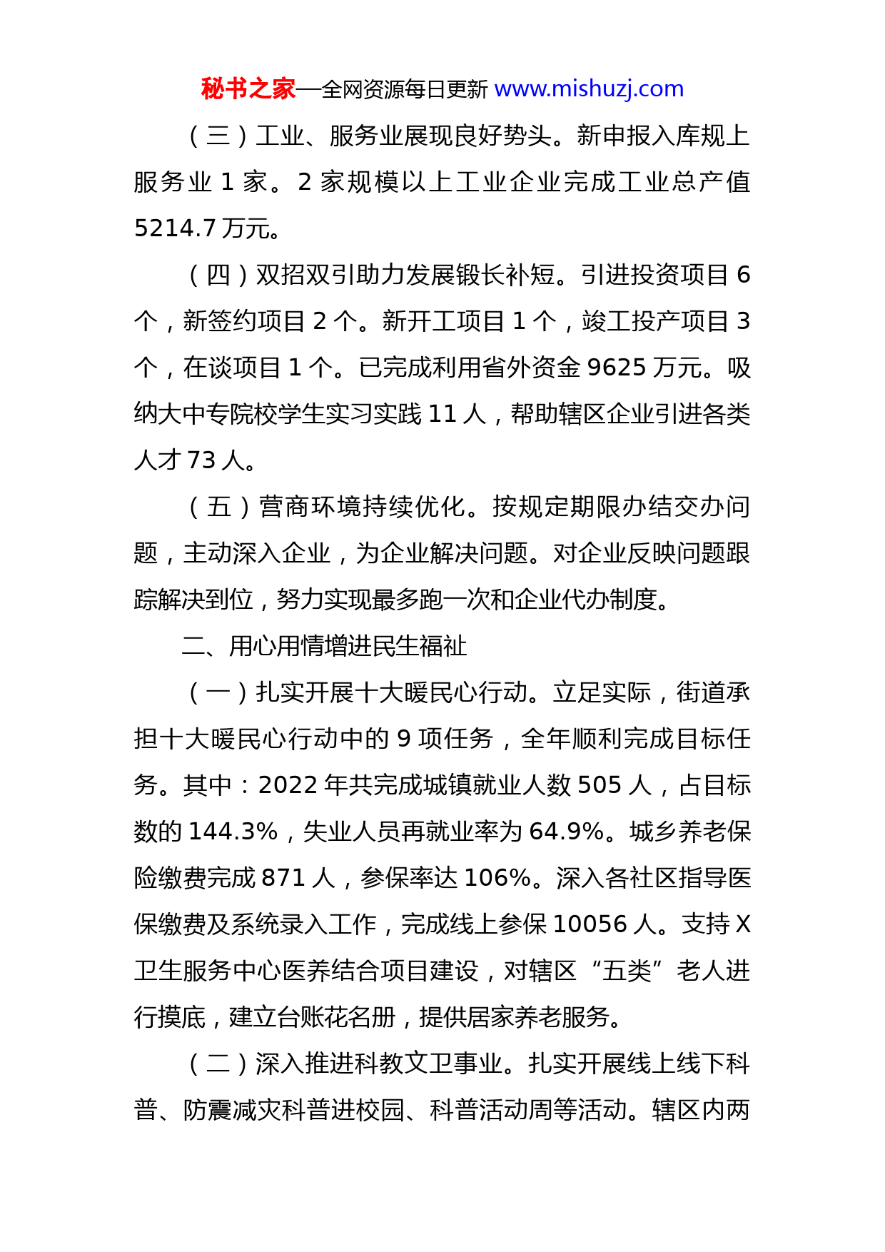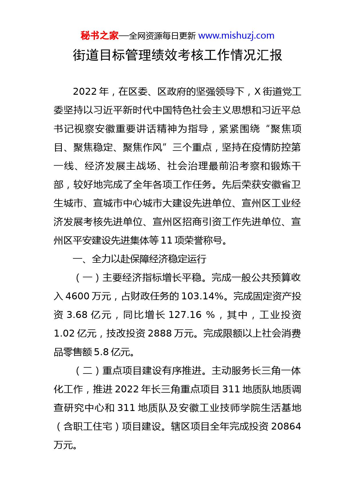 秘书之家—全网资源每日更新www.mishuzj.com街道目标管理绩效考核工作情况汇报2022年,在区委、区政府的坚强领导下,X街道党工委坚持以习近平新时代中国特色社会主义思想和习近平总书记视察安徽重要讲话精神为指导,紧紧围绕“聚焦项目、聚焦稳定、聚焦作风”三个重点,坚持在疫情防控第一线、经济发展主战场、社会治理最前沿考察和锻炼干部,较好地完成了全年各项工作任务。先后荣获安徽省卫生城市、宣城市中心城市大建设先进单位、宣州区工业经济发展考核先进单位、宣州区招商引资工作先进单位、宣州区平安建设先进集体等11项荣誉称号。一、全力以赴保障经济稳定运行(一)主要经济指标增长平稳。完成一般公共预算收入4600万元,占财政任务的103.14%。完成固定资产投资3.68亿元,同比增长127.16%,其中,工业投资1.02亿元,技改投资2888万元。完成限额以上社会消费品零售额5.8亿元。(二)重点项目建设有序推进。主动服务长三角一体化工作,推进2022年长三角重点项目311地质队地质调查研究中心和311地质队及安徽工业技师学院生活基地(含职工住宅)项目建设。辖区项目全年完成投资20864万元。秘书之家—全网资源每日更新www.mishuzj.com(三)工业、服务业展现良好势头。新申报入库规上服务业1家。2家规模以上工业企业完成工业总产值5214.7万元。(四)双招双引助力发展锻长补短。引进投资项目6个,新签约项目2个。新开工项目1个,竣工投产项目3个,在谈项目1个。已完成利用省外资金9625万元。吸纳大中专院校学生实习实践11人,帮助辖区企业引进各类人才73人。(五)营商环境持续优化。按规定期限办结交办问题,主动深入企业,为企业解决问题。对企业反映问题跟踪解决到位,努力实现最多跑一次和企业代办制度。二、用心用情增进民生福祉(一)扎实开展十大暖民心行动。立足实际,街道承担十大暖民心行动中的9项任务,全年顺利完成目标任务。其中:2022年共完成城镇就业人数505人,占目标数的144.3%,失业人员再就业率为64.9%。城乡养老保险缴费完成871人,参保率达106%。深入各社区指导医保缴费及系统录入工作,完成线上参保10056人。支持X卫生服务中心医养结合项目建设,对辖区“五类”老人进行摸底,建立台账花名册,提供居家养老服务。(二)深入推进科教文卫事业。扎实开展线上线下科普、防震减灾科普进校园、科普活动周等活动。辖区内两秘书之家—全网资源每日更新www.mishuzj.com家企业入库国家科技型中小企业。加大对校外培训机构排查力度,常态化开展防溺水宣传教育活动,对辖区中、小学、幼儿园及校外培训机构开展返校复学工作督查及模拟演练。开展文旅行业疫情防控巡查、安全生产检查、制止网吧KTV疫情期间晚上聚集性活动,加强农家书屋和综合文化服务中心管理,拆除非法小锅子21个。深入开展三孩政策宣传,及时兑现、落实各项利导政策,发放补助金53.48万元,优化服务能力,提升卫生健康服务水平,全面完成孕检、婚检、“两癌”筛查工作,促进人口长期均衡发展。(三)全力保障疫情防控工作。深入贯彻落实常态化疫情防控管理,充分做好核酸检测准备,共设置32个核酸检测点,开展辖区4.4万人口的信息采集、登记,全年开展区域核酸检测22次。严格按照“三员一长”工作制度落实包保管控责任,有序开展疫苗接种工作,疫苗接种16169人次,圆满完成接种任务。切实把握疫情防控转段后的重点工作,及时摸排辖区65岁以上老年人、0-6岁儿童、孕产妇及其他基础疾病患者,有序开展重点人群健康服务,保证辖区弱势群体安全度过疫情暴发。(四)认真落实民政各项救助工作。主动夯实“应保尽保”,新增城市低保9人,退出城市及农村低保34人,常态化开展困难慰问和救助工作。对已建成社区养老服务秘书之家—全网资源每日更新www.mishuzj.com设施进行专项检查,做好日间照料中心疫情防控及消防工作。开展政府购买第三方服务试点工作,对辖区有关民政对象开展救助服务。全部完成街道残疾人工作站和社区残疾人之家建设并投入正常使用。(五)巩固拓展脱贫攻坚成果同乡村振兴有效衔接。帮助脱贫户和边缘户申报产业振兴、就业振兴、教育振兴和金融振兴等到户产业项目,申报产业振兴补助3户、就业振兴补助2户、雨露计划1户、金融振兴补助5户,做到应报尽报。全面开展2022年度收入核查,完善“一户一方案、一人一措施”工作。(六)加强国防动员和退役军人事务管理。扎实做好民兵整组、民兵训练等基础性工作,进一步完善基层规范化建设质量,为部队输送4名优秀青年。认真落实各项优抚安置政策,开展退役军人优待证发放及悬挂光荣牌工作,全年在宣城日报、宣州民政等媒体刊登相关报道二十余篇。(七)提升统战宗教事务工作水平。积极开展华人华侨及侨眷等普查工作;开展政协委员、非公企业慰问困难家庭儿童活动,累计慰问11人;及时处置利用私人门面、公众场合的非法聚会、非法散发传单活动。(八)夯实为民服务各项工作。扎实开展人大提案办理工作,组织辖区人大代表围绕群众急难愁盼问题和诉求秘书之家—全网资源每日更新www.mishuzj.com提出意见建议,全年提交建议46条。严格开展为民服务全程代理,切实打造政务服务“一张网”,让办事群众最多跑一次,公共资源交易严格遵守规章制度,按季上报项目备案,做到公共资源交易事前、事中