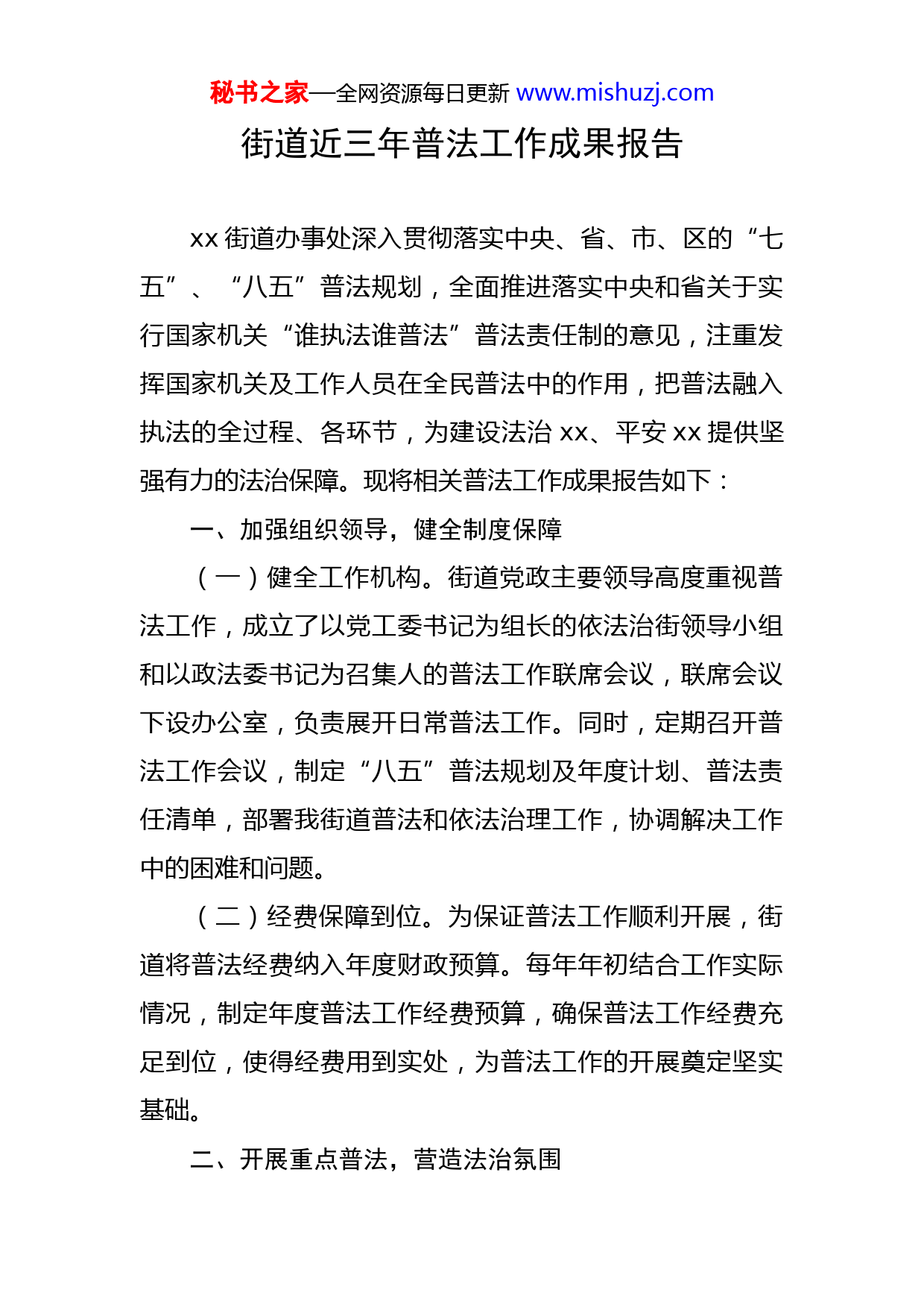 秘书之家—全网资源每日更新www.mishuzj.com街道近三年普法工作成果报告xx街道办事处深入贯彻落实中央、省、市、区的“七五”、“八五”普法规划,全面推进落实中央和省关于实行国家机关“谁执法谁普法”普法责任制的意见,注重发挥国家机关及工作人员在全民普法中的作用,把普法融入执法的全过程、各环节,为建设法治xx、平安xx提供坚强有力的法治保障。现将相关普法工作成果报告如下:一、加强组织领导,健全制度保障(一)健全工作机构。街道党政主要领导高度重视普法工作,成立了以党工委书记为组长的依法治街领导小组和以政法委书记为召集人的普法工作联席会议,联席会议下设办公室,负责展开日常普法工作。同时,定期召开普法工作会议,制定“八五”普法规划及年度计划、普法责任清单,部署我街道普法和依法治理工作,协调解决工作中的困难和问题。(二)经费保障到位。为保证普法工作顺利开展,街道将普法经费纳入年度财政预算。每年年初结合工作实际情况,制定年度普法工作经费预算,确保普法工作经费充足到位,使得经费用到实处,为普法工作的开展奠定坚实基础。二、开展重点普法,营造法治氛围秘书之家—全网资源每日更新www.mishuzj.com(一)以党员干部为重点,认真开展学法活动。一是建立健全领导干部学法制度,组织街道领导干部集中学习《宪法》《行政处罚法》《民法典》《国家安全法》等法律法规,培养街道领导干部依法行政、依法治理的能力,进一步发挥街道领导干部在尊法、学法、用法和守法中的表率作用。二是健全日常学法制度,组织街道工作人员参加年度学法考试,每年干部职工年度内学法时间不得少于40小时,此外每年举办4次以上法治教育学习讲座,组织党员、干部观看法治宣传纪录片、庭审等,强化广大党员、干部的法律意识。(二)以村居为重点,认真开展普法知识宣传培训活动。一是在全街道11个村居设置法治宣传专栏,确保每个村(社区)拥有至少一个宣传窗口,紧密结合各阶段的形势、任务及要求,及时更新宣传栏内容,向群众宣传通俗易懂的法律知识。并定期在各村居内人流密集的场所设立咨询台,利用标语、横幅、宣传海报等材料开展宣传活动,向广大群众宣传法律法规。二是定期组织召开法治讲座、工作推进会,为村(社区)委会换届选举、疫情防控相关工作提供了极大助力。(三)以企业为重点,强化安全法治知识教育。秘书之家—全网资源每日更新www.mishuzj.com街道以安全生产工作为着力点,坚持进企业进行法律宣传,督促企业管理人员、外来务工人员重点学习《合同法》、《交通安全法》、《安全生产法》等法律法规。一方面提升企业经营管理人员的法律意识,促高企业经营管理人员依法经营、依法管理水平;另一方面,不断提高企业职工的法律素质和依法维权能力,维护外来务工人员合法权益。(四)以青少年为重点,认真开展法制教育活动。在学校内举行法治宣传讲座、派发宣传资料,组织学生学习《教育法》《未成年人保护法》《预防未成年人犯罪法》等法律法规,着重抓好学校在法治教育中的计划、课时、教材、师资“四落实”工作。三、深化普法依法治理,推进民主法治建设(一)以“法治创建”为抓手,提高依法治理能力。xx街道在不断规范普法依法治理工作的同时,探索以“法治xx”创建引领基层治理水平提升,在深入“民主法治村(社区)”创建工作的过程中,各村社区将民主法治建设与平安建设、精神文明建设紧密结合,全面推进基层民主法治建设。现阶段已完成法治街道创建,实现“民主法治村”全覆盖。(二)以“法德同治”为抓手,优化社会法治环境。为增强法治宣传教育工作针对性、实用性和群众的参与秘书之家—全网资源每日更新www.mishuzj.com性,打造了海韵广场、上角村、新村村、晓联村等法治文化公园,扎实推进“法德同治”社区建设,积极将家庭美德、夫妻和睦、邻里团结、尊老爱幼等道德文化与法律知识有机结合起来,着力增强普法的针对性和实效性,进一步满足人民群众的法治需求,维护社会和谐稳定。村居民的主人翁意识及法律意识明显得到增强,形成了“办事依法、遇事找法、解决问题用法、化解矛盾靠法”的良好氛围。近三年来我街道共开展法治宣传活动100余场;调处各类纠纷及信访事项300余宗。(三)是以“法治xx”为抓手,普法实践显成效。我街道以“法治xx”建设为核心,坚持将法治宣传教育贯彻于法治实践中,在执法的过程中进行实时普法、精准普法,以生动直观的方式把法理、情理讲清楚,让人民群众更好地理解法律规定,也让人民群众在法治实践中感受法治精神。以此促进严格、规范、公正、文明执法,减少执法中的冲突和对立,维护社会和谐稳定。治国凭圭皋,安邦靠准绳。接下来,xx街道将继续深入研究新时期普法工作的新特点和普法新形势,探索新常态下普法宣传方法,继续推动“大普法”工作格局,进一步巩固普法成果,在全社会营造良好的法治氛围。