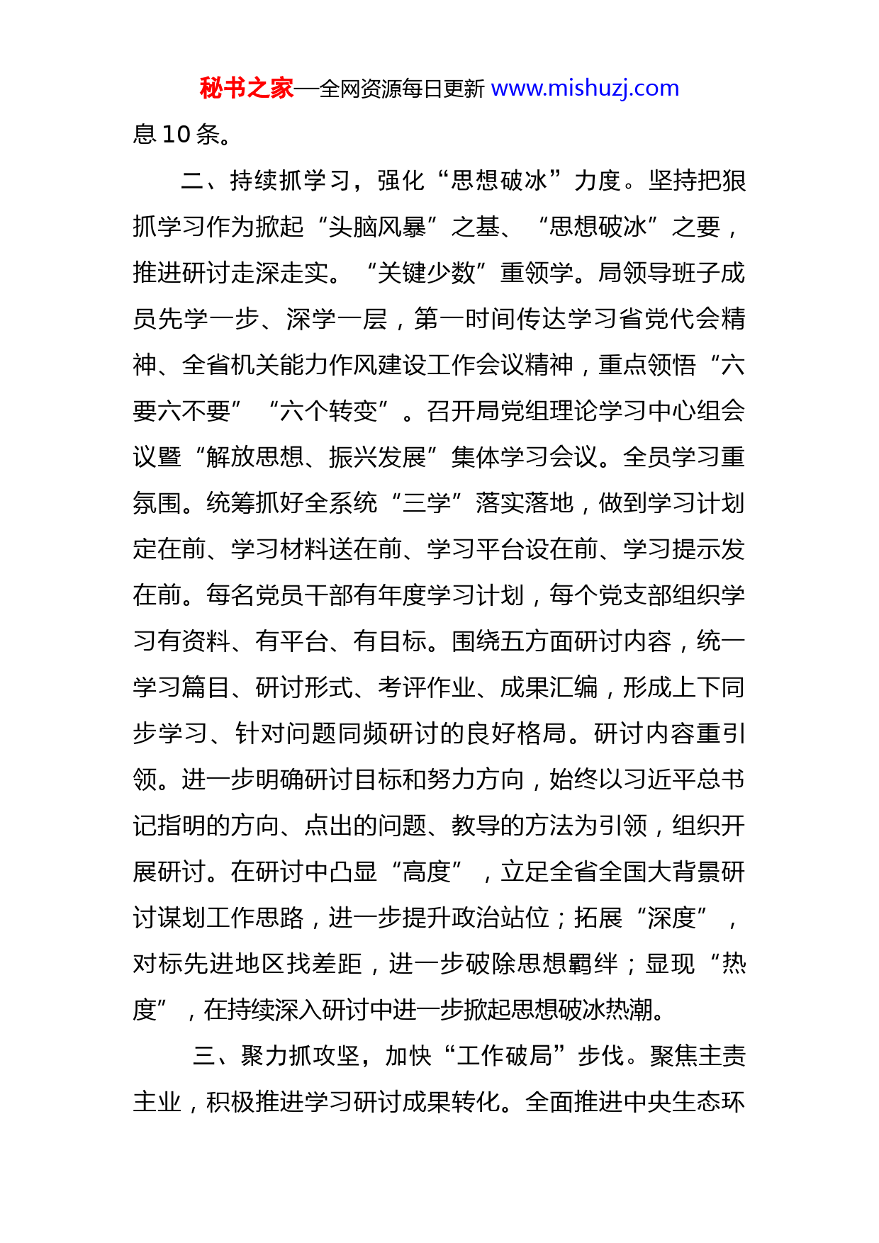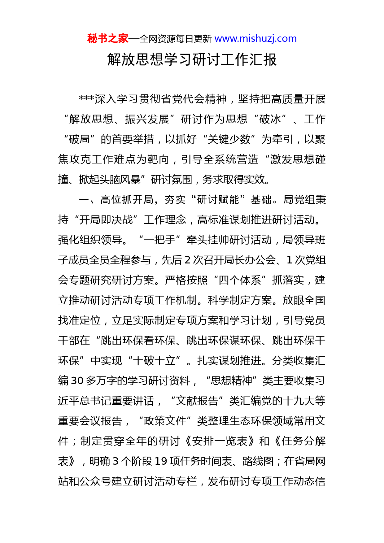 秘书之家—全网资源每日更新www.mishuzj.com解放思想学习研讨工作汇报深入学习贯彻省党代会精神,坚持把高质量开展“解放思想、振兴发展”研讨作为思想“破冰”、工作“破局”的首要举措,以抓好“关键少数”为牵引,以聚焦攻克工作难点为靶向,引导全系统营造“激发思想碰撞、掀起头脑风暴”研讨氛围,务求取得实效。一、高位抓开局,夯实“研讨赋能”基础。局党组秉持“开局即决战”工作理念,高标准谋划推进研讨活动。强化组织领导。“一把手”牵头挂帅研讨活动,局领导班子成员全员全程参与,先后2次召开局长办公会、1次党组会专题研究研讨方案。严格按照“四个体系”抓落实,建立推动研讨活动专项工作机制。科学制定方案。放眼全国找准定位,立足实际制定专项方案和学习计划,引导党员干部在“跳出环保看环保、跳出环保谋环保、跳出环保干环保”中实现“十破十立”。扎实谋划推进。分类收集汇编30多万字的学习研讨资料,“思想精神”类主要收集习近平总书记重要讲话,“文献报告”类汇编党的十九大等重要会议报告,“政策文件”类整理生态环保领域常用文件;制定贯穿全年的研讨《安排一览表》和《任务分解表》,明确3个阶段19项任务时间表、路线图;在省局网站和公众号建立研讨活动专栏,发布研讨专项工作动态信秘书之家—全网资源每日更新www.mishuzj.com息10条。二、持续抓学习,强化“思想破冰”力度。坚持把狠抓学习作为掀起“头脑风暴”之基、“思想破冰”之要,推进研讨走深走实。“关键少数”重领学。局领导班子成员先学一步、深学一层,第一时间传达学习省党代会精神、全省机关能力作风建设工作会议精神,重点领悟“六要六不要”“六个转变”。召开局党组理论学习中心组会议暨“解放思想、振兴发展”集体学习会议。全员学习重氛围。统筹抓好全系统“三学”落实落地,做到学习计划定在前、学习材料送在前、学习平台设在前、学习提示发在前。每名党员干部有年度学习计划,每个党支部组织学习有资料、有平台、有目标。围绕五方面研讨内容,统一学习篇目、研讨形式、考评作业、成果汇编,形成上下同步学习、针对问题同频研讨的良好格局。研讨内容重引领。进一步明确研讨目标和努力方向,始终以习近平总书记指明的方向、点出的问题、教导的方法为引领,组织开展研讨。在研讨中凸显“高度”,立足全省全国大背景研讨谋划工作思路,进一步提升政治站位;拓展“深度”,对标先进地区找差距,进一步破除思想羁绊;显现“热度”,在持续深入研讨中进一步掀起思想破冰热潮。三、聚力抓攻坚,加快“工作破局”步伐。聚焦主责主业,积极推进学习研讨成果转化。全面推进中央生态环秘书之家—全网资源每日更新www.mishuzj.com境保护督察整改。自觉站在落实党中央重大决策部署和维护国家“五大安全”的战略高度考量工作,研究制定《贯彻落实中央生态环境保护督察报告整改方案》,针对55项具体问题制定整改措施、落实具体责任、明确整改标准,聚焦5个典型案例实施全领域、全过程精准问责、终身追责,明确信访案件2023年底前整改到位。全力打好污染防治攻坚战。结合实施集中攻坚破难行动,组织57家单位反复沟通会商、研究起草《深入打好污染防治攻坚战责任分工方案》,重点实施“13686”具体举措,即大力实施1个绿色低碳发展战略,深入打好蓝天、碧水、净土“3场保卫战”,深入打好重污染天气消除攻坚战等“6个攻坚战”,深入开展推进碳达峰、绿色生活创建等“8个行动”,构建绿色低碳循环发展经济、环境风险防控和应急管理等“6个体系”,并分解形成清单台账,逐项明确责任主体、完成时限。全线开展生态环境保护专项执法行动。坚持问题导向、效能优先、系统科学原则,研究制定《2022年生态环境保护专项执法行动计划》,从水、大气、土壤、核与辐射和工业园区五个方面,制定11项行动实施方案,明确工作要求、任务和时限,以过硬措施、过硬作风打赢生态环境执法整体仗、协同仗、主动仗,对环境违法行为形成高压震慑,为全面振兴全方位振兴提供有力支撑。
