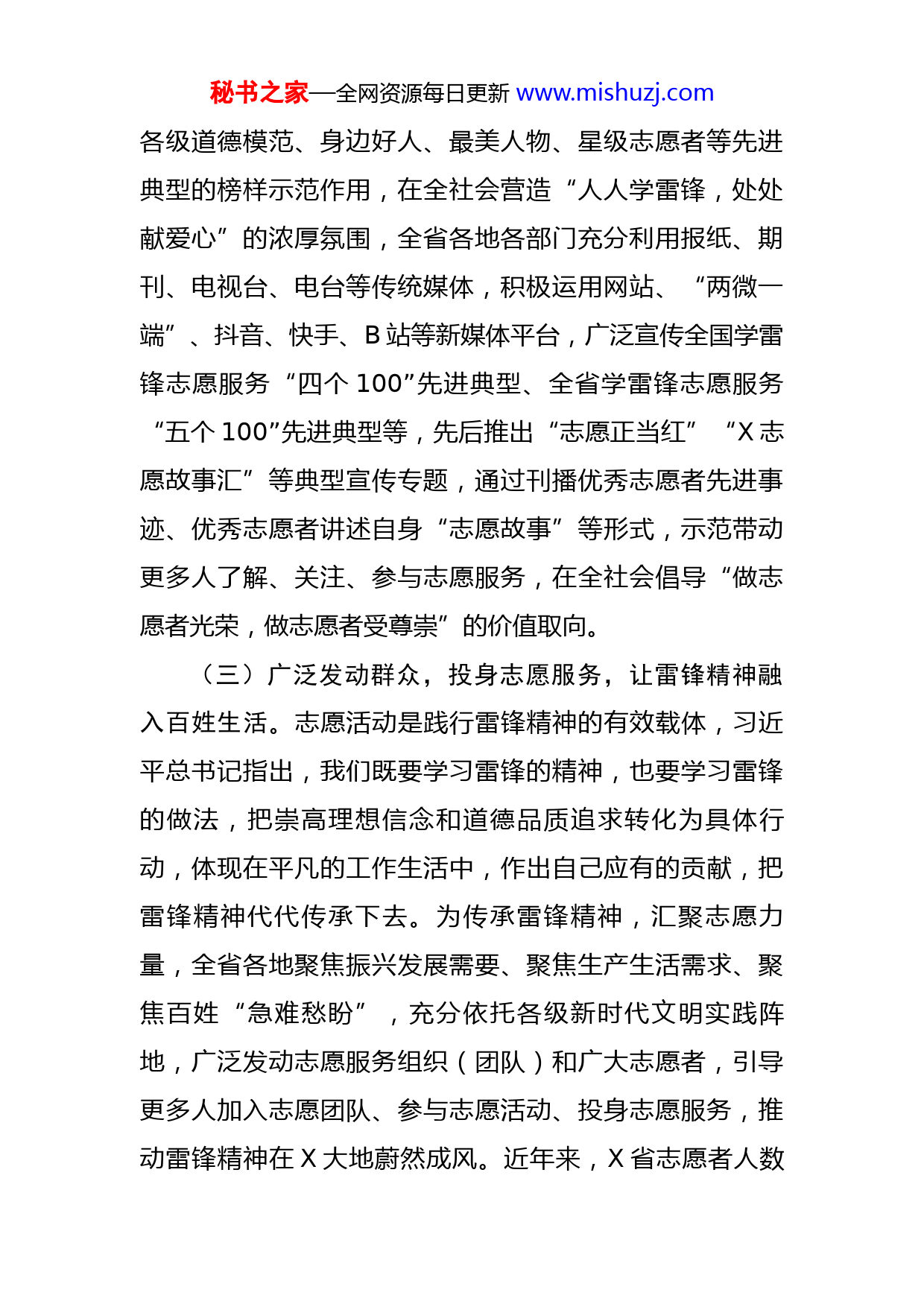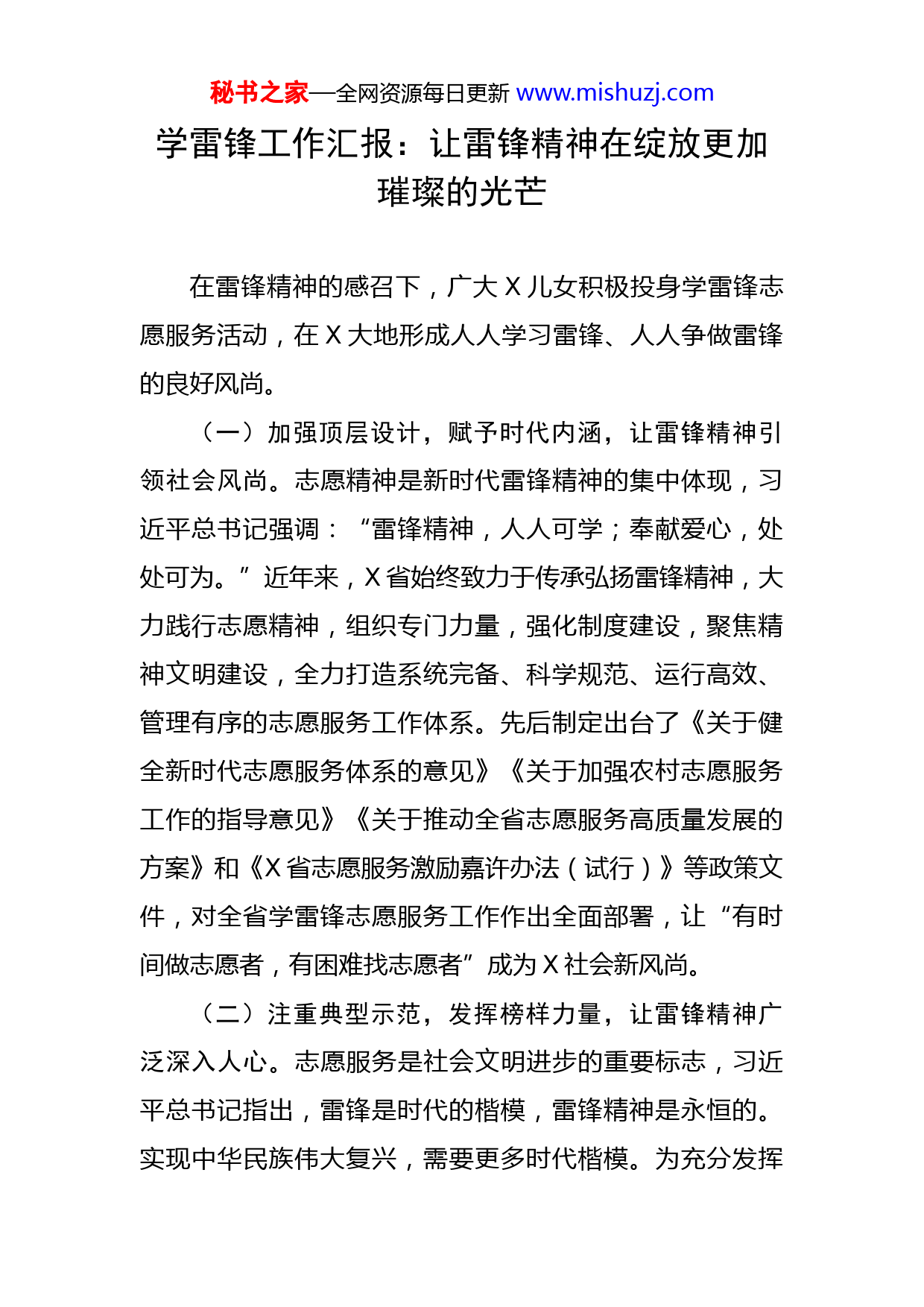 秘书之家—全网资源每日更新www.mishuzj.com学雷锋工作汇报:让雷锋精神在绽放更加璀璨的光芒在雷锋精神的感召下,广大X儿女积极投身学雷锋志愿服务活动,在X大地形成人人学习雷锋、人人争做雷锋的良好风尚。(一)加强顶层设计,赋予时代内涵,让雷锋精神引领社会风尚。志愿精神是新时代雷锋精神的集中体现,习近平总书记强调:“雷锋精神,人人可学;奉献爱心,处处可为。”近年来,X省始终致力于传承弘扬雷锋精神,大力践行志愿精神,组织专门力量,强化制度建设,聚焦精神文明建设,全力打造系统完备、科学规范、运行高效、管理有序的志愿服务工作体系。先后制定出台了《关于健全新时代志愿服务体系的意见》《关于加强农村志愿服务工作的指导意见》《关于推动全省志愿服务高质量发展的方案》和《X省志愿服务激励嘉许办法(试行)》等政策文件,对全省学雷锋志愿服务工作作出全面部署,让“有时间做志愿者,有困难找志愿者”成为X社会新风尚。(二)注重典型示范,发挥榜样力量,让雷锋精神广泛深入人心。志愿服务是社会文明进步的重要标志,习近平总书记指出,雷锋是时代的楷模,雷锋精神是永恒的。实现中华民族伟大复兴,需要更多时代楷模。为充分发挥秘书之家—全网资源每日更新www.mishuzj.com各级道德模范、身边好人、最美人物、星级志愿者等先进典型的榜样示范作用,在全社会营造“人人学雷锋,处处献爱心”的浓厚氛围,全省各地各部门充分利用报纸、期刊、电视台、电台等传统媒体,积极运用网站、“两微一端”、抖音、快手、B站等新媒体平台,广泛宣传全国学雷锋志愿服务“四个100”先进典型、全省学雷锋志愿服务“五个100”先进典型等,先后推出“志愿正当红”“X志愿故事汇”等典型宣传专题,通过刊播优秀志愿者先进事迹、优秀志愿者讲述自身“志愿故事”等形式,示范带动更多人了解、关注、参与志愿服务,在全社会倡导“做志愿者光荣,做志愿者受尊崇”的价值取向。(三)广泛发动群众,投身志愿服务,让雷锋精神融入百姓生活。志愿活动是践行雷锋精神的有效载体,习近平总书记指出,我们既要学习雷锋的精神,也要学习雷锋的做法,把崇高理想信念和道德品质追求转化为具体行动,体现在平凡的工作生活中,作出自己应有的贡献,把雷锋精神代代传承下去。为传承雷锋精神,汇聚志愿力量,全省各地聚焦振兴发展需要、聚焦生产生活需求、聚焦百姓“急难愁盼”,充分依托各级新时代文明实践阵地,广泛发动志愿服务组织(团队)和广大志愿者,引导更多人加入志愿团队、参与志愿活动、投身志愿服务,推动雷锋精神在X大地蔚然成风。近年来,X省志愿者人数秘书之家—全网资源每日更新www.mishuzj.com大幅增加,志愿者注册意愿空前高涨,截至目前,注册志愿者523万余人,注册志愿服务组织(团队)超10.6万个,2020年以来新增志愿者近150万人。全省各地各部门广泛开展学雷锋主题志愿服务活动,组织开展全省“传承雷锋精神情暖X大地”主题志愿服务活动,广泛开展“歌颂雷锋唱响X”优秀歌曲传唱展播、“志愿宣讲服务X”党史学习教育志愿宣讲、“抗疫有我守护X”疫情防控志愿服务活动、“践行新风文明X”倡议引导志愿服务活动、“贴心关爱情暖X”助老智能科技应用培训活动等5类主题活动。聚焦乡村振兴,组织开展全省“乡村志愿行”主题志愿服务活动,指导各地各系统组建“8+N”文明实践志愿服务队,广泛开展“百姓讲堂”理论宣讲、“乡村之歌”文化服务、“寓教育人”助学支教、“健康X”医疗健身、“传技授艺”科学普及、“尊礼守法”法律服务、“美丽乡村”卫生环保、“与爱同行”扶贫帮困等8类志愿服务活动。聚焦“一老一小”,组织开展全省“夕阳别样红”敬老爱老主题志愿服务活动,广泛开展老有所养、老有所用、老有所乐主题活动;组织开展全省关爱未成年人“正苗行动”主题志愿服务活动,广泛开展育苗、爱苗、护苗、树苗主题系列专项行动。聚焦群众“急难愁盼”,进一步加大对医疗科技、文艺文化、体育健身、应急救援等领域志愿服务支持力度,常态化开展“志愿服务关爱行秘书之家—全网资源每日更新www.mishuzj.com动”“红领巾文明实践宣讲团”“小手拉大手一起做志愿”等主题系列活动,打造省级志愿服务品牌项目,推动雷锋精神融入百姓日常生活。X省志愿服务工作得到广泛赞誉,屡次在全国学雷锋志愿服务“四个100”先进典型评选表彰中获得最美志愿者、最佳志愿服务组织、最佳志愿服务项目、最美志愿服务社区等荣誉,多家单位和个人荣获全国学雷锋活动示范点和全国岗位学雷锋标兵。习近平总书记在对深入开展学雷锋活动作出的重要指示中强调,新征程上,要深刻把握雷锋精神的时代内涵,更好发挥党员、干部模范带头作用,加强志愿服务保障和支持,不断发展壮大学雷锋志愿服务队伍,让学雷锋在人民群众特别是青少年中蔚然成风,让学雷锋活动融入日常、化作经常,让雷锋精神在新时代绽放更加璀璨的光芒。秉承“奉献、友爱、互助、进步”的志愿精神,用志愿服务书写人间大爱,为全面建设社会主义现代化国家、全面推进中华民族伟大复兴凝聚强大力量。