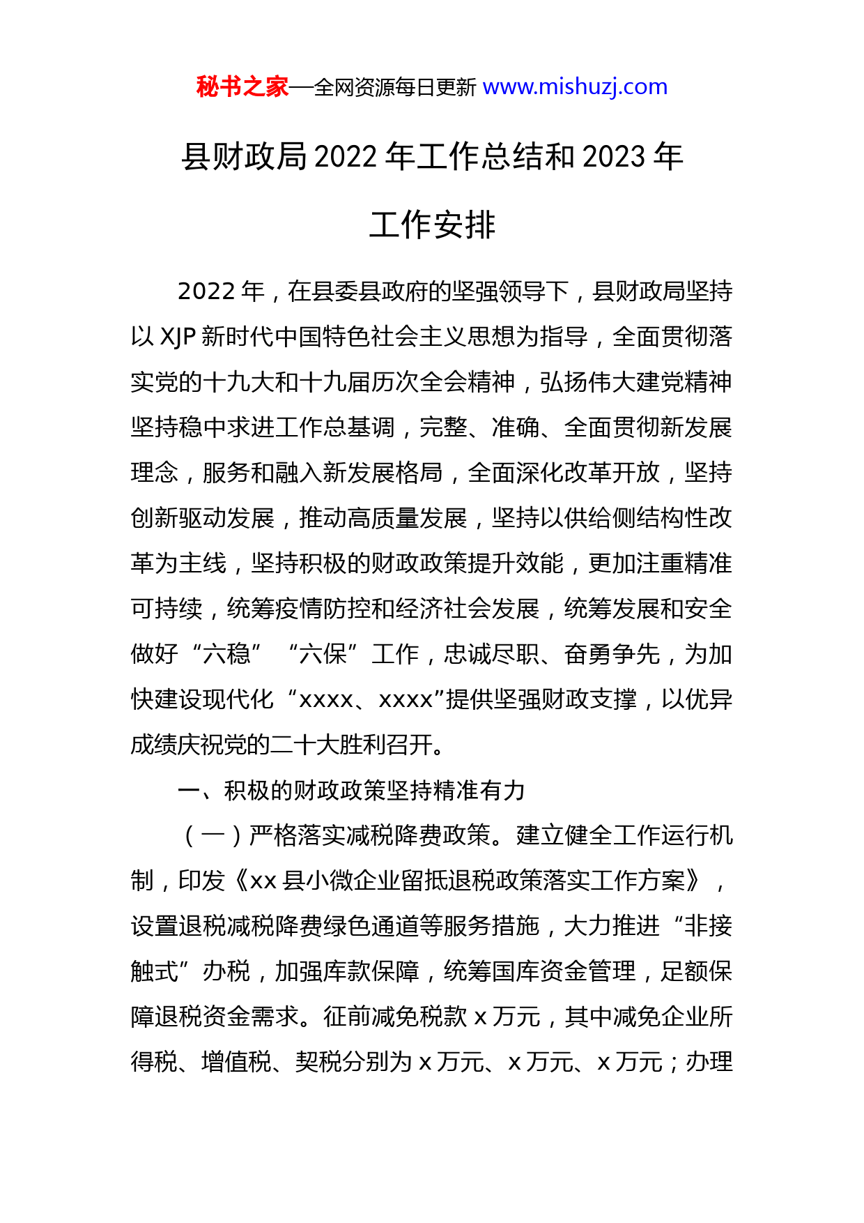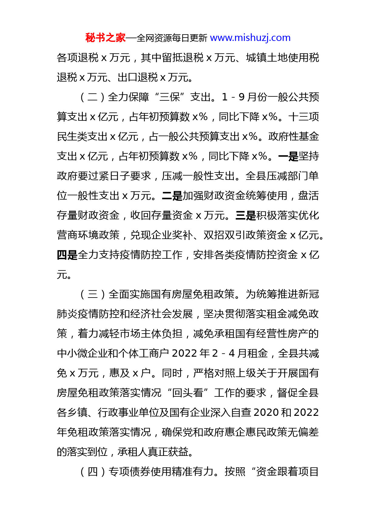 秘书之家—全网资源每日更新www.mishuzj.com县财政局2022年工作总结和2023年工作安排2022年,在县委县政府的坚强领导下,县财政局坚持以XJP新时代中国特色社会主义思想为指导,全面贯彻落实党的十九大和十九届历次全会精神,弘扬伟大建党精神坚持稳中求进工作总基调,完整、准确、全面贯彻新发展理念,服务和融入新发展格局,全面深化改革开放,坚持创新驱动发展,推动高质量发展,坚持以供给侧结构性改革为主线,坚持积极的财政政策提升效能,更加注重精准可持续,统筹疫情防控和经济社会发展,统筹发展和安全做好“六稳”“六保”工作,忠诚尽职、奋勇争先,为加快建设现代化“xxxx、xxxx”提供坚强财政支撑,以优异成绩庆祝党的二十大胜利召开。一、积极的财政政策坚持精准有力(一)严格落实减税降费政策。建立健全工作运行机制,印发《xx县小微企业留抵退税政策落实工作方案》,设置退税减税降费绿色通道等服务措施,大力推进“非接触式”办税,加强库款保障,统筹国库资金管理,足额保障退税资金需求。征前减免税款x万元,其中减免企业所得税、增值税、契税分别为x万元、x万元、x万元;办理秘书之家—全网资源每日更新www.mishuzj.com各项退税x万元,其中留抵退税x万元、城镇土地使用税退税x万元、出口退税x万元。(二)全力保障“三保”支出。1-9月份一般公共预算支出x亿元,占年初预算数x%,同比下降x%。十三项民生类支出x亿元,占一般公共预算支出x%。政府性基金支出x亿元,占年初预算数x%,同比下降x%。一是坚持政府要过紧日子要求,压减一般性支出。全县压减部门单位一般性支出x万元。二是加强财政资金统筹使用,盘活存量财政资金,收回存量资金x万元。三是积极落实优化营商环境政策,兑现企业奖补、双招双引政策资金x亿元。四是全力支持疫情防控工作,安排各类疫情防控资金x亿元。(三)全面实施国有房屋免租政策。为统筹推进新冠肺炎疫情防控和经济社会发展,坚决贯彻落实租金减免政策,着力减轻市场主体负担,减免承租国有经营性房产的中小微企业和个体工商户2022年2-4月租金,全县共减免x万元,惠及x户。同时,严格对照上级关于开展国有房屋免租政策落实情况“回头看”工作的要求,督促全县各乡镇、行政事业单位及国有企业深入自查2020和2022年免租政策落实情况,确保党和政府惠企惠民政策无偏差的落实到位,承租人真正获益。(四)专项债券使用精准有力。按照“资金跟着项目秘书之家—全网资源每日更新www.mishuzj.com走”的原则,结合项目轻重缓急、项目成熟度、投资拉动有效性等情况,合理加快债券资金使用进度,重点支持在建项目后续融资,确保尽快形成实物工作量。按时偿还政府债务x亿元,其中:发行再融资债券偿还到期政府债券x亿元;财政资金偿还到期政府债券x亿元、偿还到期政府隐性债务x亿元、偿还到期外债x万元。成功申报废弃(闭坑)矿山生态修复建设、长三角一体化非金属新材料产业园基础设施建设提升、城市更新一期项目3个自求平衡专项债券项目入省项目库,总投资x亿元,计划申请专项债券额度x亿元。争取新增债券资金x亿元。其中:新增专项债券项目资金x亿元,用于城区供水扩容建设x万元、城区基础设施建设x万元、美丽集镇建设x万元、废弃(闭坑)矿山生态修复x万元,已全部完成支出;新增一般债券项目资金x亿元,用于扶贫项目x万元、水利基础设施项目x万元、教育基础设施项目x万元。二、财政重点领域工作力求争先进位(一)财政收入平稳增长。1-9月份全县完成一般公共预算收入x亿元(市口径),同比增幅x%。其中:税务部门完成x亿元,同比增长x%;财政部门完成x亿元,同比增幅x%。从收入形式看,全县税收收入完成x亿元,同比下降x%,减收x万元;非税收入完成x亿元,同比增幅x%。税占比x%,非税收入占比持续递增。增收主要是一秘书之家—全网资源每日更新www.mishuzj.com次性收入增长,矿业权出让收益收入增收x万元。扣除一次性增长因素,1-9月份实际完成一般公共预算收入x亿元,同比增长x%。预计全年力争完成一般公共预算收入年初市下目标任务x亿元,增幅x%。完成自然口径一般公共预算收入x亿元(含留抵退税),增幅x%。(二)存贷款保持较高水平增长。2022年9月末,全县人民币各项贷款余额x亿元,较年初新增x亿元,同比增长x%,完成全年预期目标任务的x%。融资担保机构在保余额为x万元,新增x万元,新增占比x%,同比上升x%,平均放大倍数为x倍。“4321”新型政银担业务在保余额x万元,新增额x万元,在保户数x户。共有x户企业通过续贷过桥业务获得周转贷款x亿元。一是落实惠企利民金融政策,着力降低企业融资成本,助企纾困。将担保费率由原来的x%/年降低为x%/年,每年可为小微企业和“三农”主体节省财务费用x余万元。县财政安排x万元还贷周转资金,化解企业到期资金瓶颈。落实减费让利政策,降低中小微企业和新型农业经营主体各项贷款利率,我县小微企业加权平均利率为x%,同比下降x个百分点。积极推进无还本续贷业务,已为x户企业无还本续贷x亿元。加大普惠金融服务,发放支农支小再贷款x亿元;对创业担保贷款利息在贷款市场报价利率秘书之家—全网资源每日更新www.mishuzj.com(LPR)减去x个基点以下部分由借款人和借款企业承担,剩余部分财政给予贴息,放贷x笔x万元,拨付贴息资金x万元。二是担保助力,开发创新金融产品,着力