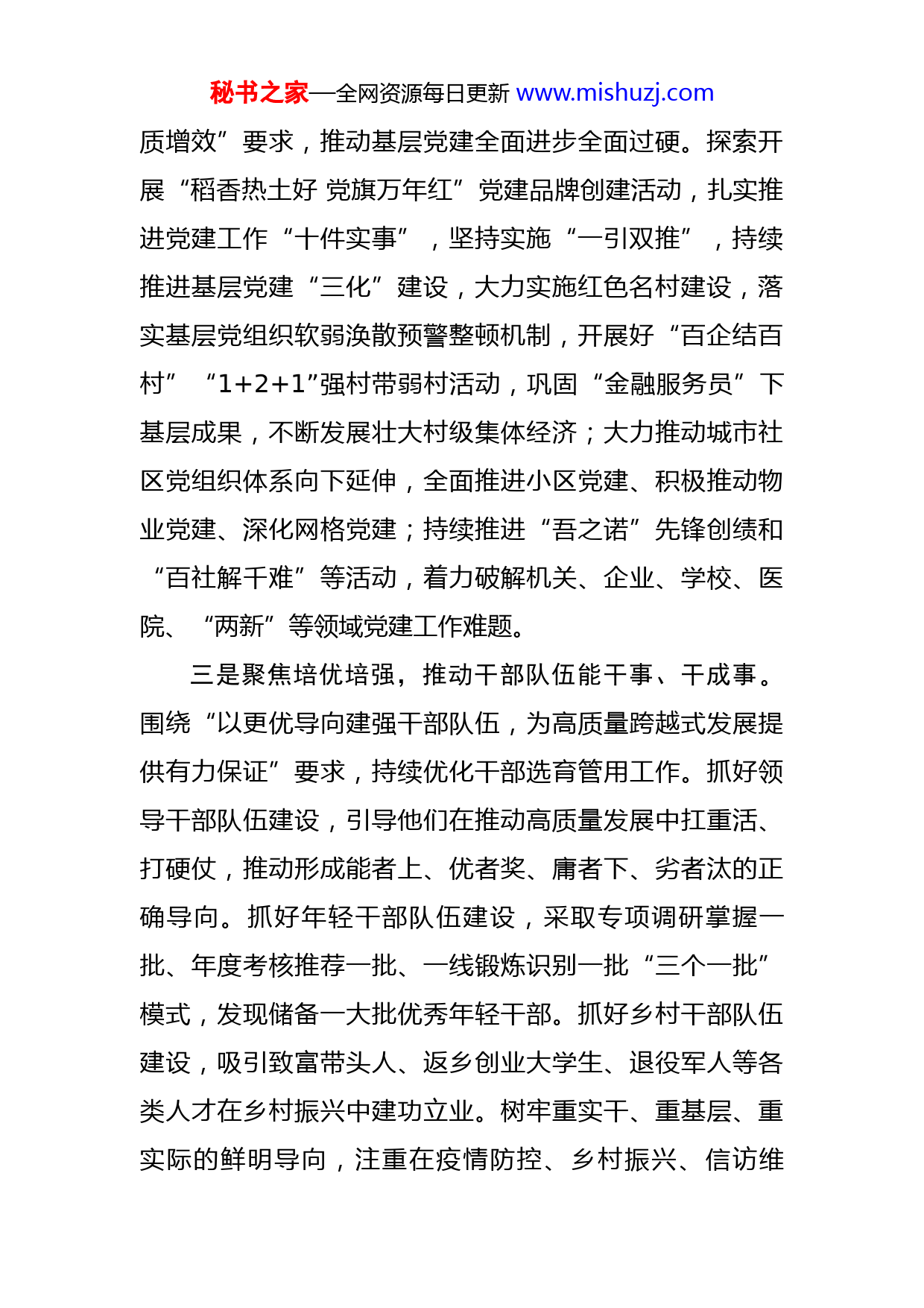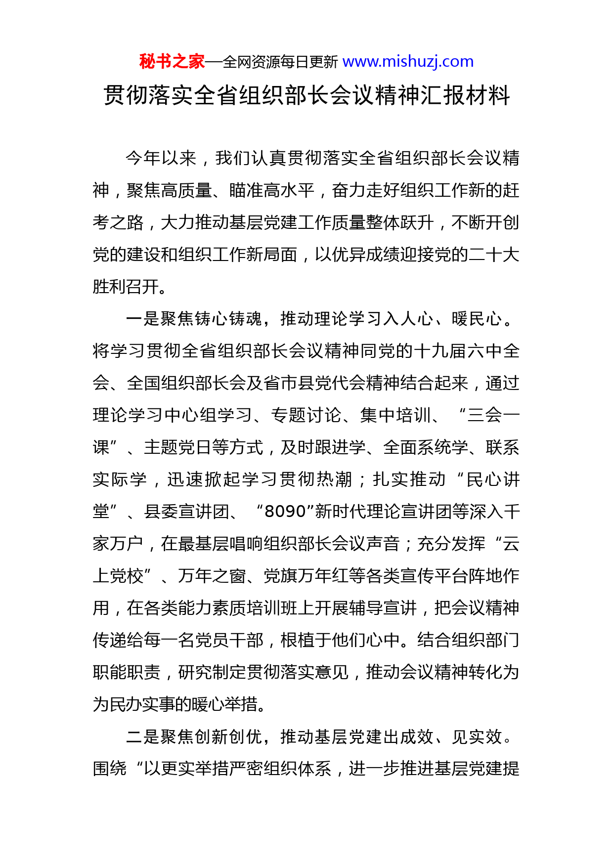 秘书之家—全网资源每日更新www.mishuzj.com贯彻落实全省组织部长会议精神汇报材料今年以来,我们认真贯彻落实全省组织部长会议精神,聚焦高质量、瞄准高水平,奋力走好组织工作新的赶考之路,大力推动基层党建工作质量整体跃升,不断开创党的建设和组织工作新局面,以优异成绩迎接党的二十大胜利召开。一是聚焦铸心铸魂,推动理论学习入人心、暖民心。将学习贯彻全省组织部长会议精神同党的十九届六中全会、全国组织部长会及省市县党代会精神结合起来,通过理论学习中心组学习、专题讨论、集中培训、“三会一课”、主题党日等方式,及时跟进学、全面系统学、联系实际学,迅速掀起学习贯彻热潮;扎实推动“民心讲堂”、县委宣讲团、“8090”新时代理论宣讲团等深入千家万户,在最基层唱响组织部长会议声音;充分发挥“云上党校”、万年之窗、党旗万年红等各类宣传平台阵地作用,在各类能力素质培训班上开展辅导宣讲,把会议精神传递给每一名党员干部,根植于他们心中。结合组织部门职能职责,研究制定贯彻落实意见,推动会议精神转化为为民办实事的暖心举措。二是聚焦创新创优,推动基层党建出成效、见实效。围绕“以更实举措严密组织体系,进一步推进基层党建提秘书之家—全网资源每日更新www.mishuzj.com质增效”要求,推动基层党建全面进步全面过硬。探索开展“稻香热土好党旗万年红”党建品牌创建活动,扎实推进党建工作“十件实事”,坚持实施“一引双推”,持续推进基层党建“三化”建设,大力实施红色名村建设,落实基层党组织软弱涣散预警整顿机制,开展好“百企结百村”“1+2+1”强村带弱村活动,巩固“金融服务员”下基层成果,不断发展壮大村级集体经济;大力推动城市社区党组织体系向下延伸,全面推进小区党建、积极推动物业党建、深化网格党建;持续推进“吾之诺”先锋创绩和“百社解千难”等活动,着力破解机关、企业、学校、医院、“两新”等领域党建工作难题。三是聚焦培优培强,推动干部队伍能干事、干成事。围绕“以更优导向建强干部队伍,为高质量跨越式发展提供有力保证”要求,持续优化干部选育管用工作。抓好领导干部队伍建设,引导他们在推动高质量发展中扛重活、打硬仗,推动形成能者上、优者奖、庸者下、劣者汰的正确导向。抓好年轻干部队伍建设,采取专项调研掌握一批、年度考核推荐一批、一线锻炼识别一批“三个一批”模式,发现储备一大批优秀年轻干部。抓好乡村干部队伍建设,吸引致富带头人、返乡创业大学生、退役军人等各类人才在乡村振兴中建功立业。树牢重实干、重基层、重实际的鲜明导向,注重在疫情防控、乡村振兴、信访维秘书之家—全网资源每日更新www.mishuzj.com稳、基层治理等一线练兵场精准识别干部,培养提拔干部,让有为者有位,让实干者实惠,让吃苦者吃香。四是聚焦提质提量,推动人才工作敢创新、善创造。围绕“以更大力度汇聚天下英才,让人才成就江西、让江西成就人才”要求,深入实施人才强县战略,以非常之举抓好各项人才工作实施。坚决贯彻中央、省委人才工作会议精神,扎实推进人才工作“十大行动”。坚持走出去,引进来,围绕我县经济发展需求,组织开展机械电子、纺织等产业的“双招双引”活动。探索“人才飞地”“百博结百企”等多元化柔性引才机制,带动培育一批本地人才。着力建设驻外人才工作联络站,打造在外人才联络“强磁场”。实施人才服务“暖心爽心”行动,落实《高层次人才服务管理办法》,解决人才在安居保障、医疗保健、配偶就业、子女就学等方面的“关键小事”。支持本地企业与高校、科研院所开展技术合作、人才培养,推动一批科研成果在我县落地转化。