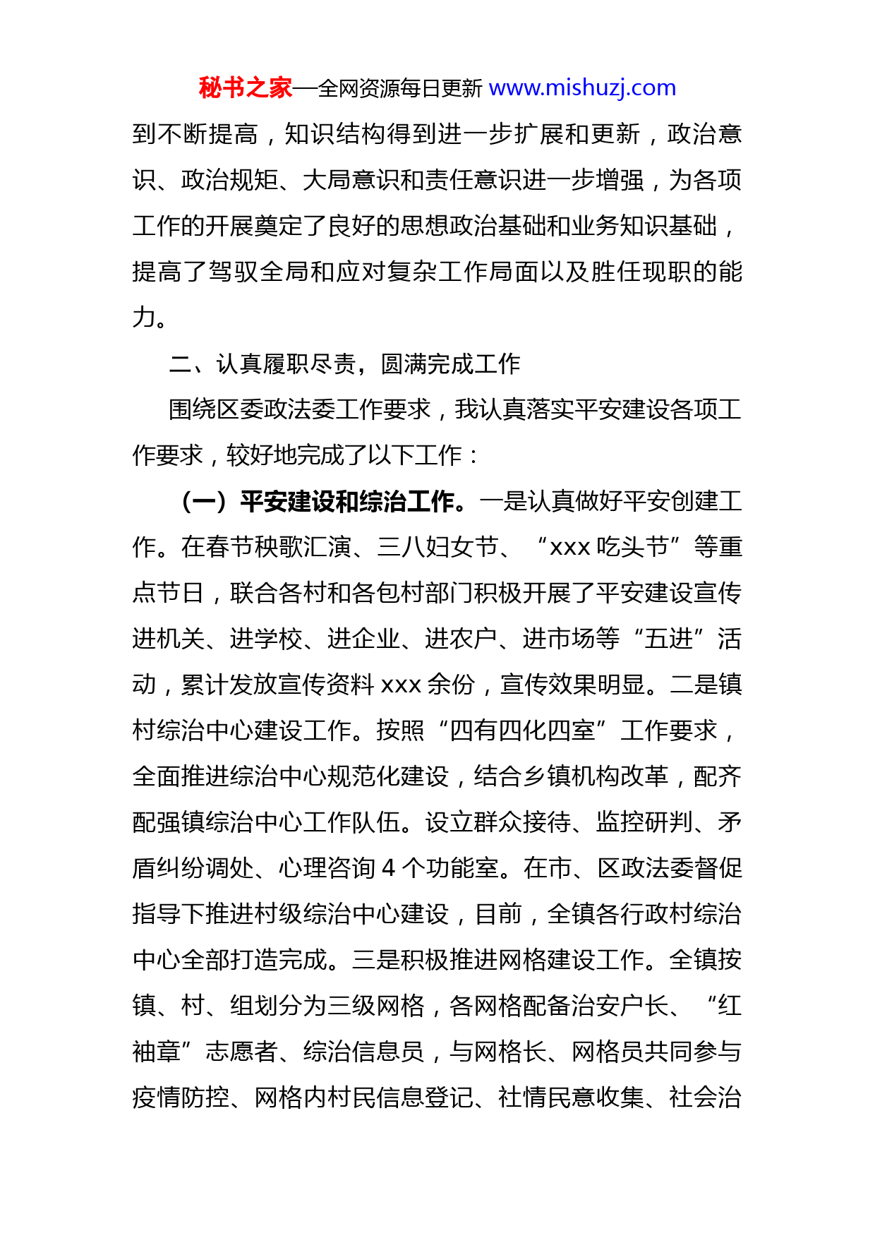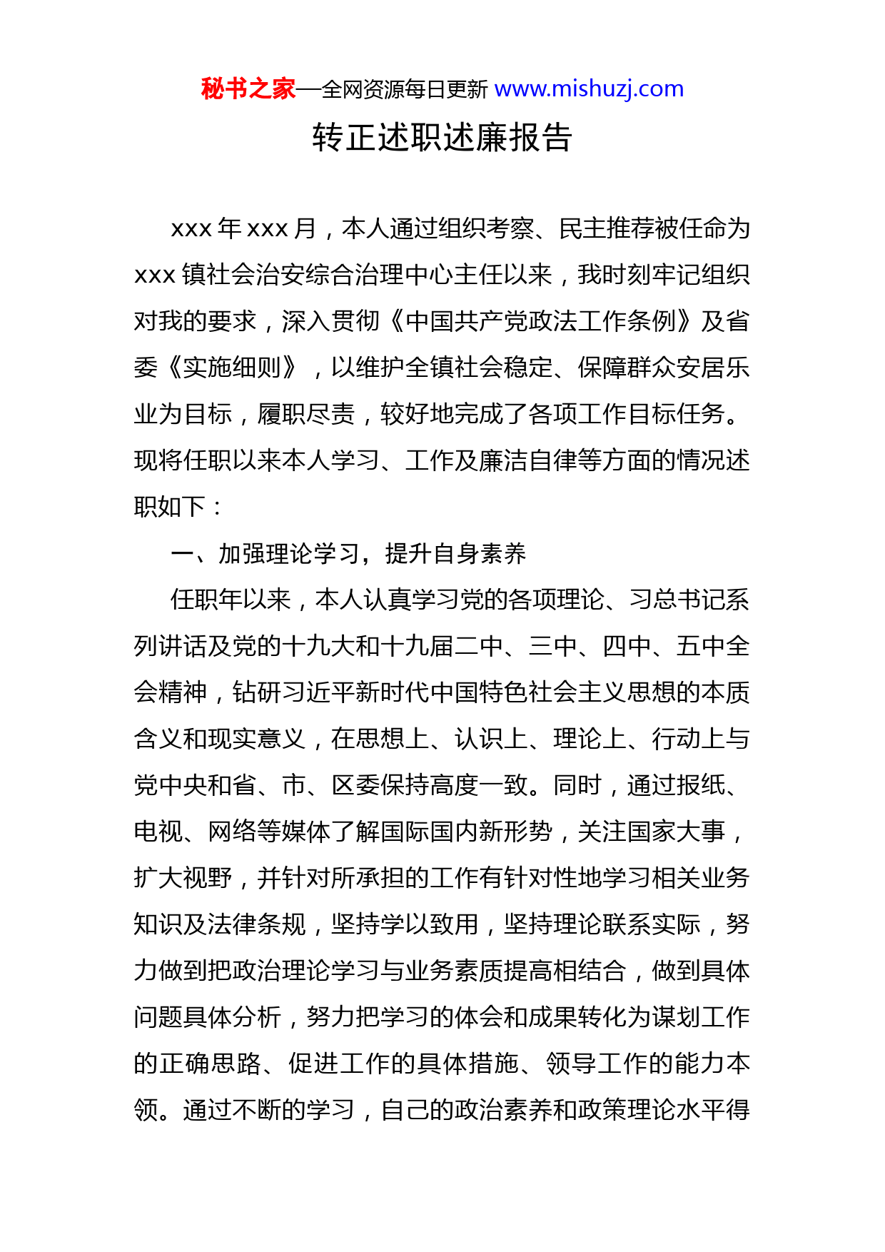 秘书之家—全网资源每日更新www.mishuzj.com转正述职述廉报告xxx年xxx月,本人通过组织考察、民主推荐被任命为xxx镇社会治安综合治理中心主任以来,我时刻牢记组织对我的要求,深入贯彻《中国共产党政法工作条例》及省委《实施细则》,以维护全镇社会稳定、保障群众安居乐业为目标,履职尽责,较好地完成了各项工作目标任务。现将任职以来本人学习、工作及廉洁自律等方面的情况述职如下:一、加强理论学习,提升自身素养任职年以来,本人认真学习党的各项理论、习总书记系列讲话及党的十九大和十九届二中、三中、四中、五中全会精神,钻研习近平新时代中国特色社会主义思想的本质含义和现实意义,在思想上、认识上、理论上、行动上与党中央和省、市、区委保持高度一致。同时,通过报纸、电视、网络等媒体了解国际国内新形势,关注国家大事,扩大视野,并针对所承担的工作有针对性地学习相关业务知识及法律条规,坚持学以致用,坚持理论联系实际,努力做到把政治理论学习与业务素质提高相结合,做到具体问题具体分析,努力把学习的体会和成果转化为谋划工作的正确思路、促进工作的具体措施、领导工作的能力本领。通过不断的学习,自己的政治素养和政策理论水平得秘书之家—全网资源每日更新www.mishuzj.com到不断提高,知识结构得到进一步扩展和更新,政治意识、政治规矩、大局意识和责任意识进一步增强,为各项工作的开展奠定了良好的思想政治基础和业务知识基础,提高了驾驭全局和应对复杂工作局面以及胜任现职的能力。二、认真履职尽责,圆满完成工作围绕区委政法委工作要求,我认真落实平安建设各项工作要求,较好地完成了以下工作:(一)平安建设和综治工作。一是认真做好平安创建工作。在春节秧歌汇演、三八妇女节、“xxx吃头节”等重点节日,联合各村和各包村部门积极开展了平安建设宣传进机关、进学校、进企业、进农户、进市场等“五进”活动,累计发放宣传资料xxx余份,宣传效果明显。二是镇村综治中心建设工作。按照“四有四化四室”工作要求,全面推进综治中心规范化建设,结合乡镇机构改革,配齐配强镇综治中心工作队伍。设立群众接待、监控研判、矛盾纠纷调处、心理咨询4个功能室。在市、区政法委督促指导下推进村级综治中心建设,目前,全镇各行政村综治中心全部打造完成。三是积极推进网格建设工作。全镇按镇、村、组划分为三级网格,各网格配备治安户长、“红袖章”志愿者、综治信息员,与网格长、网格员共同参与疫情防控、网格内村民信息登记、社情民意收集、社会治秘书之家—全网资源每日更新www.mishuzj.com安巡查、应急管理、矛盾纠纷调解等工作,形成了由村委会主任负总责,包村领导、包村部门、包村干部、包片民警各负其责、共同参与的工作格局。四是积极推进“雪亮工程”建设。建立和完善以公共安全视频监控联网应用为重点的“群众性治安防控工程”。五是严格落实社会稳定风险评估工作。对“xxx吃头”美食节等重大项目、重大活动、重大改革做了社会稳定风险评估,并及时上报区委政法委、区发改局备案。六是深入开展了重大节假日和敏感时期的维稳工作。在国庆节、全国“两会”等期间,多次组织各村、各部门单位进行矛盾纠纷“大排查、大化解”活动,实行重点排查,同时对一些信访积案进行重点调处,确保重大节假日与敏感时期无民间纠纷激化和群体性事件发生。七是广泛开展反电信诈骗宣传工作。今年以来多次组织召开反电诈工作安排部署会议,组织治安户长、“红袖章”志愿者、网格员等社会力量,积极开展防范电信网络诈骗宣传工作,并及时转载xxx公安每日发布电诈预警与防范电信网络诈骗链接到平安xxx工作群,安排各村及时转发到各组、各队的微信群内,提高群众对电信诈骗的知晓率,增强防范电信诈骗意识。(二)禁毒和反邪教工作。一是加强禁毒工作,巩固无毒乡镇成果。积极开展禁毒宣传教育活动,利用“三八”妇女节、国家安全日、防震减灾日、国际禁毒日开展禁毒秘书之家—全网资源每日更新www.mishuzj.com宣传教育活动,共累计发放宣传资料xxx多份,张贴悬挂标语xxx个,营造了浓厚的禁毒氛围,收到了良好的宣传效果。二是深入开展反邪教专项斗争与依法取缔和打击“精神传销”有害培训工作。认真贯彻落实开展依法取缔和打击“精神传销”有害培训专项行动,在镇域内全面排查、深挖“精神传销”有害培训组织及涉及有害培训的线索,加强打击“精神传销”与反邪教宣传力度,增强群众反邪、防邪、拒邪意识。(三)扫黑除恶专项斗争及信访工作。一是扎实开展扫黑除恶专项斗争工作。每月通过悬挂横幅、向农户发放宣传资料、电子显示屏播放扫黑除恶知识等方式向群众宣传扫黑除恶相关知识与《扫黑除恶举报奖励办法》。继续通过镇村微信平台、魅力xxx公众号将《通告》、《扫黑除恶举报奖励办法》和各种扫黑除恶知识及涉黑涉恶案例推广至镇、村、组各级微信群,广泛宣传扫黑除恶专项斗争成效经验,使宣传工作深入人心。利用各村大喇叭(广播),持续播放扫黑除恶相关知识和奖励办法。大力弘扬专项斗争中的新风正气,宣扬扫黑除恶专项斗争中先进典型所蕴含的时代精神,鼓舞和号召全社会同黑恶势力作斗争。二是认真细致的开展信访