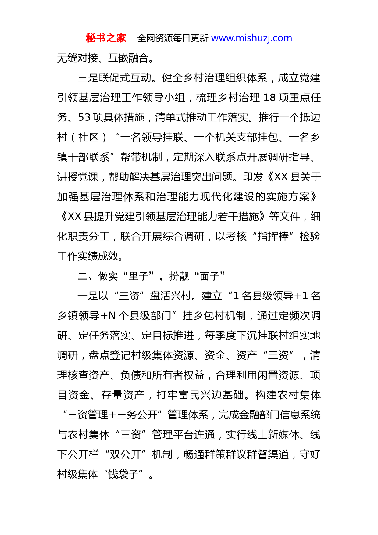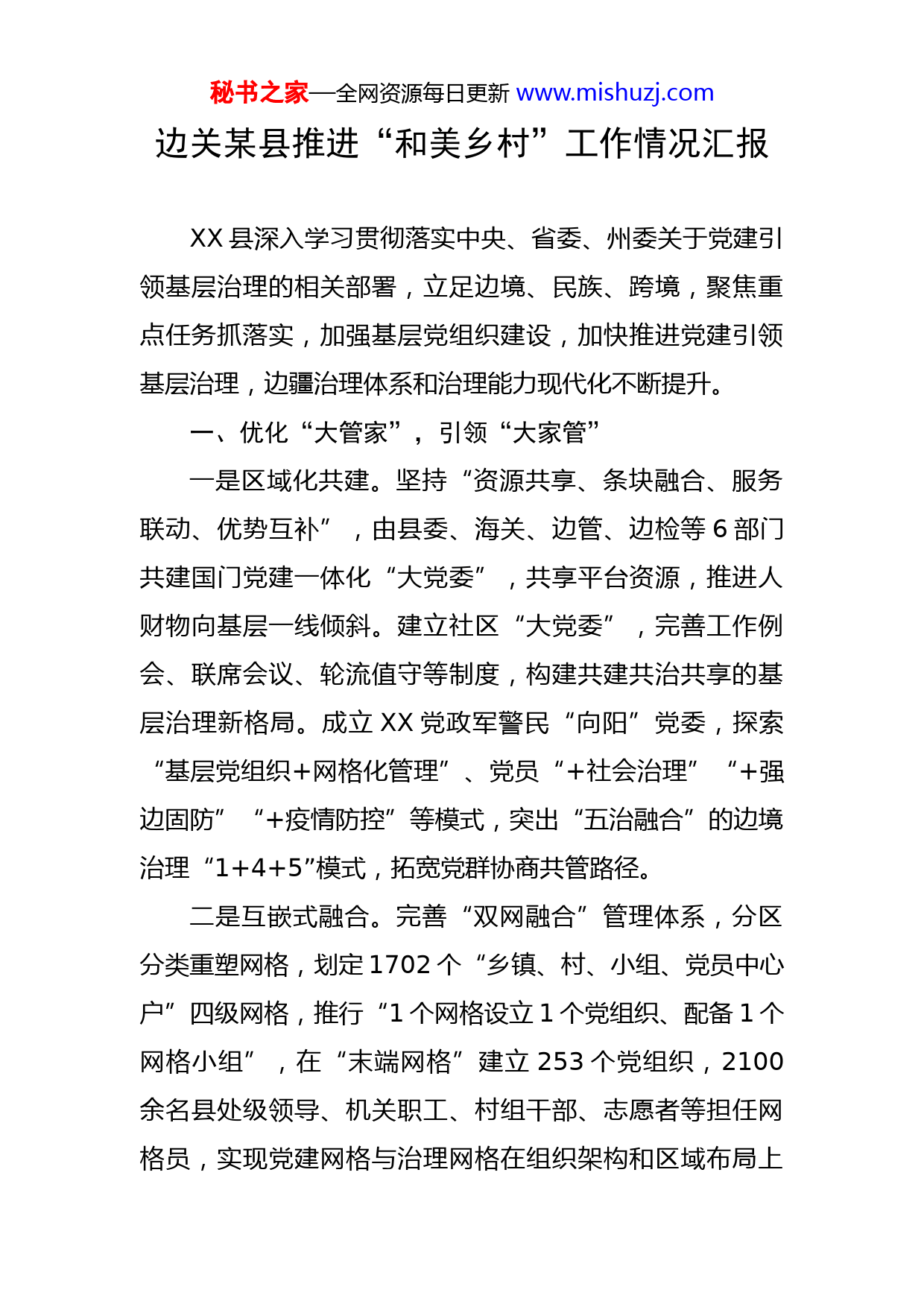 秘书之家—全网资源每日更新www.mishuzj.com边关某县推进“和美乡村”工作情况汇报XX县深入学习贯彻落实中央、省委、州委关于党建引领基层治理的相关部署,立足边境、民族、跨境,聚焦重点任务抓落实,加强基层党组织建设,加快推进党建引领基层治理,边疆治理体系和治理能力现代化不断提升。一、优化“大管家”,引领“大家管”一是区域化共建。坚持“资源共享、条块融合、服务联动、优势互补”,由县委、海关、边管、边检等6部门共建国门党建一体化“大党委”,共享平台资源,推进人财物向基层一线倾斜。建立社区“大党委”,完善工作例会、联席会议、轮流值守等制度,构建共建共治共享的基层治理新格局。成立XX党政军警民“向阳”党委,探索“基层党组织+网格化管理”、党员“+社会治理”“+强边固防”“+疫情防控”等模式,突出“五治融合”的边境治理“1+4+5”模式,拓宽党群协商共管路径。二是互嵌式融合。完善“双网融合”管理体系,分区分类重塑网格,划定1702个“乡镇、村、小组、党员中心户”四级网格,推行“1个网格设立1个党组织、配备1个网格小组”,在“末端网格”建立253个党组织,2100余名县处级领导、机关职工、村组干部、志愿者等担任网格员,实现党建网格与治理网格在组织架构和区域布局上秘书之家—全网资源每日更新www.mishuzj.com无缝对接、互嵌融合。三是联促式互动。健全乡村治理组织体系,成立党建引领基层治理工作领导小组,梳理乡村治理18项重点任务、53项具体措施,清单式推动工作落实。推行一个抵边村(社区)“一名领导挂联、一个机关支部挂包、一名乡镇干部联系”帮带机制,定期深入联系点开展调研指导、讲授党课,帮助解决基层治理突出问题。印发《XX县关于加强基层治理体系和治理能力现代化建设的实施方案》《XX县提升党建引领基层治理能力若干措施》等文件,细化职责分工,联合开展综合调研,以考核“指挥棒”检验工作实绩成效。二、做实“里子”,扮靓“面子”一是以“三资”盘活兴村。建立“1名县级领导+1名乡镇领导+N个县级部门”挂乡包村机制,通过定频次调研、定任务落实、定目标推进,每季度下沉挂联村组实地调研,盘点登记村级集体资源、资金、资产“三资”,清理核查资产、负债和所有者权益,合理利用闲置资源、项目资金、存量资产,打牢富民兴边基础。构建农村集体“三资管理+三务公开”管理体系,完成金融部门信息系统与农村集体“三资”管理平台连通,实行线上新媒体、线下公开栏“双公开”机制,畅通群策群议群督渠道,守好村级集体“钱袋子”。秘书之家—全网资源每日更新www.mishuzj.com二是以“四色”张榜治村。探索“问题墙·回音壁”“红黑榜”“四色”张榜治村做法,“红色问题墙”广泛收集群众诉求,“绿色回音壁”回应群众诉求问题办理情况,将致富先锋、社会道德等正面情形列入“红榜积分簿”,将好逸恶劳、失信失德等反面情形列入“黑榜逆行册”,激发基层治理活力。深化村民自治实践,健全“支部牵头、党员示范、党群共治”机制,修订并在家家户户门口悬挂村规民约“小牌匾”,3116名党员悬挂“共产党员户”标识牌,引导群众自我管理、自我服务、自我教育、自我监督。三是以“六微”创建靓村。按照“有山靠山、有水依水、就地取材”思路,组织党员群众拆墙透绿、种植花草、收家治家,将零散空闲地腾退出来,围绕屋子、院子、寨子开展“微广场”“微庭院”“微花园”“微菜园”“微果园”“微景观”等“六微”创建3176个,以城带乡、以点带面推进示范打造坝吉五队、三坪坝、八条半、老卡、礁堡等一批现代化边境幸福村示范点,逐步实现“出门看花、弯腰摘菜、伸手摘果、庭院创收”。三、破解“当下题”,健全“长久制”一是围绕“有人治”育队伍。筹推进村级组织“大岗位制”和社区工作者职业体系建设,选优配强村(社区)“头雁队伍”,全面提升待遇补贴保障,激励干部担当作秘书之家—全网资源每日更新www.mishuzj.com为。压实“五级书记”责任,配强县乡村段长382名,招录联防员442名,管好用好185名驻村(驻组)干部,2100余名网格员入网定责,组建综合行政执法队伍,设立“保健康、防重症”暖心配送党员先锋服务队,建设充满活力的乡村治理骨干队伍,从源头上解决乡村“无人治”问题。二是围绕“有招治”提能力。组织开展村党组织书记、党务工作者培训16期2741人,持续推进村(社区)干部能力素质和学历水平“双提升”行动计划,招收学员33名,选派3名村(社区)干部到县外挂职锻炼。挂牌建设“党员教育实训基地”10个、“党建实务操作室(馆)”11个、基层党建暨党员教育管理监测点10个,常态开展“领导干部上讲堂”“党课开讲啦”等教育培训,推动党的创新理论入脑入心。制发《驻村工作任务清单》4份,编印《安全教育手册》《农业农村法规政策汇编》等自学培训手册,建立驻村夜校“微课程”制度,全面提升基层干部能力,从深层次上解决乡村“无招治”的问题。三是围绕“有章治”建机制。完善村级“小微权力”清单及运行流程,规范明晰村级组织和村干部权力事项,梳理3个方面22项流程图,保障群众对村级事务的知情权、参与权、表达权和监督权。落实村级重大事项“四议秘书之家—全网资源每日更新www.mishuzj.com两公开”