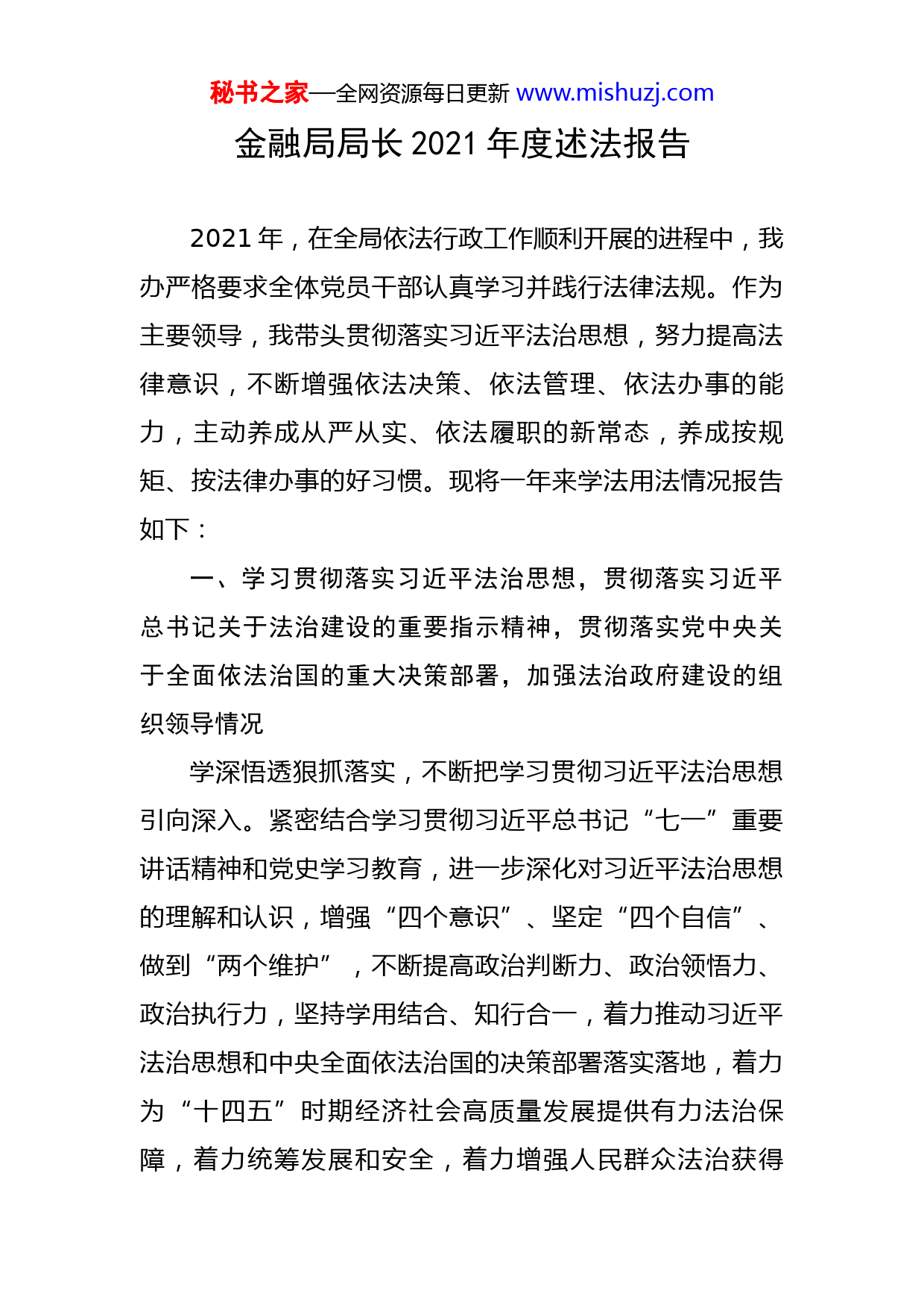 秘书之家—全网资源每日更新www.mishuzj.com金融局局长2021年度述法报告2021年,在全局依法行政工作顺利开展的进程中,我办严格要求全体党员干部认真学习并践行法律法规。作为主要领导,我带头贯彻落实习近平法治思想,努力提高法律意识,不断增强依法决策、依法管理、依法办事的能力,主动养成从严从实、依法履职的新常态,养成按规矩、按法律办事的好习惯。现将一年来学法用法情况报告如下:一、学习贯彻落实习近平法治思想,贯彻落实习近平总书记关于法治建设的重要指示精神,贯彻落实党中央关于全面依法治国的重大决策部署,加强法治政府建设的组织领导情况学深悟透狠抓落实,不断把学习贯彻习近平法治思想引向深入。紧密结合学习贯彻习近平总书记“七一”重要讲话精神和党史学习教育,进一步深化对习近平法治思想的理解和认识,增强“四个意识”、坚定“四个自信”、做到“两个维护”,不断提高政治判断力、政治领悟力、政治执行力,坚持学用结合、知行合一,着力推动习近平法治思想和中央全面依法治国的决策部署落实落地,着力为“十四五”时期经济社会高质量发展提供有力法治保障,着力统筹发展和安全,着力增强人民群众法治获得秘书之家—全网资源每日更新www.mishuzj.com感、幸福感、安全感,切实把习近平法治思想贯彻落实到位,取得扎实成效。二、贯彻落实区委、区政府关于法治建设的决策部署,推动落实年度法治建设工作要点以及法治建设重点工作任务情况为贯彻落实区委、区政府关于法治建设的决策部署,不断提高政治站位,加强组织领导,形成主要领导负责抓,分管领导具体抓的工作局面。加强普法宣传,将《国家安全法》等法律法规纳入党组会、中心组学习会重要内容。在“4.15全民安全教育日”“11.1《反间谍法》宣传日”,组织机关干部职工学习相关法律法规,开展知识答题活动。在“12.4国家宪法日”等重要节点,开展“防范非法集资”宣传活动,立足主责主业扩大法制宣传覆盖面。三、严格执行重大行政决策法定程序,健全政府法律顾问制度、公职律师制度,发挥法律顾问职责作用,全面推动政务公开情况为推进和规范本单位政府信息公开工作,促进依法行政,建立以主要领导为组长、主管领导为副组长、各科室负责人为组员的政府信息公开工作领导小组,统筹落实本单位政府信息公开各项工作。聘用专业法律顾问加强保障,帮助指导全办提高依法行政、依法管理、依法办事的秘书之家—全网资源每日更新www.mishuzj.com能力和水平。日常政府信息公开工作由XX科牵头,会同XX科按照各自职能分工层层落实责任。修订发布《政府信息公开指南(2021年版)》,便于公民、法人或者其他组织依法获取区金融办的政府信息。制定发布《政务公开(主动公开)全清单》,向社会公众主动公开政府信息。四、依法全面履行政府职能,推进行政执法体制改革,推动严格规范公正文明执法情况依托打非工作小组、区金融风险处置专班,在各职能部门、镇街的通力配合下,统筹推进金融风险防控工作,严格规范公正文明执法。做好行刑衔接,2021年5月1日起实施《防范和处置非法集资条例》,报请区政府同意,明确由区金融办作为属地牵头部门,区市场监管局作为执法部门,采取综合执法模式,按照“五位一体”工作机制,年内联合检查企业16家,约谈企业10家,完善制度建设,构建综合防范处置体系。2021年7月1日起实施《北京市地方金融监督管理条例》,开展“7+4”行业年度现场检查,做好地方金融行业监管。五、督促领导班子其他成员依法行政,推动完善政府内部层级监督和专门监督情况充分发挥党组在推进全办法治建设中的领导核心作用,定期听取有关工作汇报,及时研究解决有关重大问题,将法治建设与经济社会发展同部署、同推进、同督秘书之家—全网资源每日更新www.mishuzj.com促、同考核、同奖惩。支持本级人大、政府、政协、法院、检察院依法依章履行职能、开展工作,督促领导班子其他成员依法办事,不得违规干预司法活动。加强和完善内部监督机制,落实党风廉政建设“两个责任”,协助纪检组加强党风建设和反腐败工作,当好廉洁从政表率。六、落实行政机关工作人员学法用法制度和“谁执法谁普法”责任制情况为贯彻落实修订后的公务员法及配套法规,邀请律师为全办公务员培训解读公务员法律法规的重要意义、指导思想等内容,增强学法守法用法的自觉性,着力打造一支政治过硬、适应新时代金融发展需要的高素质专业化公务员队伍。依托区打非办在《防范和处置非法集资条例》实施前,组织相关镇街对基层网格员开展防范打击非法集资业务知识培训,严格落实“谁执法谁普法”责任制,为我区营造了防非打非的良好社会氛围。七、本部门法治建设领域存在的突出问题以及整改落实情况尽管《防范和处置非法集资条例》的出台明确了牵头部门、执法部门和执法模式,为风险处置工作提供了法律依据和保障,但相关机制尚未建立,各部门职责也未明确。为进一步丰富和完善打非方法和策略,一是加强机制建设,持续发挥区打非工作领导小组、区金融风险处置专秘书之家—全网资源每日更新www.mishuzj.com班等联动机制作用,联合区市场监管局加快制定配套制度。二是加大普法宣传力度,常态化组织开展金融安全宣教活动,推动形成政