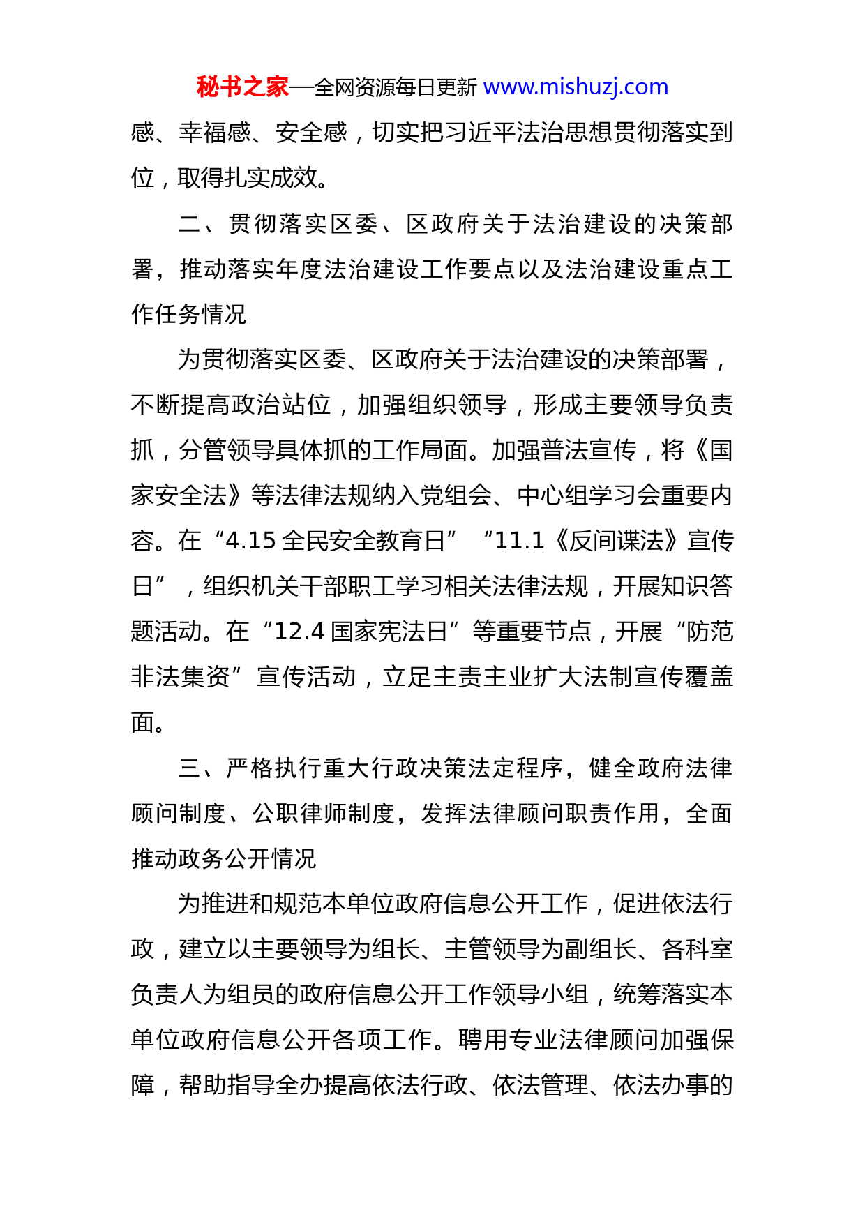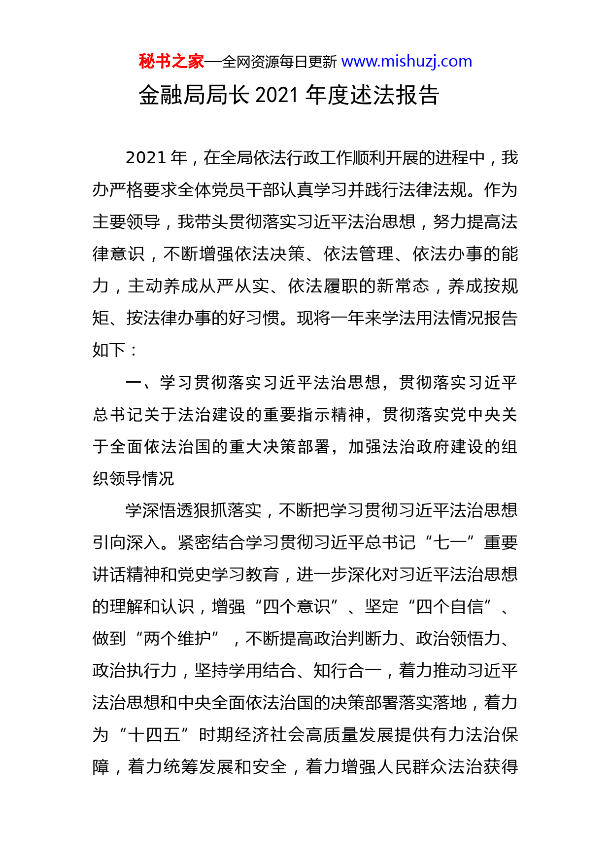 秘书之家—全网资源每日更新www.mishuzj.com金融局局长2021年度述法报告2021年,在全局依法行政工作顺利开展的进程中,我办严格要求全体党员干部认真学习并践行法律法规。作为主要领导,我带头贯彻落实习近平法治思想,努力提高法律意识,不断增强依法决策、依法管理、依法办事的能力,主动养成从严从实、依法履职的新常态,养成按规矩、按法律办事的好习惯。现将一年来学法用法情况报告如下:一、学习贯彻落实习近平法治思想,贯彻落实习近平总书记关于法治建设的重要指示精神,贯彻落实党中央关于全面依法治国的重大决策部署,加强法治政府建设的组织领导情况学深悟透狠抓落实,不断把学习贯彻习近平法治思想引向深入。紧密结合学习贯彻习近平总书记“七一”重要讲话精神和党史学习教育,进一步深化对习近平法治思想的理解和认识,增强“四个意识”、坚定“四个自信”、做到“两个维护”,不断提高政治判断力、政治领悟力、政治执行力,坚持学用结合、知行合一,着力推动习近平法治思想和中央全面依法治国的决策部署落实落地,着力为“十四五”时期经济社会高质量发展提供有力法治保障,着力统筹发展和安全,着力增强人民群众法治获得秘书之家—全网资源每日更新www.mishuzj.com感、幸福感、安全感,切实把习近平法治思想贯彻落实到位,取得扎实成效。二、贯彻落实区委、区政府关于法治建设的决策部署,推动落实年度法治建设工作要点以及法治建设重点工作任务情况为贯彻落实区委、区政府关于法治建设的决策部署,不断提高政治站位,加强组织领导,形成主要领导负责抓,分管领导具体抓的工作局面。加强普法宣传,将《国家安全法》等法律法规纳入党组会、中心组学习会重要内容。在“4.15全民安全教育日”“11.1《反间谍法》宣传日”,组织机关干部职工学习相关法律法规,开展知识答题活动。在“12.4国家宪法日”等重要节点,开展“防范非法集资”宣传活动,立足主责主业扩大法制宣传覆盖面。三、严格执行重大行政决策法定程序,健全政府法律顾问制度、公职律师制度,发挥法律顾问职责作用,全面推动政务公开情况为推进和规范本单位政府信息公开工作,促进依法行政,建立以主要领导为组长、主管领导为副组长、各科室负责人为组员的政府信息公开工作领导小组,统筹落实本单位政府信息公开各项工作。聘用专业法律顾问加强保障,帮助指导全办提高依法行政、依法管理、依法办事的秘书之家—全网资源每日更新www.mishuzj.com能力和水平。日常政府信息公开工作由XX科牵头,会同XX科按照各自职能分工层层落实责任。修订发布《政府信息公开指南(2021年版)》,便于公民、法人或者其他组织依法获取区金融办的政府信息。制定发布《政务公开(主动公开)全清单》,向社会公众主动公开政府信息。四、依法全面履行政府职能,推进行政执法体制改革,推动严格规范公正文明执法情况依托打非工作小组、区金融风险处置专班,在各职能部门、镇街的通力配合下,统筹推进金融风险防控工作,严格规范公正文明执法。做好行刑衔接,2021年5月1日起实施《防范和处置非法集资条例》,报请区政府同意,明确由区金融办作为属地牵头部门,区市场监管局作为执法部门,采取综合执法模式,按照“五位一体”工作机制,年内联合检查企业16家,约谈企业10家,完善制度建设,构建综合防范处置体系。2021年7月1日起实施《北京市地方金融监督管理条例》,开展“7+4”行业年度现场检查,做好地方金融行业监管。五、督促领导班子其他成员依法行政,推动完善政府内部层级监督和专门监督情况充分发挥党组在推进全办法治建设中的领导核心作用,定期听取有关工作汇报,及时研究解决有关重大问题,将法治建设与经济社会发展同部署、同推进、同督秘书之家—全网资源每日更新www.mishuzj.com促、同考核、同奖惩。支持本级人大、政府、政协、法院、检察院依法依章履行职能、开展工作,督促领导班子其他成员依法办事,不得违规干预司法活动。加强和完善内部监督机制,落实党风廉政建设“两个责任”,协助纪检组加强党风建设和反腐败工作,当好廉洁从政表率。六、落实行政机关工作人员学法用法制度和“谁执法谁普法”责任制情况为贯彻落实修订后的公务员法及配套法规,邀请律师为全办公务员培训解读公务员法律法规的重要意义、指导思想等内容,增强学法守法用法的自觉性,着力打造一支政治过硬、适应新时代金融发展需要的高素质专业化公务员队伍。依托区打非办在《防范和处置非法集资条例》实施前,组织相关镇街对基层网格员开展防范打击非法集资业务知识培训,严格落实“谁执法谁普法”责任制,为我区营造了防非打非的良好社会氛围。七、本部门法治建设领域存在的突出问题以及整改落实情况尽管《防范和处置非法集资条例》的出台明确了牵头部门、执法部门和执法模式,为风险处置工作提供了法律依据和保障,但相关机制尚未建立,各部门职责也未明确。为进一步丰富和完善打非方法和策略,一是加强机制建设,持续发挥区打非工作领导小组、区金融风险处置专秘书之家—全网资源每日更新www.mishuzj.com班等联动机制作用,联合区市场监管局加快制定配套制度。二是加大普法宣传力度,常态化组织开展金融安全宣教活动,推动形成政