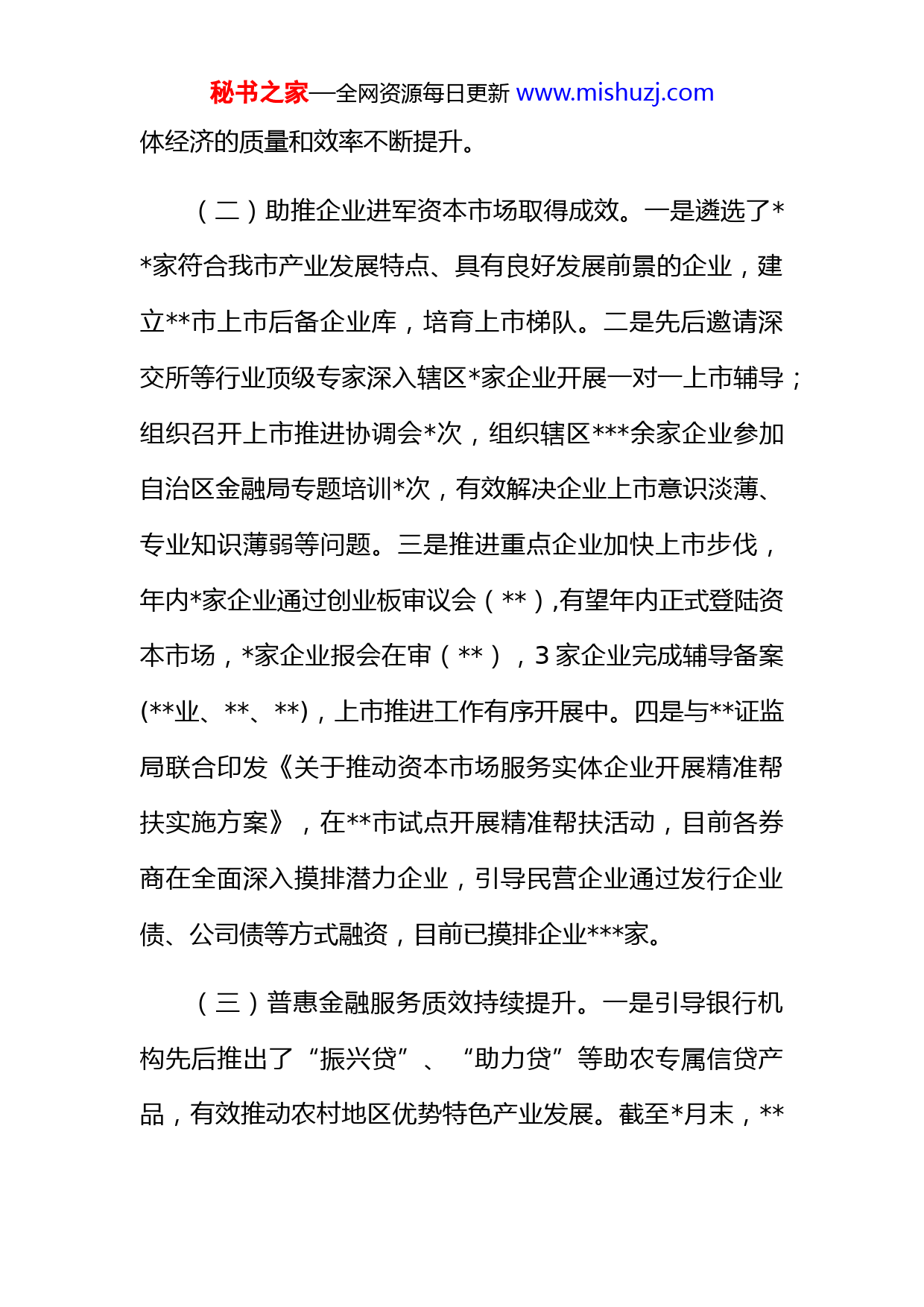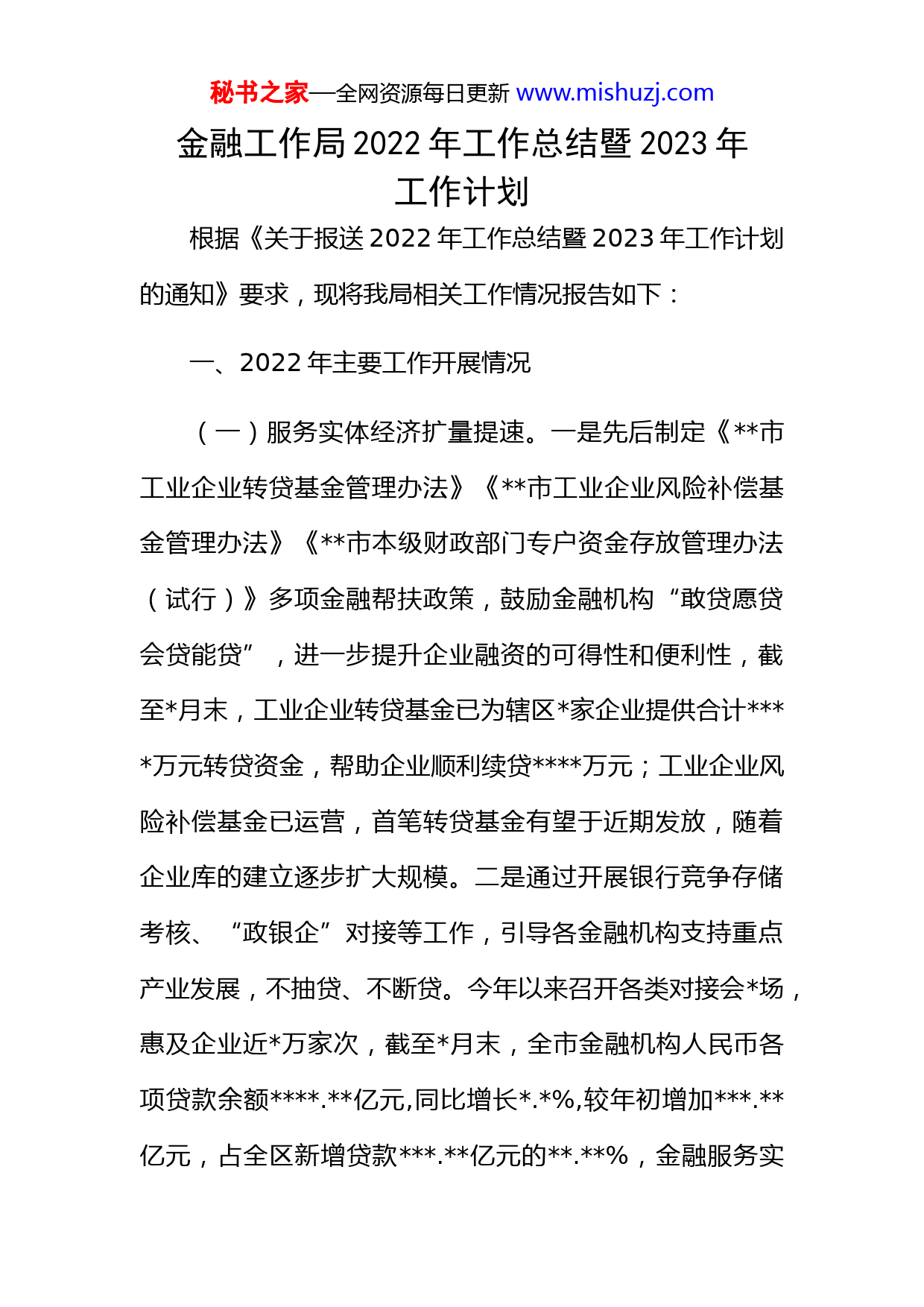 秘书之家—全网资源每日更新www.mishuzj.com金融工作局2022年工作总结暨2023年工作计划根据《关于报送2022年工作总结暨2023年工作计划的通知》要求,现将我局相关工作情况报告如下:一、2022年主要工作开展情况(一)服务实体经济扩量提速。一是先后制定《市工业企业转贷基金管理办法》《市工业企业风险补偿基金管理办法》《市本级财政部门专户资金存放管理办法(试行)》多项金融帮扶政策,鼓励金融机构“敢贷愿贷会贷能贷”,进一步提升企业融资的可得性和便利性,截至月末,工业企业转贷基金已为辖区家企业提供合计万元转贷资金,帮助企业顺利续贷万元;工业企业风险补偿基金已运营,首笔转贷基金有望于近期发放,随着企业库的建立逐步扩大规模。二是通过开展银行竞争存储考核、“政银企”对接等工作,引导各金融机构支持重点产业发展,不抽贷、不断贷。今年以来召开各类对接会场,惠及企业近万家次,截至月末,全市金融机构人民币各项贷款余额.亿元,同比增长.%,较年初增加.亿元,占全区新增贷款.亿元的.%,金融服务实秘书之家—全网资源每日更新www.mishuzj.com体经济的质量和效率不断提升。(二)助推企业进军资本市场取得成效。一是遴选了家符合我市产业发展特点、具有良好发展前景的企业,建立市上市后备企业库,培育上市梯队。二是先后邀请深交所等行业顶级专家深入辖区家企业开展一对一上市辅导;组织召开上市推进协调会次,组织辖区余家企业参加自治区金融局专题培训次,有效解决企业上市意识淡薄、专业知识薄弱等问题。三是推进重点企业加快上市步伐,年内家企业通过创业板审议会(),有望年内正式登陆资本市场,家企业报会在审(),3家企业完成辅导备案(业、、),上市推进工作有序开展中。四是与证监局联合印发《关于推动资本市场服务实体企业开展精准帮扶实施方案》,在市试点开展精准帮扶活动,目前各券商在全面深入摸排潜力企业,引导民营企业通过发行企业债、公司债等方式融资,目前已摸排企业家。(三)普惠金融服务质效持续提升。一是引导银行机构先后推出了“振兴贷”、“助力贷”等助农专属信贷产品,有效推动农村地区优势特色产业发展。截至月末,秘书之家—全网资源每日更新www.mishuzj.com市涉农贷款余额.亿元,同比增长.%,比全区平均水平快.个百分点。二是畅通“银政企”联动机制,推广“云税贷”“纳税e贷”等银税互动金融产品,挖掘企业资源,将企业“纳税”转化为银行“融资”,积极打通信贷资金流向中小微企业的“最后一公里”。截至月末,市小微企业贷款余额.亿元,占全区的.%,同比增长.%。三是联合乡村振兴局对脱贫人口小额信贷重点县(市)区进行了督导,引导各银行机构加大脱贫人口小额信贷发放力度,截至月末,全市共向户发放贷款万元,已完成全年任务的.%,贷款覆盖率为.%。(四)绿色金融发展成效显著。一是将绿色信贷余额纳入银行竞争性存储考评指标,将考评结果与政府性资金存放额度挂钩,引流“金融活水”滋润绿色产业。如中信银行分行上半年绿色信贷余额较年初增幅比例达%,绿色信贷提速增长明显。二是引导金融机构细化绿色贷款考核指标体系,完善绿色信贷绩效考核模式。如农业银行、邮储银行分行、银行将绿色贷款余额等指标纳入考核范畴,激励各经营行加大绿色信贷投放力度。三是引导银行秘书之家—全网资源每日更新www.mishuzj.com机构设立专岗专责推动绿色信贷项目投放。如兴业银行分行设立绿色产品经理岗位,积极加大信贷投入支持我市节能、环保企业。四是鼓励银行机构以定制化产品满足绿色产业发展个性化融资需求。如农发行分行已陆续推出了水权交易模式、项目运营收益模式等绿色贷款产品。截至上半年,我市绿色信贷余额.亿元,占全市贷款总量的%,同比增长.%。(五)金融改革创新持续深化。一是与金融机构在“四权”价值评估、风险缓释等环节反复探讨,探索推出“四权抵押+”组合贷款助力“四权”改革。其中农发行葡萄林权抵押贷款项目、灵武“预回购+担保+林权质押+贷款”项目已成功落地。二是持续取消或减少反担保措施推进知识产权、应收账款、生物活体等新型反担保方式,降低担保门槛。推动担保费率下调,部分业务执行零保费平均费率连年下降。三是依托现代金融科技服务手段,积极打造数字普惠金融新模式,充分运用企业融资服务平台、“云电贷”、“小微易贷”等金融创新产品,满足企业个性化金融需求。秘书之家—全网资源每日更新www.mishuzj.com(六)金融风险防控化解稳步推进。一是稳妥做好地方交易场所、P2P、财富管理公司等重点领域风险处置工作,有效推动化解P2P、、掌政资金物流等利益受损诉求群体涉稳风险。二是完成家“伪金交所”风险排查及分类处置;对全市家私募投资基金开展风险摸排,联合惩戒家“僵尸企业”;持续加强对、掌政农资物流等风险事件的矛盾纠纷化解,全市非法集资类案件持续下降。三是配合监管部门开展全市村镇银行风险排查。目前全市家村镇银行业务正常开展,风险总体可控。四是强化地方金融组织管理。对家小贷公司、家融资担保公司、家典当行变更事项出具初审意见,引导家小贷公司退出行业,注销家融资担保公司。五是按照市场化、法治化原则稳步推进“城”、纸业、游戏等重点企业债务风险化解