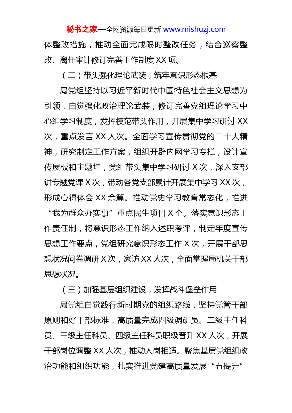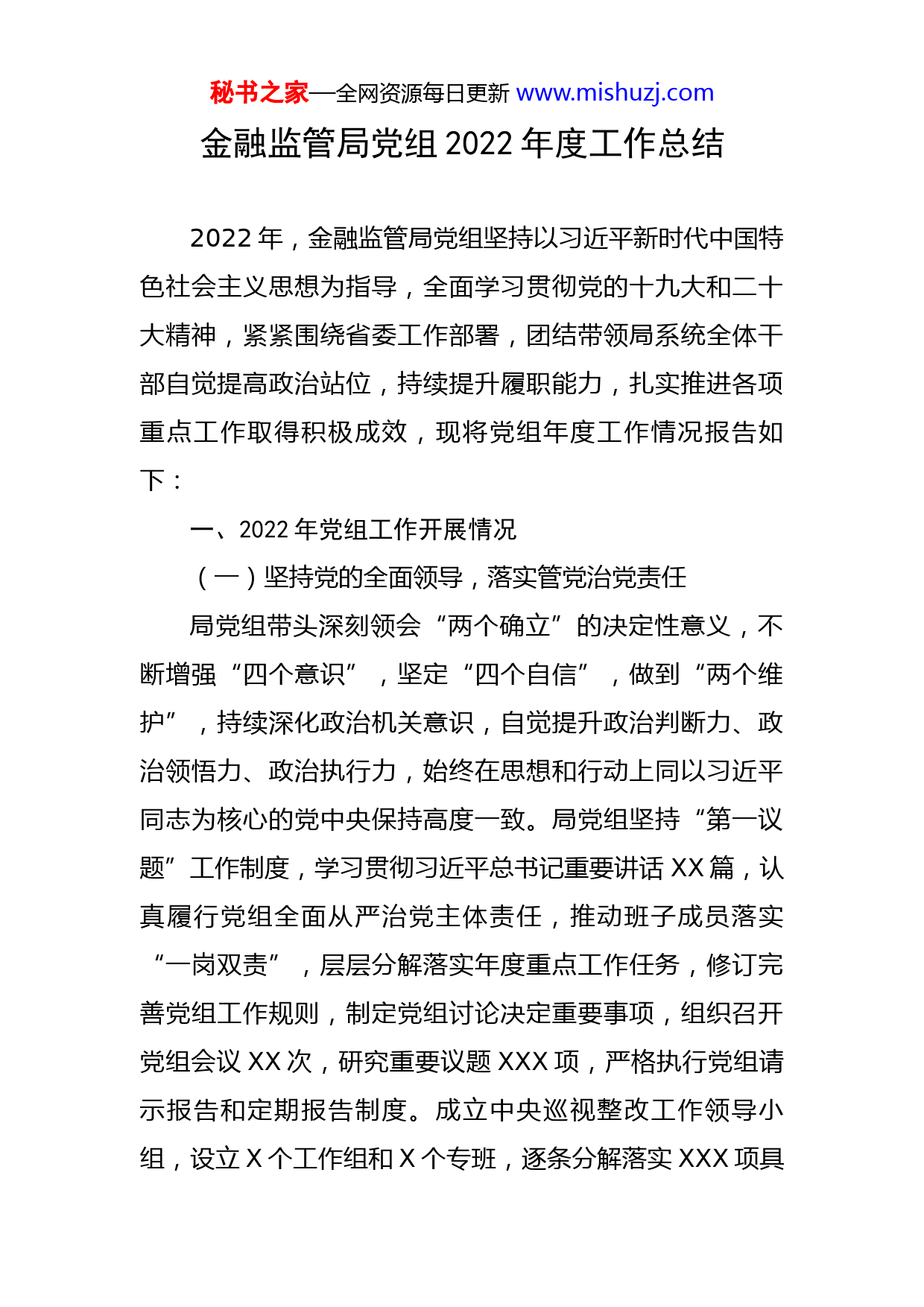 秘书之家—全网资源每日更新www.mishuzj.com金融监管局党组2022年度工作总结2022年,金融监管局党组坚持以习近平新时代中国特色社会主义思想为指导,全面学习贯彻党的十九大和二十大精神,紧紧围绕省委工作部署,团结带领局系统全体干部自觉提高政治站位,持续提升履职能力,扎实推进各项重点工作取得积极成效,现将党组年度工作情况报告如下:一、2022年党组工作开展情况(一)坚持党的全面领导,落实管党治党责任局党组带头深刻领会“两个确立”的决定性意义,不断增强“四个意识”,坚定“四个自信”,做到“两个维护”,持续深化政治机关意识,自觉提升政治判断力、政治领悟力、政治执行力,始终在思想和行动上同以习近平同志为核心的党中央保持高度一致。局党组坚持“第一议题”工作制度,学习贯彻习近平总书记重要讲话XX篇,认真履行党组全面从严治党主体责任,推动班子成员落实“一岗双责”,层层分解落实年度重点工作任务,修订完善党组工作规则,制定党组讨论决定重要事项,组织召开党组会议XX次,研究重要议题XXX项,严格执行党组请示报告和定期报告制度。成立中央巡视整改工作领导小组,设立X个工作组和X个专班,逐条分解落实XXX项具秘书之家—全网资源每日更新www.mishuzj.com体整改措施,推动全面完成限时整改任务,结合巡察整改、离任审计修订完善工作制度XX项。(二)带头强化理论武装,筑牢意识形态根基局党组坚持以习近平新时代中国特色社会主义思想为引领,自觉强化政治理论武装,修订完善党组理论学习中心组学习制度,发挥模范带头作用,开展集中学习研讨XX次,重点发言XX人次。全面学习宣传贯彻党的二十大精神,研究制定工作方案,组织开辟内网学习专栏,设计宣传展板和主题墙,党组带头集中学习研讨X次,深入支部讲专题党课X次,带动各党支部累计开展集中学习XX次,形成心得体会XX余篇。推动党史学习教育常态化,推进“我为群众办实事”重点民生项目X个。落实意识形态工作责任制,将意识形态工作纳入述职考评,制定年度宣传思想工作要点,党组研究意识形态工作X次,开展干部思想状况问卷调研X次,家访XX人次,全面掌握局机关干部思想状况。(三)加强基层组织建设,发挥战斗堡垒作用局党组自觉践行新时期党的组织路线,坚持党管干部原则和好干部标准,高质量完成四级调研员、二级主任科员、三级主任科员、四级主任科员职级晋升XX人次,开展干部岗位调整XX人次,推动人岗相适。聚焦基层党组织政治功能和组织功能,扎实推进党建高质量发展“五提升”秘书之家—全网资源每日更新www.mishuzj.com活动,完成专题研讨、集中攻坚、结对共建、党员承诺践诺等XX项重点任务。严肃党内政治生活,领导班子坚持过好双重组织生活,年内召开民主生活会X次,征求意见建议XX条,查摆问题XXX个,落实整改措施XX条,提出批评意见XX条。开展党总支换届选举,通过评选“红旗党支部”、党务培训等持续推进标准化规范化建设,重点项目成立临时党支部X个,发展接收预备党员X名,党内谈心谈话XXX人次,慰问困难党员群众XX人次,着力增强党组织的凝聚力和战斗力。(四)全力支持纪委监督,塑造清廉政治生态局党组旗帜鲜明支持纪委开展工作,自觉接受纪委监督,推动细化同级监督“两张清单”,探索建立X类XX项监督台账,通过加强政治监督保障重点工作落实。深化廉政风险排查防控,动态更新《廉政风险排查防控手册》,增加完善风险点和防控措施XX项,开展行政许可、行政处罚等监管履职重点领域专项监督,实施内部问责XX人次,推动补齐监管制度和流程短板。组织开展作风建设年活动,完成平台建设、警示教育、专题调研、主题党课等XX项重点工作任务。深入纠治违反中央八项规定精神典型问题和形式主义、官僚主义突出问题,累计自查整改问题XX项,制定完善非公务交往报告制度向机构延伸实施办法。深入推进重大腐败案件专题警示教育,运用案件通报、忏秘书之家—全网资源每日更新www.mishuzj.com悔录、《穿透III》等拓展深化纪律学习成效,累计开展专题研讨XX次;推进清廉金融文化建设,开展签订承诺书、发布行业公约、制作宣传展墙等系列主题活动,积极营造监管引领、协会搭台、机构推进、社会共建的整体氛围。(五)着力增强履职能力,提升内部管理水平局党组围绕践行“忠诚为民、砥砺奋进、精业求实、守正行廉”的监管文化理念,坚持树立讲政治、讲规则、讲团结、讲能力、讲作风、讲奉献工作原则,自觉加强班子能力建设。聚焦青年干部选育管用长效机制,深入研究制定青年工作二十条意见,着力提升干部专业素养。成立信息写作小组,创立工作专刊,各类信息累计被市委工作信息、学习强国、人民日报、央广网等采用XX篇,信息数量和质量得到双提升。进一步规范行政许可、行政处罚工作程序,持续健全监管工作机制。结合巡视巡察和离任审计整改,制定内部管理制度汇编,建立定期报告工作一览表和常态化工作清单,持续规范工作流程,提升工作效率。落实保密工作责任制,每半年听取保密工作汇报,组织开展保密自查X次,整改问题X项。(六)落实党组决策部署,推动监管中心工作局党组始终坚持党对金融工作的集中统一领导,坚决落实党中央、省委重点工作部署。制定XX条稳增长和助企纾困系列措施,指导金融机构围绕辖区五大产业集群和重秘书
