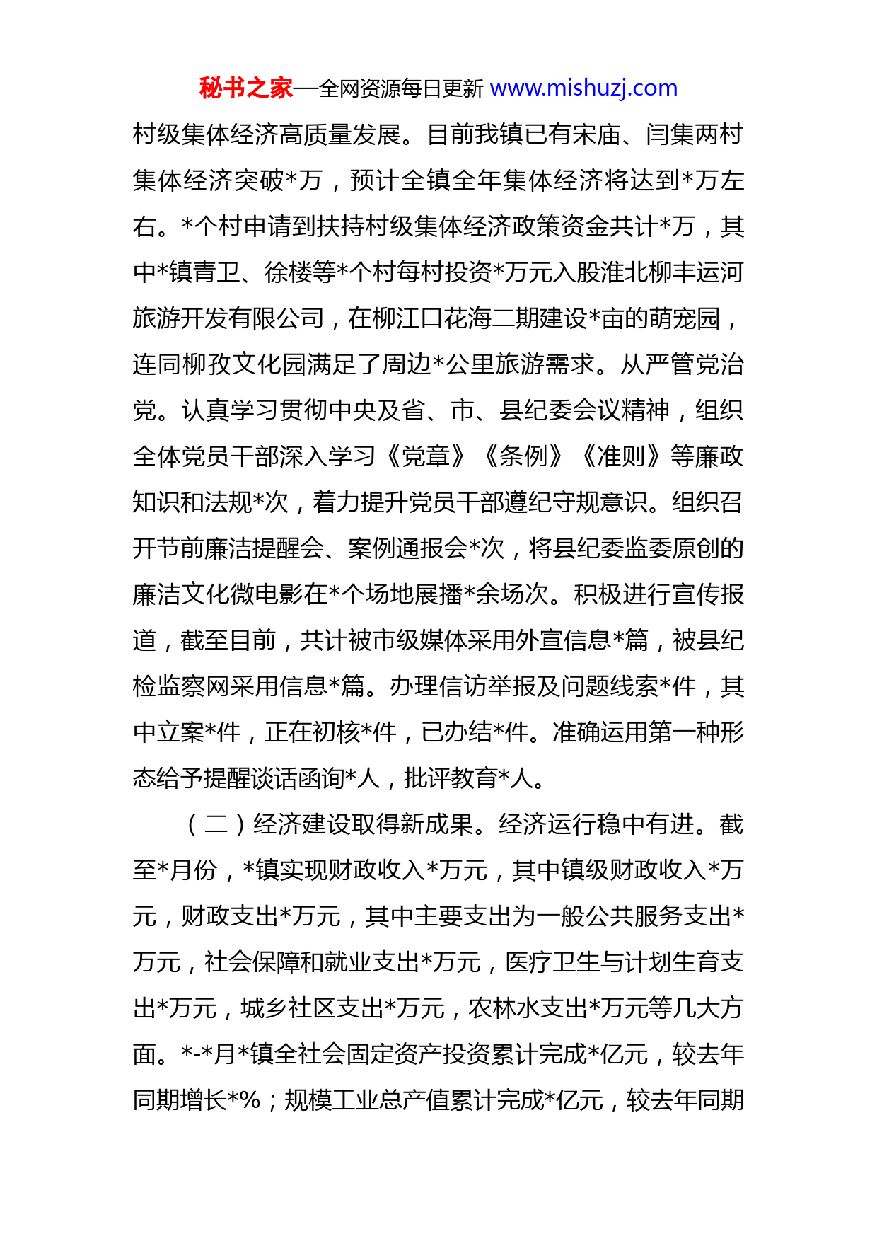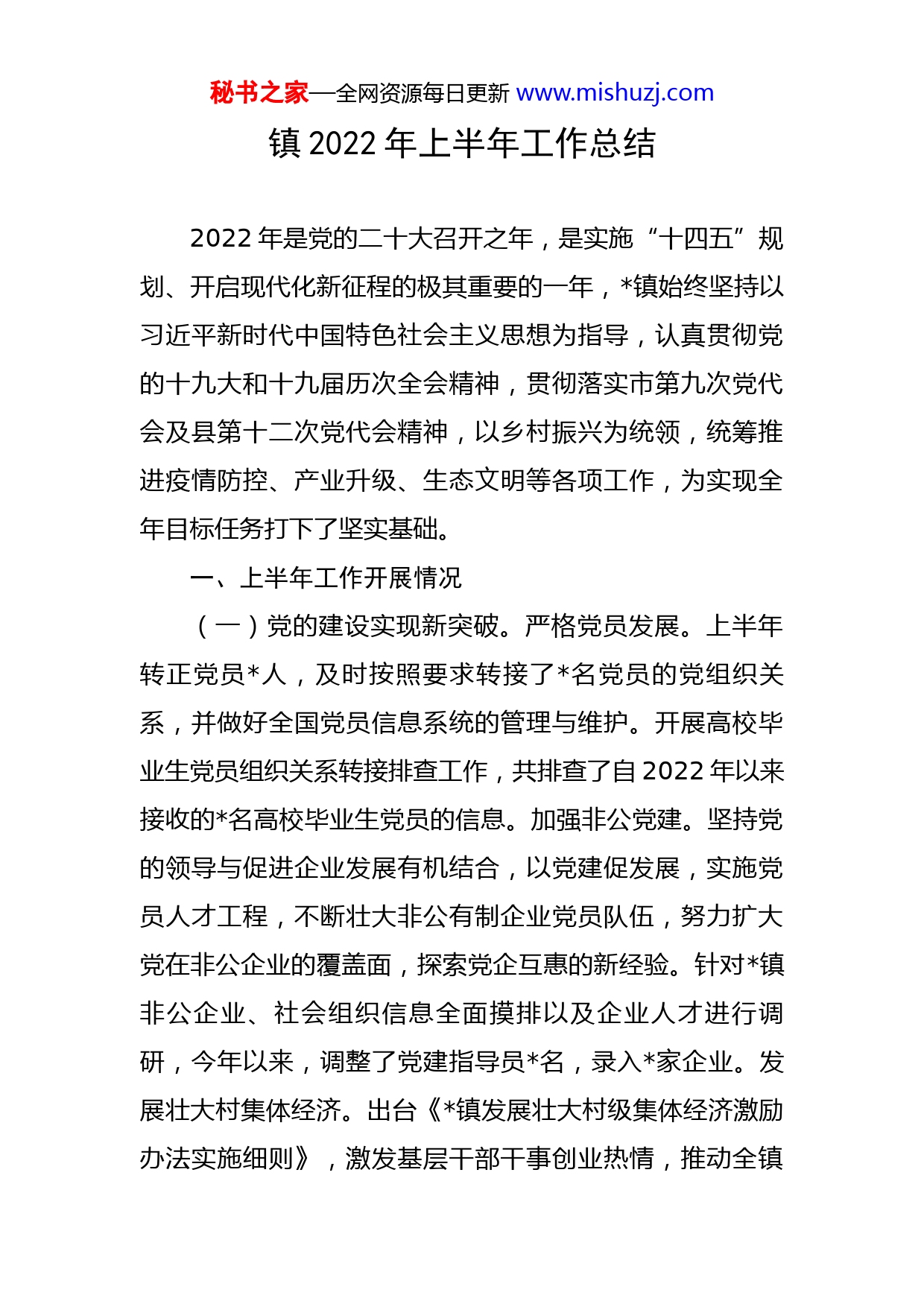 秘书之家—全网资源每日更新www.mishuzj.com镇2022年上半年工作总结2022年是党的二十大召开之年,是实施“十四五”规划、开启现代化新征程的极其重要的一年,镇始终坚持以习近平新时代中国特色社会主义思想为指导,认真贯彻党的十九大和十九届历次全会精神,贯彻落实市第九次党代会及县第十二次党代会精神,以乡村振兴为统领,统筹推进疫情防控、产业升级、生态文明等各项工作,为实现全年目标任务打下了坚实基础。一、上半年工作开展情况(一)党的建设实现新突破。严格党员发展。上半年转正党员人,及时按照要求转接了名党员的党组织关系,并做好全国党员信息系统的管理与维护。开展高校毕业生党员组织关系转接排查工作,共排查了自2022年以来接收的名高校毕业生党员的信息。加强非公党建。坚持党的领导与促进企业发展有机结合,以党建促发展,实施党员人才工程,不断壮大非公有制企业党员队伍,努力扩大党在非公企业的覆盖面,探索党企互惠的新经验。针对镇非公企业、社会组织信息全面摸排以及企业人才进行调研,今年以来,调整了党建指导员名,录入家企业。发展壮大村集体经济。出台《镇发展壮大村级集体经济激励办法实施细则》,激发基层干部干事创业热情,推动全镇秘书之家—全网资源每日更新www.mishuzj.com村级集体经济高质量发展。目前我镇已有宋庙、闫集两村集体经济突破万,预计全镇全年集体经济将达到万左右。个村申请到扶持村级集体经济政策资金共计万,其中镇青卫、徐楼等个村每村投资万元入股淮北柳丰运河旅游开发有限公司,在柳江口花海二期建设亩的萌宠园,连同柳孜文化园满足了周边公里旅游需求。从严管党治党。认真学习贯彻中央及省、市、县纪委会议精神,组织全体党员干部深入学习《党章》《条例》《准则》等廉政知识和法规次,着力提升党员干部遵纪守规意识。组织召开节前廉洁提醒会、案例通报会次,将县纪委监委原创的廉洁文化微电影在个场地展播余场次。积极进行宣传报道,截至目前,共计被市级媒体采用外宣信息篇,被县纪检监察网采用信息篇。办理信访举报及问题线索件,其中立案件,正在初核件,已办结件。准确运用第一种形态给予提醒谈话函询人,批评教育人。(二)经济建设取得新成果。经济运行稳中有进。截至月份,镇实现财政收入万元,其中镇级财政收入万元,财政支出万元,其中主要支出为一般公共服务支出万元,社会保障和就业支出万元,医疗卫生与计划生育支出万元,城乡社区支出万元,农林水支出万元等几大方面。-月镇全社会固定资产投资累计完成亿元,较去年同期增长%;规模工业总产值累计完成亿元,较去年同期秘书之家—全网资源每日更新www.mishuzj.com基本持平;工业投资累计完成万元,其中技改投资累计完成万元;-月限额以上消费品零售额累计完成万元,较去年下降-%。营商环境进一步优化。扎实开展“四送一服”双千工程,聚焦企业反映强烈的堵点痛点难点,千方百计纾难解困,加快惠企政策落地落实,进一步提振企业发展信心,办结办好访企解题,加强工作调度,快速提升问题办结率,让企业感受到“雪中送炭”的温暖、“雨中打伞”的贴心。招商引资力度不断增强。上半年紧盯在谈项目、紧跟在建项目、服务竣工项目尽快投产。接待客商批余人,为现代农业示范区引荐项目个并已签约,分别是临沂佳护商贸有限公司总投资万元的劳保用品生产线建设项目和淮北恒诚保温工程有限公司总投资万元的HC-膨胀珍珠岩保温板外墙外保温系统生产线建设项目,共盘活闲置工业用地约亩。竣工投产项目个,分别为安徽善研服装有限公司投资万元的年产万套高档内衣服装项目和安徽力聚投资集团有限公司协议投资亿元的年产万吨海绵城市综合环保型排水路面材料生产基地项目。(三)社会事业建设增添新活力。社会保障更加有力。发放惠农补贴人,补贴金额万余元,支出主要用于农用机具的购置、农业支出保护补贴、农村居民最低生活保证金、高龄津贴资金等项目。发放低保资金约万元,无一例错发漏发现象。核对新申请低保户近户,办理新增低秘书之家—全网资源每日更新www.mishuzj.com保户户,确保了新增低保对象家庭基本情况的真实性和低保工作的公平、公正、公开。认真落实特困供养政策,共拨付特困供养人员救助资金约万元。办理新增特困供养人员人。检查监督敬老院工作及运营情况,确保敬老院安全稳定有效运行。目前,我镇符合基本生活费发放条件并签订协议孤儿人,累计发放孤儿基本生活费约万元。积极配合县民政部门做好流浪乞讨人员救助工作。积极开展其他救助工作,临时救助约人次共发放救助资金万元,城乡困难群众小额临时救助人共万元,对经卫生部门确认的名艾滋病患者进行救助共发放救助金万元。卫健工作扎实开展。累计发放叶酸人,完成全年任务%,组织开展免费孕前优生健康检查人,完成全年任务,药具随访人次,孕产妇访视人次,新生儿访视人次,孕产妇建册,回收本,审核计划生育奖励扶助人员人,其中新增扩面人员人,全部通过县级审核,实现零失误,岁以上人员人,手术并发症人,特扶人员人,退出奖扶全镇共计人。城乡建设更加协调。完成徐淮蚌城际铁路征地安置一、二期资金申请、审计、拨付,拿到2022年第批次工矿废弃地复垦项目验收批复、备案手续,已报送