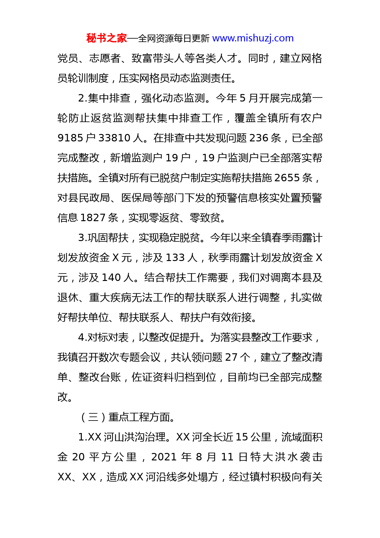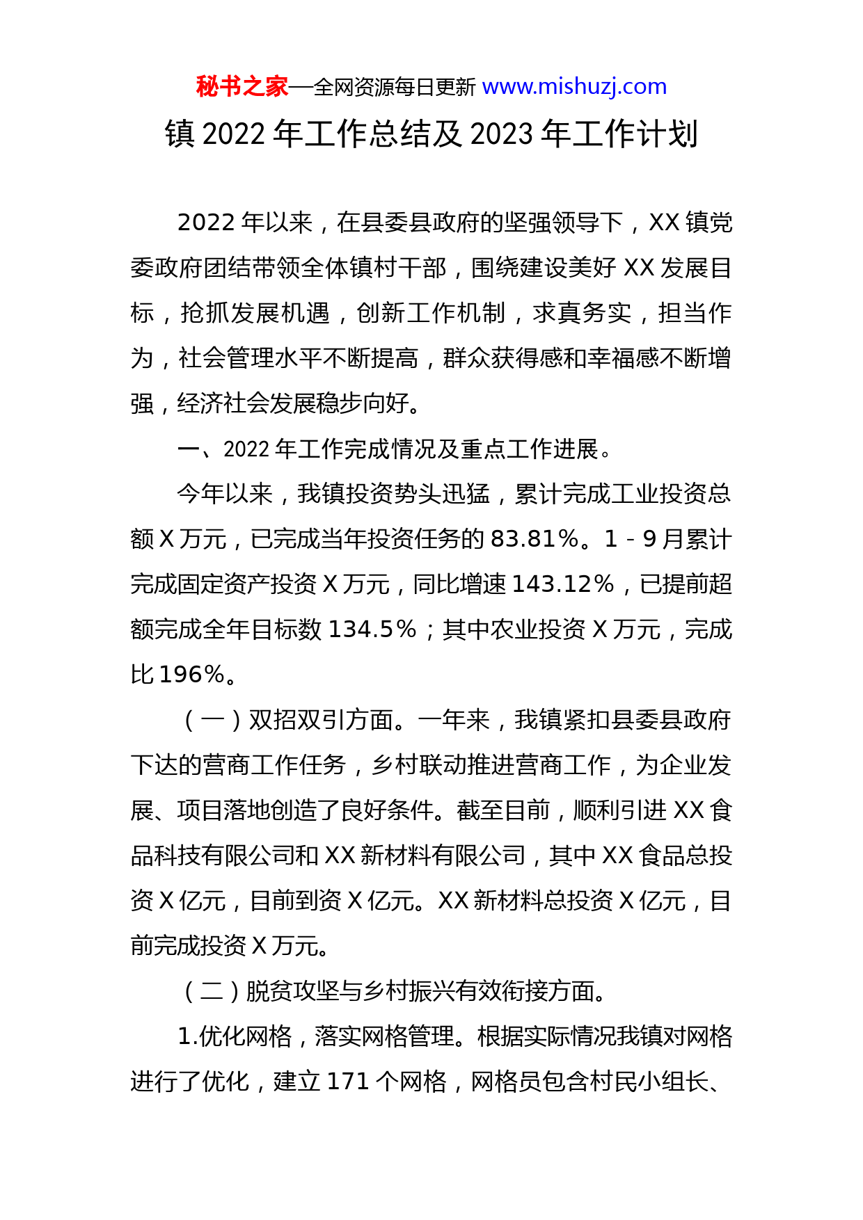 秘书之家—全网资源每日更新www.mishuzj.com镇2022年工作总结及2023年工作计划2022年以来,在县委县政府的坚强领导下,XX镇党委政府团结带领全体镇村干部,围绕建设美好XX发展目标,抢抓发展机遇,创新工作机制,求真务实,担当作为,社会管理水平不断提高,群众获得感和幸福感不断增强,经济社会发展稳步向好。一、2022年工作完成情况及重点工作进展。今年以来,我镇投资势头迅猛,累计完成工业投资总额X万元,已完成当年投资任务的83.81%。1-9月累计完成固定资产投资X万元,同比增速143.12%,已提前超额完成全年目标数134.5%;其中农业投资X万元,完成比196%。(一)双招双引方面。一年来,我镇紧扣县委县政府下达的营商工作任务,乡村联动推进营商工作,为企业发展、项目落地创造了良好条件。截至目前,顺利引进XX食品科技有限公司和XX新材料有限公司,其中XX食品总投资X亿元,目前到资X亿元。XX新材料总投资X亿元,目前完成投资X万元。(二)脱贫攻坚与乡村振兴有效衔接方面。1.优化网格,落实网格管理。根据实际情况我镇对网格进行了优化,建立171个网格,网格员包含村民小组长、秘书之家—全网资源每日更新www.mishuzj.com党员、志愿者、致富带头人等各类人才。同时,建立网格员轮训制度,压实网格员动态监测责任。2.集中排查,强化动态监测。今年5月开展完成第一轮防止返贫监测帮扶集中排查工作,覆盖全镇所有农户9185户33810人。在排查中共发现问题236条,已全部完成整改,新增监测户19户,19户监测户已全部落实帮扶措施。全镇对所有已脱贫户制定实施帮扶措施2655条,对县民政局、医保局等部门下发的预警信息核实处置预警信息1827条,实现零返贫、零致贫。3.巩固帮扶,实现稳定脱贫。今年以来全镇春季雨露计划发放资金X元,涉及133人,秋季雨露计划发放资金X元,涉及140人。结合帮扶工作需要,我们对调离本县及退休、重大疾病无法工作的帮扶联系人进行调整,扎实做好帮扶单位、帮扶联系人、帮扶户有效衔接。4.对标对表,以整改促提升。为落实县整改工作要求,我镇召开数次专题会议,共认领问题27个,建立了整改清单、整改台账,佐证资料归档到位,目前均已全部完成整改。(三)重点工程方面。1.XX河山洪沟治理。XX河全长近15公里,流域面积金20平方公里,2021年8月11日特大洪水袭击XX、XX,造成XX河沿线多处塌方,经过镇村积极向有关秘书之家—全网资源每日更新www.mishuzj.com部门争取,一方面采取查缺补漏的方式,累计向有关部门申请资金30处除险加固。另一方面,为长久治理XX河山洪,我镇正向省水利厅编报2023年项目。2.茯苓畈高标准农田。该项目治理土地面积0.335万亩,计划总投资X万元,其中:中央财政资金X万元,地方财政配套资金X万元。项目实施内容有:清淤加固塘1口,投资X万元;衬砌沟渠道9.16km,投资X万元;过路涵38座,投资X万元;高效节水灌溉工程400亩,投资X万元;修建机耕路0.98公里,投资X万元。目前已完成总投资的100%,项目正在审计。3.XX中小迁建项目和XX亲子两个省级重点项目。我镇成立了专门工作组,全程负责XX中小迁建项目实施,当前宿舍A#楼、B#楼、食堂和教学楼已完成顶层浇筑,其中宿舍A#楼、B#楼、教学A#和C#楼已完成坡屋面浇筑,综合楼和报告厅计划于10月底完成主体浇筑,实现全面封顶。同时,宿舍A#楼、B#楼和教学楼均开始砌砖墙,东北面围墙、东门卫室、东门入校路挡土墙和运动场主席台也在进行同步施工。同时,我镇已主动向县报备启动智能化工程同步实施意见,切实提高项目完工效率,节约财政资金成本。XX亲子项目计划总投资X亿,其中固定资产投资X万元,目前该项目烧烤帐篷区已经基本完工,果园已经种植完毕,240亩农田已经按照高标准农田建设秘书之家—全网资源每日更新www.mishuzj.com基本完成。水库环库公路已经修理一半,研学中心和民宿正在办理有关手续,作施工准备。(四)文明创建方面。1.集镇管理。我镇成立了文明创建领导小组,组建了工作专班,形成主要领导亲自抓、分管领导具体抓的齐抓共管工作局面。重点对环境卫生情况进行整治,将责任分工落实到人,自去年10月以来,将集镇划定为人居环境整治的重点区域,从镇村抽调专职人员6人,组建XX镇城管执法中队,设定办公场所集中办公,统一配备服装、执法仪等日常装备,摸索制定《XX集镇管理条例》、规范XX集镇执法中队工作职责,对集镇乱停乱放、乱搭乱建、乱堆乱放、出店经营进行规范管理。为进一步提升集镇形象,把环境治理区域划分为5个片区,每个片区都定人、定岗、定位。2.移风易俗。按照县委统一部署,严格落实丧事三天办结要求,各村累计进组入户召开移风易俗夜校达150余次,全面宣传丧事简办政策,目前全镇均已实现丧葬三天办结。为扎实做好宣传工作,我镇创新形式,开展移风易俗快板宣传,用群众喜闻乐见、通俗易懂的方式,大力宣传移风易俗、丧事简办的好处和必要性。组织全镇宗教界人士,开展宣传动员工作,让他们共同参与,成为推进移风易俗、丧事简办工作助力。镇机关干部率先垂范,签订秘书之家—全网资源每日更新www.mishuzj.com承诺书,镇村干部集体签订承诺并公开展示。3.乡贤工作。为创新发展乡贤文化,充分发挥“新乡贤”示范引领作用,用他们的嘉言懿行垂范乡里,弘扬时代新风,推进新时代活力XX和美丽乡村建设高质量发展,2022年我镇组织开展了XX镇“新乡贤”评选活动,