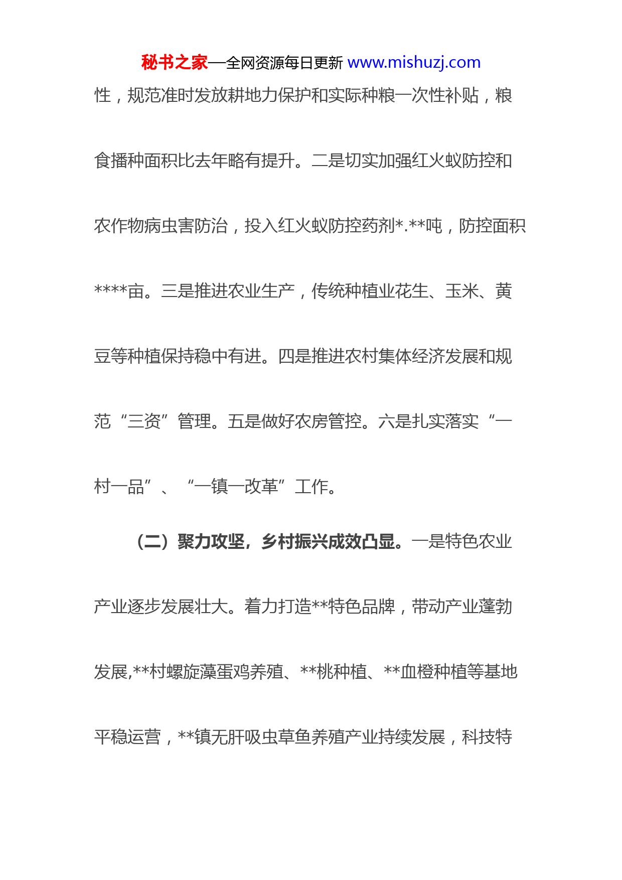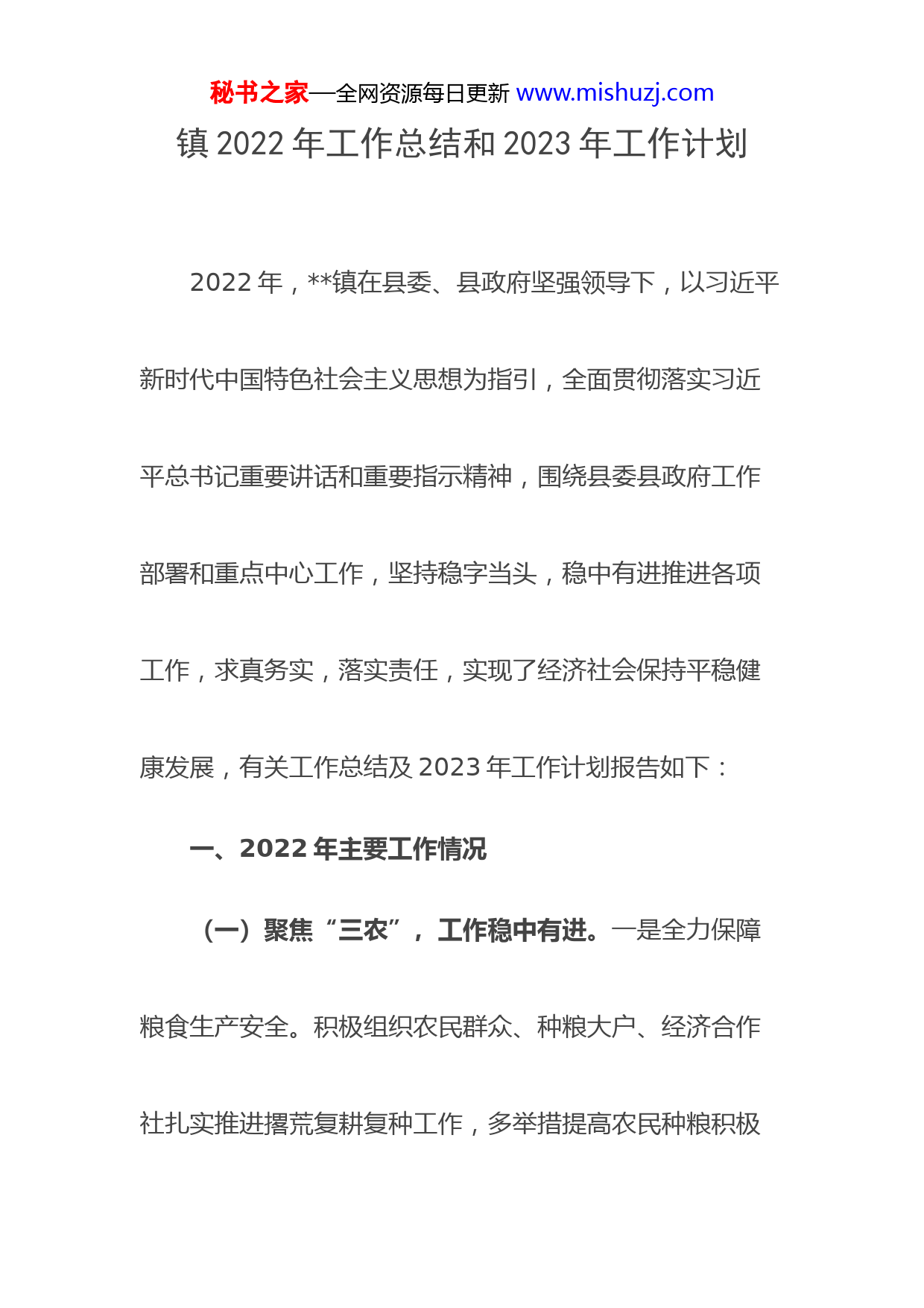 秘书之家—全网资源每日更新www.mishuzj.com镇2022年工作总结和2023年工作计划2022年,镇在县委、县政府坚强领导下,以习近平新时代中国特色社会主义思想为指引,全面贯彻落实习近平总书记重要讲话和重要指示精神,围绕县委县政府工作部署和重点中心工作,坚持稳字当头,稳中有进推进各项工作,求真务实,落实责任,实现了经济社会保持平稳健康发展,有关工作总结及2023年工作计划报告如下:一、2022年主要工作情况(一)聚焦“三农”,工作稳中有进。一是全力保障粮食生产安全。积极组织农民群众、种粮大户、经济合作社扎实推进撂荒复耕复种工作,多举措提高农民种粮积极秘书之家—全网资源每日更新www.mishuzj.com性,规范准时发放耕地力保护和实际种粮一次性补贴,粮食播种面积比去年略有提升。二是切实加强红火蚁防控和农作物病虫害防治,投入红火蚁防控药剂.吨,防控面积亩。三是推进农业生产,传统种植业花生、玉米、黄豆等种植保持稳中有进。四是推进农村集体经济发展和规范“三资”管理。五是做好农房管控。六是扎实落实“一村一品”、“一镇一改革”工作。(二)聚力攻坚,乡村振兴成效凸显。一是特色农业产业逐步发展壮大。着力打造特色品牌,带动产业蓬勃发展,村螺旋藻蛋鸡养殖、桃种植、血橙种植等基地平稳运营,镇无肝吸虫草鱼养殖产业持续发展,科技特秘书之家—全网资源每日更新www.mishuzj.com派员引进项目“航空水稻”试种成功;红松茸菌种植持续扩大,促进农户和合作社发展农业经济。二是人居环境持续向好。全镇完成个三分类垃圾屋建设,卫生公厕普及率达%。三是文明镇村建设取得新成绩,获评市级文明镇,村获评市级文明村。四是防返贫监测帮扶工作扎实落实,加强户“两易”人群帮扶。五是持续推进村高质量发展。(三)紧盯重点,项目建设稳步向前。一是完成环霍山风貌提升示范带建设,对、、景观面貌焕然一新,人居环境得到显著改善,以示范带建设带动全镇美丽乡村建设。二是完成农村集中集中供水工程;三是农村道路硬秘书之家—全网资源每日更新www.mishuzj.com化建设推进落实;四是扎实落实美丽圩镇创建,对标人居环境、卫生治理、公共服务、公共设施、风貌提升等项内容,完成圩镇农贸市场和街道升级改造,美丽圩镇建设更上一台阶。(四)人民至上,疫情防控和安全稳定工作有效落实。一是重点抓好返乡人员排查和大数据推送人员落地核查工作,均按要求落实管控措施。二是抓好疫苗接种工作,“一老一少”接种覆盖率达到目标要求。三是守牢安全底线,常态化推进网格化智慧管控工作,强化道路交通、自建房、消防、城镇燃气、森林防灭火等重点行业领域安全管理。四是科学有效完成防汛度汛工作,发扬连续作战精秘书之家—全网资源每日更新www.mishuzj.com神防御龙舟水,达到“零伤亡、少损失”的工作目标。五是促进社会治理,确保和谐稳定。扎实落实未成年人保护、精神病患者管理、社会矛盾纠纷排查和化解稳控工作,对重点案件落实“一案一专班”措施,确保小事不出村、大事不出镇、矛盾不上交。(五)改善民生,群众幸福指数有力提升。一是民政工作落实每月动态管理,做到应保尽保;退役军人服务保障工作更加扎实。二是卫生健康工作有效促进,举办各类知识讲座和健康咨询活动次。三是生态环保工作有力推进,完成个行政村个自然村雨污分流和个村级污水处理站点建设。秘书之家—全网资源每日更新www.mishuzj.com(六)提升效能,党风廉政建设常抓不懈。坚持强化自身建设,始终把建设人民满意政府作为努力方向,着力构建风清气正的政府形象,一是坚持和加强党的全面领导,把坚定政治方向作为做好政府工作的首要前提,确保党中央的各项决策部署在畅通无阻,落地见效。坚决落实“两个维护”十项制度机制,坚定不移地忠诚拥护“两个确立”、坚决做到“两个维护”。二是党风廉政建设不断深入,严格落实班子成员“一岗双责”,持之以恒贯彻中央八项规定精神。三是强化作风建设,严格落实《县加强作风建设提升执行力十项措施》有关要求,转变干部工秘书之家—全网资源每日更新www.mishuzj.com作作风,提升干事创业能力。四是全面落实法治政府建设,全面推进依法治镇,严格依法行政。二、存在问题和2023年主要工作计划主要存在的问题:一是基层党建仍须进一步加强,干部队伍能力水平有待进一步提升。二是镇村基础设施短板有待补齐,入户道路、圩镇农贸市场及配套设施建设、农田水利设施有待进一步推进。三是乡镇产业发展起步缓慢,缺少有引领力的农业龙头企业,依托霍山资源开发旅游产业仍需进一步挖掘。秘书之家—全网资源每日更新www.mishuzj.com2023年,我镇将认真学习贯彻党的二十大精神,围绕故里、风情、鱼生之乡、人文”,推进全域旅游开发,扎实推进发展。一是持续加强自身建设。将学习贯彻党的二十大精神作为当前和今后一个时期的首要政治任务,学深悟透、入脑入心,提升干部队伍思想和政治建设,把学习贯彻党的二十大精神与各项工作事业相结合,以提升队伍战斗力为导向,认真落实全面从严治党,落实党风廉政建设责任制和“一岗双责”,严明纪律,强化作风,实现工作提速增效。秘书之家—全网资源每日更新www.mishuzj.com二是做好项目的谋划和推进。抓紧做好实施乡村振兴规划编制,真正