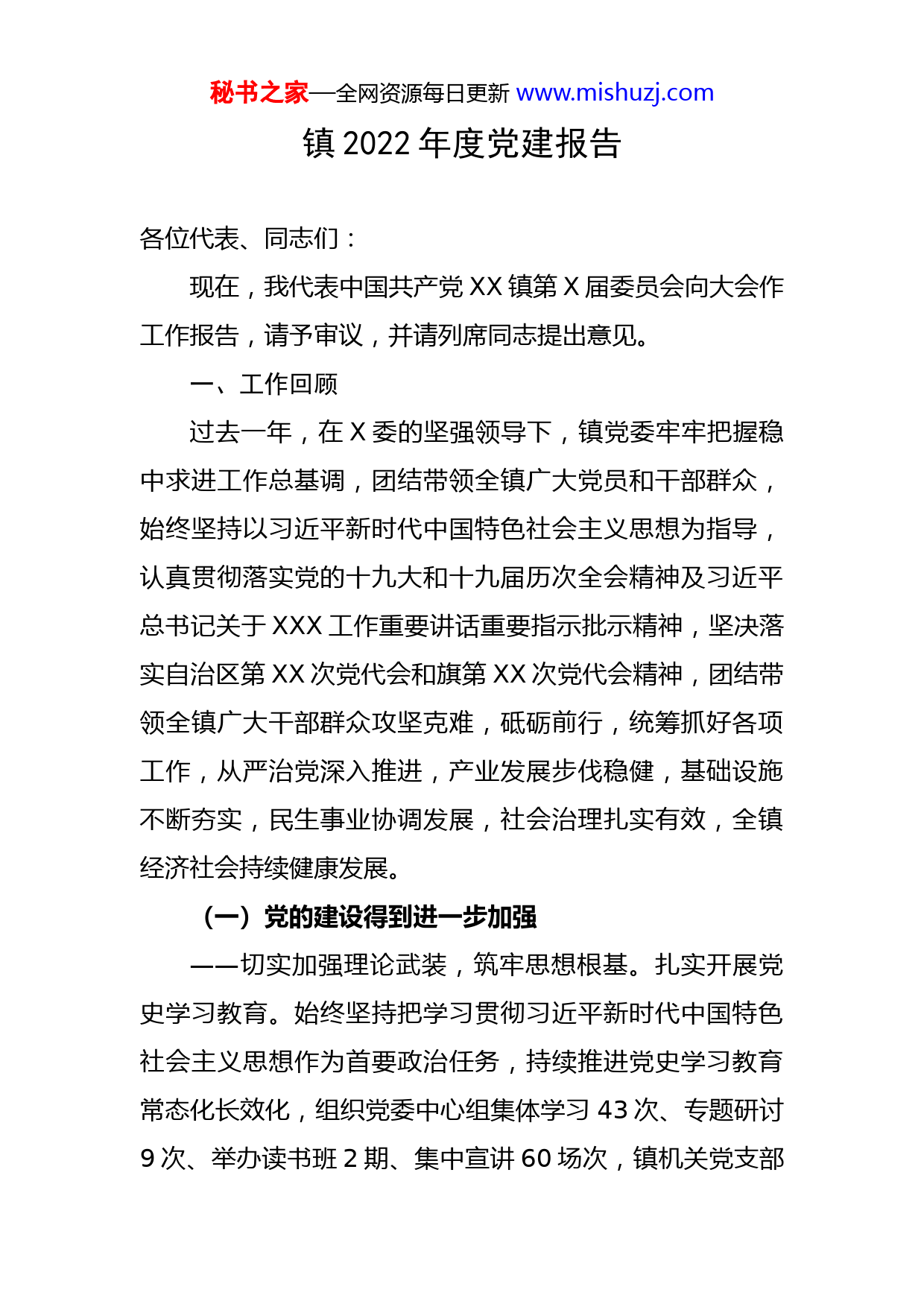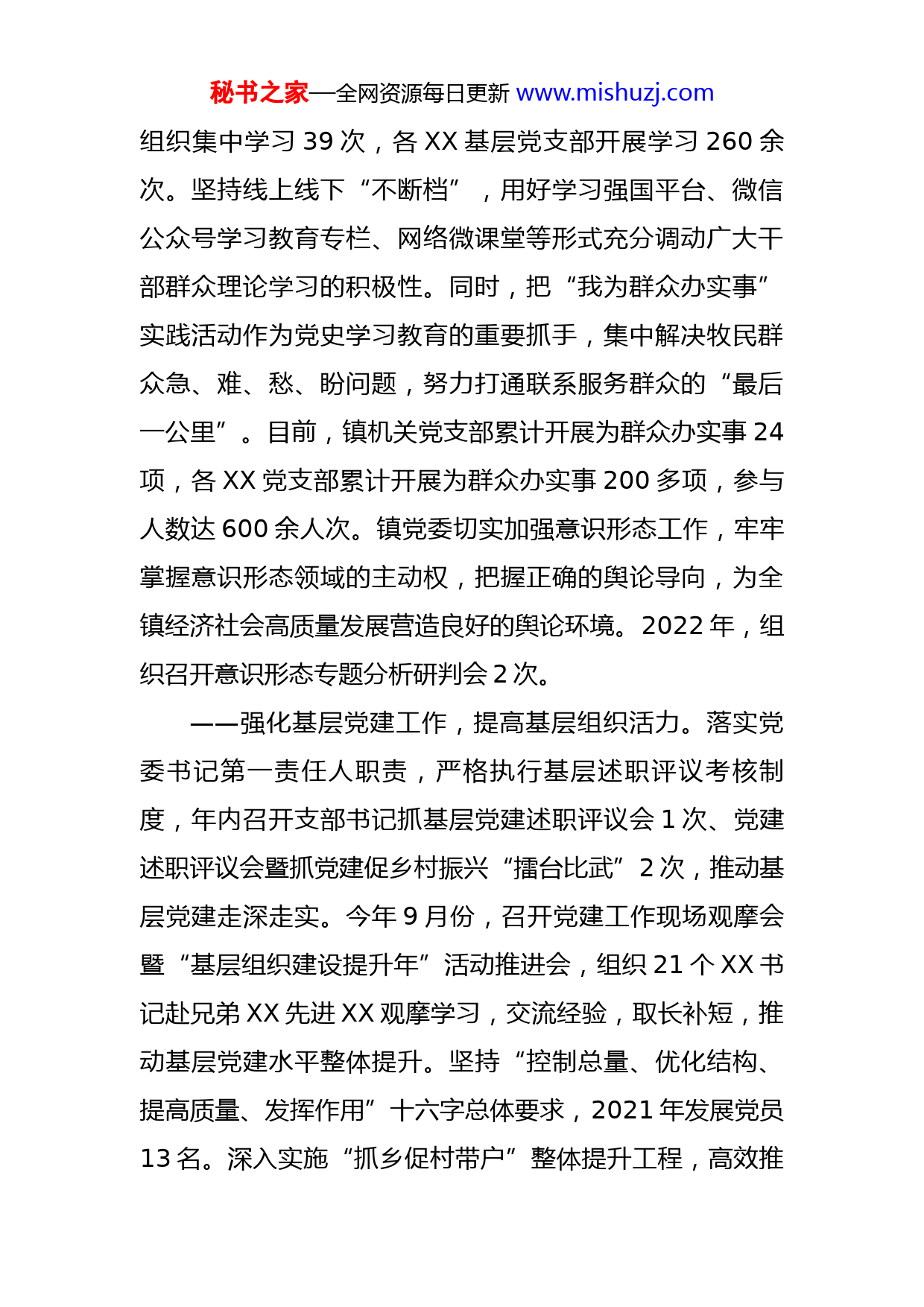 秘书之家—全网资源每日更新www.mishuzj.com镇2022年度党建报告各位代表、同志们:现在,我代表中国共产党XX镇第X届委员会向大会作工作报告,请予审议,并请列席同志提出意见。一、工作回顾过去一年,在X委的坚强领导下,镇党委牢牢把握稳中求进工作总基调,团结带领全镇广大党员和干部群众,始终坚持以习近平新时代中国特色社会主义思想为指导,认真贯彻落实党的十九大和十九届历次全会精神及习近平总书记关于XXX工作重要讲话重要指示批示精神,坚决落实自治区第XX次党代会和旗第XX次党代会精神,团结带领全镇广大干部群众攻坚克难,砥砺前行,统筹抓好各项工作,从严治党深入推进,产业发展步伐稳健,基础设施不断夯实,民生事业协调发展,社会治理扎实有效,全镇经济社会持续健康发展。(一)党的建设得到进一步加强——切实加强理论武装,筑牢思想根基。扎实开展党史学习教育。始终坚持把学习贯彻习近平新时代中国特色社会主义思想作为首要政治任务,持续推进党史学习教育常态化长效化,组织党委中心组集体学习43次、专题研讨9次、举办读书班2期、集中宣讲60场次,镇机关党支部秘书之家—全网资源每日更新www.mishuzj.com组织集中学习39次,各XX基层党支部开展学习260余次。坚持线上线下“不断档”,用好学习强国平台、微信公众号学习教育专栏、网络微课堂等形式充分调动广大干部群众理论学习的积极性。同时,把“我为群众办实事”实践活动作为党史学习教育的重要抓手,集中解决牧民群众急、难、愁、盼问题,努力打通联系服务群众的“最后一公里”。目前,镇机关党支部累计开展为群众办实事24项,各XX党支部累计开展为群众办实事200多项,参与人数达600余人次。镇党委切实加强意识形态工作,牢牢掌握意识形态领域的主动权,把握正确的舆论导向,为全镇经济社会高质量发展营造良好的舆论环境。2022年,组织召开意识形态专题分析研判会2次。——强化基层党建工作,提高基层组织活力。落实党委书记第一责任人职责,严格执行基层述职评议考核制度,年内召开支部书记抓基层党建述职评议会1次、党建述职评议会暨抓党建促乡村振兴“擂台比武”2次,推动基层党建走深走实。今年9月份,召开党建工作现场观摩会暨“基层组织建设提升年”活动推进会,组织21个XX书记赴兄弟XX先进XX观摩学习,交流经验,取长补短,推动基层党建水平整体提升。坚持“控制总量、优化结构、提高质量、发挥作用”十六字总体要求,2021年发展党员13名。深入实施“抓乡促村带户”整体提升工程,高效推秘书之家—全网资源每日更新www.mishuzj.com进“双抓共促”三位一体整体提升工程,持续打造盟级精品、盟级示范和盟、旗两级“五优”党委、“五强”党支部和“五好”党员中心户,不断提高基层组织规范化建设质量,2022年XX、XXX、XXXX、XXX等4个XX申报“最强党支部”。2022年,投入190万元,为XXX、XXX、XXX等三个XX实施新建集中养殖基础设施项目;投入210万元,为XXX、XXX和XXX等三个XX引进优质X肉牛;投入147.89万元,为XXX实施购置X羊和奶牛养殖项目,进一步壮大XX集体经济,带动牧民增收致富。——落实党风廉政建设主体责任,促使党风廉政建设持续向好。一是严格执行党委主体责任和党政领导班子成员“一岗双责”制,进一步转变工作作风,严格落实管党治党政治责任。二是坚持把纪律教育作为基层党组织“三会一课”的重要内容,融入党员日常教育管理当中。三是全力支持纪委聚焦监督检查主责主业,强化政治监督,督促XX党组织负责人担负起贯彻落实重大决策部署的政治责任,同时常态化开展“三务公开”、节日节点、疫情防控等监督检查,实现XX全覆盖。今年,镇党委听取纪委案件办理专项汇报1次,召开警示教育大会2次,观看警示教育片2次,开展警示教育活动1次。——创新举措推动落实,积极推进统战工作。镇党委秘书之家—全网资源每日更新www.mishuzj.com把统战工作纳入镇党委重要议事日程,确保统战工作与党委中心工作同部署、同落实、同达效。将民族团结进步创建作为加强和改进民族工作的重要抓手,2022年,XXXX被评为旗级民族团结进步示范XX。以铸牢中华民族共同体意识为主线,组织开展“深入宣传贯彻党的民族理论政策,铸牢中华民族共同体意识”、“奋发新征程、迎接党的XX大”为主题的民族政策宣传月活动,持续加强民族团结进步教育。——深入开展矛盾纠纷排查化解工作,助力平安建设。结合开展党的XX大安保维稳和“大走访”活动,并充分发挥镇矛盾纠纷调处中心职能作用,按照属地管理原则,扎实开展矛盾纠纷排查调处活动,做到早发现、早报告、早处置,抓早、抓小、抓苗头,将矛盾纠纷化解在萌芽状态,解决在基层。2021年至2022年,我镇未发生重大群体性事件和越级上访情况。——严格党管武装各项制度,着力加强基层武装。广泛开展兵役法规和征兵政策宣传工作,使广大群众和适龄青年了解有关政策,积极主动进行兵役登记。2022年,报名应征入伍4人,参军入伍1人。同时加强规范化建设,“三室一库”已建成的基础上,对物资储备库进行清点和整理。(二)稳步推进巩固拓展脱贫攻坚成果同乡村振兴有秘书之家—全网资源每日更新www.mishuzj.com效衔接。扎实开展盟巩固脱贫攻坚成果“回头看”专项行动,持续抓好防止贫返监测和帮扶全面摸底排查工作,2021年至2022