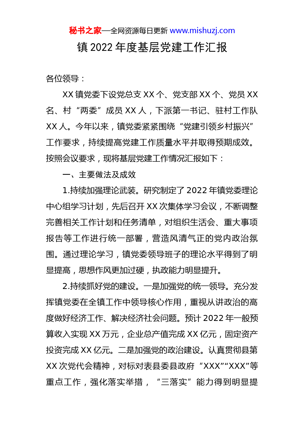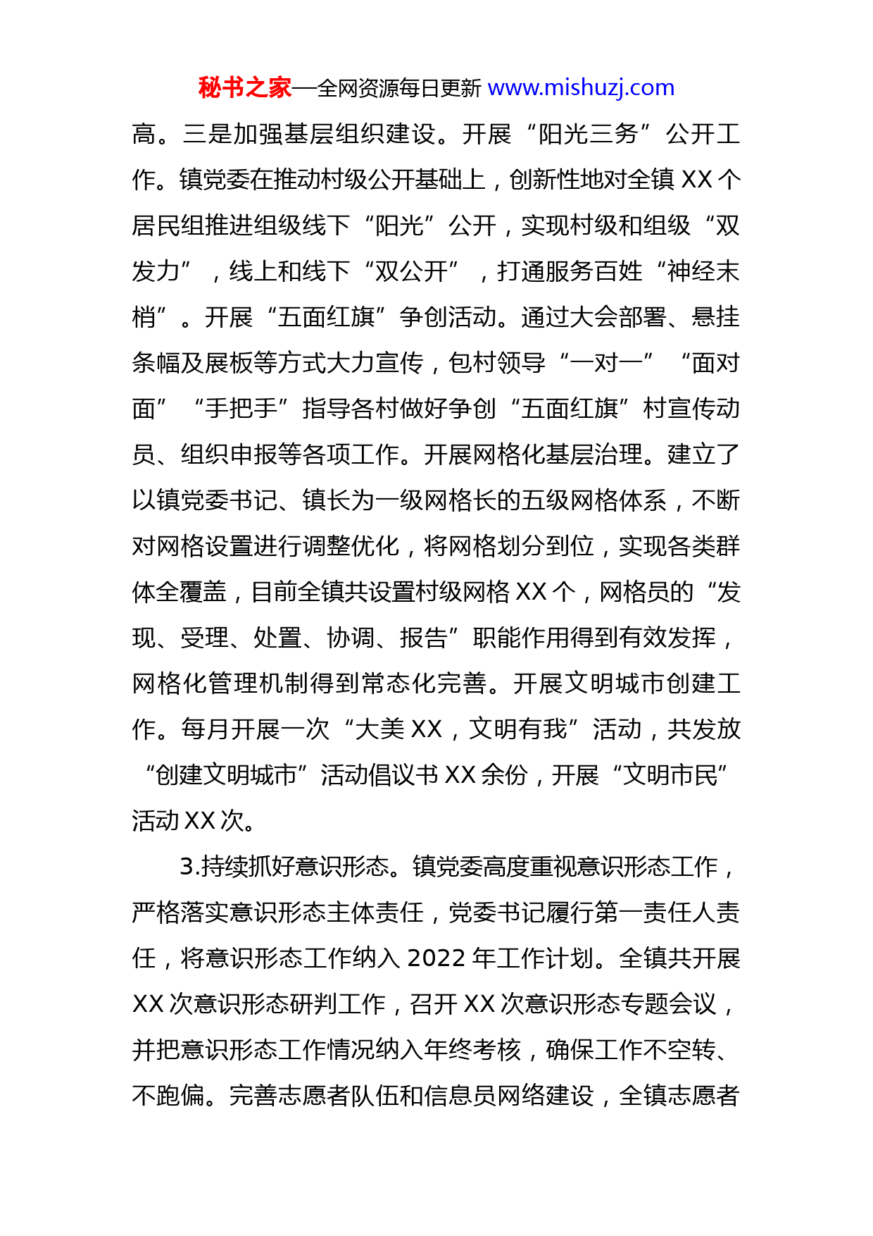 秘书之家—全网资源每日更新www.mishuzj.com镇2022年度基层党建工作汇报各位领导:XX镇党委下设党总支XX个、党支部XX个、党员XX名、村“两委”成员XX人,下派第一书记、驻村工作队XX人。今年以来,镇党委紧紧围绕“党建引领乡村振兴”工作要求,持续提高党建工作质量水平并取得预期成效。按照会议要求,现将基层党建工作情况汇报如下:一、主要做法及成效1.持续加强理论武装。研究制定了2022年镇党委理论中心组学习计划,先后召开XX次集体学习会议,不断调整完善相关工作计划和任务清单,对组织生活会、重大事项报告等工作进行统一部署,营造风清气正的党内政治氛围。通过理论学习,镇党委领导班子的理论水平得到了明显提高,思想作风更加过硬,执政能力明显提升。2.持续抓好党的建设。一是加强党的统一领导。充分发挥镇党委在全镇工作中领导核心作用,重视从讲政治的高度做好经济工作、解决经济社会问题。预计2022年一般预算收入实现XX万元,企业总产值完成XX亿元,固定资产投资完成XX亿元。二是加强党的政治建设。认真贯彻县第XX次党代会精神,对标对表县委县政府“XXX”“XXX”等重点工作,强化落实举措,“三落实”能力得到明显提秘书之家—全网资源每日更新www.mishuzj.com高。三是加强基层组织建设。开展“阳光三务”公开工作。镇党委在推动村级公开基础上,创新性地对全镇XX个居民组推进组级线下“阳光”公开,实现村级和组级“双发力”,线上和线下“双公开”,打通服务百姓“神经末梢”。开展“五面红旗”争创活动。通过大会部署、悬挂条幅及展板等方式大力宣传,包村领导“一对一”“面对面”“手把手”指导各村做好争创“五面红旗”村宣传动员、组织申报等各项工作。开展网格化基层治理。建立了以镇党委书记、镇长为一级网格长的五级网格体系,不断对网格设置进行调整优化,将网格划分到位,实现各类群体全覆盖,目前全镇共设置村级网格XX个,网格员的“发现、受理、处置、协调、报告”职能作用得到有效发挥,网格化管理机制得到常态化完善。开展文明城市创建工作。每月开展一次“大美XX,文明有我”活动,共发放“创建文明城市”活动倡议书XX余份,开展“文明市民”活动XX次。3.持续抓好意识形态。镇党委高度重视意识形态工作,严格落实意识形态主体责任,党委书记履行第一责任人责任,将意识形态工作纳入2022年工作计划。全镇共开展XX次意识形态研判工作,召开XX次意识形态专题会议,并把意识形态工作情况纳入年终考核,确保工作不空转、不跑偏。完善志愿者队伍和信息员网络建设,全镇志愿者秘书之家—全网资源每日更新www.mishuzj.com人数达到XX余人。此外,围绕全镇中心工作开展信息上报,全年共上报舆情信息XX余条、基层直报XX余条、学习强国投稿XX余篇(发表XX余篇)。4.持续推动党建落实。一是加强制度建设。认真落实述职述廉、约谈提醒、重大事项报告等制度,严格落实“一岗双责”。将廉政风险防控贯穿到工作全过程,紧盯腐败高发易发领域、关键岗位,不断补齐短板、堵塞漏洞,全年开展警示教育XX次、提醒谈话XX次。二是抓好党员管理。全年共召开XX次组织生活会、民主生活会、党史学习教育专题组织生活会;全年各支部各开展XX次党日活动。持续优化党员队伍年龄结构,全镇全年新发展党员XX名,其中农村党员35岁以下占比XX%。实施“村干部学历提升计划”,今年XX名村干部报名提升学历后,全镇XX%以上的村干部取得了大专及以上学历,有效提升村干部整体素质。三是强化党员教育。结合“三会一课”和党日活动等载体,深入推进“两学一做”常态化制度化,组织全体党员深入学习党的大会精神和习近平总书记关于“三农”工作、乡村振兴的重要论述。持续推进党史主题教育,全镇党史累计学习XX余次,全镇宣讲受众人数达XX余人。四是深化机构改革。严格按照时间节点推动乡镇机构改革,成立了XX个中心、XX个办公室,并做好人员流转思想工作,完成编制转隶。根据县编办要求,经过反复秘书之家—全网资源每日更新www.mishuzj.com探索讨论,编制完成的镇权责清单(初稿)已上报编办进行审议。五是壮大村集体经济。通过引导各村发展蔬菜大棚、苗木等种养殖业等方式,全年各村集体收入均达到XX万元以上。5.持续履行主体责任。一是先后召开XX次专题会议研究部署全面从严治党、党风廉政建设和反腐败工作,与各村、各站办签订责任状,严格落实“一岗双责、党政同责”责任制。二是聚焦企业急难愁盼问题,帮助XX等企业争取专项资金和完善基础设施建设,拓宽销售渠道、增加企业收入;先后XX次向镇内XX家重点个体工商户和企业制定发放《致企业家一封信》《优化营商环境调查问卷》征求意见建议,先后XX次深入行政服务大厅等一线窗口部门开展“靠前+靶向+跟进”监督,全镇营商环境得到持续改善。三是严肃执纪问责,2022年全镇共运用“四种形态”批评教育帮助和处理XX人次,运用第一种形态批评教育XX人次、占XX%,第二种形态纪律轻处分XX人次、占XX%,不定期督查镇村干部工作作风XX轮次,有效制止大操大办XX起,形成强大震慑效应。二、存在问题及原因在全镇党的建设取得预期明显成效的同时,党建工作还存在一些不足,面临不少困难和问题。一是领导干部因忙于土地征迁、信访维稳等琐碎事务,深入研究基