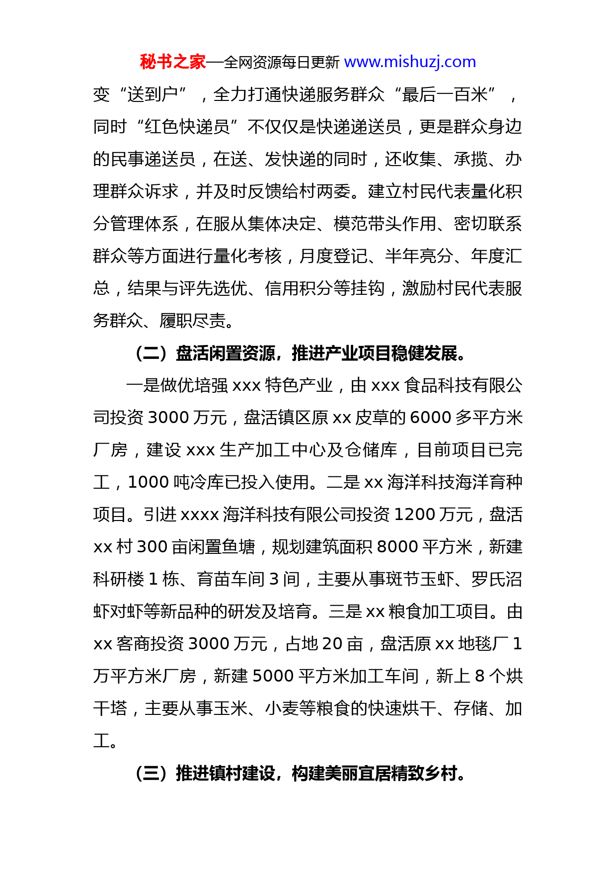 秘书之家—全网资源每日更新www.mishuzj.com镇2022年度工作总结今年以来,xx镇党委认真贯彻落实中央和各级决策部署,根据镇域实际,深入调研,理清思路,突出重点,统筹抓好乡村、党的建设、社会治理等各项工作,全力推动镇域经济社会高质量发展。(一)提升党建质量,筑牢基层组织堡垒作用。加强党建标准化、制度化建设,成立基层党建业务综合检查专班,对党建工作日调度、周小结、月考核,当月通报整改,次月验收归档,实现党建任务清单化管理,规范化运行,推动镇村干部作风转变,农村工作落实到位。党建引领村级发展,支持引导xx村、xx村等17个村党支部领办合作社,带动村集体增收近百万元,5万元以下的村全部清零,其中xx村党支部领办xxx合作社,吸引127名村民入股64.4万元,为村民提供就业岗位40余个,年均净利润20余万元,相关做法被中央电视台综合频道《晚间新闻》、xx卫视《xx新闻联播》、新华社等多家媒体平台相继报道。鼓励带动xxx、xxx、xx等13个村上千亩土地规模流转,通过流转溢价带动村民增收上百万元。推行“红色快递员”工程,结合全区“快递进村”工作,实施“党员先锋工程”,开展无职党员设岗定责,在各村至少确定1名党员担任“红色快递员”,将快递由“送到村”秘书之家—全网资源每日更新www.mishuzj.com变“送到户”,全力打通快递服务群众“最后一百米”,同时“红色快递员”不仅仅是快递递送员,更是群众身边的民事递送员,在送、发快递的同时,还收集、承揽、办理群众诉求,并及时反馈给村两委。建立村民代表量化积分管理体系,在服从集体决定、模范带头作用、密切联系群众等方面进行量化考核,月度登记、半年亮分、年度汇总,结果与评先选优、信用积分等挂钩,激励村民代表服务群众、履职尽责。(二)盘活闲置资源,推进产业项目稳健发展。一是做优培强xxx特色产业,由xxx食品科技有限公司投资3000万元,盘活镇区原xx皮草的6000多平方米厂房,建设xxx生产加工中心及仓储库,目前项目已完工,1000吨冷库已投入使用。二是xx海洋科技海洋育种项目。引进xxxx海洋科技有限公司投资1200万元,盘活xx村300亩闲置鱼塘,规划建筑面积8000平方米,新建科研楼1栋、育苗车间3间,主要从事斑节玉虾、罗氏沼虾对虾等新品种的研发及培育。三是xx粮食加工项目。由xx客商投资3000万元,占地20亩,盘活原xx地毯厂1万平方米厂房,新建5000平方米加工车间,新上8个烘干塔,主要从事玉米、小麦等粮食的快速烘干、存储、加工。(三)推进镇村建设,构建美丽宜居精致乡村。秘书之家—全网资源每日更新www.mishuzj.com在农村,围绕“七改”目标,对xx、xx、xx等村连村道路实施绿化提升4600平方米,投资40万元对xx、xxx等村黑臭水体进行治理,按要求对103户农户安装清洁供暖电热板,完成xx村雨污管网改造工程,出台《农村人居环境综合整治方案》,检查评比小组每日巡回检查,农村环境持续改善。在镇区,进一步完善基础设施建设,坚持把有机更新作为精致镇域建设的主基调,根据发展需要,对镇区xx路、xx街、政府西路进行升级改造,铺设罩面30400m2,人行道板2120m2,进一步打通镇域“三横四纵”路网;实施镇区亮化提升改造工程,对镇区xx路西段及xx路铺设电缆、更换灯杆102个,对xx路东段、xx街、xx路、xx路北段、xx路、xx路、xx路进行更换LED灯头200盏;对xx路道路两侧、政府广场进行绿化提升12000平方米,全面提升镇域基础设施水平,进一步优化群众生产生活环境。(四)办好民生实事,全面提升群众生活幸福感。持续巩固脱贫成效,为全镇脱贫户购买养老保险和xx商业保险,累计发放项目收益基金19万元,结合驻村走访制度建立联系帮扶机制,为困难群众送去人文关怀和政策帮扶,群众生活幸福感、获得感普遍提升。建立驻村办公制度。将全体机关干部编入农村工作片,每周两天准驻村办公,为群众排忧解难,在防火、防疫、防汛关键阶段鼓秘书之家—全网资源每日更新www.mishuzj.com励干部吃住在村,在一线服务群众。开展镇村文化活动。定期组织志愿者在和美文化广场、集贸市场开展“学党史、唱红歌”“党史知识问答”等文化惠民志愿服务活动,设立群众互动环节,融入医疗健康、疫情防控、法律法规及民法典等内容,真正实现农民业余生活有处可去,文化、政策需求有处可得。医疗康养方面,积极向上对接,推动优质卫生资源下沉共享,升级完善镇卫生院、敬老院硬件设施,引进医养专业人才,实现镇区医养全面升级,“医养结合”综合体实现上档升级。(五)创新治理模式,打造社会治理“xx样板”。优化镇级综合治理平台,选优配强工作力量,组建专业工作队伍,形成一体化的民生服务平台收集分析解决群众诉求,切实解决群众反映强烈的突出问题。试点党建引领五治融合治理方案,促进村民自治与网格化服务管理有效衔接,全面提升治理能力和治理体系现代化,相关做法赢得市、区两级的一致肯定。创新网格治理,因村制宜,探索了三种网格治理模式。分别是红色网格,即划分以支部委员、党小组长为片区长的网格小区,收集问题、化解矛盾;熟人网格,即按“关系相近、情感相亲”原则,由中心户党员自选8-10户群众主动联系服务;标准网格,按区域均等划分,由两委干部、党员骨干担任网格员,收集群众诉求代办帮办。通过分类精细治理,将问题掌控在秘书之家—全网资源每日更新www.mishuzj.com网格、化