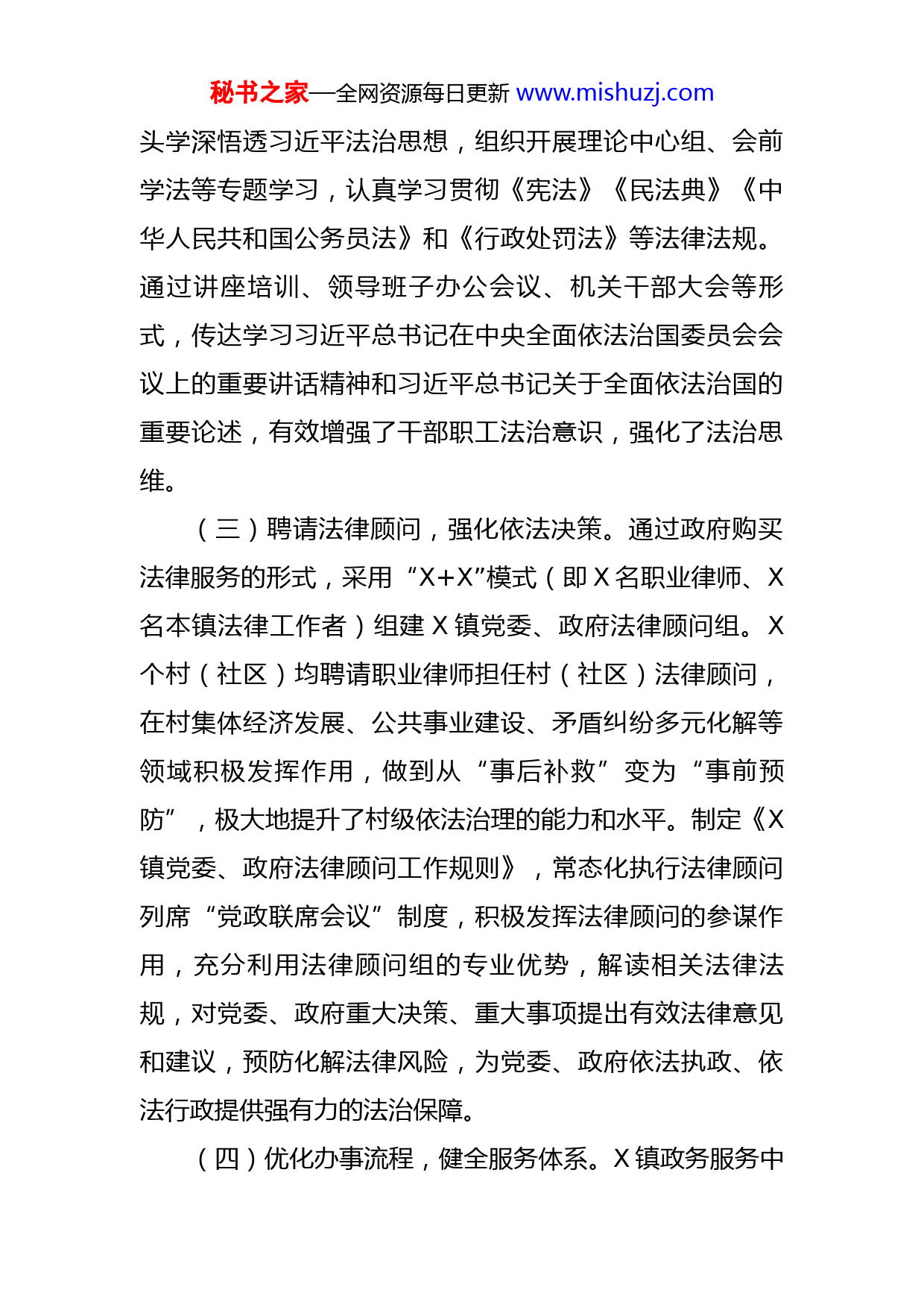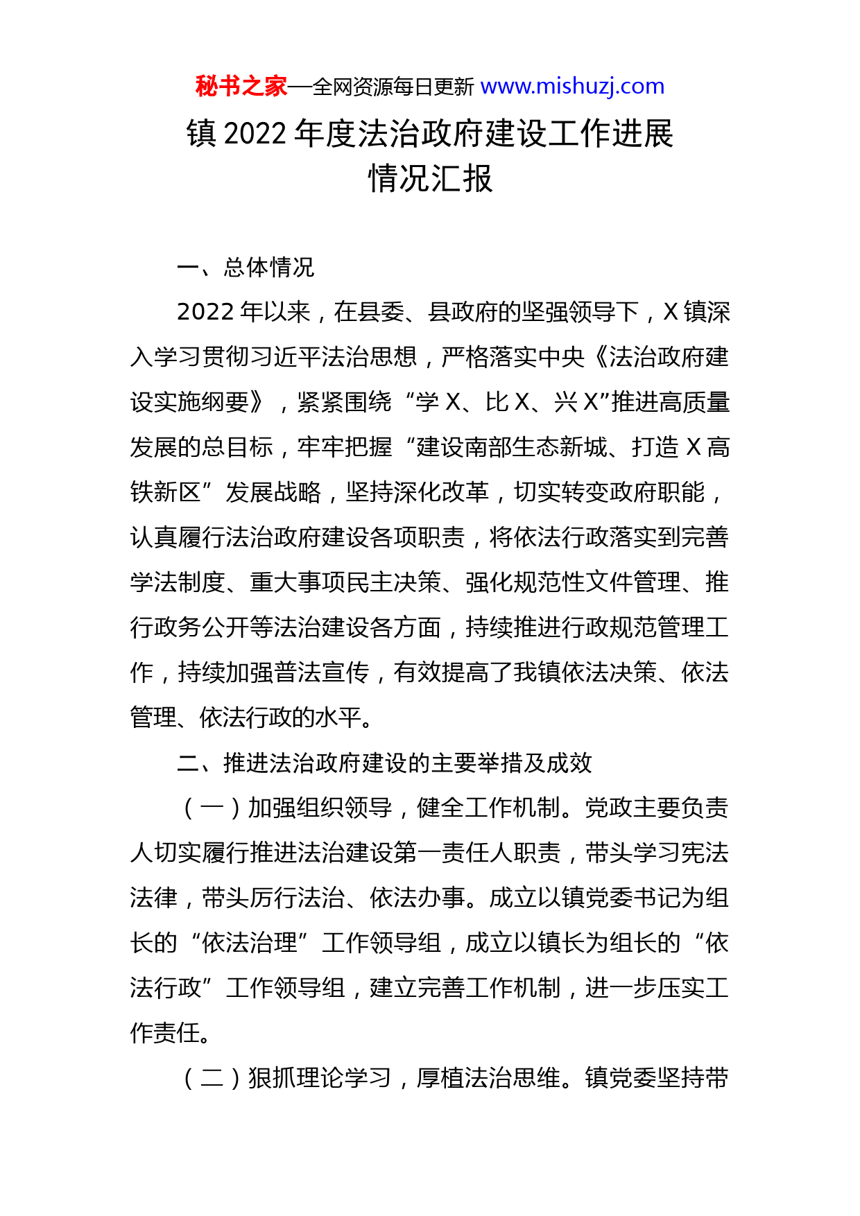 秘书之家—全网资源每日更新www.mishuzj.com镇2022年度法治政府建设工作进展情况汇报一、总体情况2022年以来,在县委、县政府的坚强领导下,X镇深入学习贯彻习近平法治思想,严格落实中央《法治政府建设实施纲要》,紧紧围绕“学X、比X、兴X”推进高质量发展的总目标,牢牢把握“建设南部生态新城、打造X高铁新区”发展战略,坚持深化改革,切实转变政府职能,认真履行法治政府建设各项职责,将依法行政落实到完善学法制度、重大事项民主决策、强化规范性文件管理、推行政务公开等法治建设各方面,持续推进行政规范管理工作,持续加强普法宣传,有效提高了我镇依法决策、依法管理、依法行政的水平。二、推进法治政府建设的主要举措及成效(一)加强组织领导,健全工作机制。党政主要负责人切实履行推进法治建设第一责任人职责,带头学习宪法法律,带头厉行法治、依法办事。成立以镇党委书记为组长的“依法治理”工作领导组,成立以镇长为组长的“依法行政”工作领导组,建立完善工作机制,进一步压实工作责任。(二)狠抓理论学习,厚植法治思维。镇党委坚持带秘书之家—全网资源每日更新www.mishuzj.com头学深悟透习近平法治思想,组织开展理论中心组、会前学法等专题学习,认真学习贯彻《宪法》《民法典》《中华人民共和国公务员法》和《行政处罚法》等法律法规。通过讲座培训、领导班子办公会议、机关干部大会等形式,传达学习习近平总书记在中央全面依法治国委员会会议上的重要讲话精神和习近平总书记关于全面依法治国的重要论述,有效增强了干部职工法治意识,强化了法治思维。(三)聘请法律顾问,强化依法决策。通过政府购买法律服务的形式,采用“X+X”模式(即X名职业律师、X名本镇法律工作者)组建X镇党委、政府法律顾问组。X个村(社区)均聘请职业律师担任村(社区)法律顾问,在村集体经济发展、公共事业建设、矛盾纠纷多元化解等领域积极发挥作用,做到从“事后补救”变为“事前预防”,极大地提升了村级依法治理的能力和水平。制定《X镇党委、政府法律顾问工作规则》,常态化执行法律顾问列席“党政联席会议”制度,积极发挥法律顾问的参谋作用,充分利用法律顾问组的专业优势,解读相关法律法规,对党委、政府重大决策、重大事项提出有效法律意见和建议,预防化解法律风险,为党委、政府依法执政、依法行政提供强有力的法治保障。(四)优化办事流程,健全服务体系。X镇政务服务中秘书之家—全网资源每日更新www.mishuzj.com心将与企业、群众密切相关的审批事项纳入中心统一办理,所有村(社区)均建有为民服务中心,打通服务群众“最后一公里”。加快推行“互联网+政务服务”建设,实现政务服务全覆盖、全联通,明确构建“五个一”的服务模式,形成了网厅实厅融合、线上线下联动、服务监督并重、信息资源协同的政务服务体系。(五)建立权责清单,规范权力运行。全面梳理、公布X镇“权责清单”“公共服务清单”,并实行动态调整。将职权目录、实施主体、法律依据、办理流程以清单的方式进行列举和图解,进一步规范权力运行,加强对权力运行的制约和监督。(六)强化党建引领,丰富“三治”内容。各村(社区)坚持依法治理,根据本村(社区)实际制定公布《村民公约》、《居民公约》,成立“一约四会”自治组织,充分发挥乡贤、道德模范的示范引领作用,为所有村(社区)配备了村级“法治副书记”,倡导开展“法治家庭示范户”申报创建,积极构建党建引领、自治有力、法治有序、德治有效的基层社会治理模式。(七)坚持以上率下,依法调解纠纷。建立健全信访响应机制和事项处理机制,严格落实领导干部带头接访制度,有效提高信访、投诉事项办结效率。2022年以来,全镇共受理人民调解案件X余件,成功调解X件,涉案金额秘书之家—全网资源每日更新www.mishuzj.comX万元;共受理来访X批X人次,其中主要领导接访X批X人次,到县X批X人次,去市访X批次X人,赴省X批X人次,到省劝访X次X人、进京访X批X人次,约访X次,带案下访X次,网上信访X次。全镇政务信息公开X条,处理县长信箱X条、县长热线X件,办结率X%。三、存在的问题及原因2022年,我镇推进法治政府建设工作虽然取得了较好成效,但也存在一些问题,主要表现在:一是在履行行政职能上,还有待进一步提升行政办事效率;二是行政决策机制及制度建设上,仍需进一步加强和完善;三是法律专业人才短缺,行政执法能力还有待进一步提高。主要原因是行政执法培训力度不够,执法人员缺少系统的行政法规培训,依法行政水平不高,对政策的把握能力有所欠缺。四、下一步推进法治政府建设的主要工作安排(一)加强普法宣传。在持续推进法治宣传教育工作中紧盯领导干部这一“关键少数”,镇党校各培训班次常态化开设法治学习课程。运用“机关集中学法月”“X普法行”“宪法宣传周”等品牌主题法治宣传活动,切实开展“送法进机关”活动,适时举办宪法、民法典、行政处罚法等法治讲座,不断增强机关干部学法、用法意识。(二)优化法律服务。通过积极培育基层“法律明白人”“法治带头人”,完善镇、村两级公共法律服务体系秘书之家—全网资源每日更新www.mishuzj.com建设,在各村建立“法律服务微信群”,实现在线咨询。推动法律服务阵地前移,充分满足基层群众法律服务需