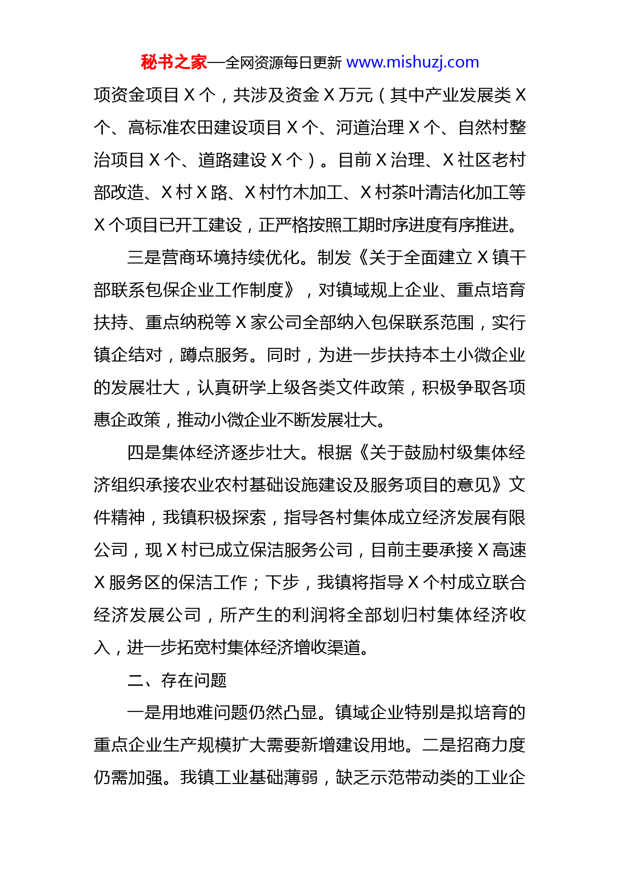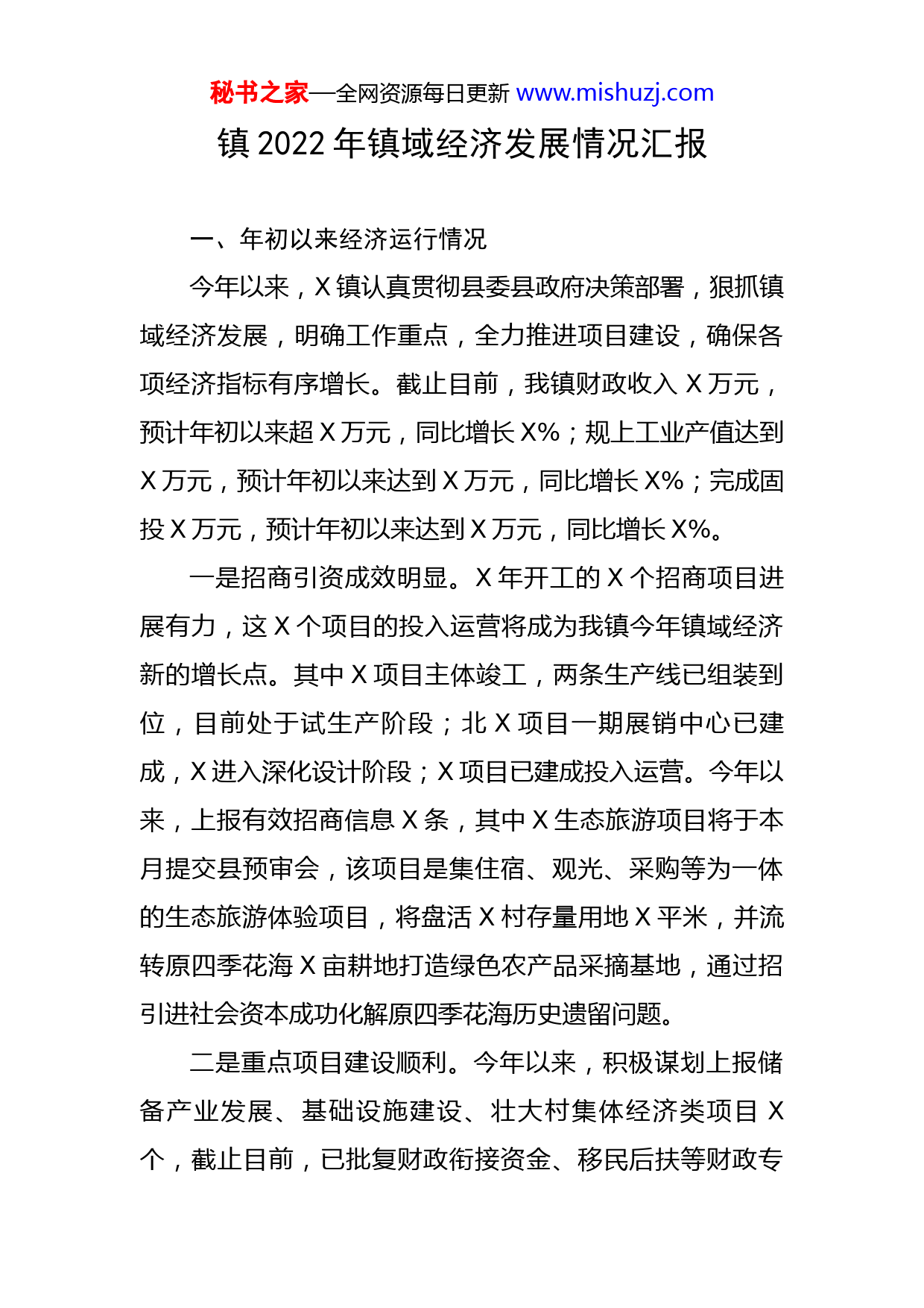 秘书之家—全网资源每日更新www.mishuzj.com镇2022年镇域经济发展情况汇报一、年初以来经济运行情况今年以来,X镇认真贯彻县委县政府决策部署,狠抓镇域经济发展,明确工作重点,全力推进项目建设,确保各项经济指标有序增长。截止目前,我镇财政收入X万元,预计年初以来超X万元,同比增长X%;规上工业产值达到X万元,预计年初以来达到X万元,同比增长X%;完成固投X万元,预计年初以来达到X万元,同比增长X%。一是招商引资成效明显。X年开工的X个招商项目进展有力,这X个项目的投入运营将成为我镇今年镇域经济新的增长点。其中X项目主体竣工,两条生产线已组装到位,目前处于试生产阶段;北X项目一期展销中心已建成,X进入深化设计阶段;X项目已建成投入运营。今年以来,上报有效招商信息X条,其中X生态旅游项目将于本月提交县预审会,该项目是集住宿、观光、采购等为一体的生态旅游体验项目,将盘活X村存量用地X平米,并流转原四季花海X亩耕地打造绿色农产品采摘基地,通过招引进社会资本成功化解原四季花海历史遗留问题。二是重点项目建设顺利。今年以来,积极谋划上报储备产业发展、基础设施建设、壮大村集体经济类项目X个,截止目前,已批复财政衔接资金、移民后扶等财政专秘书之家—全网资源每日更新www.mishuzj.com项资金项目X个,共涉及资金X万元(其中产业发展类X个、高标准农田建设项目X个、河道治理X个、自然村整治项目X个、道路建设X个)。目前X治理、X社区老村部改造、X村X路、X村竹木加工、X村茶叶清洁化加工等X个项目已开工建设,正严格按照工期时序进度有序推进。三是营商环境持续优化。制发《关于全面建立X镇干部联系包保企业工作制度》,对镇域规上企业、重点培育扶持、重点纳税等X家公司全部纳入包保联系范围,实行镇企结对,蹲点服务。同时,为进一步扶持本土小微企业的发展壮大,认真研学上级各类文件政策,积极争取各项惠企政策,推动小微企业不断发展壮大。四是集体经济逐步壮大。根据《关于鼓励村级集体经济组织承接农业农村基础设施建设及服务项目的意见》文件精神,我镇积极探索,指导各村集体成立经济发展有限公司,现X村已成立保洁服务公司,目前主要承接X高速X服务区的保洁工作;下步,我镇将指导X个村成立联合经济发展公司,所产生的利润将全部划归村集体经济收入,进一步拓宽村集体经济增收渠道。二、存在问题一是用地难问题仍然凸显。镇域企业特别是拟培育的重点企业生产规模扩大需要新增建设用地。二是招商力度仍需加强。我镇工业基础薄弱,缺乏示范带动类的工业企秘书之家—全网资源每日更新www.mishuzj.com业,在狠抓现有企业培育的同时,还需积极引进好企业好项目。三、下一步工作措施一是盘好要素资源。在用好镇域存量土地的基础上谋划好增量土地,为乡村振兴示范片区建设进一步夯实要素保障。针对我县耕地资源紧缺现状,利用过渡性规划调整,积极谋划报批林地来承接建设用地指标。针对X扩大规模急需建设用地新建厂房问题,已在灵芝基地附近选址X亩林地,目前正在进行林地征占用手续报批。二是用好人脉资源。发挥X籍能人和已引入客商的人脉资源,积极在外宣传推介。对照梳理完成的X籍在外成功人士花名册,根据县委产业发展导向,精准对接进行招引。同时以优质的服务不断提振已在X投资的X居民宿、X等客商发展信心,鼓励企业在X进一步扩大产能和经营范围。三是抓好内生资源。严格根据既定的培养目标,逐步促进X镇域企业“小”升“规”、“个”转“企”。对缺乏投资信心的企业,充分发挥乡村振兴项目资金的杠杆作用,积极争取乡村振兴项目,着力扶持泰克仓储设备制造公司新建加工厂房,扩大产值。对缺乏渠道的企业,积极利用人脉帮助企业扩大销售渠道,继续帮助X家具厂与X画材深入合作,不断扩大产能;积极联系X食品公司帮助秘书之家—全网资源每日更新www.mishuzj.comX扩大销量。四、X年各项指标预判情况预计X年财政收入突破X万元;规上企业产值突破X万元;固定资产投资X万元以上;确保完成新增X家规上企业(X商贸有限公司),力争X家(X颗粒公司);完成X家年产值X万元以上企业(X丝项目、X仓储设备制造有限公司);确保新增X家限上商贸企业(X县X镇X生活超市、X县X镇X酒店)。