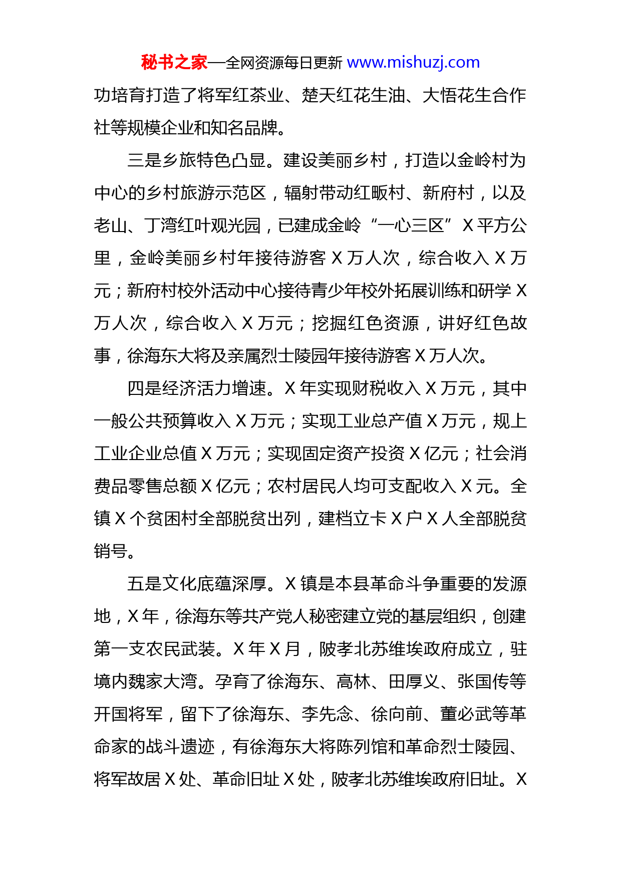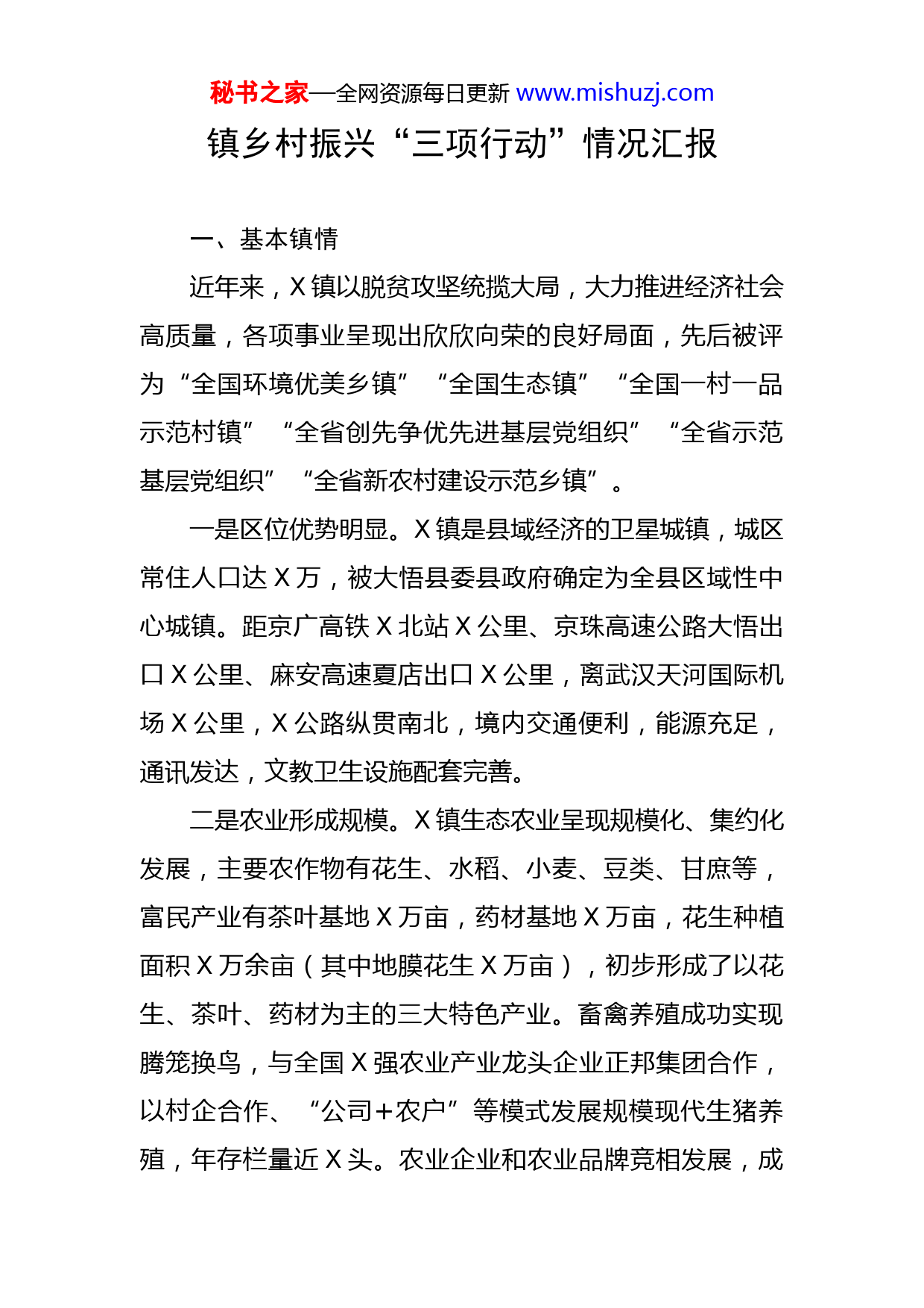 秘书之家—全网资源每日更新www.mishuzj.com镇乡村振兴“三项行动”情况汇报一、基本镇情近年来,X镇以脱贫攻坚统揽大局,大力推进经济社会高质量,各项事业呈现出欣欣向荣的良好局面,先后被评为“全国环境优美乡镇”“全国生态镇”“全国一村一品示范村镇”“全省创先争优先进基层党组织”“全省示范基层党组织”“全省新农村建设示范乡镇”。一是区位优势明显。X镇是县域经济的卫星城镇,城区常住人口达X万,被大悟县委县政府确定为全县区域性中心城镇。距京广高铁X北站X公里、京珠高速公路大悟出口X公里、麻安高速夏店出口X公里,离武汉天河国际机场X公里,X公路纵贯南北,境内交通便利,能源充足,通讯发达,文教卫生设施配套完善。二是农业形成规模。X镇生态农业呈现规模化、集约化发展,主要农作物有花生、水稻、小麦、豆类、甘庶等,富民产业有茶叶基地X万亩,药材基地X万亩,花生种植面积X万余亩(其中地膜花生X万亩),初步形成了以花生、茶叶、药材为主的三大特色产业。畜禽养殖成功实现腾笼换鸟,与全国X强农业产业龙头企业正邦集团合作,以村企合作、“公司+农户”等模式发展规模现代生猪养殖,年存栏量近X头。农业企业和农业品牌竞相发展,成秘书之家—全网资源每日更新www.mishuzj.com功培育打造了将军红茶业、楚天红花生油、大悟花生合作社等规模企业和知名品牌。三是乡旅特色凸显。建设美丽乡村,打造以金岭村为中心的乡村旅游示范区,辐射带动红畈村、新府村,以及老山、丁湾红叶观光园,已建成金岭“一心三区”X平方公里,金岭美丽乡村年接待游客X万人次,综合收入X万元;新府村校外活动中心接待青少年校外拓展训练和研学X万人次,综合收入X万元;挖掘红色资源,讲好红色故事,徐海东大将及亲属烈士陵园年接待游客X万人次。四是经济活力增速。X年实现财税收入X万元,其中一般公共预算收入X万元;实现工业总产值X万元,规上工业企业总值X万元;实现固定资产投资X亿元;社会消费品零售总额X亿元;农村居民人均可支配收入X元。全镇X个贫困村全部脱贫出列,建档立卡X户X人全部脱贫销号。五是文化底蕴深厚。X镇是本县革命斗争重要的发源地,X年,徐海东等共产党人秘密建立党的基层组织,创建第一支农民武装。X年X月,陂孝北苏维埃政府成立,驻境内魏家大湾。孕育了徐海东、高林、田厚义、张国传等开国将军,留下了徐海东、李先念、徐向前、董必武等革命家的战斗遗迹,有徐海东大将陈列馆和革命烈士陵园、将军故居X处、革命旧址X处,陂孝北苏维埃政府旧址。X秘书之家—全网资源每日更新www.mishuzj.com镇历史久远,有文物点X处,省保X处,县保X处,其中新石器时代至明代古遗址X处,明清时期古墓葬X处,清代古民居X处,明代古桥X处,近现代文物点X处。二、扎实推进“三项行动”镇党委、政府将牢牢抓住市委主要领导联系X镇的重要机遇,树立“发展是第一要务”的意识,强化责任感和紧迫感,以市委乡村振兴“三项行动”为抓手,以打造全市一流“农旅小镇”为目标定位,进一步强化机遇意识、发展意识和责任意识,围绕重点支点节点抓落实,确保在上半年取得明显成效。一是打造“功能镇区”。牢牢把握“功能镇区”的核心要义,加快公共基础设施建设,提升基本公共服务水平,补齐因镇区建设早,又是多年的县城驻地,发展较快,但规划滞后,所以造成建设无序、基础设施不完善、功能不全等乡村功能不足的短板。二是建设“和美乡村”。牢牢把握“和美乡村”的核心要义,改善农村人居环境,提升乡村治理水平,补齐乡村环境不优的短板。1、突出党建引领基础社会治理。建立书记抓基层党建“三个一”工作机制。抓实基层党建工作承诺,加强党支部标准化建设力度,软弱涣散基层党组织全面整顿到位。强化村支部书记能力建设,做好村干部动态调整,完成了秘书之家—全网资源每日更新www.mishuzj.com毛集村、吕冲村、红畈村、涂冲村党支部书记调整和各村副职干部的调整。充分利用好党建+平台,严格落实党员干部“双报到”制度。坚持人民主体地位,全面推广金岭村探索的“三治融合”乡村治理方法、X派出所“管得宽”“管得好”群众服务法。2、全面开展文化工程建设。成立X镇新时代文明实践志愿服务支队和服务站,全镇已注册志愿服务队X支,志愿者人数达X人。投入资金X多万元,在镇区街道、新府、红畈、金岭等村湾醒目位置精心制作乡风文明文化墙X多幅,面积X多平方米,户外宣传栏X处,刷写宣传标语X多条,印发“乡风文明”宣传画册X余份,常态化组织各村开展各类公益活动和文化活动,积极开展乡风文明评选表彰主题实践活动,今年以来,全镇X个村从X多名初步候选人中,评选表彰“最佳十星级文明户”X户、“文明家庭”X户、“脱贫致富”标兵X人、“好婆媳”X名、“新乡贤”X名。3、持续开展环境整治。结合爱国卫生运动,持续大力推进农村人居环境整治,大力开展“防疫有我,爱卫同行”为主题活动,增强群众自身和居住环境卫生健康责任意识,农村环境得到大力改善。投资X余万元,新购进封闭式垃圾中转箱X个,配齐配好镇区和各村保洁员,乡村生活垃圾基本实现清扫保洁全覆盖。关闭搬迁禁养区内畜秘书之家—全网资源每日更新www.mishuzj.com禽养殖场X家,实现镇域内畜禽养殖污染防治达标。深入实施“厕所革命”,加