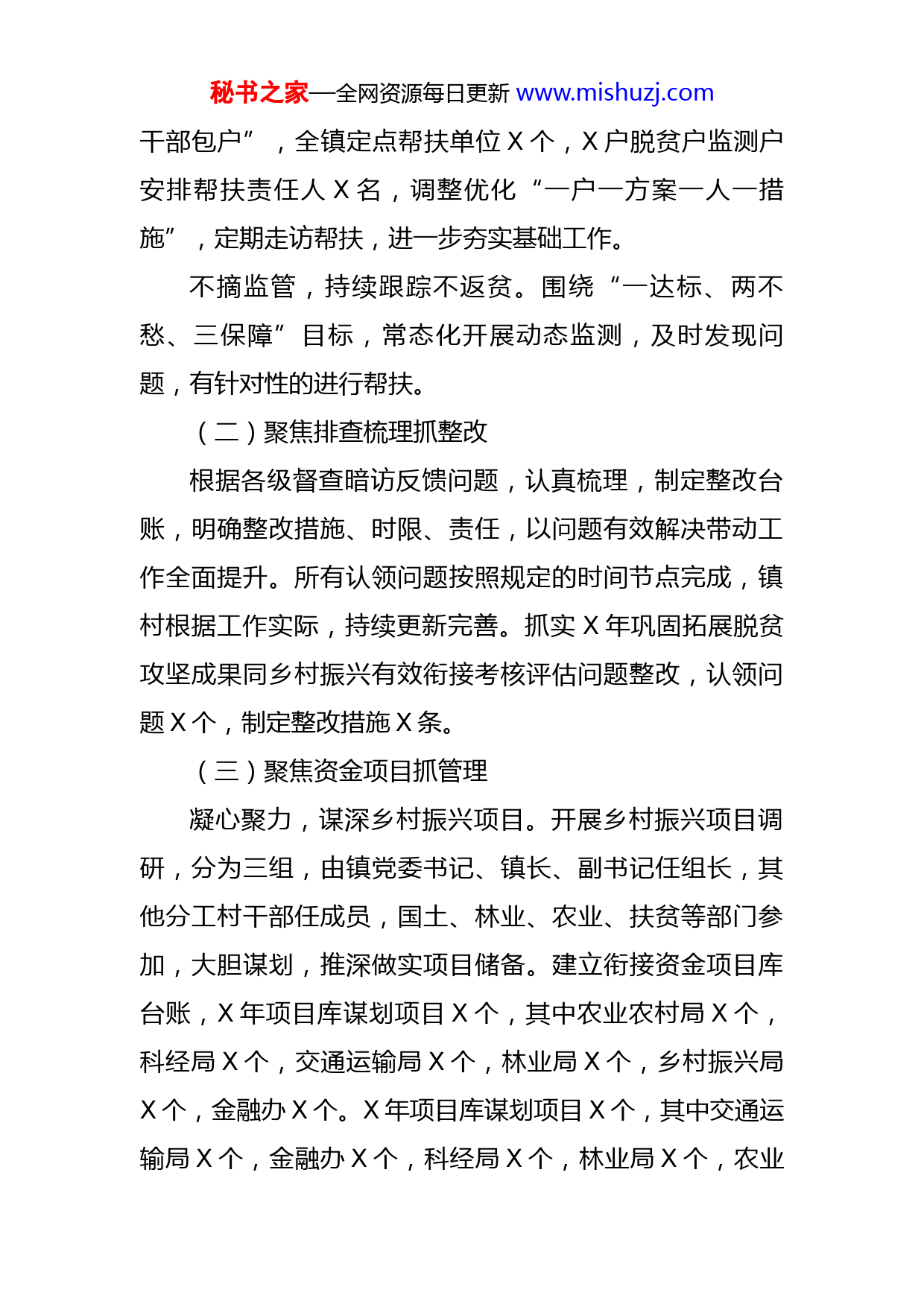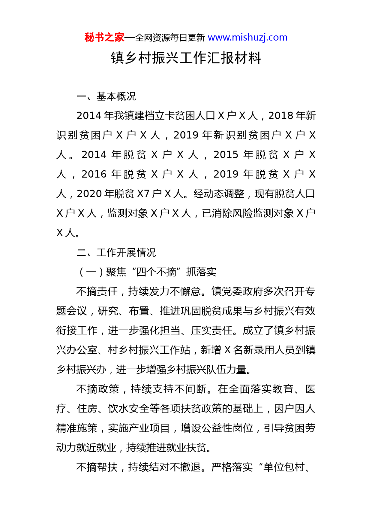 秘书之家—全网资源每日更新www.mishuzj.com镇乡村振兴工作汇报材料一、基本概况2014年我镇建档立卡贫困人口X户X人,2018年新识别贫困户X户X人,2019年新识别贫困户X户X人。2014年脱贫X户X人,2015年脱贫X户X人,2016年脱贫X户X人,2019年脱贫X户X人,2020年脱贫X7户X人。经动态调整,现有脱贫人口X户X人,监测对象X户X人,已消除风险监测对象X户X人。二、工作开展情况(一)聚焦“四个不摘”抓落实不摘责任,持续发力不懈怠。镇党委政府多次召开专题会议,研究、布置、推进巩固脱贫成果与乡村振兴有效衔接工作,进一步强化担当、压实责任。成立了镇乡村振兴办公室、村乡村振兴工作站,新增X名新录用人员到镇乡村振兴办,进一步增强乡村振兴队伍力量。不摘政策,持续支持不间断。在全面落实教育、医疗、住房、饮水安全等各项扶贫政策的基础上,因户因人精准施策,实施产业项目,增设公益性岗位,引导贫困劳动力就近就业,持续推进就业扶贫。不摘帮扶,持续结对不撤退。严格落实“单位包村、秘书之家—全网资源每日更新www.mishuzj.com干部包户”,全镇定点帮扶单位X个,X户脱贫户监测户安排帮扶责任人X名,调整优化“一户一方案一人一措施”,定期走访帮扶,进一步夯实基础工作。不摘监管,持续跟踪不返贫。围绕“一达标、两不愁、三保障”目标,常态化开展动态监测,及时发现问题,有针对性的进行帮扶。(二)聚焦排查梳理抓整改根据各级督查暗访反馈问题,认真梳理,制定整改台账,明确整改措施、时限、责任,以问题有效解决带动工作全面提升。所有认领问题按照规定的时间节点完成,镇村根据工作实际,持续更新完善。抓实X年巩固拓展脱贫攻坚成果同乡村振兴有效衔接考核评估问题整改,认领问题X个,制定整改措施X条。(三)聚焦资金项目抓管理凝心聚力,谋深乡村振兴项目。开展乡村振兴项目调研,分为三组,由镇党委书记、镇长、副书记任组长,其他分工村干部任成员,国土、林业、农业、扶贫等部门参加,大胆谋划,推深做实项目储备。建立衔接资金项目库台账,X年项目库谋划项目X个,其中农业农村局X个,科经局X个,交通运输局X个,林业局X个,乡村振兴局X个,金融办X个。X年项目库谋划项目X个,其中交通运输局X个,金融办X个,科经局X个,林业局X个,农业秘书之家—全网资源每日更新www.mishuzj.com农村局X个,卫健委X个,水利局X个,乡村振兴局X个,生态环境分局X个、文体旅游局X个,自然资源与规划局X个。强化对接,加快项目推进。X年衔接资金项目X个,中央第一批项目-山明葫芦嘴生态观光采摘园,已完工,拨付资金X万元。长枫村和民畈村美丽乡村增补工程已开工。郑圩村卫生室标准化建设已开工。龙山村农村生活污水治理项目已开工。X年衔接资金项目X个,其中交通运输局项目X个,农业农村局项目X个。道路项目已全部完工,资金拨付X万元。唐兴村特色农家乐建设项目,已完工,拨付资金X万元。民畈村中心村基础设施建设已完工,拨付资金X万元。改厕和改厕整改已完工。资产清查,注重后续管理。X年X月,对全镇X年度形成的扶贫资产开展清查工作,及时公告公示扶贫资产运营、收益分配、处置等情况,落实了管护责任,确保扶贫资产持续发挥效益。X-X年扶贫资产共计X个,资产净值共计为X万元,其中公益性资产X个X万元,经营性资产X个X万元,到户类资产X个X万元。收益分配,发挥资产效益。全镇X个经营性资产-双港镇金谷源家庭农场稻渔综合种养生态农业开发项目、白果村生态种养殖产业化项目、福桥村粮食烘干设备、双铺村粮食烘干车间、福桥村粮食烘干车间,按程序制定收益分秘书之家—全网资源每日更新www.mishuzj.com配方案,收益主要用于项目运行管护、村级公益事业和劳务补助以及特困群众救助。(四)聚焦防贫监测抓排查突出重点,扎实开展排查。聚焦重点环节、重点工作、监测对象动态管理、分类帮扶和精准施策,突出重点人群,开展拉网式大排查。调整优化网格员队伍,建立网格组X个,选派网格长X名,网格员X名,其中镇级网格X个,村级网格X个,村组网格X个,排查农户X户X人,排查问题X个。严格标准,持续监测帮扶。准确把握监测范围,坚持工作标准和认定消除程序,逐户逐人审核排查对象,全面了解收入支出状况、“三保障一安全”及分户子女家庭情况,综合判断是否存在或消除致贫返贫风险。X年确定监测对象X户X人,X年纳入监测对象X户X人。(五)聚焦接续政策抓落地协同配合,全面落实小额信贷。我镇小额信贷“三合”模式涉及X户贫困户X万元,经营主体X家。与经营主体、开户银行和村级协同配合,全年投资收益X元,已全部打卡发放到位。X年小额信贷投放X户X万元,其中户贷户用X户X万元(展期X户X万元,新增X户X万元),三合X户X万元(展期X户X万元,新增X户X万元),半年收益X元已打卡发放。秘书之家—全网资源每日更新www.mishuzj.com宣传发动,做实做细到户项目。大力实施“四带一自”,对全镇所有建档立卡贫困户开展摸排,鼓励引导有条件、有劳动能力、有发展意愿的贫困户发展特色种养业,同时积极鼓励农业经营主体带动贫困户增收。X年全镇实施到户项目X个,补贴X户脱贫户X万元,补贴X个经营主体X万元。逐人审核,狠抓智力扶贫。全面摸排,掌握中高职学生在籍在校情况,逐人审核学籍证明,保证申报“雨露计划”项目扶持对象无漏报、无错报,全镇春季雨露计划资助X名学生X万元,秋