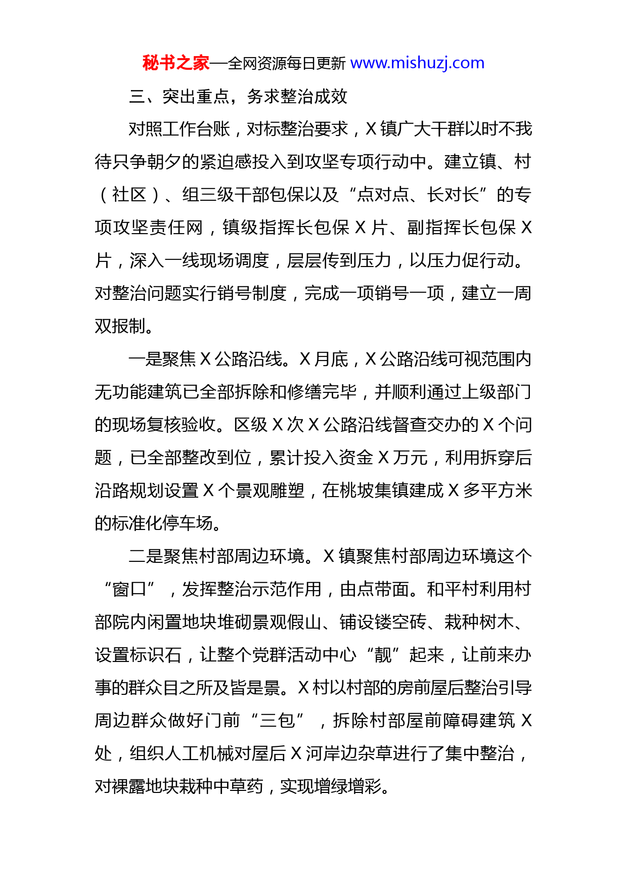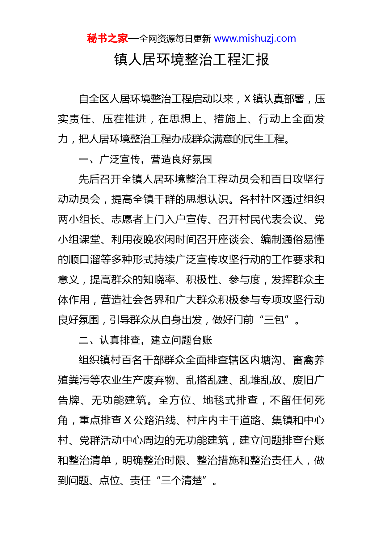 秘书之家—全网资源每日更新www.mishuzj.com镇人居环境整治工程汇报自全区人居环境整治工程启动以来,X镇认真部署,压实责任、压茬推进,在思想上、措施上、行动上全面发力,把人居环境整治工程办成群众满意的民生工程。一、广泛宣传,营造良好氛围先后召开全镇人居环境整治工程动员会和百日攻坚行动动员会,提高全镇干群的思想认识。各村社区通过组织两小组长、志愿者上门入户宣传、召开村民代表会议、党小组课堂、利用夜晚农闲时间召开座谈会、编制通俗易懂的顺口溜等多种形式持续广泛宣传攻坚行动的工作要求和意义,提高群众的知晓率、积极性、参与度,发挥群众主体作用,营造社会各界和广大群众积极参与专项攻坚行动良好氛围,引导群众从自身出发,做好门前“三包”。二、认真排查,建立问题台账组织镇村百名干部群众全面排查辖区内塘沟、畜禽养殖粪污等农业生产废弃物、乱搭乱建、乱堆乱放、废旧广告牌、无功能建筑。全方位、地毯式排查,不留任何死角,重点排查X公路沿线、村庄内主干道路、集镇和中心村、党群活动中心周边的无功能建筑,建立问题排查台账和整治清单,明确整治时限、整治措施和整治责任人,做到问题、点位、责任“三个清楚”。秘书之家—全网资源每日更新www.mishuzj.com三、突出重点,务求整治成效对照工作台账,对标整治要求,X镇广大干群以时不我待只争朝夕的紧迫感投入到攻坚专项行动中。建立镇、村(社区)、组三级干部包保以及“点对点、长对长”的专项攻坚责任网,镇级指挥长包保X片、副指挥长包保X片,深入一线现场调度,层层传到压力,以压力促行动。对整治问题实行销号制度,完成一项销号一项,建立一周双报制。一是聚焦X公路沿线。X月底,X公路沿线可视范围内无功能建筑已全部拆除和修缮完毕,并顺利通过上级部门的现场复核验收。区级X次X公路沿线督查交办的X个问题,已全部整改到位,累计投入资金X万元,利用拆穿后沿路规划设置X个景观雕塑,在桃坡集镇建成X多平方米的标准化停车场。二是聚焦村部周边环境。X镇聚焦村部周边环境这个“窗口”,发挥整治示范作用,由点带面。和平村利用村部院内闲置地块堆砌景观假山、铺设镂空砖、栽种树木、设置标识石,让整个党群活动中心“靓”起来,让前来办事的群众目之所及皆是景。X村以村部的房前屋后整治引导周边群众做好门前“三包”,拆除村部屋前障碍建筑X处,组织人工机械对屋后X河岸边杂草进行了集中整治,对裸露地块栽种中草药,实现增绿增彩。秘书之家—全网资源每日更新www.mishuzj.com三是聚焦整村推进点。X、X、X、X作为整村推进的试点村,按照三个抓手(三大革命、美丽乡村、文明创建)、一个重点(五清一改)的工作思路,整合项目资金、统筹推进,补基础设施短板、强基本公共服务,乡村美丽,乡愁浓郁,乡村韵味渐趋呈现。X村累计投入资金X万元建设X乡村大舞台,改善乡村文化设施;大型LED显示屏X个,改造村部广场绿化带,设置电瓶车停车位,增强了党群活动中心服务功能;新建“五小园”X个,停车场X个。X村一期工程已挂网招标,旅游公厕正在施工;X继续巩固美丽乡村成效,紧抓“五清一改”契机,建成“五小园”X个,旅游公厕X间;X一期美丽乡村工程建设已完工。截止目前,全镇X各行政村,累计投入资金X万元。清理沟塘、污水坑、臭水体X个,清理农业废弃物X吨(无害化处理木耳棒X万棒),清理乱堆乱放户数X户,清理废旧广告牌X个,清理无功能建筑面积X平方米,完成改厕X户。四、完善机制,确保整治长效一是建机制,首先是建队伍,解决谁来管理落实的问题。在前段时间的人居环境整治工程中,我们充分发挥了“党员干部、两小组长、乡贤理事”队伍在拆除动员、矛盾调解的引导示范作用,大大提升了我们工作的战斗力。在以后人居环境日常监管中,我们仍然聚焦这三支队伍建秘书之家—全网资源每日更新www.mishuzj.com设,让他们全程参与到我们的人居环境建设中。二是建立巡查制度,对完成整治情况的实行每周一巡查,每月一督查,每月一通报。加强“五清一改”攻坚工作考核,及时通报考核结果,对完成好的村社区和个人给予表彰奖励,对工作不力、责任不落实、问题整治进展缓慢的,在全镇范围内进行通报。三是建立评比制度,把群众文明素养、环境与健康意识纳入到最美庭院、最美母亲、最美婆婆、最美媳妇考核评比中去,引导群众讲文明、讲卫生,自觉改变影响人居环境的不良习惯。四是建立举报制度,通过设立举报电话和意见箱,发挥好群众的监督作用,建立和完善解决群众反映突出问题的长效机制,从而达到标本兼治。