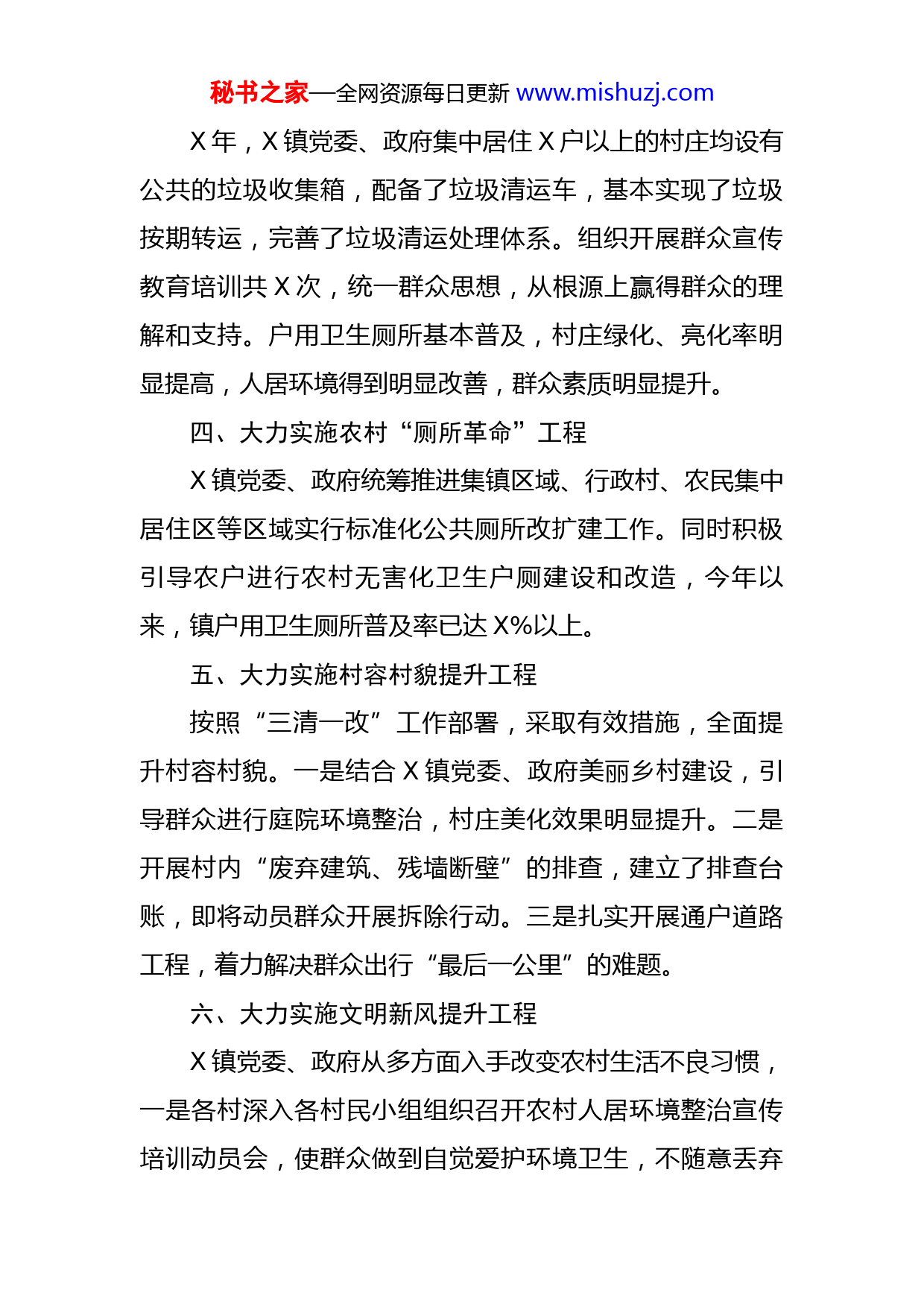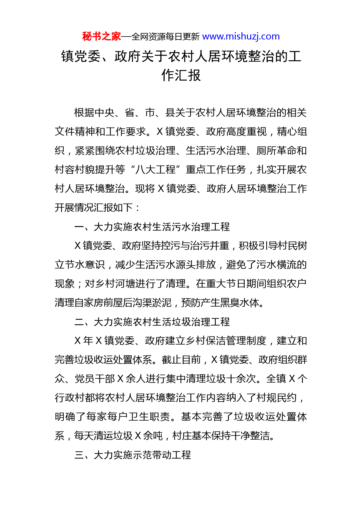 秘书之家—全网资源每日更新www.mishuzj.com镇党委、政府关于农村人居环境整治的工作汇报根据中央、省、市、县关于农村人居环境整治的相关文件精神和工作要求。X镇党委、政府高度重视,精心组织,紧紧围绕农村垃圾治理、生活污水治理、厕所革命和村容村貌提升等“八大工程”重点工作任务,扎实开展农村人居环境整治。现将X镇党委、政府人居环境整治工作开展情况汇报如下:一、大力实施农村生活污水治理工程X镇党委、政府坚持控污与治污并重,积极引导村民树立节水意识,减少生活污水源头排放,避免了污水横流的现象;对乡村河塘进行了清理。在重大节日期间组织农户清理自家房前屋后沟渠淤泥,预防产生黑臭水体。二、大力实施农村生活垃圾治理工程X年X镇党委、政府建立乡村保洁管理制度,建立和完善垃圾收运处置体系。截止目前,X镇党委、政府组织群众、党员干部X余人进行集中清理垃圾十余次。全镇X个行政村都将农村人居环境整治工作内容纳入了村规民约,明确了每家每户卫生职责。基本完善了垃圾收运处置体系,每天清运垃圾X余吨,村庄基本保持干净整洁。三、大力实施示范带动工程秘书之家—全网资源每日更新www.mishuzj.comX年,X镇党委、政府集中居住X户以上的村庄均设有公共的垃圾收集箱,配备了垃圾清运车,基本实现了垃圾按期转运,完善了垃圾清运处理体系。组织开展群众宣传教育培训共X次,统一群众思想,从根源上赢得群众的理解和支持。户用卫生厕所基本普及,村庄绿化、亮化率明显提高,人居环境得到明显改善,群众素质明显提升。四、大力实施农村“厕所革命”工程X镇党委、政府统筹推进集镇区域、行政村、农民集中居住区等区域实行标准化公共厕所改扩建工作。同时积极引导农户进行农村无害化卫生户厕建设和改造,今年以来,镇户用卫生厕所普及率已达X%以上。五、大力实施村容村貌提升工程按照“三清一改”工作部署,采取有效措施,全面提升村容村貌。一是结合X镇党委、政府美丽乡村建设,引导群众进行庭院环境整治,村庄美化效果明显提升。二是开展村内“废弃建筑、残墙断壁”的排查,建立了排查台账,即将动员群众开展拆除行动。三是扎实开展通户道路工程,着力解决群众出行“最后一公里”的难题。六、大力实施文明新风提升工程X镇党委、政府从多方面入手改变农村生活不良习惯,一是各村深入各村民小组组织召开农村人居环境整治宣传培训动员会,使群众做到自觉爱护环境卫生,不随意丢弃秘书之家—全网资源每日更新www.mishuzj.com垃圾。二是提倡新事新办,摒弃乱办酒席、赌博、乱扔乱丢、随地吐痰等不文明、不卫生生活习惯,组织参与有意义的健康活动,使优美的生活环境、文明的生活方式成为农民内在需求。三是在春节、“五一”劳动节等重大节日期间,每个村都组织党员干部、群众全面清理村内卫生,激发群众人居环境整治内生动力。七、大力实施建管机制创新工程全镇X个行政村都将人居环境整治内容纳入了村规民约,引导村民参与人居环境整治,约束村民规范自身行为,基本形成了“村民议村民定、村民建村民管”的人居环境整治齐抓共管新格局。积极引导群众参与村庄环境卫生清洁整治、农村户用厕所改造、村庄绿化、美化、亮化等建设和管护。中共X县X镇委员会X县X镇人民政府2022年X月X日