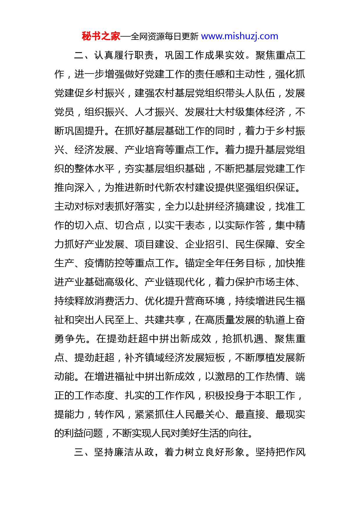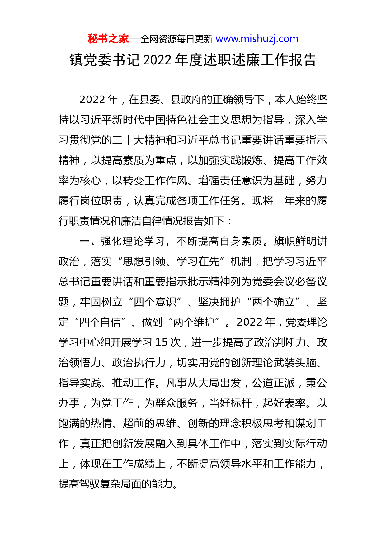秘书之家—全网资源每日更新www.mishuzj.com镇党委书记2022年度述职述廉工作报告2022年,在县委、县政府的正确领导下,本人始终坚持以习近平新时代中国特色社会主义思想为指导,深入学习贯彻党的二十大精神和习近平总书记重要讲话重要指示精神,以提高素质为重点,以加强实践锻炼、提高工作效率为核心,以转变工作作风、增强责任意识为基础,努力履行岗位职责,认真完成各项工作任务。现将一年来的履行职责情况和廉洁自律情况报告如下:一、强化理论学习,不断提高自身素质。旗帜鲜明讲政治,落实“思想引领、学习在先”机制,把学习习近平总书记重要讲话和重要指示批示精神列为党委会议必备议题,牢固树立“四个意识”、坚决拥护“两个确立”、坚定“四个自信”、做到“两个维护”。2022年,党委理论学习中心组开展学习15次,进一步提高了政治判断力、政治领悟力、政治执行力,切实用党的创新理论武装头脑、指导实践、推动工作。凡事从大局出发,公道正派,秉公办事,为党工作,为群众服务,当好标杆,起好表率。以饱满的热情、超前的思维、创新的理念积极思考和谋划工作,真正把创新发展融入到具体工作中,落实到实际行动上,体现在工作成绩上,不断提高领导水平和工作能力,提高驾驭复杂局面的能力。秘书之家—全网资源每日更新www.mishuzj.com二、认真履行职责,巩固工作成果实效。聚焦重点工作,进一步增强做好党建工作的责任感和主动性,强化抓党建促乡村振兴,建强农村基层党组织带头人队伍,发展党员,组织振兴、人才振兴、发展壮大村级集体经济,不断巩固提升。在抓好基层基础工作的同时,着力于乡村振兴、经济发展、产业培育等重点工作。着力提升基层党组织的整体水平,夯实基层组织基础,不断把基层党建工作推向深入,为推进新时代新农村建设提供坚强组织保证。主动对标对表抓好落实,全力以赴拼经济搞建设,找准工作的切入点、切合点,以实干表态,以实际作答,集中精力抓好产业发展、项目建设、企业招引、民生保障、安全生产、疫情防控等重点工作。锚定全年任务目标,加快推进产业基础高级化、产业链现代化,着力保护市场主体、持续释放消费活力、优化提升营商环境,持续增进民生福祉和突出人民至上、共建共享,在高质量发展的轨道上奋勇争先。在提劲赶超中拼出新成效,抢抓机遇、聚焦重点、提劲赶超,补齐镇域经济发展短板,不断厚植发展新动能。在增进福祉中拼出新成效,以激昂的工作热情、端正的工作态度、扎实的工作作风,积极投身于本职工作,提能力,转作风,紧紧抓住人民最关心、最直接、最现实的利益问题,不断实现人民对美好生活的向往。三、坚持廉洁从政,着力树立良好形象。坚持把作风秘书之家—全网资源每日更新www.mishuzj.com转变作为XX镇党风廉政建设的切入点,进一步明晰了镇机关的组织架构,明确部门职能职责,从机制上根除了庸懒散、浮拖软的产生,激发了干部职工工作激情,全面提升了行政效能。坚持以身作则、率先垂范,带头严格遵守领导干部廉洁从政各项规定,带头严格执行中央八项规定及其实施细则精神。如实报告个人重大事项,注重培育家风家教,清白做人、干净干事。加强全镇党员干部的纪律宣传教育,增强对党纪的敬畏感,做到令行禁止,不违纪、不逾矩,结合“提士气、抓落实、见成效”作风整顿活动,使守纪律、讲规矩成为自觉行为,使广大党员干部坚决不触政治纪律的“高压线”。在肯定成绩的同时,我也看到自身发展中仍存在不少困难和问题。主要表现在本人理论学习不够,工作之余,应酬占了很多时间;在工作统筹上不能兼顾,注重党务建设、经济发展、矛盾化解的多,关注其它工作的少。在面对风险挑战中,忧患意识、风险意识不足。在分析问题、解决问题能力上与组织要求存在差距。成绩属于过去,2023年要做到压实责任,一以贯之促引领;追赶超越,一心一意求突破;提振信心,一鼓作气谋发展;持之以恒,一抓到底正风纪。以饱满的工作热情和扎实的工作作风,不折不扣贯彻落实县委、县政府关于我镇发展的工作部署,再接再厉、勇攀高峰,把工作做秘书之家—全网资源每日更新www.mishuzj.com细、做深、做实,努力为XX镇的经济社会发展作出自己应有的贡献。