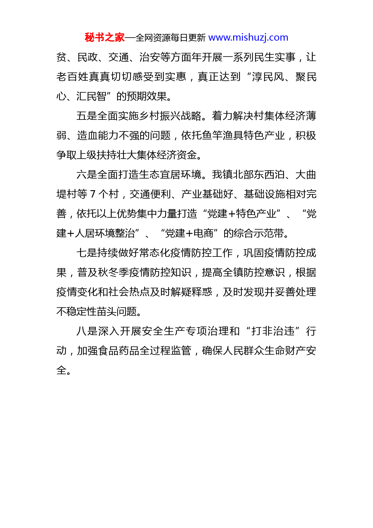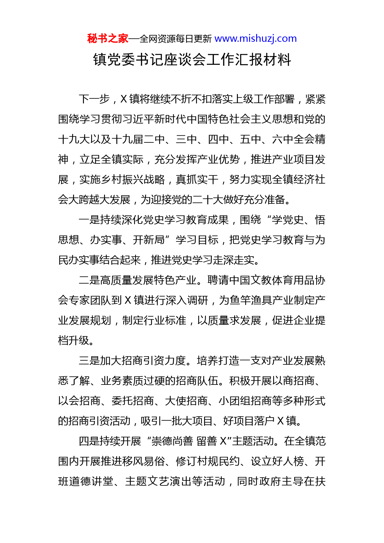 秘书之家—全网资源每日更新www.mishuzj.com镇党委书记座谈会工作汇报材料下一步,X镇将继续不折不扣落实上级工作部署,紧紧围绕学习贯彻习近平新时代中国特色社会主义思想和党的十九大以及十九届二中、三中、四中、五中、六中全会精神,立足全镇实际,充分发挥产业优势,推进产业项目发展,实施乡村振兴战略,真抓实干,努力实现全镇经济社会大跨越大发展,为迎接党的二十大做好充分准备。一是持续深化党史学习教育成果,围绕“学党史、悟思想、办实事、开新局”学习目标,把党史学习教育与为民办实事结合起来,推进党史学习走深走实。二是高质量发展特色产业。聘请中国文教体育用品协会专家团队到X镇进行深入调研,为鱼竿渔具产业制定产业发展规划,制定行业标准,以质量求发展,促进企业提档升级。三是加大招商引资力度。培养打造一支对产业发展熟悉了解、业务素质过硬的招商队伍。积极开展以商招商、以会招商、委托招商、大使招商、小团组招商等多种形式的招商引资活动,吸引一批大项目、好项目落户X镇。四是持续开展“崇德尚善留善X”主题活动。在全镇范围内开展推进移风易俗、修订村规民约、设立好人榜、开班道德讲堂、主题文艺演出等活动,同时政府主导在扶秘书之家—全网资源每日更新www.mishuzj.com贫、民政、交通、治安等方面年开展一系列民生实事,让老百姓真真切切感受到实惠,真正达到“淳民风、聚民心、汇民智”的预期效果。五是全面实施乡村振兴战略。着力解决村集体经济薄弱、造血能力不强的问题,依托鱼竿渔具特色产业,积极争取上级扶持壮大集体经济资金。六是全面打造生态宜居环境。我镇北部东西泊、大曲堤村等7个村,交通便利、产业基础好、基础设施相对完善,依托以上优势集中力量打造“党建+特色产业”、“党建+人居环境整治”、“党建+电商”的综合示范带。七是持续做好常态化疫情防控工作,巩固疫情防控成果,普及秋冬季疫情防控知识,提高全镇防控意识,根据疫情变化和社会热点及时解疑释惑,及时发现并妥善处理不稳定性苗头问题。八是深入开展安全生产专项治理和“打非治违”行动,加强食品药品全过程监管,确保人民群众生命财产安全。