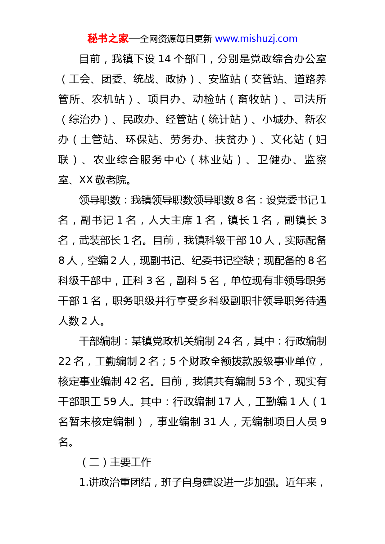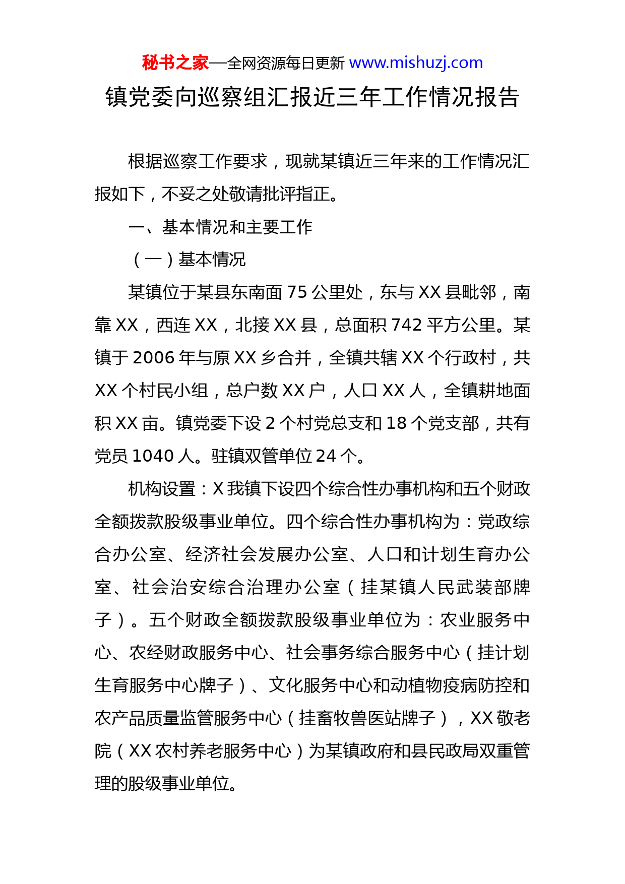 秘书之家—全网资源每日更新www.mishuzj.com镇党委向巡察组汇报近三年工作情况报告根据巡察工作要求,现就某镇近三年来的工作情况汇报如下,不妥之处敬请批评指正。一、基本情况和主要工作(一)基本情况某镇位于某县东南面75公里处,东与XX县毗邻,南靠XX,西连XX,北接XX县,总面积742平方公里。某镇于2006年与原XX乡合并,全镇共辖XX个行政村,共XX个村民小组,总户数XX户,人口XX人,全镇耕地面积XX亩。镇党委下设2个村党总支和18个党支部,共有党员1040人。驻镇双管单位24个。机构设置:X我镇下设四个综合性办事机构和五个财政全额拨款股级事业单位。四个综合性办事机构为:党政综合办公室、经济社会发展办公室、人口和计划生育办公室、社会治安综合治理办公室(挂某镇人民武装部牌子)。五个财政全额拨款股级事业单位为:农业服务中心、农经财政服务中心、社会事务综合服务中心(挂计划生育服务中心牌子)、文化服务中心和动植物疫病防控和农产品质量监管服务中心(挂畜牧兽医站牌子),XX敬老院(XX农村养老服务中心)为某镇政府和县民政局双重管理的股级事业单位。秘书之家—全网资源每日更新www.mishuzj.com目前,我镇下设14个部门,分别是党政综合办公室(工会、团委、统战、政协)、安监站(交管站、道路养管所、农机站)、项目办、动检站(畜牧站)、司法所(综治办)、民政办、经管站(统计站)、小城办、新农办(土管站、环保站、劳务办、扶贫办)、文化站(妇联)、农业综合服务中心(林业站)、卫健办、监察室、XX敬老院。领导职数:我镇领导职数领导职数8名:设党委书记1名,副书记1名,人大主席1名,镇长1名,副镇长3名,武装部长1名。目前,我镇科级干部10人,实际配备8人,空编2人,现副书记、纪委书记空缺;现配备的8名科级干部中,正科3名,副科5名,单位现有非领导职务干部1名,职务职级并行享受乡科级副职非领导职务待遇人数2人。干部编制:某镇党政机关编制24名,其中:行政编制22名,工勤编制2名;5个财政全额拨款股级事业单位,核定事业编制42名。目前,我镇共有编制53个,现实有干部职工59人。其中:行政编制17人,工勤编1人(1名暂未核定编制),事业编制31人,无编制项目人员9名。(二)主要工作1.讲政治重团结,班子自身建设进一步加强。近年来,秘书之家—全网资源每日更新www.mishuzj.com镇党委始终把思想政治建设作为班子建设的首要任务,充分发挥统揽全局、协调各方的领导核心作用,凝聚了加快发展的强大合力。一是抓学习强素质。认真落实党委中心组学习制度,坚持每月集中学习1次,认真学习了《党章》、党的十九大、十九届一中、二中、三中全会精神和习近平新时代中国特色社会主义思想、习近平总书记视察甘肃“八个着力”重要指示和中央及省市委的各类会议精神等重点内容,并开展研讨学习,进一步提高了班子成员工作能力和水平,为科学决策和民主决策奠定了坚实基础。二是守纪律讲规矩。班子成员严格落实“五个必须”、“五个决不允许”、“六大纪律”等要求,始终坚持重大事项及时请示汇报,如实填报领导干部有关事项报告表和家庭社会关系登记表。省市县重要会议召开后,镇党委都能及时进行传达学习,切实提高了领导干部的政治鉴别力和工作水平,确保了中央及省市县委的各项决策部署全面贯彻落实,党员干部“四个意识”更加牢固,“四个自信”更加坚定,“两个维护”更加坚决。三是抓民主促和谐。严格落实党委集体领导下的分工负责制,不断完善党委会议议事规则,认真执行“三重一大”、“三不一末”等制度,坚持集体领导、民主集中、个别酝酿、会议决定,坚决做到不定调子,不压制发言堵言路,不强制拍板作决定,在充分发扬民主的基础上,对重大问题坚决做秘书之家—全网资源每日更新www.mishuzj.com到有主见而不主观,能果断而不武断。三年来,共召开党委会37次,领导办公会65次,促进了决策的科学化、民主化,班子内部形成了良好的民主协商氛围。2.抓作风强问责,党风廉政建设深入推进。认真贯彻党要管党、从严治党的要求,切实履行好党委主体责任和纪委监督责任,坚定不移推进党风廉政建设和反腐败工作,为全镇经济社会各项事业发展提供了坚强保证。一是全面落实党风廉政主体责任。按照“3873”党风廉政建设责任体系,及时成立了党风廉政建设领导小组,分年度制定《党风廉政建设工作安排意见》,层层签订党风廉政建设责任书,把党风廉政建设工作纳入了班子和领导干部目标管理。坚持把贯彻落实党风廉政建设工作与镇党委中心工作同安排、同部署、同考核、同落实,随时对责任不落实、落实不到位的党员干部采取诫勉谈话、组织处理等措施进行责任追究等工作机制,督促各级落实主体责任,形成了党委主要领导负总责、分管领导具体负责、党委委员结合分管工作齐抓共管的责任体系。二是强化风险防控措施。坚持以贯彻学习《准则》、《条例》为契机,积极开展党风廉政经常性宣传教育,把《党章》、《廉政准则》、《党风廉政建设责任制》、《监察法》及中央和省市重大会议精神和作风建设各项规定作为主要内容反复学习,党政班子成员人均记写廉政周志2万字以上,撰写心秘书之家—全网资源每日更新www.mishuzj.com得体会4篇。每年组织镇村组党员干部赴廉政教育基地、看守所等地参观学习,使党员干部在潜移默化