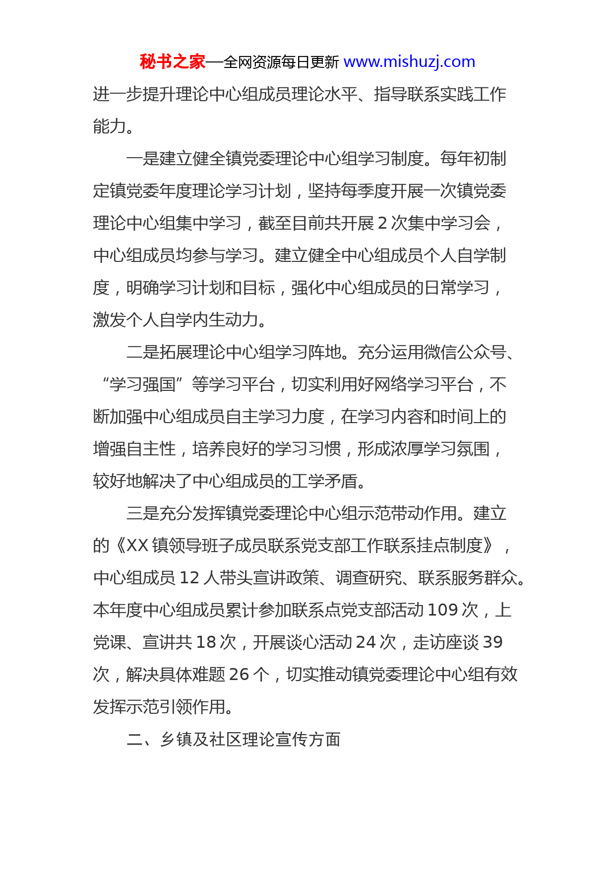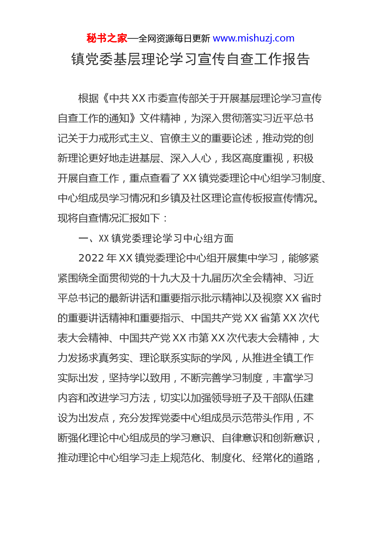 秘书之家—全网资源每日更新www.mishuzj.com镇党委基层理论学习宣传自查工作报告根据《中共XX市委宣传部关于开展基层理论学习宣传自查工作的通知》文件精神,为深入贯彻落实习近平总书记关于力戒形式主义、官僚主义的重要论述,推动党的创新理论更好地走进基层、深入人心,我区高度重视,积极开展自查工作,重点查看了XX镇党委理论中心组学习制度、中心组成员学习情况和乡镇及社区理论宣传板报宣传情况。现将自查情况汇报如下:一、XX镇党委理论学习中心组方面2022年XX镇党委理论中心组开展集中学习,能够紧紧围绕全面贯彻党的十九大及十九届历次全会精神、习近平总书记的最新讲话和重要指示批示精神以及视察XX省时的重要讲话精神和重要指示、中国共产党XX省第XX次代表大会精神、中国共产党XX市第XX次代表大会精神,大力发扬求真务实、理论联系实际的学风,从推进全镇工作实际出发,坚持学以致用,不断完善学习制度,丰富学习内容和改进学习方法,切实以加强领导班子及干部队伍建设为出发点,充分发挥党委中心组成员示范带头作用,不断强化理论中心组成员的学习意识、自律意识和创新意识,推动理论中心组学习走上规范化、制度化、经常化的道路,秘书之家—全网资源每日更新www.mishuzj.com进一步提升理论中心组成员理论水平、指导联系实践工作能力。一是建立健全镇党委理论中心组学习制度。每年初制定镇党委年度理论学习计划,坚持每季度开展一次镇党委理论中心组集中学习,截至目前共开展2次集中学习会,中心组成员均参与学习。建立健全中心组成员个人自学制度,明确学习计划和目标,强化中心组成员的日常学习,激发个人自学内生动力。二是拓展理论中心组学习阵地。充分运用微信公众号、“学习强国”等学习平台,切实利用好网络学习平台,不断加强中心组成员自主学习力度,在学习内容和时间上的增强自主性,培养良好的学习习惯,形成浓厚学习氛围,较好地解决了中心组成员的工学矛盾。三是充分发挥镇党委理论中心组示范带动作用。建立的《XX镇领导班子成员联系党支部工作联系挂点制度》,中心组成员12人带头宣讲政策、调查研究、联系服务群众。本年度中心组成员累计参加联系点党支部活动109次,上党课、宣讲共18次,开展谈心活动24次,走访座谈39次,解决具体难题26个,切实推动镇党委理论中心组有效发挥示范引领作用。二、乡镇及社区理论宣传方面秘书之家—全网资源每日更新www.mishuzj.com为了更好的发挥乡镇及社区理论宣传主阵地引领作用,确保宣传口径与党中央、XX省委和XX市委保持一致,确保阵地标准化建设走深走实,组织镇、社区两级积极开展理论宣传口径、提法、表述、排版等方面自查自纠工作,目前暂未发现理论宣传口径不一致、提法不正确、表述不精准、排版不合规等问题。三、存在问题(一)开展理论学习工作不够深入。个别中心组成员对理论学习不够重视,对相关政策、文件学习不到位,基础知识相对薄弱,缺乏自主学习意识,在自学方面学习不够深入。这一现象导致理论学习宣传工作停留在表面功夫,流于形式,没能悟深悟透不能够充分发挥领导班子带头学的作用。(二)社区理论学习工作有待加强。对社区的理论学习指导性不够,部分社区开展理论学习工作缺乏积极性,没能够发动群众参与到理论学习中来,理论学习氛围有待进一步提高。四、下一步工作计划(一)建立健全理论学习考核制度。把理论学习情况作为民主评议党员、综合考核评价领导班子和领导干部的重要内容,压实镇党委理论中心组示范带动责任,切实提高理论学习的积极性。秘书之家—全网资源每日更新www.mishuzj.com(二)持续抓好理论宣讲工作。根据《2022年XX区理论宣讲重点内容安排》精神,结合党的二十大召开之契机,组织开展系列理论宣讲活动,贯彻落实好党的理论创新成果和中央重大决策部署,营造良好的学习氛围。(三)持续强化理论学习宣传。按照XX市委的最新标准,持续开展理论宣传工作,确保做到真正打通宣传群众、教育群众、关心群众、服务群众的“最后一公里”,充分发挥好基层理论学习作用。