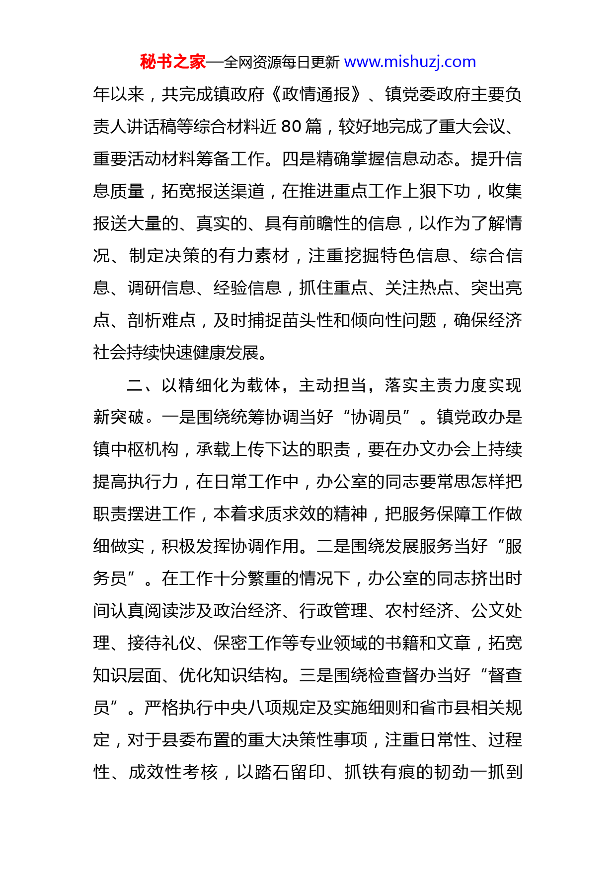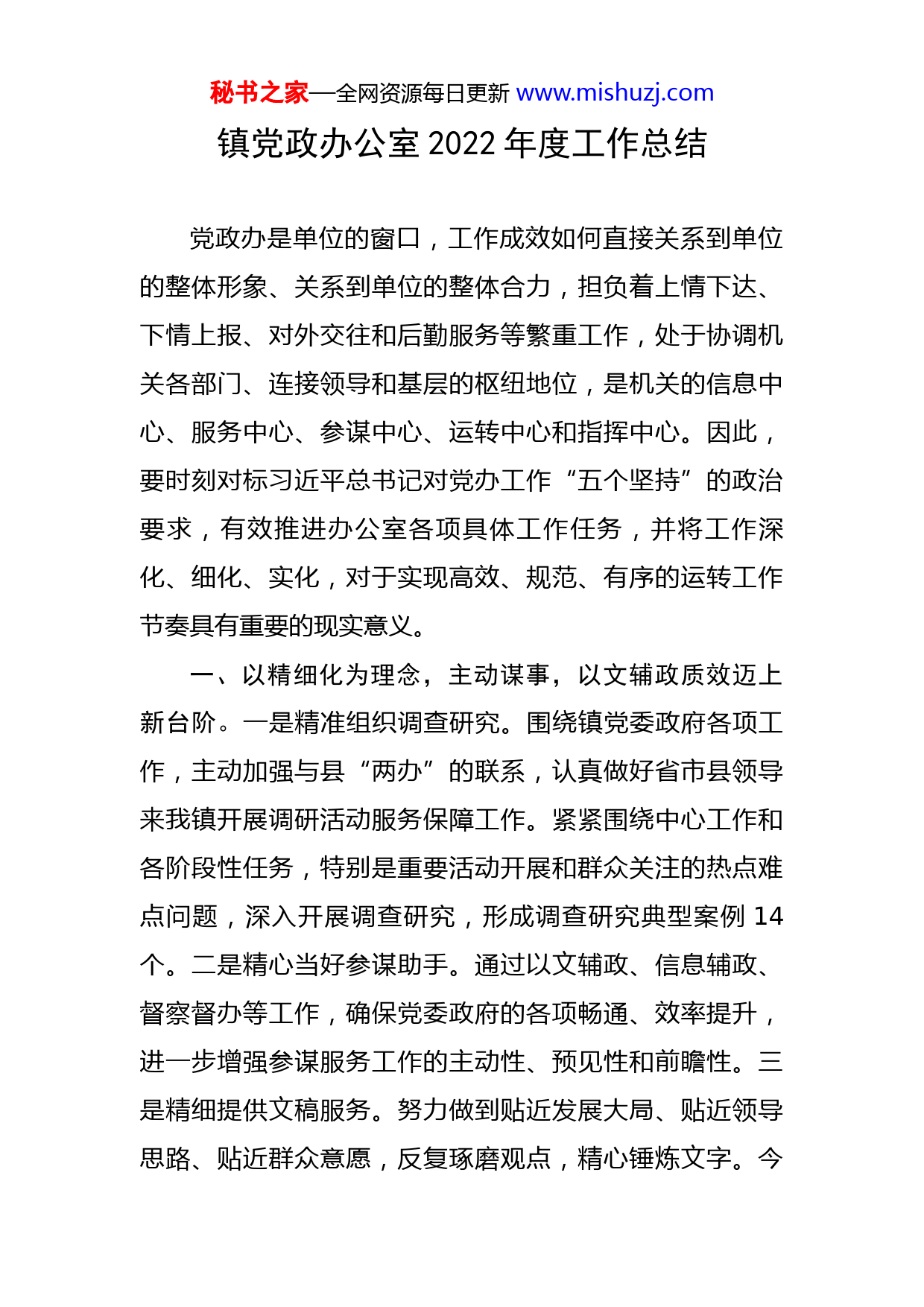 秘书之家—全网资源每日更新www.mishuzj.com镇党政办公室2022年度工作总结党政办是单位的窗口,工作成效如何直接关系到单位的整体形象、关系到单位的整体合力,担负着上情下达、下情上报、对外交往和后勤服务等繁重工作,处于协调机关各部门、连接领导和基层的枢纽地位,是机关的信息中心、服务中心、参谋中心、运转中心和指挥中心。因此,要时刻对标习近平总书记对党办工作“五个坚持”的政治要求,有效推进办公室各项具体工作任务,并将工作深化、细化、实化,对于实现高效、规范、有序的运转工作节奏具有重要的现实意义。一、以精细化为理念,主动谋事,以文辅政质效迈上新台阶。一是精准组织调查研究。围绕镇党委政府各项工作,主动加强与县“两办”的联系,认真做好省市县领导来我镇开展调研活动服务保障工作。紧紧围绕中心工作和各阶段性任务,特别是重要活动开展和群众关注的热点难点问题,深入开展调查研究,形成调查研究典型案例14个。二是精心当好参谋助手。通过以文辅政、信息辅政、督察督办等工作,确保党委政府的各项畅通、效率提升,进一步增强参谋服务工作的主动性、预见性和前瞻性。三是精细提供文稿服务。努力做到贴近发展大局、贴近领导思路、贴近群众意愿,反复琢磨观点,精心锤炼文字。今秘书之家—全网资源每日更新www.mishuzj.com年以来,共完成镇政府《政情通报》、镇党委政府主要负责人讲话稿等综合材料近80篇,较好地完成了重大会议、重要活动材料筹备工作。四是精确掌握信息动态。提升信息质量,拓宽报送渠道,在推进重点工作上狠下功,收集报送大量的、真实的、具有前瞻性的信息,以作为了解情况、制定决策的有力素材,注重挖掘特色信息、综合信息、调研信息、经验信息,抓住重点、关注热点、突出亮点、剖析难点,及时捕捉苗头性和倾向性问题,确保经济社会持续快速健康发展。二、以精细化为载体,主动担当,落实主责力度实现新突破。一是围绕统筹协调当好“协调员”。镇党政办是镇中枢机构,承载上传下达的职责,要在办文办会上持续提高执行力,在日常工作中,办公室的同志要常思怎样把职责摆进工作,本着求质求效的精神,把服务保障工作做细做实,积极发挥协调作用。二是围绕发展服务当好“服务员”。在工作十分繁重的情况下,办公室的同志挤出时间认真阅读涉及政治经济、行政管理、农村经济、公文处理、接待礼仪、保密工作等专业领域的书籍和文章,拓宽知识层面、优化知识结构。三是围绕检查督办当好“督查员”。严格执行中央八项规定及实施细则和省市县相关规定,对于县委布置的重大决策性事项,注重日常性、过程性、成效性考核,以踏石留印、抓铁有痕的韧劲一抓到秘书之家—全网资源每日更新www.mishuzj.com底,有效提升考评的成效。三、以精细化为标准,主动加压,办文办会质量展现新成效。一是文秘工作规范有序。我们在平时撰写和流通文秘材料时候,要求办公室的同志在公文的适用范围上,注重对相近文种的使用范围、使用对象加以区分,避免误选文种。在写作要点介绍上,注重介绍文种的基本格式,先写什么,再写什么,极具规范性和实用性。办公室要对发文文稿要认真审核,严格把好行文关、法规政策关、内容关、文字关、体例格式关,确保文稿质量。对不应报镇政府审批的公文、违反公文处理程序报送的公文以及不规范的公文等,严格执行退办制度。二是办会工作精细高效。办会是党政办同志的基本素养,会议主要是部署工作、研讨对策、总结经验、推广成果的重要载体。把会办好了,参会人员心情愉悦,受益匪浅,干劲十足;把会办砸了,台上台下满腹牢骚,情绪低落,贯彻无力。因此,办公室的同志要处处为与会者着想,在桌牌怎么摆、资料怎么放、吃住行怎么办等细节上,落实好人文关怀,让参会者感觉到温暖,切实把会议办得有温度。四、以精细化为文化,主动作为,服务保障水平呈现新风貌。本人着眼于“夯实基础、强化规范、提升水平、务求实效”的工作目标,紧紧围绕中心工作,紧扣发展主题,坚持发展是第一要务这个主题,奋力推进XX镇经济社秘书之家—全网资源每日更新www.mishuzj.com会高质量发展。深入开展创建“学习型、服务型、务实型、廉洁型”机关和“讲党性、重品行、作表率”等活动,增强机关党员身份意识和责任意识。党政办的同志,大多都是在领导身边,更要加强意识形态学习,理直气壮地讲好大道理、正道理、实道理,用科学的立场观点批驳各种错误观点和言论,及时澄清身边的各种模糊认识,做政治上的明白人。既要敢于斗争,又要善于斗争,要主动投身到各种斗争中去,在大是大非面前敢于亮剑,在矛盾冲突面前敢于迎难而上,在危机困难面前敢于挺身而出,在歪风邪气面前敢于坚决斗争。作为基层党员干部,我们也应发扬斗争精神增强斗争本领,为实现“两个一百年”奋斗目标而顽强奋斗,既要敢于斗争,又要善于斗争,用好斗争精神这一法宝,奋力走进新时代新征程。在今后的工作中,XX镇党政办公室将针对自身薄弱环节,虚心学习,强化措施,恪尽职守,努力推进工作再上新台阶,为我镇实现经济社会新跨越发展而不懈奋斗。