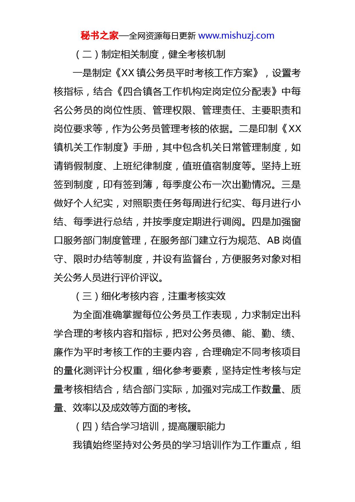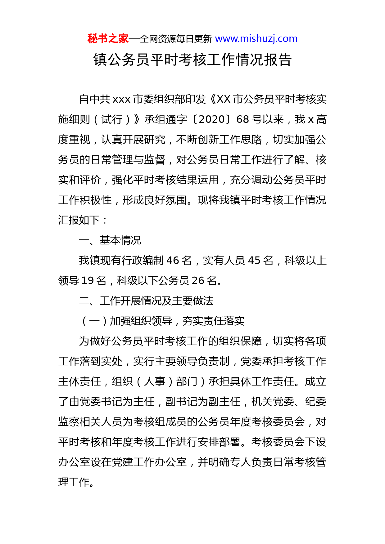 秘书之家—全网资源每日更新www.mishuzj.com镇公务员平时考核工作情况报告自中共xxx市委组织部印发《XX市公务员平时考核实施细则(试行)》承组通字〔2020〕68号以来,我x高度重视,认真开展研究,不断创新工作思路,切实加强公务员的日常管理与监督,对公务员日常工作进行了解、核实和评价,强化平时考核结果运用,充分调动公务员平时工作积极性,形成良好氛围。现将我镇平时考核工作情况汇报如下:一、基本情况我镇现有行政编制46名,实有人员45名,科级以上领导19名,科级以下公务员26名。二、工作开展情况及主要做法(一)加强组织领导,夯实责任落实为做好公务员平时考核工作的组织保障,切实将各项工作落到实处,实行主要领导负责制,党委承担考核工作主体责任,组织(人事)部门)承担具体工作责任。成立了由党委书记为主任,副书记为副主任,机关党委、纪委监察相关人员为考核组成员的公务员年度考核委员会,对平时考核和年度考核工作进行安排部署。考核委员会下设办公室设在党建工作办公室,并明确专人负责日常考核管理工作。秘书之家—全网资源每日更新www.mishuzj.com(二)制定相关制度,健全考核机制一是制定《XX镇公务员平时考核工作方案》,设置考核指标,结合《四合镇各工作机构定岗定位分配表》中每名公务员的岗位性质、管理权限、管理责任、主要职责和岗位要求等,作为公务员管理考核的依据。二是印制《XX镇机关工作制度》手册,其中包含机关日常管理制度,如请销假制度、上班纪律制度,值班值宿制度等。坚持上班签到制度,印有签到簿,每季度公布一次出勤情况。三是做好个人纪实,对照职责任务每周进行纪实、每月进行小结、每季进行总结,并按季度定期进行调阅。四是加强窗口服务部门制度管理,在服务部门建立行为规范、AB岗值守、限时办结等制度,并设有监督台,方便服务对象对相关公务人员进行评价评议。(三)细化考核内容,注重考核实效为全面准确掌握每位公务员工作表现,力求制定出科学合理的考核内容和指标,把对公务员德、能、勤、绩、廉作为平时考核工作的主要内容,合理确定不同考核项目的量化测评计分权重,细化参考要素,坚持定性考核与定量考核相结合,结合部门实际,加强对完成工作数量、质量、效率以及成效等方面的考核。(四)结合学习培训,提高履职能力我镇始终坚持对公务员的学习培训作为工作重点,组秘书之家—全网资源每日更新www.mishuzj.com织集中学习,深入学习贯彻习近平新时代中国特色社会主义思想、中央省市县文件精神,通过学习,不断加强作风建设、业务素质和履职能力。(五)强化结果运用,发挥平时考核作用公务员平时考核结果分为好、较好、一般和较差四个等次,通过平时考核,及时发现公务员在思想、能力和作风上存在的问题,督促被考核人弥补不足、改进工作。将平时考核结果与年度考核挂钩,对于平时工作懈怠,考核结果一般、较差的,年度考核不能确定优秀等次。并将平时考核结果运用与选拔任用、职务职级晋升、评优评先等环节紧密联系起来,真正做到对优秀者重用、对有潜力者培养、对落后者鞭策。三、存在的问题平时考核工作是公务员考核工作的重要基础,我镇在平时考核中做了一些工作,取得了一定效果,但还存在许多问题。一是平时考核力度不够,形式比较单一。虽然制定了相应的制度和管理办法,但在具体实施过程中还存在不够严格细致,监督检查不到位的情况。对平时考核工作存在标准不高、要求放松的问题。二是考核工作方式缺少创新,在考核制度量化上还要更加细致深化,使其更具有可操作性。四、下一步工作打算秘书之家—全网资源每日更新www.mishuzj.com一是进一步严格考核程序,规范运作,切实加强平时考核工作力度,及时如实检查通报考核情况。二是丰富平时考核方式,积极引入多种方式相结合的考评机制,区分不同类别、层级和职位特点,设置考核指标,将个人日常工作纪实、总结与季度考核结果、年度考核结果相结合,真正做到客观公正、精准科学。三是创新考核机制,提升考核工作水平,力求简单快捷,避免繁琐操作,实现平时考核工作的精准、便捷、高效。