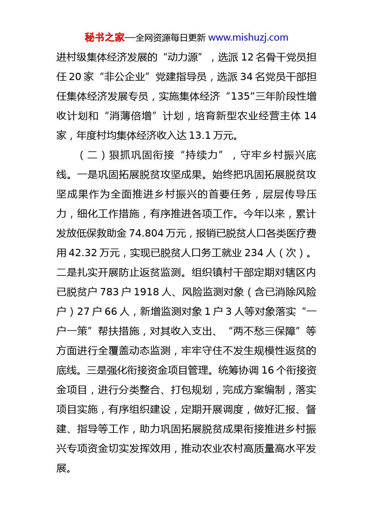 秘书之家—全网资源每日更新www.mishuzj.com镇关于乡村振兴的汇报材料:汇聚“六力”扎实推进乡村全面振兴近年来,XX镇认真学习贯彻习近平总书记关于“三农”工作的重要论述,全面贯彻落实中省决策部署和市区工作安排,围绕“产业兴旺、生态宜居、乡风文明、治理有效、生活富裕”总要求,统筹五大振兴,汇聚“凝聚力、持续力、保障力、聚合力、向心力、牵引力”六力,扎实推进乡村发展、乡村建设、乡村治理重点任务,持续促进农业稳产增产、农民稳步增收、农村稳定安宁,全面推进乡村振兴战略落地落实。一、工作成效(一)发挥党建引领“凝聚力”,打造乡村振兴堡垒。一是坚持高位谋划。加强镇党委对基层党组织建设指导力度,健全完善“党委书记领衔、班子成员领导、村社书记领办”制度,将党的政治优势、组织优势转化为发展优势,实现基层党务事项周调度、月部署、季谋划。二是提升组织功能。开展党支部标准化建设,全镇26个基层党组织落实“三会一课”、民主评议党员、组织生活会等政治生活制度全面规范。持续抓好软弱涣散党组织提档升级,向软弱涣散村铜锣村选派基层经验丰富的第一书记。三是壮大集体经济。坚持以“党建+产业”融合发展作为促秘书之家—全网资源每日更新www.mishuzj.com进村级集体经济发展的“动力源”,选派12名骨干党员担任20家“非公企业”党建指导员,选派34名党员干部担任集体经济发展专员,实施集体经济“135”三年阶段性增收计划和“消薄倍增”计划,培育新型农业经营主体14家,年度村均集体经济收入达13.1万元。(二)狠抓巩固衔接“持续力”,守牢乡村振兴底线。一是巩固拓展脱贫攻坚成果。始终把巩固拓展脱贫攻坚成果作为全面推进乡村振兴的首要任务,层层传导压力,细化工作措施,有序推进各项工作。今年以来,累计发放低保救助金74.804万元,报销已脱贫人口各类医疗费用42.32万元,实现已脱贫人口务工就业234人(次)。二是扎实开展防止返贫监测。组织镇村干部定期对辖区内已脱贫户783户1918人、风险监测对象(含已消除风险户)27户66人,新增监测对象1户3人等对象落实“一户一策”帮扶措施,对其收入支出、“两不愁三保障”等方面进行全覆盖动态监测,牢牢守住不发生规模性返贫的底线。三是强化衔接资金项目管理。统筹协调16个衔接资金项目,进行分类整合、打包规划,完成方案编制,落实项目实施,有序组织建设,定期开展调度,做好汇报、督建、指导等工作,助力巩固拓展脱贫成果衔接推进乡村振兴专项资金切实发挥效用,推动农业农村高质量高水平发展。秘书之家—全网资源每日更新www.mishuzj.com(三)优化农业生产“保障力”,夯实乡村振兴根基。一是强化现代农业基础支撑。实行耕地保护党政同责,严格落实“长牙齿”的耕地保护硬措施,大力开展撂荒地复耕复种工作,积极组织村集体、农民专业合作社有效复耕复种撂荒土地2299.25亩,全额完成目标任务。二是持续加强粮食安全工作。组织开展高标准农田实施范围内非粮化、非农化核实工作,大春种植水稻2491.01余亩,玉米9669.48亩,大豆3087.31亩,其中大豆玉米复合种植完成2500亩、大豆净作1087.31亩,超额完成目标任务。三是全面做好农业综合服务。落实大春粮食作物、水稻、大豆、地力补贴相关强农惠农政策。加强农业生产“一控两减三基本”工作,召开专题会3次,发放宣传明白卡8500份,制作标语132幅、音频14个,确定非农业生产农药使用量调查户10户,建立废旧农膜集中收集点1个,实现秸秆肥料化、饲料化、能源化,促进资源循环利用。(四)强化社会治理“聚合力”,走稳乡村振兴步伐。一是探索村民自治模式。推广积分制、清单制、“红堂屋”等乡村治理方式,引领村民自治新气象。通过乡风文明积分发放20万元生活物资,8000余名农民兑换得实惠;13个村(社区)科学编制村级组织自治事项清单、公共服务事项清单等“四张清单”;全镇通过“红堂屋”调秘书之家—全网资源每日更新www.mishuzj.com解室调解各类矛盾纠纷247个,化解各类历史积案3个,涉及金额250万元,有效维护辖区社会稳定。二是加强乡风文明建设。依托农村新时代文明实践所(站)开展“喜迎二十大永远跟党走”理论宣讲83场,开展文化活动、科普宣传、疫情防控等文明实践活动700余场,通过“果蔬之乡”抖音号发布视频101个,获赞33423、关注9276,依托农村“四会”组织整治不良习俗290余件,不断强化社会面宣传引导。三是强化民生保障兜底。进一步完善分层分类救助工作,去年审批临时生活救助363人次198050元,发放重度残疾护理补贴629人、困难残疾人生活补贴712人、严重精神障碍患者监护以奖代补34人、高龄补贴1012人。(五)汇集生态宜居“向心力”,提升乡村振兴颜值。一是推进农村厕所革命。结合我镇实际,制定年度农村“厕所革命”提升行动实施方案,投入财政资金1.2亿元,新(改)建卫生厕所245户,成立专项督导小组严把质量关,实现100%“零缺陷”移交。二是推动面源污染防控。畜禽规模养殖场资源化利用率达95.8%,农作物秸秆综合利用率稳定在94%以上,废旧农膜回收利用率达93%,大力推进美丽乡村建设。三是改善农村人居环境。以“三清三拆三整治”为抓手,巩固村庄清洁行动集中攻坚成果,常态化推进卫生保洁,抓实垃圾及时收集、转秘书之家—全网资源每日更新www.mishuzj.com运,实现