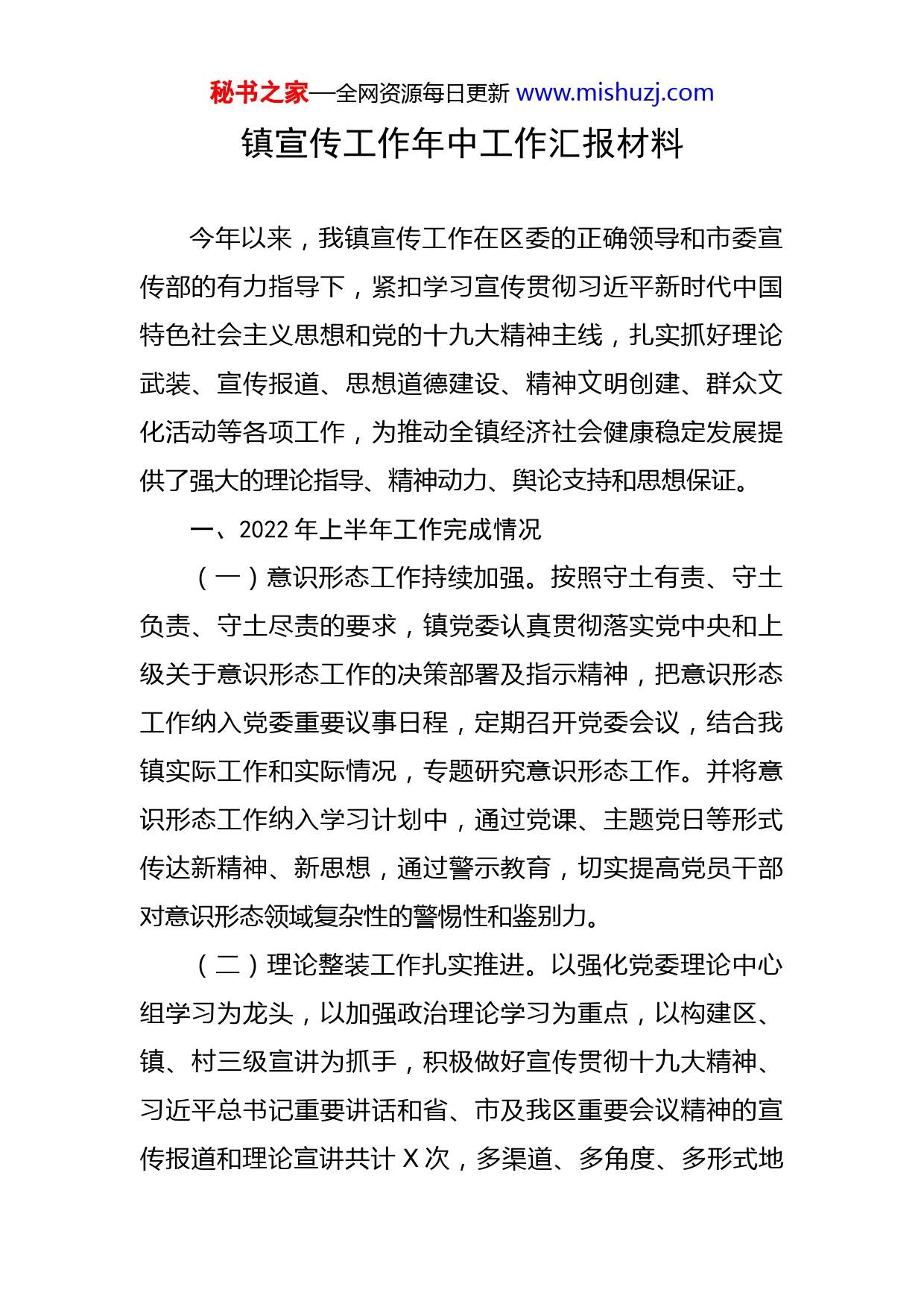 秘书之家—全网资源每日更新www.mishuzj.com镇宣传工作年中工作汇报材料今年以来,我镇宣传工作在区委的正确领导和市委宣传部的有力指导下,紧扣学习宣传贯彻习近平新时代中国特色社会主义思想和党的十九大精神主线,扎实抓好理论武装、宣传报道、思想道德建设、精神文明创建、群众文化活动等各项工作,为推动全镇经济社会健康稳定发展提供了强大的理论指导、精神动力、舆论支持和思想保证。一、2022年上半年工作完成情况(一)意识形态工作持续加强。按照守土有责、守土负责、守土尽责的要求,镇党委认真贯彻落实党中央和上级关于意识形态工作的决策部署及指示精神,把意识形态工作纳入党委重要议事日程,定期召开党委会议,结合我镇实际工作和实际情况,专题研究意识形态工作。并将意识形态工作纳入学习计划中,通过党课、主题党日等形式传达新精神、新思想,通过警示教育,切实提高党员干部对意识形态领域复杂性的警惕性和鉴别力。(二)理论整装工作扎实推进。以强化党委理论中心组学习为龙头,以加强政治理论学习为重点,以构建区、镇、村三级宣讲为抓手,积极做好宣传贯彻十九大精神、习近平总书记重要讲话和省、市及我区重要会议精神的宣传报道和理论宣讲共计X次,多渠道、多角度、多形式地秘书之家—全网资源每日更新www.mishuzj.com宣传党的政策理论。组织开展党委理论学习中心组学习X次;充分利用“月光夜校”开展理论学习X次;聘请市区两级党校老师定期对全体镇村干部授课X次;领导干部坚持带头讲党课X次,全面提高了党员干部的思想素质,有力有效地推动了党的理论创新成果和中央最新精神深入人心。(三)宣传报道工作创新发展。持续深化习近平新时代中国特色社会主义思想宣传教育,根据区委区政府决策部署,积极宣传我镇贯彻落实上级会议精神的创新举措、成功经验和典型事例以及创文明城、疫情防控、春耕生产、乡村振兴、综合治理、法治建设、环境整治等活动的主题宣传,大力弘扬身残志坚彭来生、“X好人”陈光志、全国“三八红旗手”彭会连等正能量事迹。半年来,我镇在国家级媒体报道X篇、省级媒体报道X篇,市级报道X篇、区级报道X篇,营造了促进各项工作顺利开展的良好氛围。利用政务公开、微信朋友圈等多种形式,大力传播好声音、凝聚正能量,转发、评论、点赞《创文一起来》《病毒走开》《疫情就是命令,防控就是责任》《我在X等你来》《最美X人》等宣传短视频,树立良好的正面宣传导向。(四)舆情管控能力不断提高。镇宣传办负责协调处理舆情信息工作,确定X名宣传干事为舆情信息联络员,秘书之家—全网资源每日更新www.mishuzj.com负责网络舆情的收集、整理及反馈,一旦发现涉及我镇的舆情信息,迅速开展调查并了解相关情况,及时做好网络回复工作,确保舆情信息处理及时、有效,保持正确的网络舆论引导。充分利用现代化即时通讯平台,如QQ、微信等新型阵地的宣传潜力,加强对这些载体的运营管理;对镇村两级QQ群、微信群实行备案制,落实专门管理员,加强日常管理,传播正能量,杜绝负面信息;建立网络舆情及时上报制度,做好重大网络舆情提示和处置台账,切实维护网络意识形态安全。(五)精神文明建设水平全面提升。成立了一支由镇村两级新时代文明实践党建宣传员共计X人组成的宣传思想文化工作队伍,及时有效地做好宣传工作。X支志愿者服务队伍(镇X支行业性文明实践队伍、X个村各一支志愿者服务队伍),围绕“便民、为民、利民”的宗旨,结合“我为群众办实事”实践活动内容,依托文明实践所,积极开展文明实践活动,包括“我们的节日”系列活动、防范电信诈骗宣传、环境整治、精神宣讲、普法宣传、安全教育、看望孤寡老人、留守儿童、帮助困难群众等志愿服务活动。同时开展了身边好人、文明家庭、传家风、立家训等树立典型活动,通过树立文明标杆,强化榜样示范,潜移默化提升群众文明素质。(六)文化事业产业快速发展。利用镇村文化墙、大秘书之家—全网资源每日更新www.mishuzj.com喇叭、条幅、宣传图板、宣传牌等多种载体向群众进行了社会主义核心价值观、村规民约、道德规范的宣传教育,旨在提升群众的思想道德水平。组织开展“猜灯谜贺新春党群同心向未来”灯谜竞猜活动、“缅怀革命先烈,传承红色基因”主题活动、“感恩母亲,尽孝扬善”母亲节活动、“庆六一、迎端午”民俗手工文明实践活动、乡村大舞台展演等形式多样、内容丰富的群众文化活动,用先进文化引领群众思想,为我镇的经济社会健康和谐发展唱响主旋律、高唱正气歌。二、存在的不足一是理论宣传的方法和形式还有待更新,宣传力度有待加强;二是宣传基础薄弱,宣传质量和效率还有待于提高。三是文明创建工作当中,由于多种原因导致硬件设施建设相对欠缺。三、下一步工作打算(一)加强党的领导,着力推动责任落实。我镇将意识形态宣传工作纳入党建工作目标责任制,作为年终考核的重要内容,与其他工作同安排、同部署、同落实,全面提升干部职工对意识形态工作重要性的认识,强化了意识形态工作责任。定期召开意识形态工作专题会议,将履行意识形态工作责任制情况纳入班子和成员述职报告中,明确意识形态工作在各级组织和部门的不同表现和需求,严秘书之家—全网资
