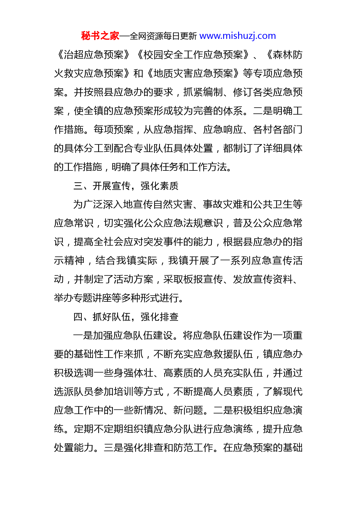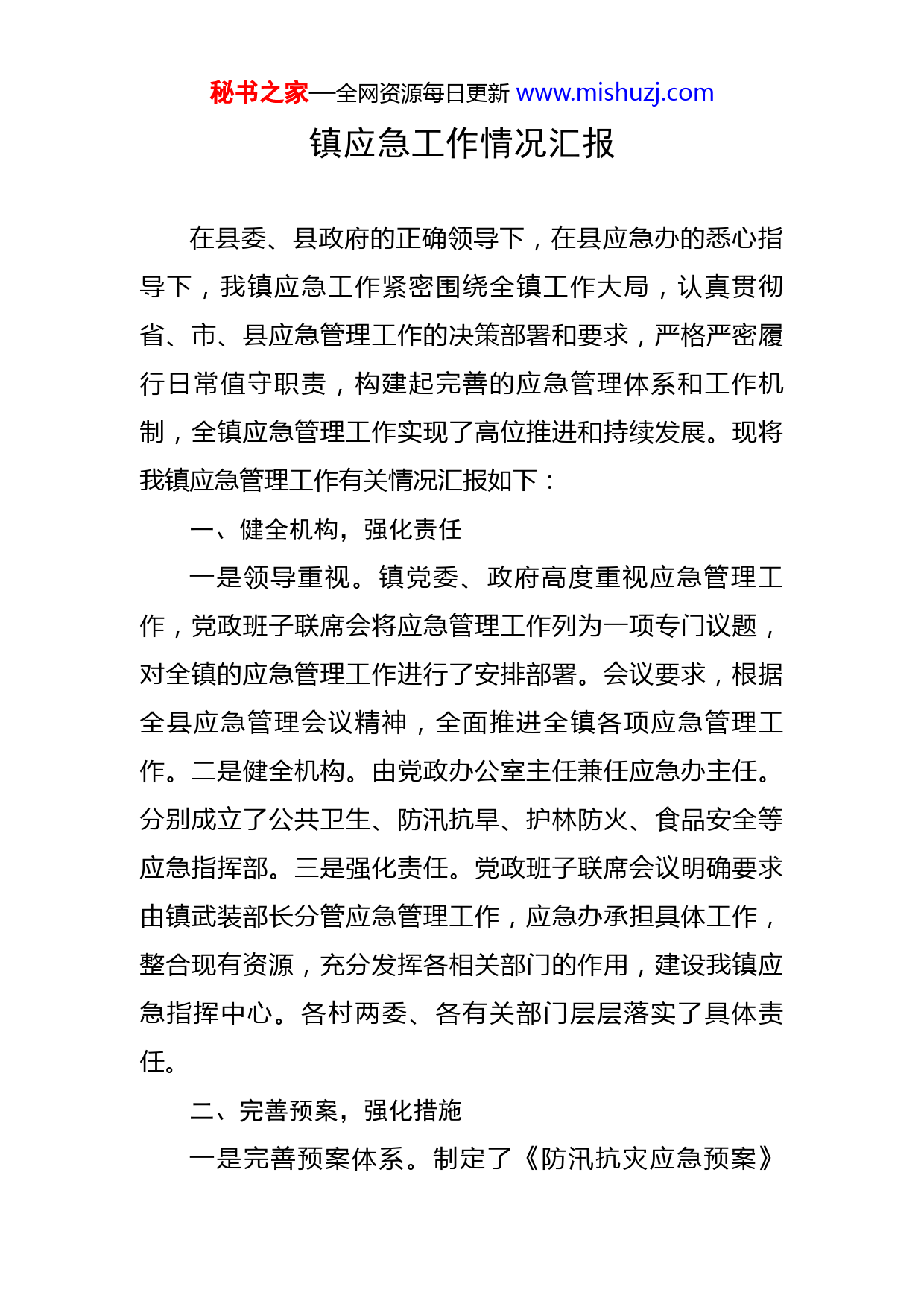 秘书之家—全网资源每日更新www.mishuzj.com镇应急工作情况汇报在县委、县政府的正确领导下,在县应急办的悉心指导下,我镇应急工作紧密围绕全镇工作大局,认真贯彻省、市、县应急管理工作的决策部署和要求,严格严密履行日常值守职责,构建起完善的应急管理体系和工作机制,全镇应急管理工作实现了高位推进和持续发展。现将我镇应急管理工作有关情况汇报如下:一、健全机构,强化责任一是领导重视。镇党委、政府高度重视应急管理工作,党政班子联席会将应急管理工作列为一项专门议题,对全镇的应急管理工作进行了安排部署。会议要求,根据全县应急管理会议精神,全面推进全镇各项应急管理工作。二是健全机构。由党政办公室主任兼任应急办主任。分别成立了公共卫生、防汛抗旱、护林防火、食品安全等应急指挥部。三是强化责任。党政班子联席会议明确要求由镇武装部长分管应急管理工作,应急办承担具体工作,整合现有资源,充分发挥各相关部门的作用,建设我镇应急指挥中心。各村两委、各有关部门层层落实了具体责任。二、完善预案,强化措施一是完善预案体系。制定了《防汛抗灾应急预案》秘书之家—全网资源每日更新www.mishuzj.com《治超应急预案》《校园安全工作应急预案》、《森林防火救灾应急预案》和《地质灾害应急预案》等专项应急预案。并按照县应急办的要求,抓紧编制、修订各类应急预案,使全镇的应急预案形成较为完善的体系。二是明确工作措施。每项预案,从应急指挥、应急响应、各村各部门的具体分工到配合专业队伍具体处置,都制订了详细具体的工作措施,明确了具体任务和工作方法。三、开展宣传,强化素质为广泛深入地宣传自然灾害、事故灾难和公共卫生等应急常识,切实强化公众应急法规意识,普及公众应急常识,提高全社会应对突发事件的能力,根据县应急办的指示精神,结合我镇实际,我镇开展了一系列应急宣传活动,并制定了活动方案,采取板报宣传、发放宣传资料、举办专题讲座等多种形式进行。四、抓好队伍,强化排查一是加强应急队伍建设。将应急队伍建设作为一项重要的基础性工作来抓,不断充实应急救援队伍,镇应急办积极选调一些身强体壮、高素质的人员充实队伍,并通过选派队员参加培训等方式,不断提高人员素质,了解现代应急工作中的一些新情况、新问题。二是积极组织应急演练。定期不定期组织镇应急分队进行应急演练,提升应急处置能力。三是强化排查和防范工作。在应急预案的基础秘书之家—全网资源每日更新www.mishuzj.com上,逐步推进应急管理工作规范化、程序化、法制化,建立健全应急处置突发机制,平时切实做好排查和防范工作,争取工作主动,公共事件一旦发生,分管领导作为责任人都能够亲自到现场指挥协调,各职能小组上下联动,密切配合。五、加强应急工作,提高工作效率为了把应急管理工作真正落到实处,及时、准确地处置突发公共事件,我镇采取有力工作措施。一是充分整合利用现有资源,加快应急指挥平台建设,提高应急管理工作的水平。在全镇范围内大力开展对可能引发突发事件的重点情报信息的收集、研制和报送工作。落实24小时值班制度,并坚持领导带班制度,值班员当好值班的值班记录,认真做好日常值守应急和信息汇总工作,积极畅通信息渠道,严格信息报送管理,基本做到了在第一时间内准确排查和掌握各类突发公共事件的信息,确保了突发公共事件发现得早、处置得及时,有效保障了人民群众的财产和生命安全。二是建立边界矛盾化解应急责任机制,对发生的各类矛盾,落实责任人,尽力争取在第一时间进行处理,对调处不到位的,严格追究相关责任人的责任,坚决杜绝边界矛盾纠纷的扩大蔓延。三是形成了“横向到边、纵向到底、上下联动、左右协调、依靠村组、多方参与”的大调处网格体系,使相邻村镇应急管理工作制度化,常秘书之家—全网资源每日更新www.mishuzj.com态化。对跨界突发事件,不单方面作出调解决定,而是由双方联防联调工作领导小组牵头,充分利用人民调解、行政调解、司法调解的“三调联动”机制,协调两地相关职能部门共同参与处理。