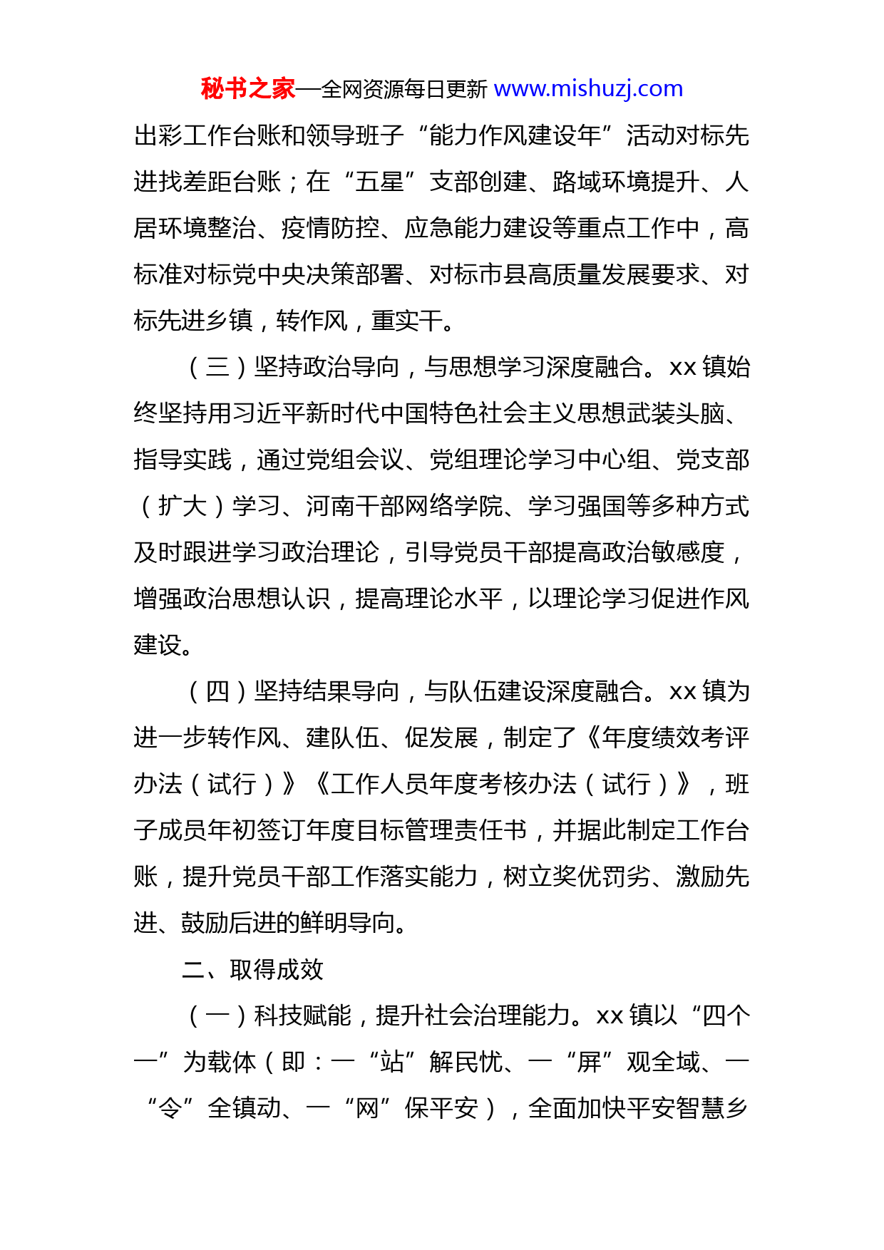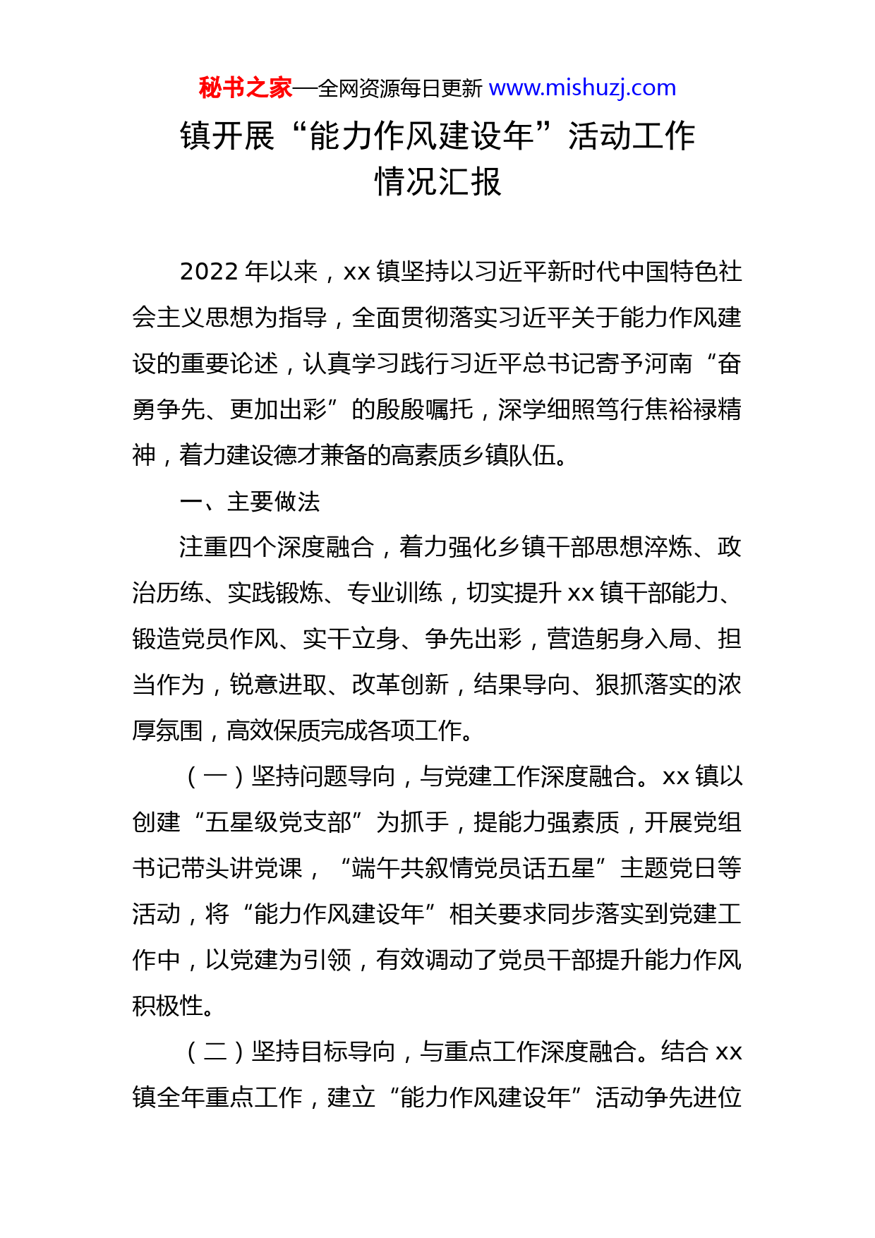 秘书之家—全网资源每日更新www.mishuzj.com镇开展“能力作风建设年”活动工作情况汇报2022年以来,xx镇坚持以习近平新时代中国特色社会主义思想为指导,全面贯彻落实习近平关于能力作风建设的重要论述,认真学习践行习近平总书记寄予河南“奋勇争先、更加出彩”的殷殷嘱托,深学细照笃行焦裕禄精神,着力建设德才兼备的高素质乡镇队伍。一、主要做法注重四个深度融合,着力强化乡镇干部思想淬炼、政治历练、实践锻炼、专业训练,切实提升xx镇干部能力、锻造党员作风、实干立身、争先出彩,营造躬身入局、担当作为,锐意进取、改革创新,结果导向、狠抓落实的浓厚氛围,高效保质完成各项工作。(一)坚持问题导向,与党建工作深度融合。xx镇以创建“五星级党支部”为抓手,提能力强素质,开展党组书记带头讲党课,“端午共叙情党员话五星”主题党日等活动,将“能力作风建设年”相关要求同步落实到党建工作中,以党建为引领,有效调动了党员干部提升能力作风积极性。(二)坚持目标导向,与重点工作深度融合。结合xx镇全年重点工作,建立“能力作风建设年”活动争先进位秘书之家—全网资源每日更新www.mishuzj.com出彩工作台账和领导班子“能力作风建设年”活动对标先进找差距台账;在“五星”支部创建、路域环境提升、人居环境整治、疫情防控、应急能力建设等重点工作中,高标准对标党中央决策部署、对标市县高质量发展要求、对标先进乡镇,转作风,重实干。(三)坚持政治导向,与思想学习深度融合。xx镇始终坚持用习近平新时代中国特色社会主义思想武装头脑、指导实践,通过党组会议、党组理论学习中心组、党支部(扩大)学习、河南干部网络学院、学习强国等多种方式及时跟进学习政治理论,引导党员干部提高政治敏感度,增强政治思想认识,提高理论水平,以理论学习促进作风建设。(四)坚持结果导向,与队伍建设深度融合。xx镇为进一步转作风、建队伍、促发展,制定了《年度绩效考评办法(试行)》《工作人员年度考核办法(试行)》,班子成员年初签订年度目标管理责任书,并据此制定工作台账,提升党员干部工作落实能力,树立奖优罚劣、激励先进、鼓励后进的鲜明导向。二、取得成效(一)科技赋能,提升社会治理能力。xx镇以“四个一”为载体(即:一“站”解民忧、一“屏”观全域、一“令”全镇动、一“网”保平安),全面加快平安智慧乡秘书之家—全网资源每日更新www.mishuzj.com村建设步伐,基层社会治理取得明显成效。(二)提升乡村颜值,美化人居环境。全年,xx镇将转变干部工作作风,落实在人居环境集中整治行动中,已经成功打造美丽贾河、文化桑村、红色余庄、风情小徐、森林路洲五个重点村、特色村、模范村,正在整治中的有西乜古、崔张古、马张古、王张古、牛张古、西路洲等,下一步计划全覆盖式提升乡村颜值,建成美丽xx。(三)路域环境治理,建设四好农村路。2022年以来,xx镇把四好公路建设与人居环境整治相结合,紧扣“建、管、养、运”四大标准,总投资3100万元,围绕打通“断头路”、支持“产业路”、提升“乡村路”、美化“颜值路”下功夫。其中,投资700余万元,新建杨固、四张固等村水泥路7.32公里;投资380余万元,对贾河、桑村、路洲、小徐等村铺设沥青柏油路8.5公里;投资1600余万元,对西乜古、小徐、四张古等村铺建污水管网37.5公里;投资400余万元,对两侧路肩播撒花籽、铺设花砖、种植绿化树。(四)提升应急能力水平,建成“一队一中心”镇级专职消防队。对照一级专职消防队建设标准,xx镇消防服务中心累计投入1000余万元,建筑面积3430平方米,配备2台消防车、各类防护装备、灭火救援器材和通讯器材器材556件套。秘书之家—全网资源每日更新www.mishuzj.com(五)坚决落实疫情防控措施,严守生命安全线。2022年以来,xx镇机关干部站在疫情防控一线,排查在外人员有1万4千余人,返乡报备累计6576人次,坚决落实上级各项要求,保证了xx镇群众的生命安全,稳住了经济建设和社会发展。三、存在问题(一)机关干部理论学习主动意识不强,理论水平不够扎实,出现学用“两层皮”。(二)思想解放程度不够,创新意识不强。(三)个别机关干部和村两委干部存在纪律不严、作风不正、态度不好的问题。