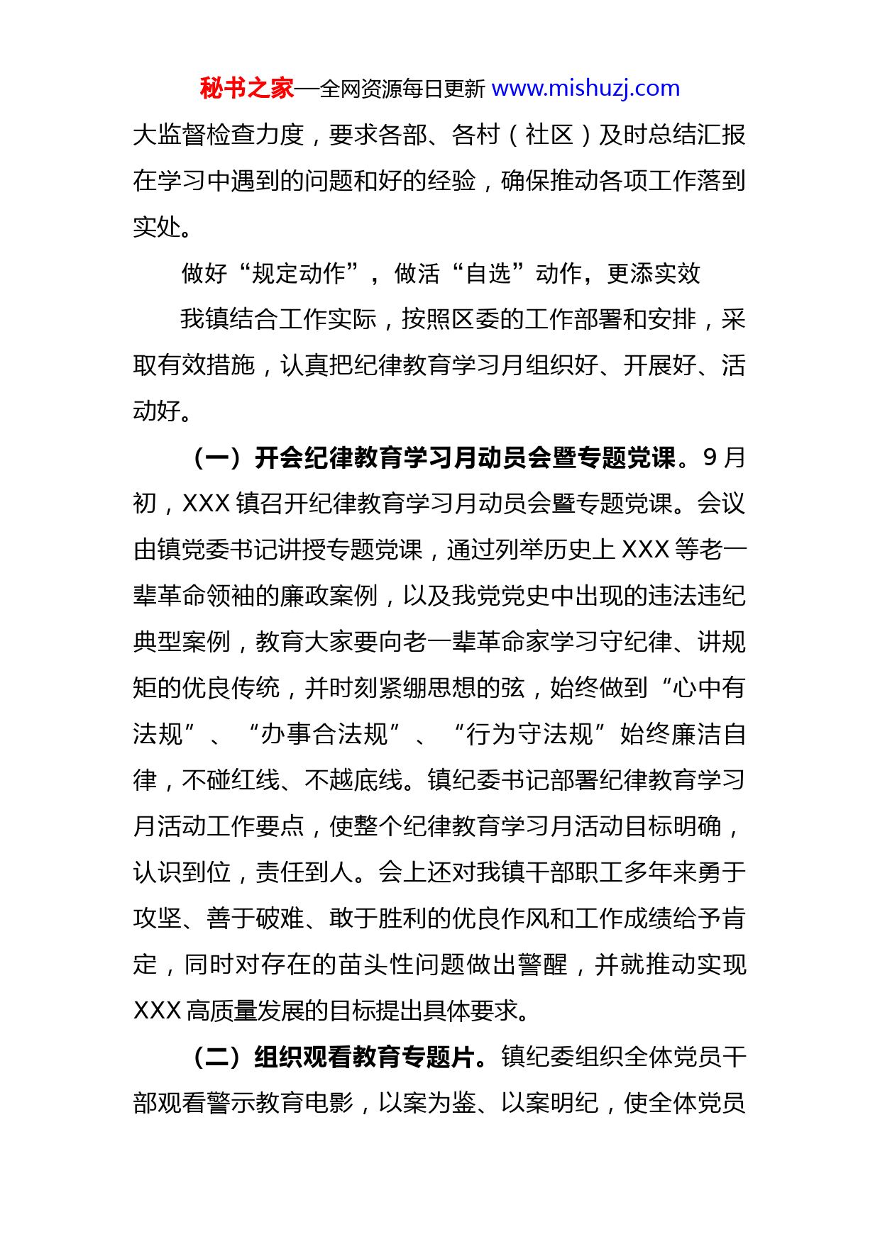 秘书之家—全网资源每日更新www.mishuzj.com镇开展纪律教育学习月情况汇报根据中共XXXXX委办公室《关于印发《XXX2021年开展纪律教育学习月活动实施方案》的通知》(XXXX〔2021〕X号)及XX镇《XXX镇2021年开展纪律教育学习月活动实施方案》的精神,XX镇以“学党史悟思想,守纪律铸忠诚”为主题,认真开展了纪律教育学习月活动,组织全体党员认真学习了中央、省委、市委和区委相关文件和领导讲话,观看了党风廉政教育片,组织开展了谈心谈话、严抓工作作风、对新进公务员进行任前谈话等活动,镇纪委充分发挥全面从严治党引领保障作用,推进不敢腐、不能腐、不想腐一体化建设,增强“四个意识”、坚定“四个自信”、做到“两个维护”,进一步筑牢党员干部和职工拒腐防变的思想堤坝,推动了XXX镇作风建设,全面完成纪律教育学习月的各项要求,现将有关情况总结如下:加强组织领导,确保活动落到实处我镇领导高度重视纪律教育学习月活动,制定了《XXX镇2021年开展纪律教育学习月活动实施方案》,由主要负责同志要亲自抓,带头参加教育学习活动,并加强对各村(社区)党组织的督促指导,推动层层落实责任。镇纪委将积极协助镇党委抓好纪律教育学习活动,加秘书之家—全网资源每日更新www.mishuzj.com大监督检查力度,要求各部、各村(社区)及时总结汇报在学习中遇到的问题和好的经验,确保推动各项工作落到实处。做好“规定动作”,做活“自选”动作,更添实效我镇结合工作实际,按照区委的工作部署和安排,采取有效措施,认真把纪律教育学习月组织好、开展好、活动好。(一)开会纪律教育学习月动员会暨专题党课。9月初,XXX镇召开纪律教育学习月动员会暨专题党课。会议由镇党委书记讲授专题党课,通过列举历史上XXX等老一辈革命领袖的廉政案例,以及我党党史中出现的违法违纪典型案例,教育大家要向老一辈革命家学习守纪律、讲规矩的优良传统,并时刻紧绷思想的弦,始终做到“心中有法规”、“办事合法规”、“行为守法规”始终廉洁自律,不碰红线、不越底线。镇纪委书记部署纪律教育学习月活动工作要点,使整个纪律教育学习月活动目标明确,认识到位,责任到人。会上还对我镇干部职工多年来勇于攻坚、善于破难、敢于胜利的优良作风和工作成绩给予肯定,同时对存在的苗头性问题做出警醒,并就推动实现XXX高质量发展的目标提出具体要求。(二)组织观看教育专题片。镇纪委组织全体党员干部观看警示教育电影,以案为鉴、以案明纪,使全体党员秘书之家—全网资源每日更新www.mishuzj.com干部接受了一次思想和灵魂的洗礼,受到了深刻的警示教育,认识到党风廉政建设的重要性和廉洁自律的必要性。在场党员干部们均表示要吸取教训,在今后工作中将自觉学习、维护、遵守党章党纪,不断增强纪律意识、规矩意识、责任意识,自觉抵制各种诱惑,真正做到“讲政治、强党性、严纪律、守规矩”。(三)开展新进公务员集体廉政谈话。为了进一步增强廉洁自律自觉性,筑牢拒腐防变的思想道德防线,XXX纪委对X名新入职公务员进行集体廉政谈话。目的为了全面提高新任公务员的廉洁自律和尽职尽责意识,引导新公务员走好公职第一步,扣好人生第一粒扣子。希望新公务员在面对诱惑、陷阱时,保持清醒头脑,时刻警钟长鸣,感情上把握住原则,在行动上把握住分寸,在生活上把握住小节,务必做到政治上清醒、经济上清楚、生活上清白,守好自己的精神家园,共同为XXX镇的经济建设和高质量发展作出贡献。(四)逐级谈心谈话,发挥监督作用。谈心谈话是党内组织生活的重要形式,也是抓好廉政风险防控和廉洁自律提醒的主要载体。XXX镇通过书记和班子谈、分管和部门谈、村(居)书记和村(社区)“两委”干部谈的方式,开展谈心谈话XX余次,使得党员干部坦诚相见,交流思想,交换意见。活动有利于我镇纪委掌握谈话对象的思秘书之家—全网资源每日更新www.mishuzj.com想动态和工作中存在的问题,能够使个别存在苗头性、倾向性问题的同志,尽早踩下“刹车”,起到抓早抓小、防微杜渐的作用。(五)严抓工作纪律,转变工作作风。为全面落实从严治党要求,进一步提升我镇工作效能,加强干部作风建设。XX镇纪委对各部门、各村(社区)所有人员在岗情况以及上下班情况进行了突击检查。检查发现,个别干部职工存在迟到、早退情况,对突击检查情况进行了通报。通过一段时间动真格、亮真枪抓考勤工作,助力XXX镇工作人员转变工作作风,为我镇营造勤政务实的良好氛围作出贡献。以学促改,作风建设永远在路上XX镇通过纪律教育学习月的一系列活动,进一步教育引导我镇党员干部从党史中汲取正反两方面历史经验,不断提高政治判断力、政治领悟力、政治执行力,严格执行区委坚决落实“两个维护”十项制度机制实施方案,巩固深化肃清XXX恶劣影响成果,以实际行动做到“两个维护”,自觉在思想上政治上行动上同以习近平同志为核心的党中央保持高度一致,始终做到政治信念坚定、遵规守纪的明白人。纪律教育学习月活动虽然取得了一定的成绩,但作风建设永远在路上,永远没有休止符。今后,我镇将进一步秘书之家—全网资源每日更新www.mishuzj.com提高党员干部和全体职工增强纪法意识,严守纪法底线,自觉筑牢不敢腐、不能腐、不想腐的思想防线,为我镇的经济发展营造良好环