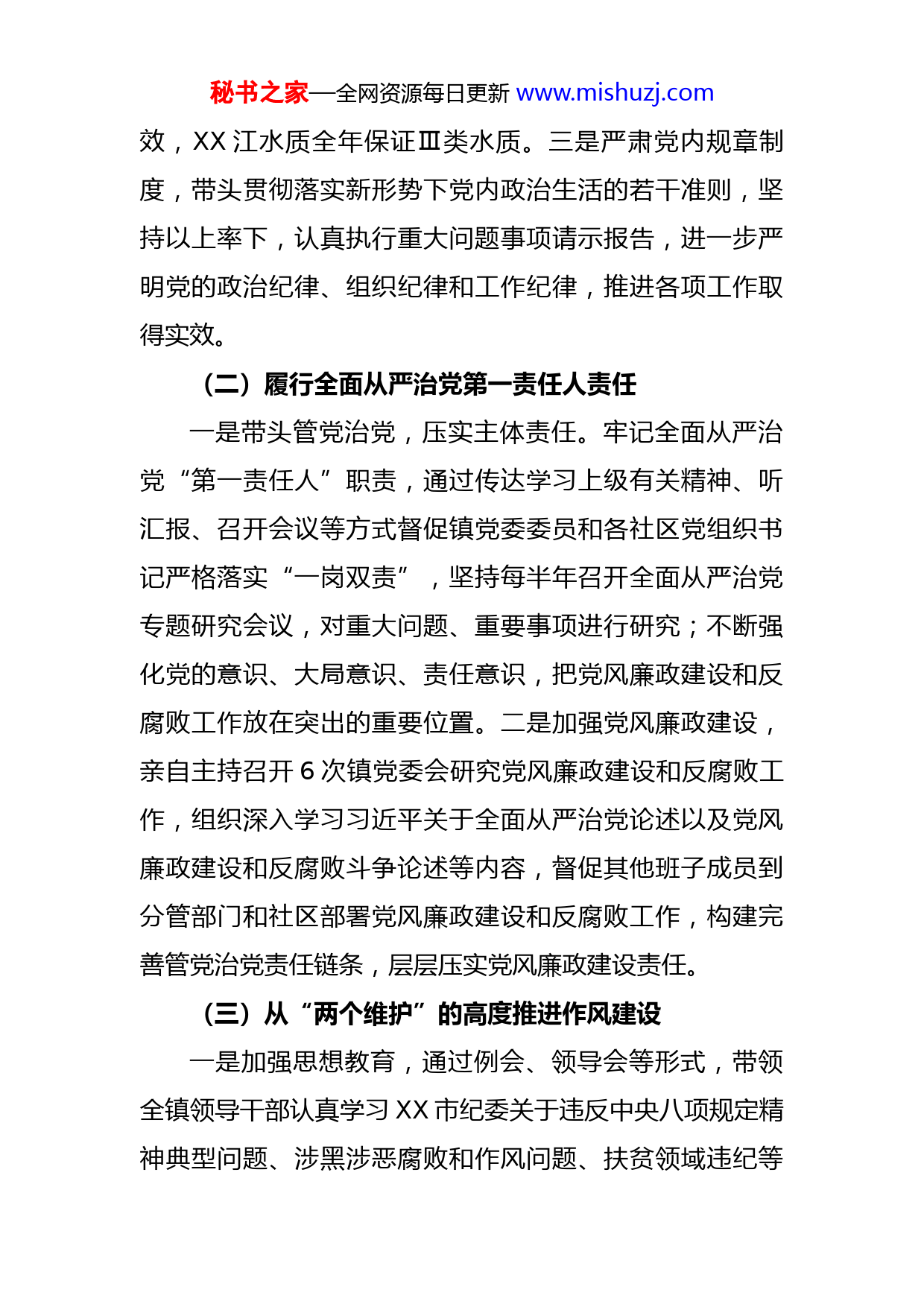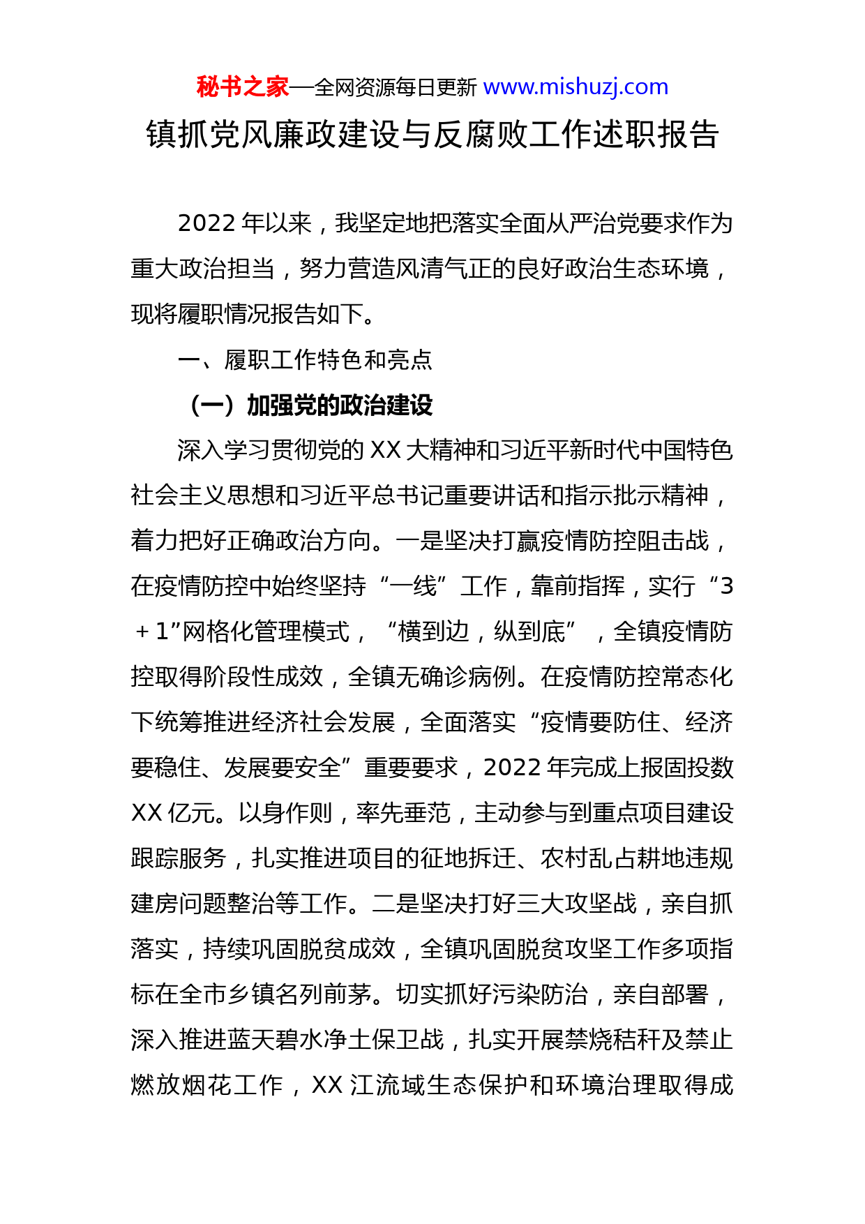 秘书之家—全网资源每日更新www.mishuzj.com镇抓党风廉政建设与反腐败工作述职报告2022年以来,我坚定地把落实全面从严治党要求作为重大政治担当,努力营造风清气正的良好政治生态环境,现将履职情况报告如下。一、履职工作特色和亮点(一)加强党的政治建设深入学习贯彻党的XX大精神和习近平新时代中国特色社会主义思想和习近平总书记重要讲话和指示批示精神,着力把好正确政治方向。一是坚决打赢疫情防控阻击战,在疫情防控中始终坚持“一线”工作,靠前指挥,实行“3+1”网格化管理模式,“横到边,纵到底”,全镇疫情防控取得阶段性成效,全镇无确诊病例。在疫情防控常态化下统筹推进经济社会发展,全面落实“疫情要防住、经济要稳住、发展要安全”重要要求,2022年完成上报固投数XX亿元。以身作则,率先垂范,主动参与到重点项目建设跟踪服务,扎实推进项目的征地拆迁、农村乱占耕地违规建房问题整治等工作。二是坚决打好三大攻坚战,亲自抓落实,持续巩固脱贫成效,全镇巩固脱贫攻坚工作多项指标在全市乡镇名列前茅。切实抓好污染防治,亲自部署,深入推进蓝天碧水净土保卫战,扎实开展禁烧秸秆及禁止燃放烟花工作,XX江流域生态保护和环境治理取得成秘书之家—全网资源每日更新www.mishuzj.com效,XX江水质全年保证Ⅲ类水质。三是严肃党内规章制度,带头贯彻落实新形势下党内政治生活的若干准则,坚持以上率下,认真执行重大问题事项请示报告,进一步严明党的政治纪律、组织纪律和工作纪律,推进各项工作取得实效。(二)履行全面从严治党第一责任人责任一是带头管党治党,压实主体责任。牢记全面从严治党“第一责任人”职责,通过传达学习上级有关精神、听汇报、召开会议等方式督促镇党委委员和各社区党组织书记严格落实“一岗双责”,坚持每半年召开全面从严治党专题研究会议,对重大问题、重要事项进行研究;不断强化党的意识、大局意识、责任意识,把党风廉政建设和反腐败工作放在突出的重要位置。二是加强党风廉政建设,亲自主持召开6次镇党委会研究党风廉政建设和反腐败工作,组织深入学习习近平关于全面从严治党论述以及党风廉政建设和反腐败斗争论述等内容,督促其他班子成员到分管部门和社区部署党风廉政建设和反腐败工作,构建完善管党治党责任链条,层层压实党风廉政建设责任。(三)从“两个维护”的高度推进作风建设一是加强思想教育,通过例会、领导会等形式,带领全镇领导干部认真学习XX市纪委关于违反中央八项规定精神典型问题、涉黑涉恶腐败和作风问题、扶贫领域违纪等秘书之家—全网资源每日更新www.mishuzj.com各种通报,让领导干部做到自警、自省、自重,认真贯彻执行中央八项规定精神。二是狠抓干部队伍建设,围绕镇中心工作,执行包联社区责任制,巩固“不忘初心、牢记使命”主题教育成果,开展解放思想再出发“大学习、深调研、强服务、敢担当”活动,带领全镇领导干部切实履职尽责、担当作为。三是狠抓监督执纪,全力支持镇纪委工作,2022年共立案5件,结案3件,留党察看2人,降低岗位等级1人,开除党籍处分1人。运用第一种形态通报了4个社区,诫勉谈话5人,谈话提醒1人,营造了风清气正的政治生态。(四)牢固树立以人民为中心的思想坚持贯彻落实以人民为中心的思想,聚焦群众反映强烈的问题,切实抓好社会民生等工作。一是大力推进乡村振兴工作,全镇完成30个基本整治型村庄的建设,切实推动了农村人居环境提档升级。二是在新冠肺炎疫情防控、扫黑除恶专项斗争、脱贫攻坚、生态环境治理以及社会保障等工作的成效得到群众的一致认可,群众安全感和满意度不断提升,XX镇在2022年度XX市群众安全感和满意度调查和扫黑除恶专项斗争成效调查中排名靠前。(五)遵守纪律,廉洁从政一是亲自给全镇各社区党组织、镇直支部书记上廉政党课,开展个别约谈工作,先后分批次约谈镇党委委员、秘书之家—全网资源每日更新www.mishuzj.com社区党组织书记、镇直各单位主要负责人共38人次。二是建立推进反腐倡廉警示教育常态机制,利用好XX社区廉政教育长廊,警示和教育广大党员干部特别是领导干部增强防腐拒变的能力。三是坚持动真碰硬,狠抓巡视反馈问题整改,针对中央第二巡视组对XX省开展脱贫攻坚专项巡视“回头看”反馈意见自查自纠找出7个问题,列出15条整改措施;针对2021年国家脱贫攻坚成效考核反馈意见自查自纠找出6个问题,列出8条整改措施,切实抓好整改工作,已全面完成整改销号工作。同时,对照XX市委第二巡察组向XX区党工委反馈的巡察情况,对标对表,抓好自查自纠,总结出4大方面13个突出问题,细化分解为22个具体问题64项任务措施,立行立改,确保反馈意见整改取得成效。二、存在的主要问题及原因(一)存在问题一是在管好党员干部、管严“关键少数”上还有差距,干部队伍整体战斗力还需提升;一些干部面对繁重工作任务,缺乏攻坚克难的勇气,在落实总书记指示批示精神和中央决策部署方面具体工作中,有时开展工作的方式方法过于保守,思路创新不够。同时对社区纪检干部的培训力度还不够,部分社区纪检干部工作积极性不高,仅仅较被动完成镇下派的工作任务,主动履行监督责任的意识秘书之家—全网资源每日更新www.mishuzj.com不够。二是对落实全面从严治党要求的主动思考