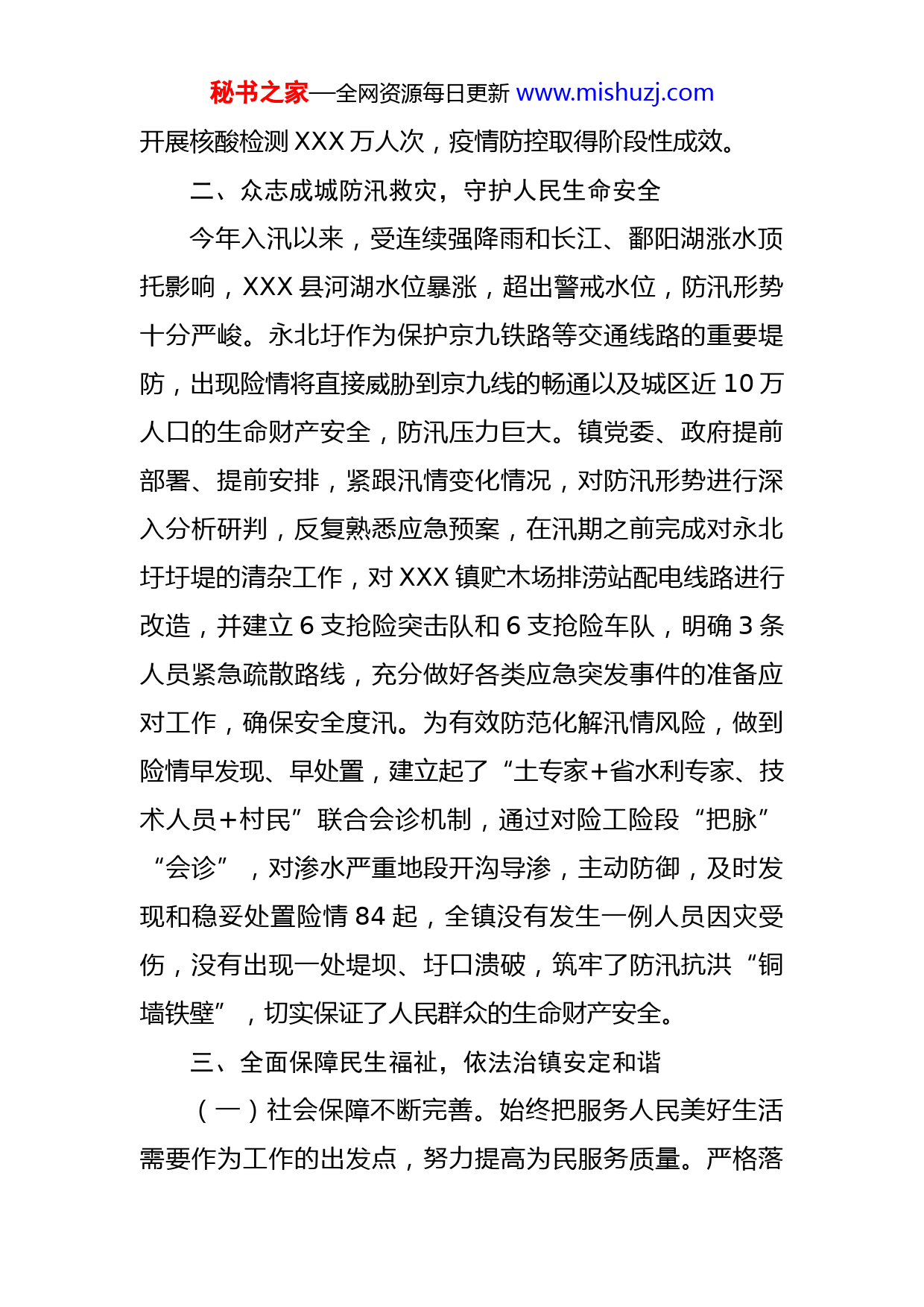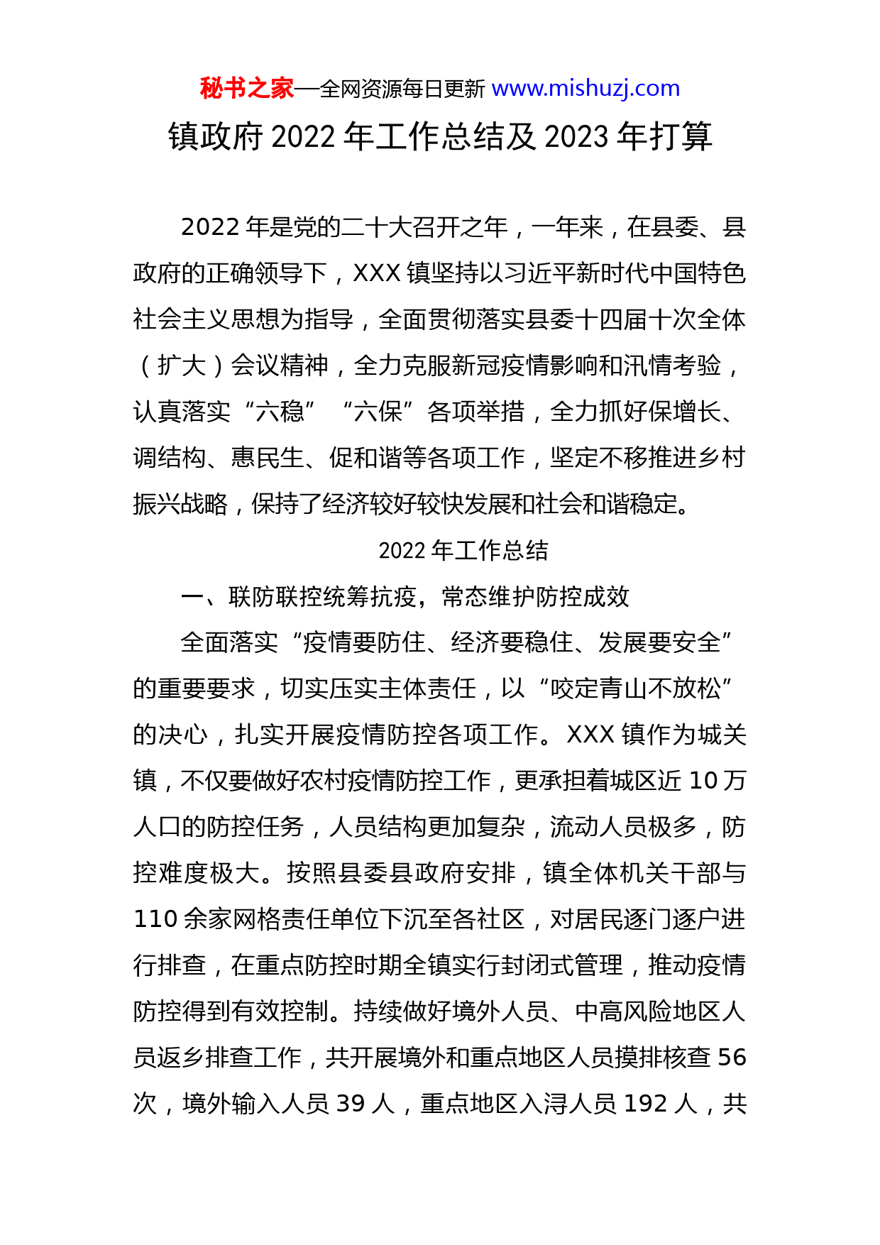 秘书之家—全网资源每日更新www.mishuzj.com镇政府2022年工作总结及2023年打算2022年是党的二十大召开之年,一年来,在县委、县政府的正确领导下,XXX镇坚持以习近平新时代中国特色社会主义思想为指导,全面贯彻落实县委十四届十次全体(扩大)会议精神,全力克服新冠疫情影响和汛情考验,认真落实“六稳”“六保”各项举措,全力抓好保增长、调结构、惠民生、促和谐等各项工作,坚定不移推进乡村振兴战略,保持了经济较好较快发展和社会和谐稳定。2022年工作总结一、联防联控统筹抗疫,常态维护防控成效全面落实“疫情要防住、经济要稳住、发展要安全”的重要要求,切实压实主体责任,以“咬定青山不放松”的决心,扎实开展疫情防控各项工作。XXX镇作为城关镇,不仅要做好农村疫情防控工作,更承担着城区近10万人口的防控任务,人员结构更加复杂,流动人员极多,防控难度极大。按照县委县政府安排,镇全体机关干部与110余家网格责任单位下沉至各社区,对居民逐门逐户进行排查,在重点防控时期全镇实行封闭式管理,推动疫情防控得到有效控制。持续做好境外人员、中高风险地区人员返乡排查工作,共开展境外和重点地区人员摸排核查56次,境外输入人员39人,重点地区入浔人员192人,共秘书之家—全网资源每日更新www.mishuzj.com开展核酸检测XXX万人次,疫情防控取得阶段性成效。二、众志成城防汛救灾,守护人民生命安全今年入汛以来,受连续强降雨和长江、鄱阳湖涨水顶托影响,XXX县河湖水位暴涨,超出警戒水位,防汛形势十分严峻。永北圩作为保护京九铁路等交通线路的重要堤防,出现险情将直接威胁到京九线的畅通以及城区近10万人口的生命财产安全,防汛压力巨大。镇党委、政府提前部署、提前安排,紧跟汛情变化情况,对防汛形势进行深入分析研判,反复熟悉应急预案,在汛期之前完成对永北圩圩堤的清杂工作,对XXX镇贮木场排涝站配电线路进行改造,并建立6支抢险突击队和6支抢险车队,明确3条人员紧急疏散路线,充分做好各类应急突发事件的准备应对工作,确保安全度汛。为有效防范化解汛情风险,做到险情早发现、早处置,建立起了“土专家+省水利专家、技术人员+村民”联合会诊机制,通过对险工险段“把脉”“会诊”,对渗水严重地段开沟导渗,主动防御,及时发现和稳妥处置险情84起,全镇没有发生一例人员因灾受伤,没有出现一处堤坝、圩口溃破,筑牢了防汛抗洪“铜墙铁壁”,切实保证了人民群众的生命财产安全。三、全面保障民生福祉,依法治镇安定和谐(一)社会保障不断完善。始终把服务人民美好生活需要作为工作的出发点,努力提高为民服务质量。严格落秘书之家—全网资源每日更新www.mishuzj.com实错时延时预约服务制度,在工作日中午合理安排服务班次,双休日及国家法定节假日实行延时服务,最大限度方便企业和群众办事。扎实推进城乡低保工作规范化建设,严格低保申请流程,全面推进社会救助工作更加阳光、高效、规范、法治、廉洁。一年来全镇共保障城乡低保1120户1774人,累计发放城乡低保、特困、优抚、孤儿等各项民生资金1092万余元。(二)精神文明建设不断加强。坚持把精神文明建设作为乡村振兴的重要内容,加大公共文化基础设施建设,对全镇1个新时代文明实践所、12个新时代文明实践站配套设施进行了优化完善,实现了工作制度、活动计划、社会主义核心价值观、身边好人榜的全覆盖。大力推进全民科学素质工作,顺利通过了评估检查。结合疫情防控、禁燃禁放、贫困群众就业、文明祭扫、防灾减灾等工作,全年共开展志愿服务活动150余次,广大志愿者积极参与疫情防控知识宣传普及和防汛工作,切实发挥带头作用,为全面打赢疫情防控阻击战和抗洪抢险攻坚战提供了强大的精神动力,营造了良好的社会环境。(三)社会治安持续稳定。强化措施,确立邪教人员“五包一”管控责任制,加强教育转化,目前已成功转化3名人员,与监护人签订肇事肇祸等严重精神障碍患者监护协议,督促监护人加强日常管控,坚持做好反邪教和肇事秘书之家—全网资源每日更新www.mishuzj.com肇祸精神病人管控工作。充分利用信访接待、谈心谈话、走访化解等方式开展稳控工作,做到“大事不出镇、小事不出村”,办理信访件35个,妥善调解重大事故纠纷3起,有效的化解了各类社会矛盾,有力维持了我镇信访稳定局面。四、聚力补齐基础短板,乡村振兴成效明显(一)大力推进村庄环境整治。把农村人居环境整治作为乡村振兴工作的重要任务和抓手。通过镇村干部分区包片的形式,落实责任到人、严明奖惩到事,将各村农村人居环境整治成效与村级干部考核挂钩,同时进一步规范农村生活垃圾治理拖运,将农村范围内垃圾拖运外包给专业保洁服务公司进行日常垃圾转运,推动环境整治常态长效。紧扣“拆得彻底、清得干净、建的美丽、管得长效”的工作要求,突出打造XXX镇XX组人居环境示范点,以点带面、整村推进,目前组内改水、改厕、坡屋顶改造、集中污水处理设施已全面完成,停车场、农民休闲文化广场、生态栈道等文化娱乐设施正在建设中,人居环境示范点已初见雏形。大力推进厕所革命,分门别类再次进行摸排,针对具体问题拿出具体方案,正常预算解决一批,增加预算解决一批,通过项目解决一批,做到“应改尽改”,截止目前共完成改厕154户,人居环境