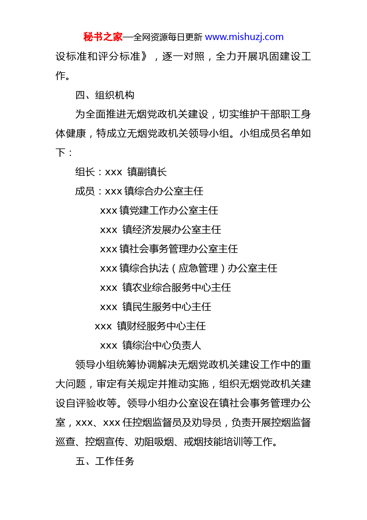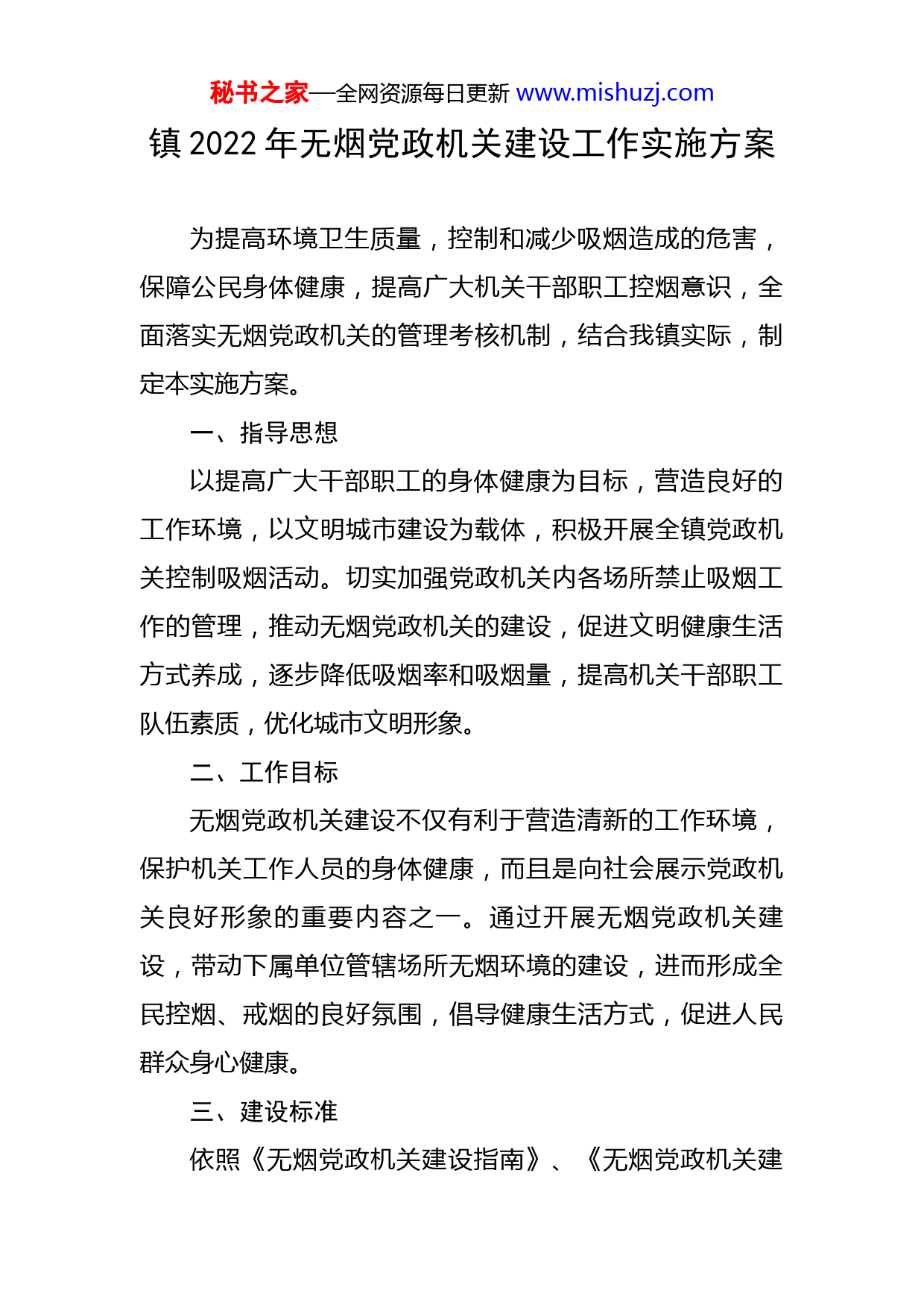 秘书之家—全网资源每日更新www.mishuzj.com镇2022年无烟党政机关建设工作实施方案为提高环境卫生质量,控制和减少吸烟造成的危害,保障公民身体健康,提高广大机关干部职工控烟意识,全面落实无烟党政机关的管理考核机制,结合我镇实际,制定本实施方案。一、指导思想以提高广大干部职工的身体健康为目标,营造良好的工作环境,以文明城市建设为载体,积极开展全镇党政机关控制吸烟活动。切实加强党政机关内各场所禁止吸烟工作的管理,推动无烟党政机关的建设,促进文明健康生活方式养成,逐步降低吸烟率和吸烟量,提高机关干部职工队伍素质,优化城市文明形象。二、工作目标无烟党政机关建设不仅有利于营造清新的工作环境,保护机关工作人员的身体健康,而且是向社会展示党政机关良好形象的重要内容之一。通过开展无烟党政机关建设,带动下属单位管辖场所无烟环境的建设,进而形成全民控烟、戒烟的良好氛围,倡导健康生活方式,促进人民群众身心健康。三、建设标准依照《无烟党政机关建设指南》、《无烟党政机关建秘书之家—全网资源每日更新www.mishuzj.com设标准和评分标准》,逐一对照,全力开展巩固建设工作。四、组织机构为全面推进无烟党政机关建设,切实维护干部职工身体健康,特成立无烟党政机关领导小组。小组成员名单如下:组长:xxx镇副镇长成员:xxx镇综合办公室主任xxx镇党建工作办公室主任xxx镇经济发展办公室主任xxx镇社会事务管理办公室主任xxx镇综合执法(应急管理)办公室主任xxx镇农业综合服务中心主任xxx镇民生服务中心主任xxx镇财经服务中心主任xxx镇综治中心负责人领导小组统筹协调解决无烟党政机关建设工作中的重大问题,审定有关规定并推动实施,组织无烟党政机关建设自评验收等。领导小组办公室设在镇社会事务管理办公室,xxx、xxx任控烟监督员及劝导员,负责开展控烟监督巡查、控烟宣传、劝阻吸烟、戒烟技能培训等工作。五、工作任务秘书之家—全网资源每日更新www.mishuzj.com(一)领导干部带头禁烟。各级领导干部要带头在公共场所和各级党政机关公务活动中禁烟控烟,及时劝阻和制止他人在公共场所吸烟。公务活动参加人员不得吸烟、敬烟、劝烟。(二)单位内部全面禁烟。各办公室(中心)、会议室等室内全面禁烟,室外不设吸烟区。禁烟区域内要张贴醒目的禁烟标识,禁止摆放烟缸、烟具,禁止发放各种形式的烟草广告。每位干部职工都有义务对控烟工作进行宣传和监督,不向来客敬烟,对吸烟者耐心劝阻,坚决制止。(三)带头巩固创建无烟单位成果。各办公室(中心)以身作则,优化政府机关环境,树立窗口良好形象,巩固开展“无烟党政机关”建设活动,大力倡导和开展戒烟、禁烟、劝诫抽烟行动,形成倡导主动戒烟禁烟、不接烟不敬烟、访客无人吸烟的无烟环境,教育广大干部职工不吸烟、不备烟、不接烟、不敬烟。劝导员要对外来办事人员吸烟行为及时进行劝阻,监督员要对内部干部职工公共场所禁烟执行情况进行督查。(四)广泛开展禁止吸烟宣传活动。结合“世界无烟日”、世界卫生日等主题活动,深入开展形式多样的控烟宣传活动,发放控烟漫画吸烟有害宣传资料、张贴禁烟标识、禁烟标志、举办控烟知识讲座、公益性广告等宣传控秘书之家—全网资源每日更新www.mishuzj.com烟知识。利用电子显示屏滚动播出吸烟对人体危害的宣传内容。通过控烟宣传、普及控烟知识,提高群众对烟草危害的认识,形成全民控烟、戒烟的良好氛围。六、工作要求(一)提高认识,加强领导。各办公室(中心)要统一思想,提高认识,认真组织学习中共中央办公厅、国务院办公厅《关于领导干部带头在公共场所禁烟有关事项的通知》和《条例》,充分认识控烟工作的重要意义,领导干部要带头在办公场所禁烟,会客接待不接烟、不敬烟,以实际行动作出表率。(二)强化宣传,营造氛围。积极宣传实施全面禁烟的重要意义,采取多形式、多渠道加大控烟宣传力度,营造控烟舆论氛围,使全镇公民自觉遵守控烟规定。(三)监督检查,巩固成效。加大无烟环境的监督和劝导,控烟监督员加强对控烟工作的指导和监督,控烟劝导员加强劝阻吸烟。领导小组办公室认真做好建设日常工作,组织监督与检查,做好相关记录,及时通报结果。附件:无烟党政机关管理规定秘书之家—全网资源每日更新www.mishuzj.com附件:无烟党政机关管理规定一、xx镇人民政府室内全面无烟,即无人吸烟、无烟味、无烟头。室内不得摆放任何烟缸烟具。二、xx镇人民政府所有干部职工应当树立从我做起的意识,争当控烟表率,自觉做到不在禁烟区域吸烟、不敬烟。三、不在xx镇人民政府办公大楼外设立室外吸烟区,室内院内全面禁烟。四、会议室、传达室、机关大楼入ロ处、一楼大厅、食堂、楼梯、电梯、洗手间等重点区域张贴醒目的禁烟标识。五、机关辖区内禁止销售烟草制品以及各种形式的烟草广告。六、机关各部门不得接受烟草赞助。七、鼓励和帮助吸烟职工戒烟,对主动戒烟并成功戒烟的职工给予表扬。八、发现干部职工在室内区域吸烟或摆放烟缸烟具,1次通报批评所在部门,年内累计发现3次及以上,取消干部职工本人和所在部门当年评优资格,并在一定范围内通秘书之家—全网资源每日更新www.mishuzj.com报。九、来访者在室内吸烟的,被访者有义务阻止。