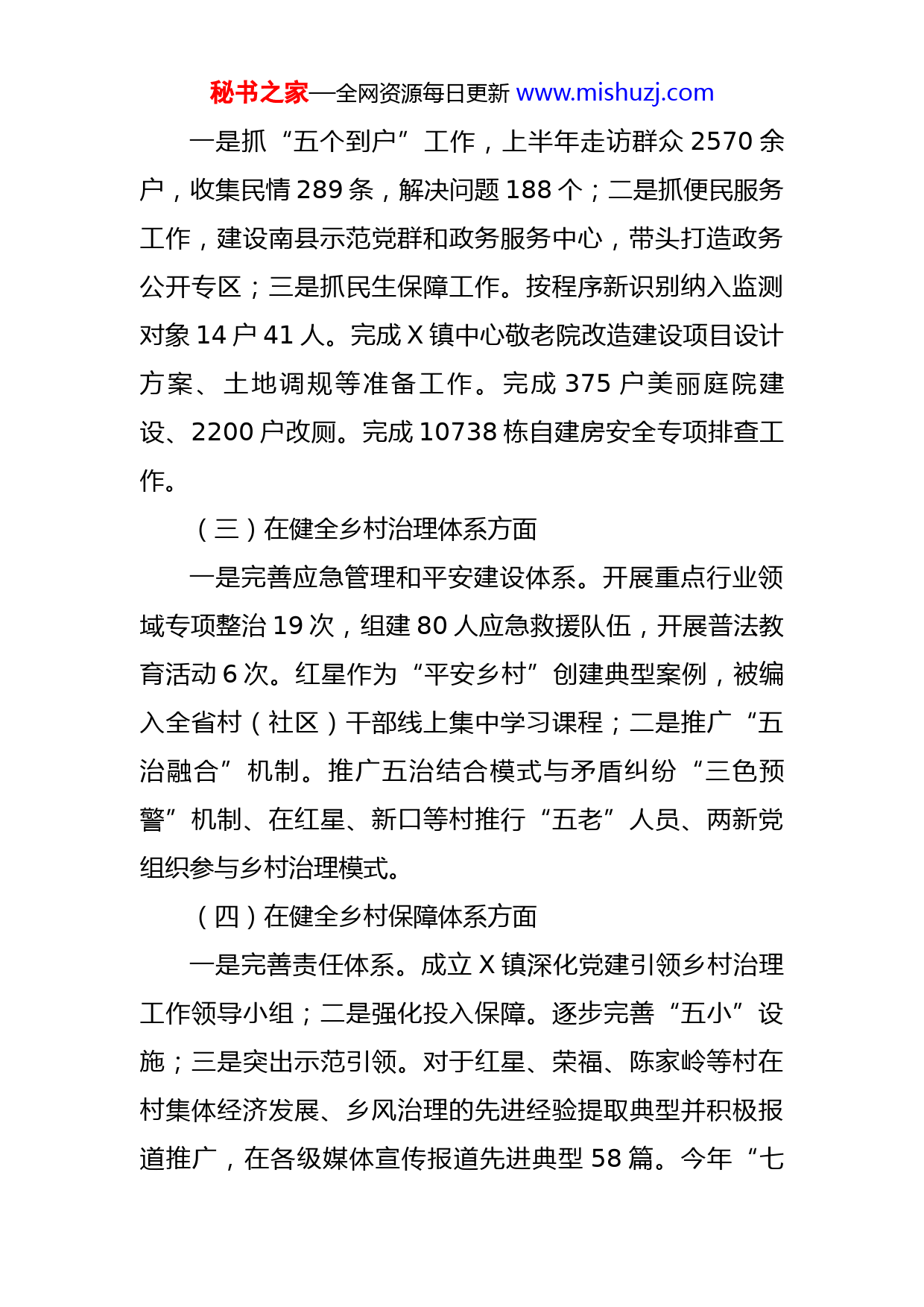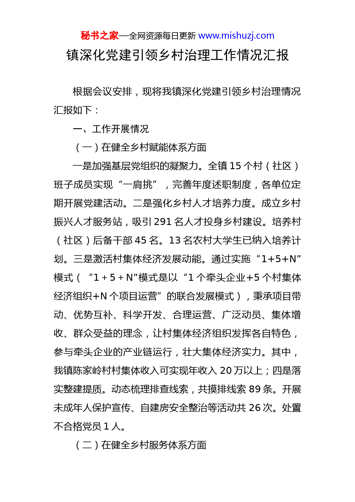秘书之家—全网资源每日更新www.mishuzj.com镇深化党建引领乡村治理工作情况汇报根据会议安排,现将我镇深化党建引领乡村治理情况汇报如下:一、工作开展情况(一)在健全乡村赋能体系方面一是加强基层党组织的凝聚力。全镇15个村(社区)班子成员实现“一肩挑”,完善年度述职制度,各单位定期开展党建活动。二是强化乡村人才培养力度。成立乡村振兴人才服务站,吸引291名人才投身乡村建设。培养村(社区)后备干部45名。13名农村大学生已纳入培养计划。三是激活村集体经济发展动能。通过实施“1+5+N”模式(“1+5+N”模式是以“1个牵头企业+5个村集体经济组织+N个项目运营”的联合发展模式),秉承项目带动、优势互补、科学开发、合理运营、广泛动员、集体增收、群众受益的理念,让村集体经济组织发挥各自特色,参与牵头企业的产业链运行,壮大集体经济实力。其中,我镇陈家岭村村集体收入可实现年收入20万以上;四是落实整建提质。动态梳理排查线索,共摸排线索89条。开展未成年人保护宣传、自建房安全整治等活动共26次。处置不合格党员1人。(二)在健全乡村服务体系方面秘书之家—全网资源每日更新www.mishuzj.com一是抓“五个到户”工作,上半年走访群众2570余户,收集民情289条,解决问题188个;二是抓便民服务工作,建设南县示范党群和政务服务中心,带头打造政务公开专区;三是抓民生保障工作。按程序新识别纳入监测对象14户41人。完成X镇中心敬老院改造建设项目设计方案、土地调规等准备工作。完成375户美丽庭院建设、2200户改厕。完成10738栋自建房安全专项排查工作。(三)在健全乡村治理体系方面一是完善应急管理和平安建设体系。开展重点行业领域专项整治19次,组建80人应急救援队伍,开展普法教育活动6次。红星作为“平安乡村”创建典型案例,被编入全省村(社区)干部线上集中学习课程;二是推广“五治融合”机制。推广五治结合模式与矛盾纠纷“三色预警”机制、在红星、新口等村推行“五老”人员、两新党组织参与乡村治理模式。(四)在健全乡村保障体系方面一是完善责任体系。成立X镇深化党建引领乡村治理工作领导小组;二是强化投入保障。逐步完善“五小”设施;三是突出示范引领。对于红星、荣福、陈家岭等村在村集体经济发展、乡风治理的先进经验提取典型并积极报道推广,在各级媒体宣传报道先进典型58篇。今年“七秘书之家—全网资源每日更新www.mishuzj.com一”大会,对3个先进基层党组织、46名优秀共产党员进行了表彰,进一步激发全镇干部争先创优。二、下一步打算(一)深化党建引领乡村治理进一步发挥基层党组织在乡村治理的前沿阵地作用,在全镇范围内推进村民自治工作,逐步构建起居民自我维护基层稳定责任体系,推进农村矛盾化解规范化建设,确保小事不出村、大事不出镇、矛盾不上交。(二)提升乡村治理现代化水平利用“网小格”APP、“道德档案”等智慧平台建设、“雪亮工程”六进六护工作契机,以现代科技提升我镇社会治理现代化水平,强化基层治理推动力。