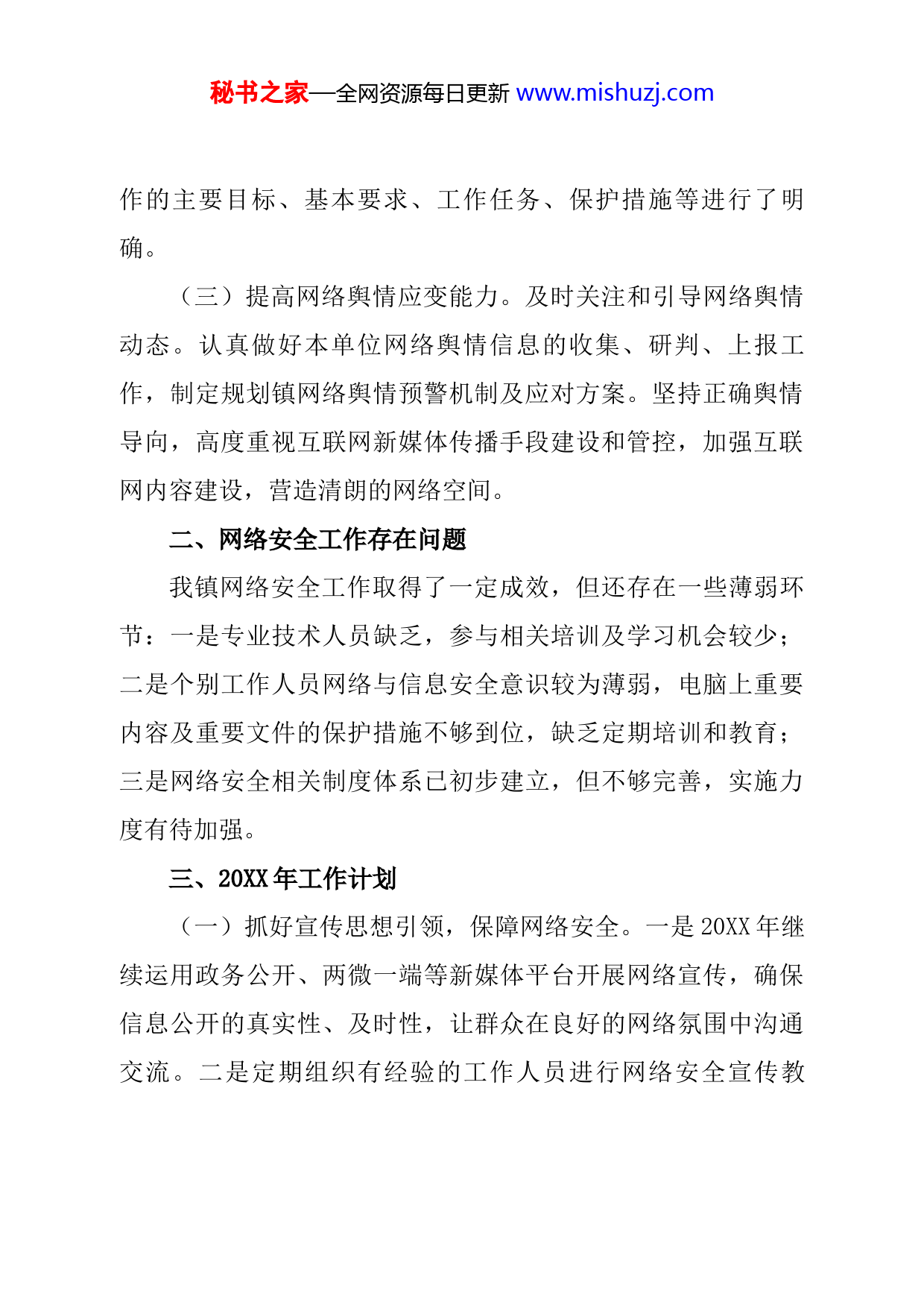 秘书之家—全网资源每日更新www.mishuzj.com镇网络安全工作总结今年以来,在县委宣传部、网信办大力支持和指导下,我镇深入贯彻落实网络安全工作责任制,扎实有序开展网络安全工作,全年未发生任何网络安全事件,有效维护了全镇网络安全工作的良好局面。现将网络安全工作情况汇报如下:一、主要成绩及经验(一)筑牢网络安全思想防线。坚持以习近平新时代中国特色社会主义思想为引领,将习近平总书记在全国网络安全和信息化工作会议上的重要讲话精神作为加强网络安全工作的首要政治任务和工作主线,牢固树立“四个意识”,坚定“四个自信”,在政治立场、政治方向、政治原则、政治道路上与党中央、省委市委县委保持高度一致。坚持国家总体安全观,切实增强网络安全工作责任意识和忧患意识,着力推动新形势下网络安全工作的提档升级。(二)落实网络安全主体责任。成立网络安全工作领导小组。通过加强学习,参加相关培训,提高所有工作人员网络管理能力,对收集到的问题和建议,进行认真处理,将负面舆情消化在萌芽状态。同时,通过文件形式专门对全镇网络安全工秘书之家—全网资源每日更新www.mishuzj.com作的主要目标、基本要求、工作任务、保护措施等进行了明确。(三)提高网络舆情应变能力。及时关注和引导网络舆情动态。认真做好本单位网络舆情信息的收集、研判、上报工作,制定规划镇网络舆情预警机制及应对方案。坚持正确舆情导向,高度重视互联网新媒体传播手段建设和管控,加强互联网内容建设,营造清朗的网络空间。二、网络安全工作存在问题我镇网络安全工作取得了一定成效,但还存在一些薄弱环节:一是专业技术人员缺乏,参与相关培训及学习机会较少;二是个别工作人员网络与信息安全意识较为薄弱,电脑上重要内容及重要文件的保护措施不够到位,缺乏定期培训和教育;三是网络安全相关制度体系已初步建立,但不够完善,实施力度有待加强。三、20XX年工作计划(一)抓好宣传思想引领,保障网络安全。一是20XX年继续运用政务公开、两微一端等新媒体平台开展网络宣传,确保信息公开的真实性、及时性,让群众在良好的网络氛围中沟通交流。二是定期组织有经验的工作人员进行网络安全宣传教秘书之家—全网资源每日更新www.mishuzj.com育,讲解相关网络安全知识,提高群众的网络防范意识,并发放相关的网络安全知识手册。(二)抓牢安全知识教育,定期开展检查。一是继续加强对全镇领导干部、网络信息人员的安全意识教育,定期开展网络安全知识相关内容的培训学习,提高专业技术人员工作能力,确保做好网络安全工作。二是将计算机网络安全检查常态化,组织专人定期检查,对出现的问题立即整改并深入研究问题出现的根本原因,坚决防止类似问题再次发生。(三)抓实决策部署安排,提升工作质量。一是严格按照县委网信办下发的相关工作要求开展网络安全工作,认真落实网络安全检查工作,确保网络安全的制度化、规范化。二是继续完善并执行信息安全工作制度,不定期对制度落实情况进行检查,对于出现的问题,严格追究责任,提高工作人员防护意识;三是继续加强对全镇信息线路、信息系统等方面的维护、保养,确保更新力度,保证全镇网络信息安全。